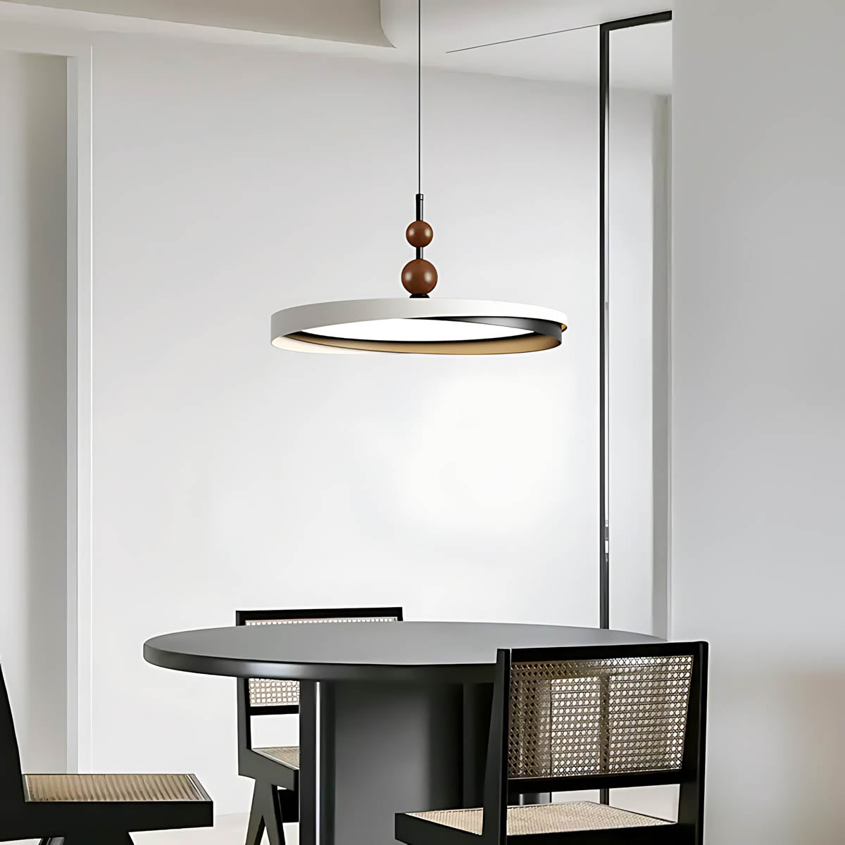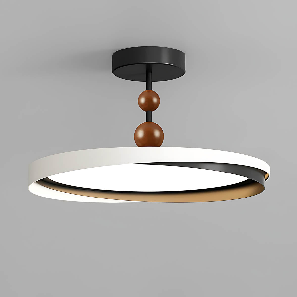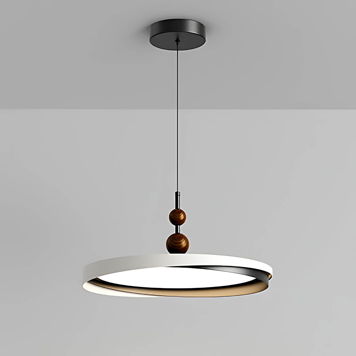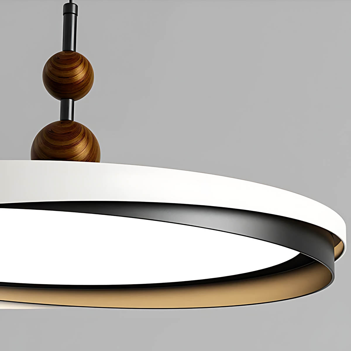 Crafted from durable aluminum and premium acrylic, its distinctive overlapping ring design, accented with charming wooden spheres, offers a sophisticated yet playful modern minimalist aesthetic.