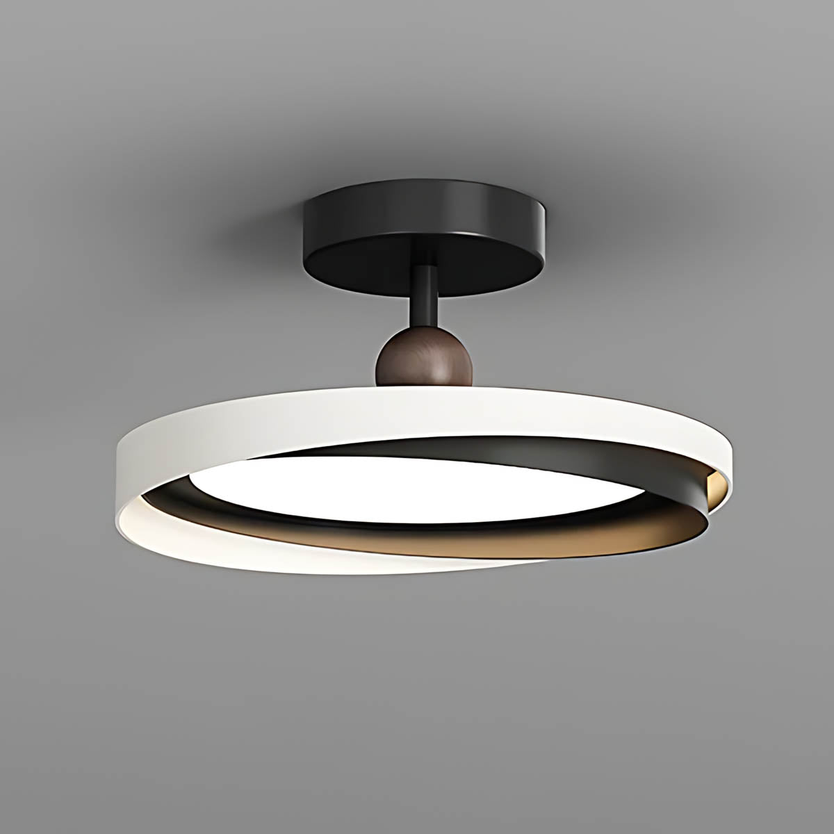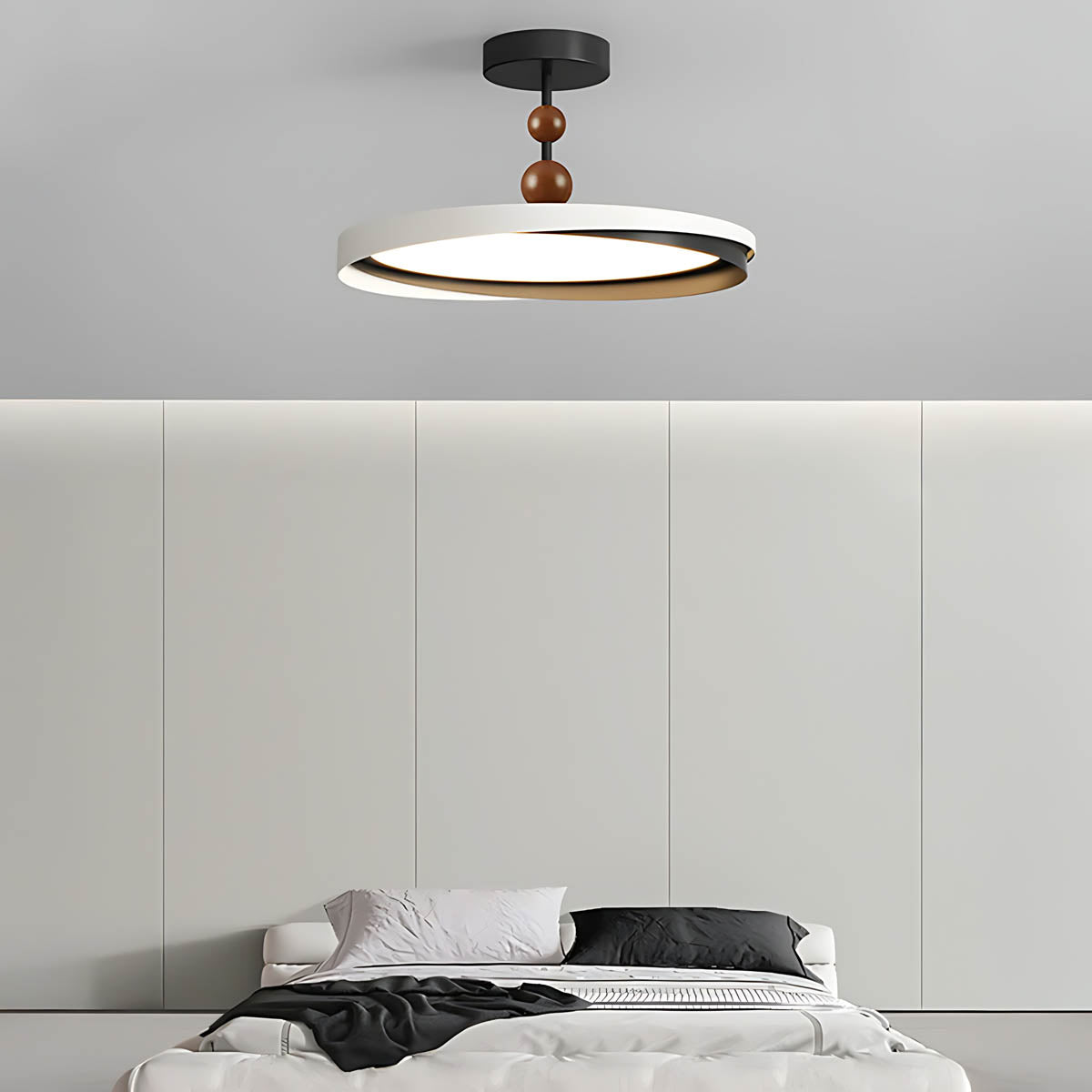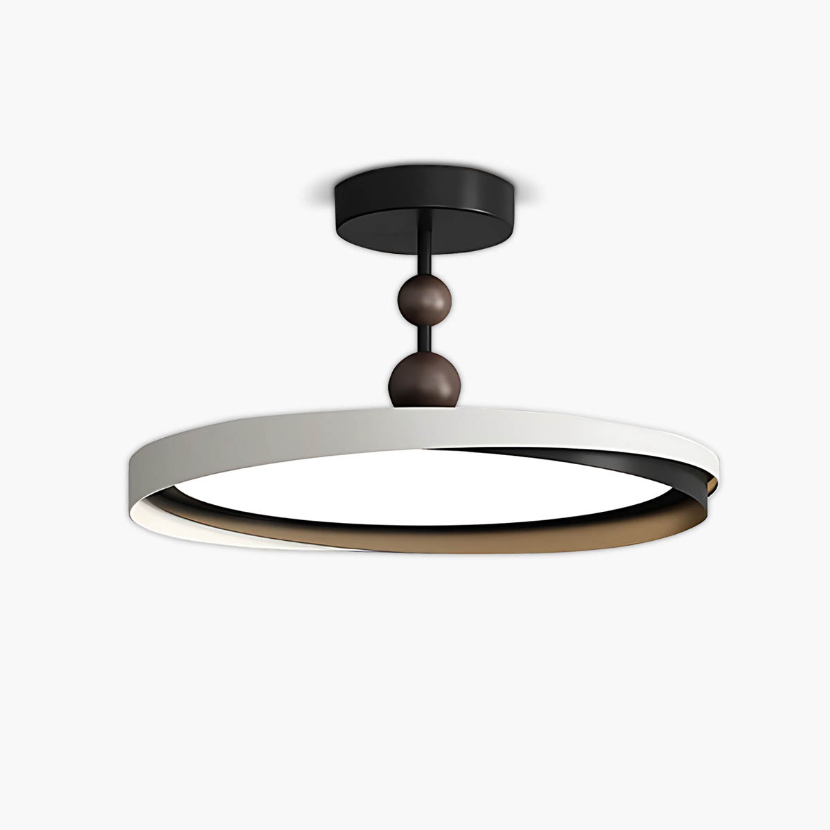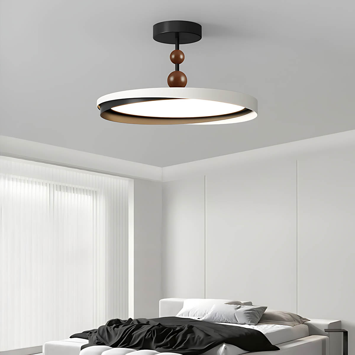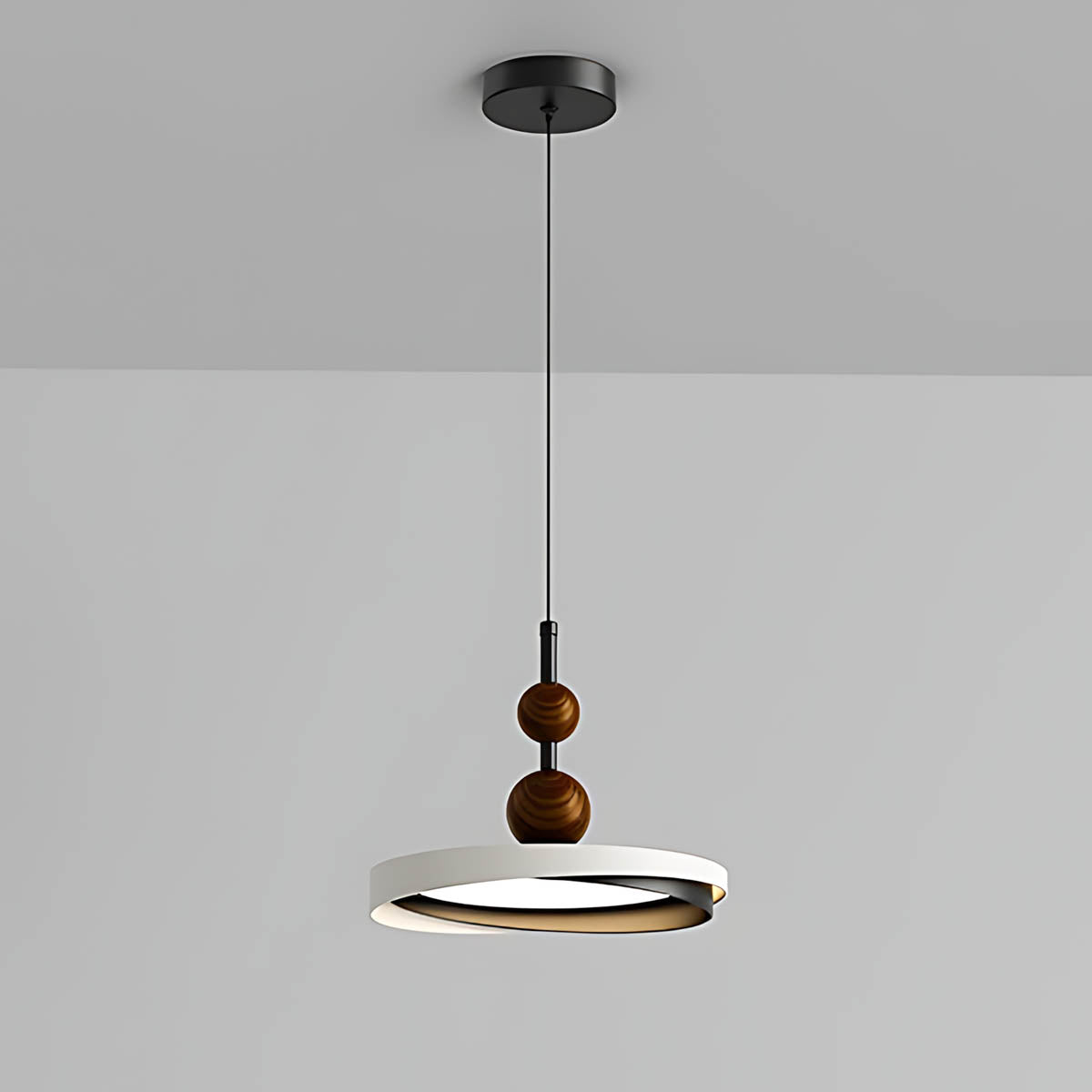 Crafted from durable aluminum and premium acrylic, its distinctive overlapping ring design, accented with charming wooden spheres, offers a sophisticated yet playful modern minimalist aesthetic.