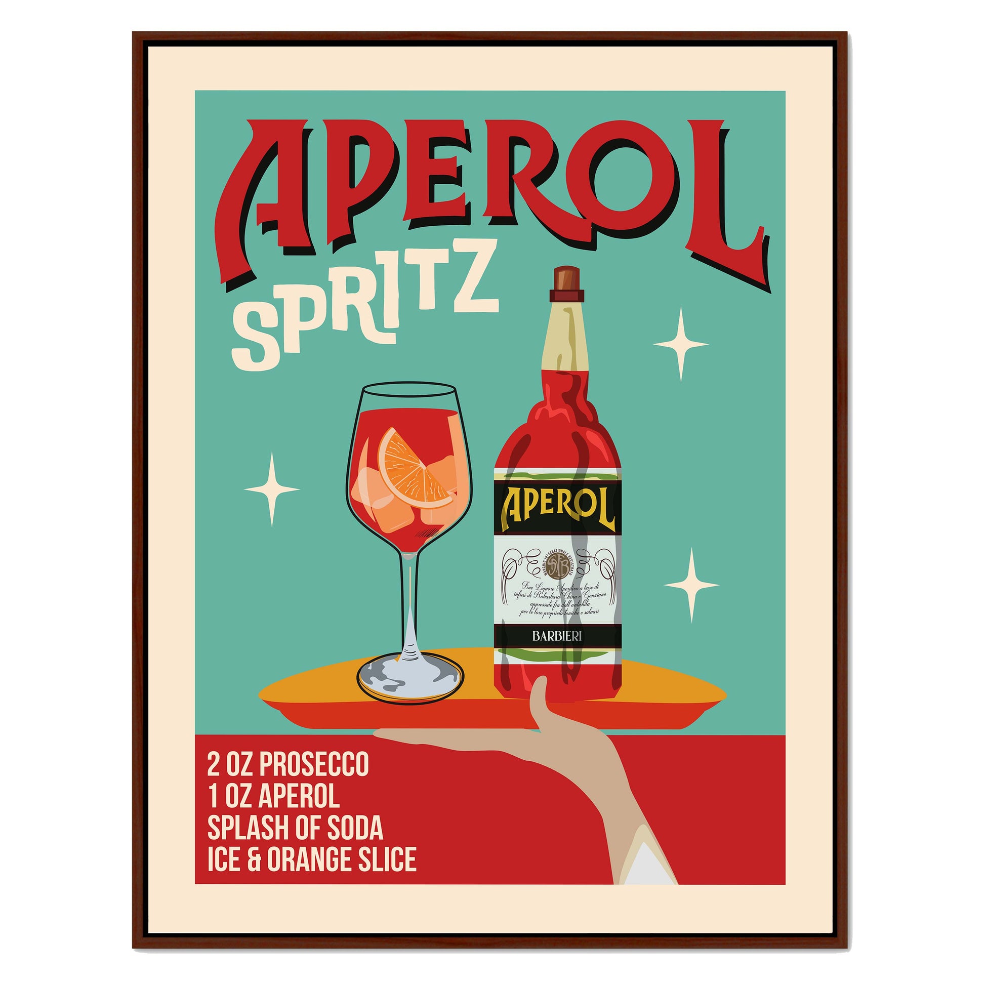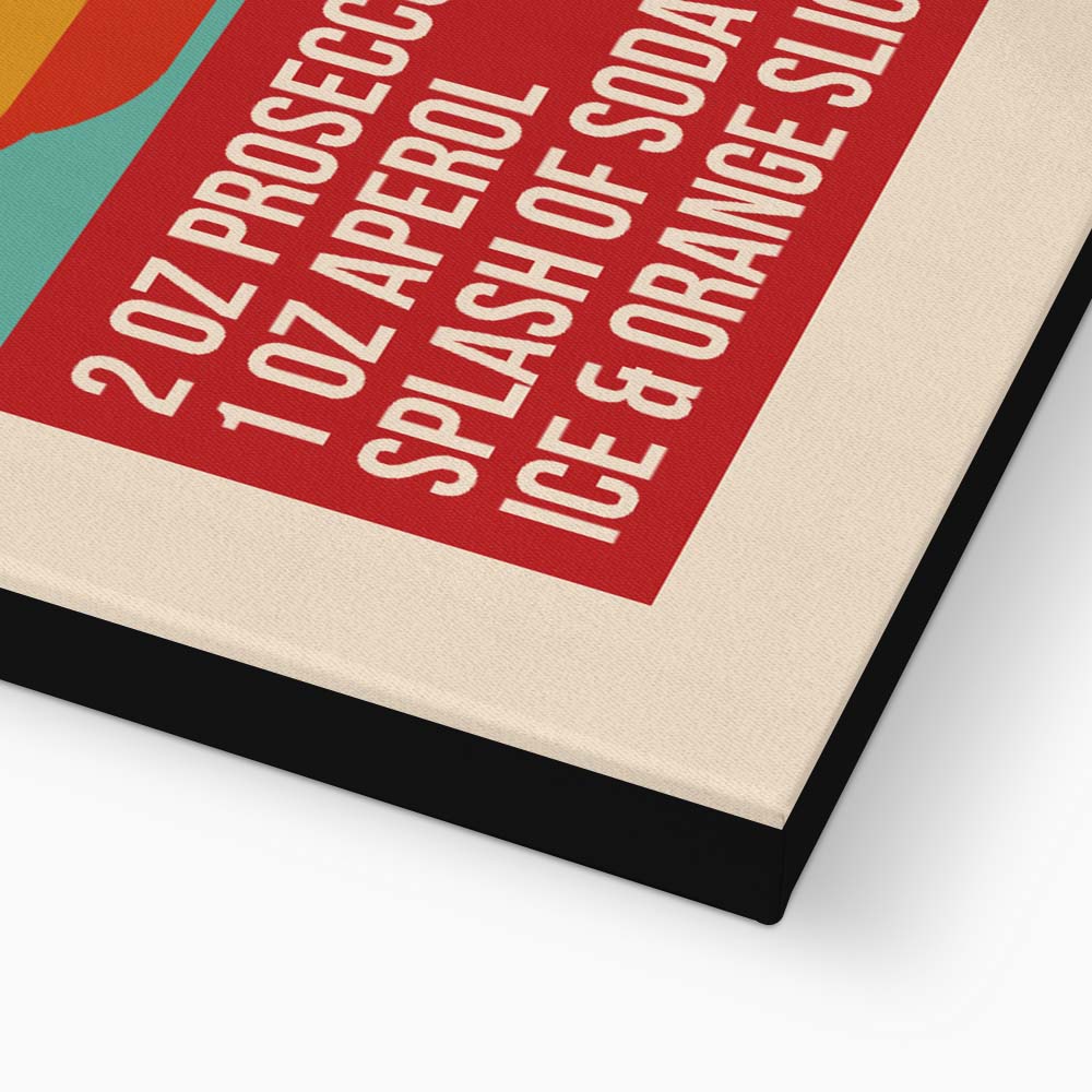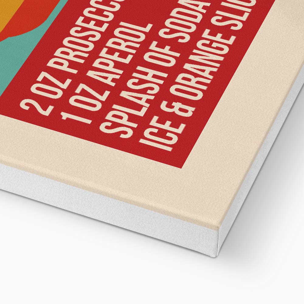 Retro-style canvas print featuring a vibrant illustrated recipe for an APEROL SPRITZ. Perfect for cocktail lovers, home bar enthusiasts, and vintage kitchen or dining room decor.