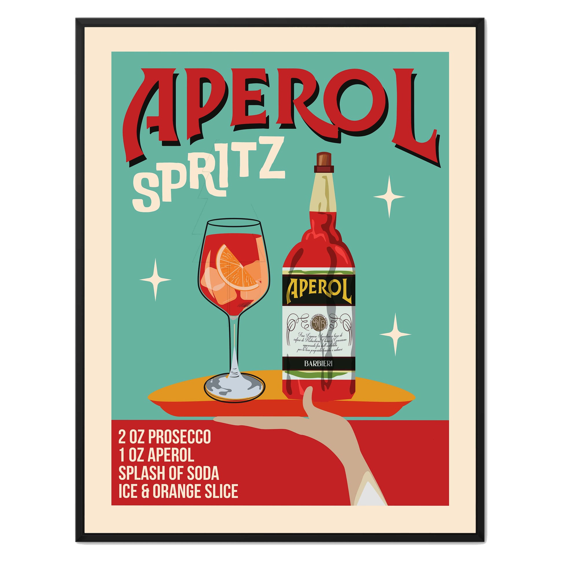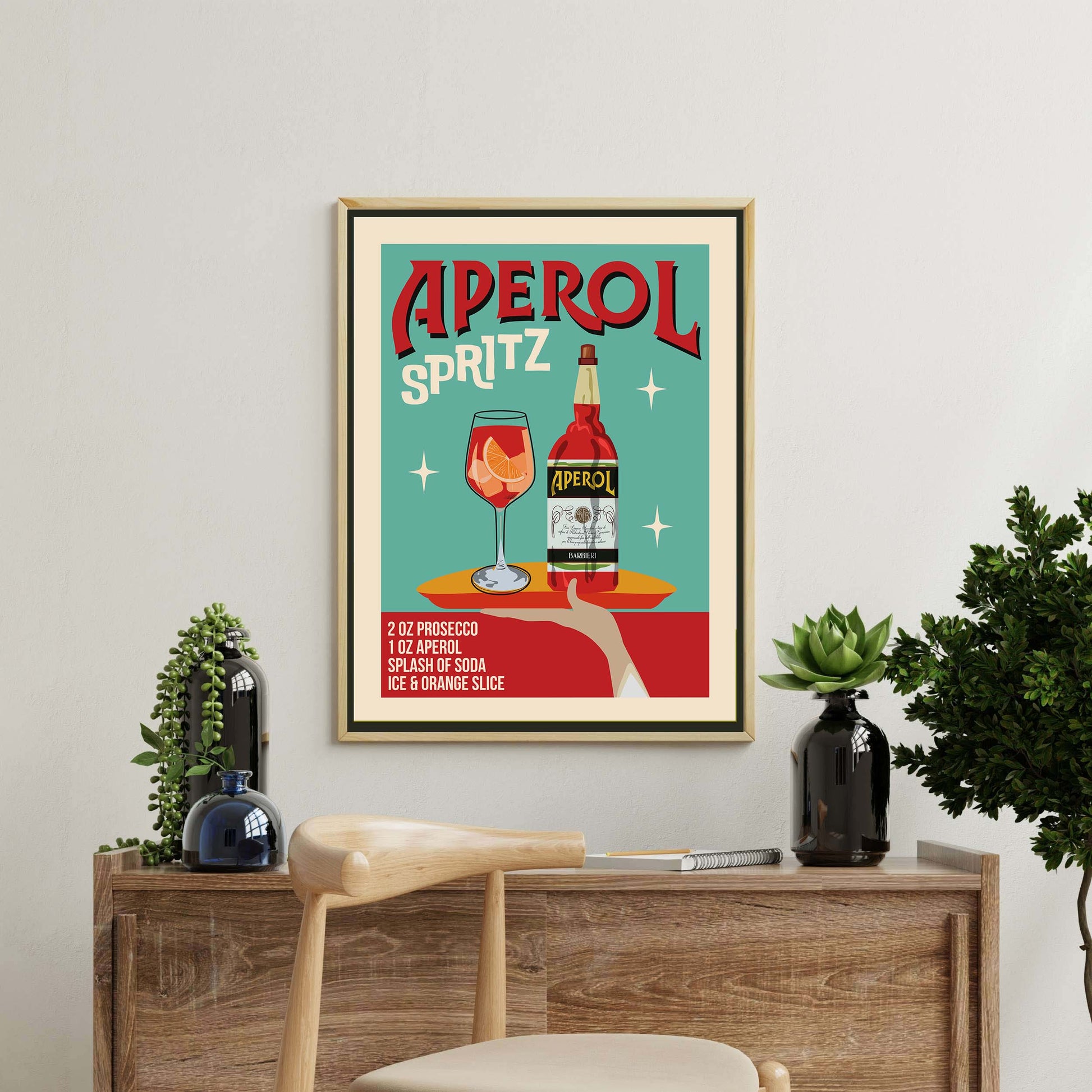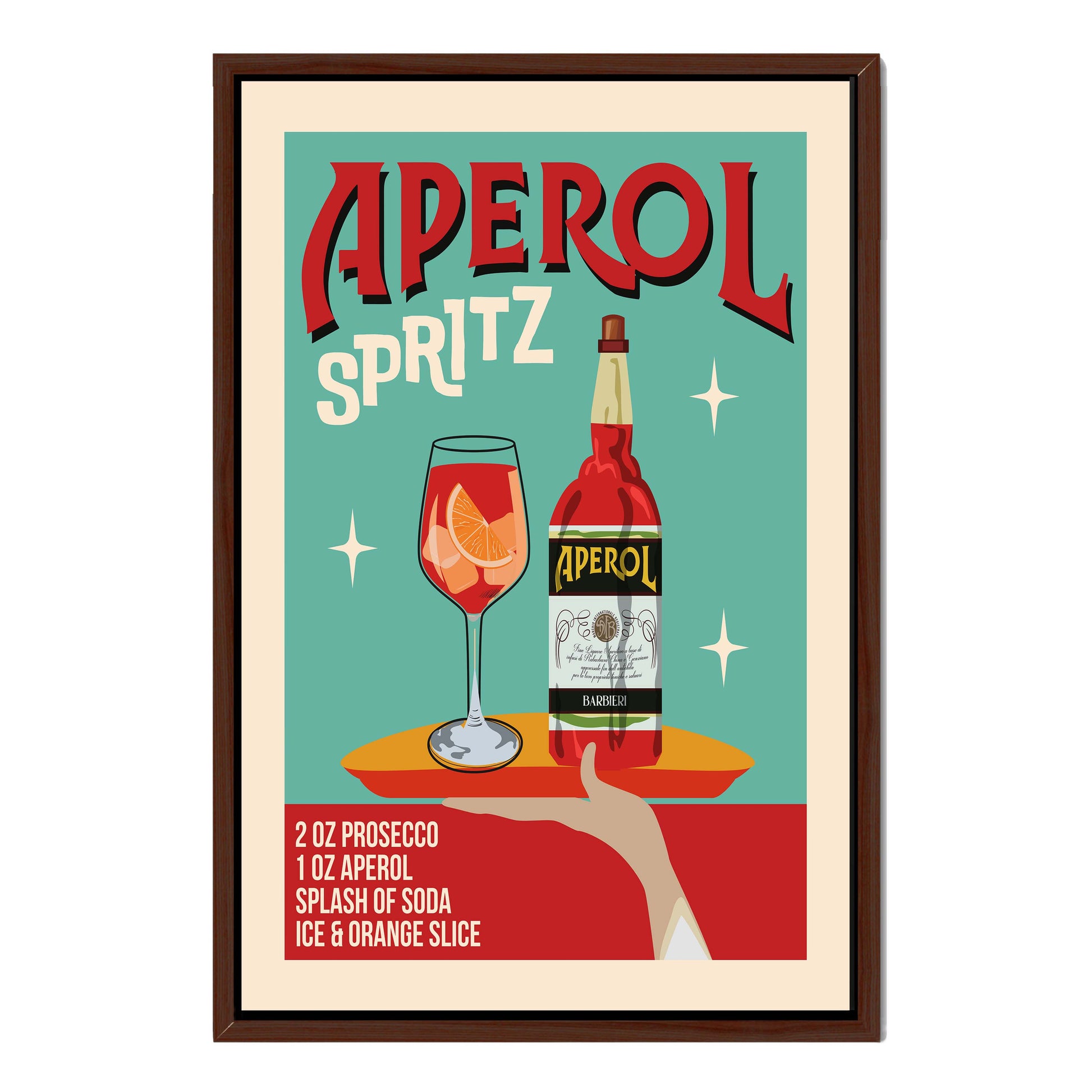 Retro-style canvas print featuring a vibrant illustrated recipe for an APEROL SPRITZ. Perfect for cocktail lovers, home bar enthusiasts, and vintage kitchen or dining room decor.