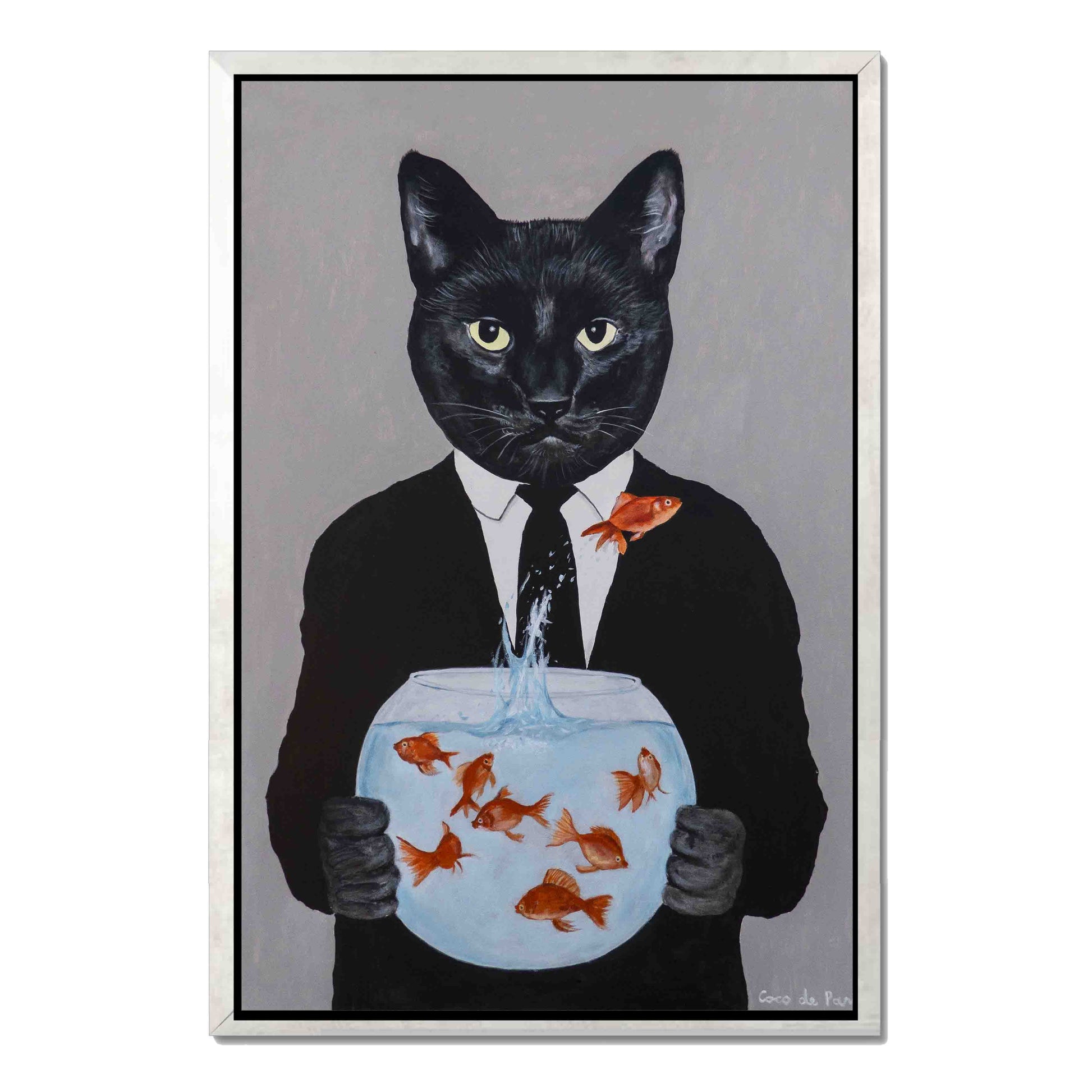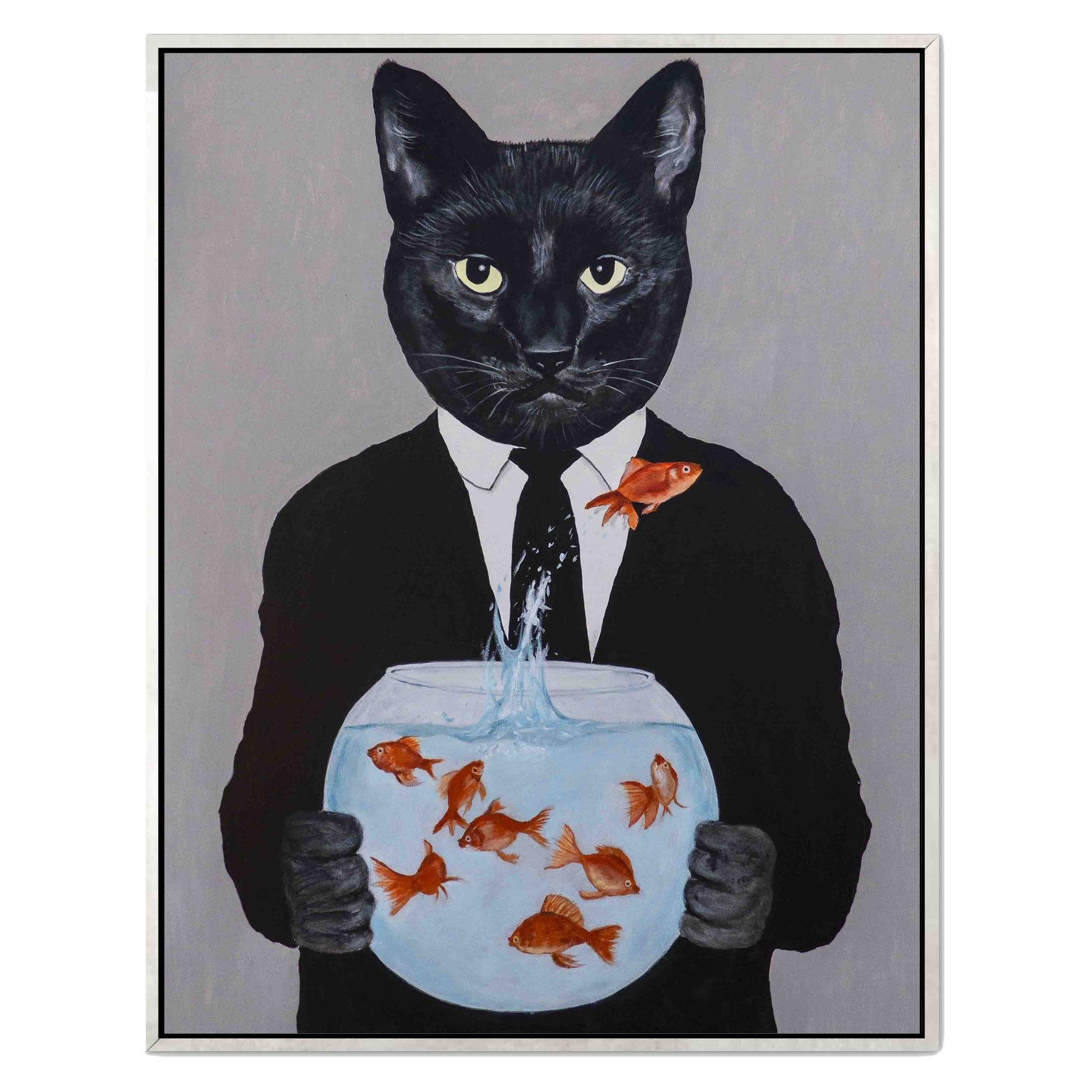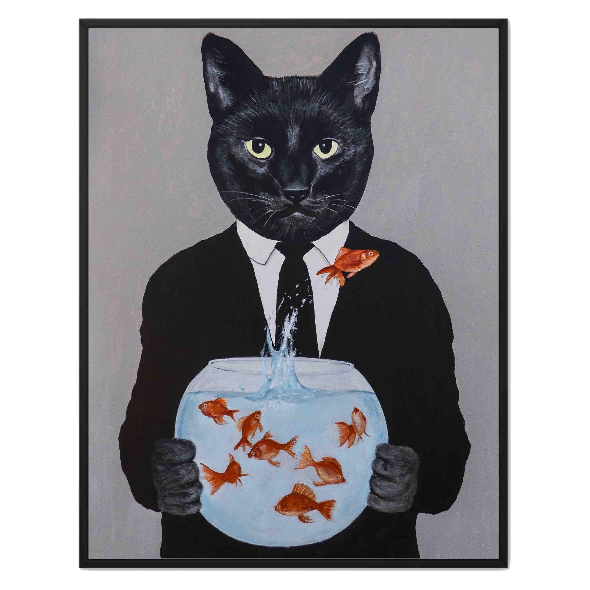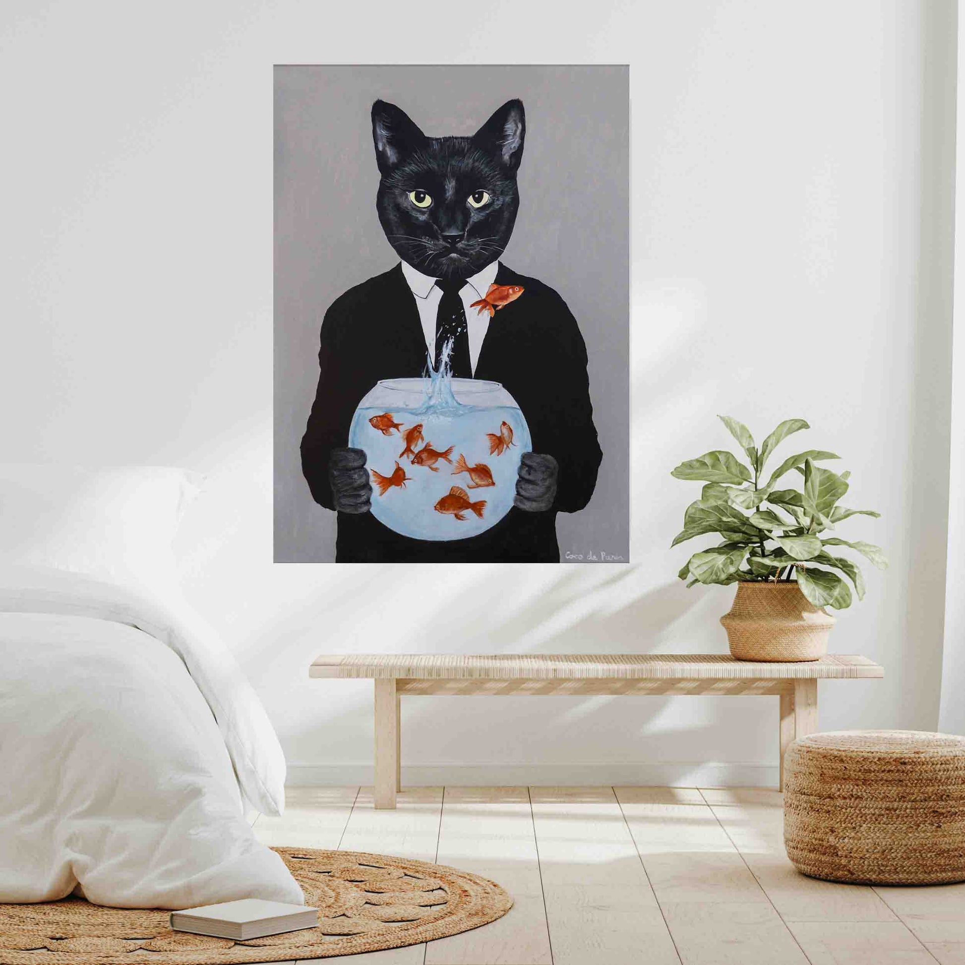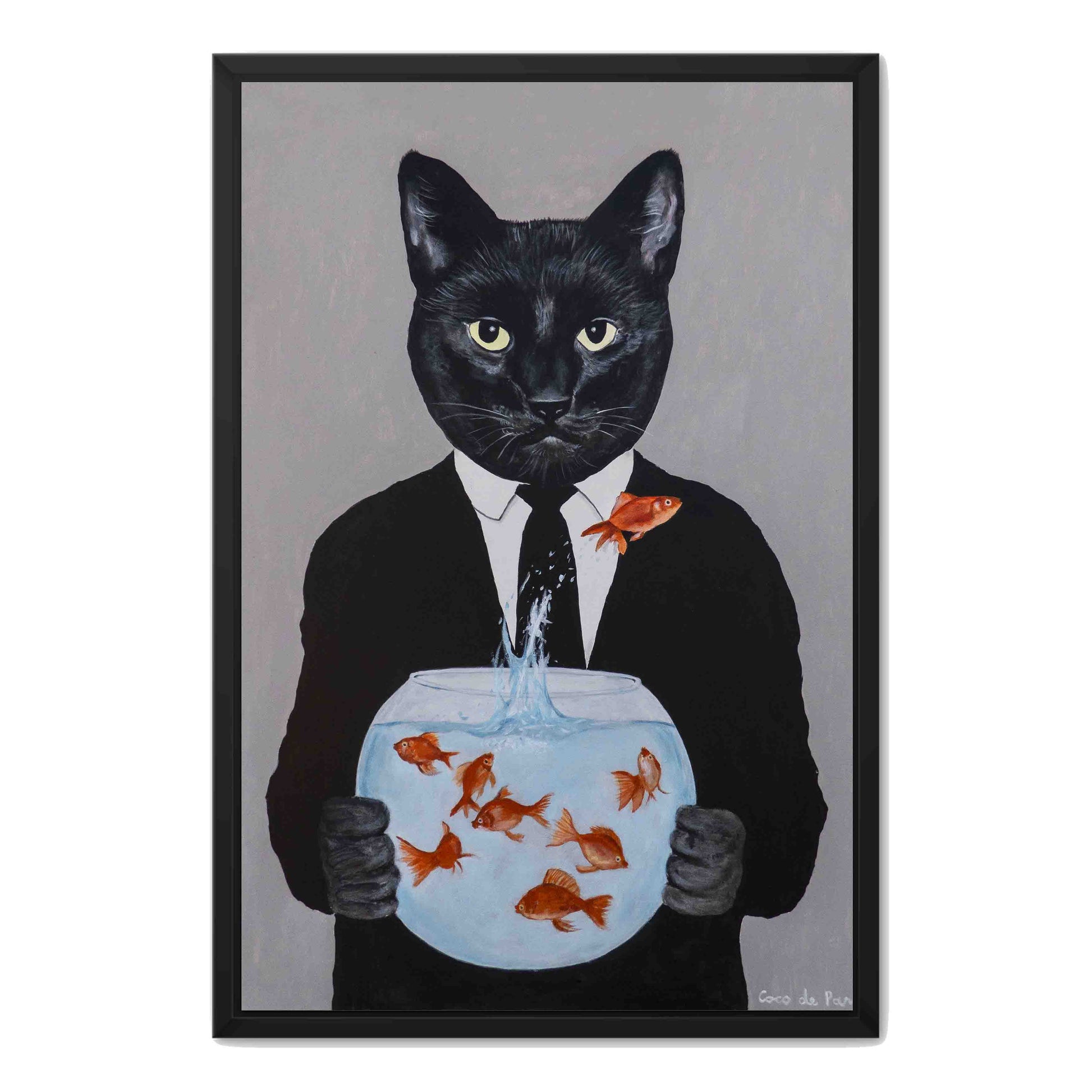 Quirky canvas print of a black cat in a suit holding a fishbowl. A surreal, humorous wall art piece perfect for cat lovers and eclectic home decor.