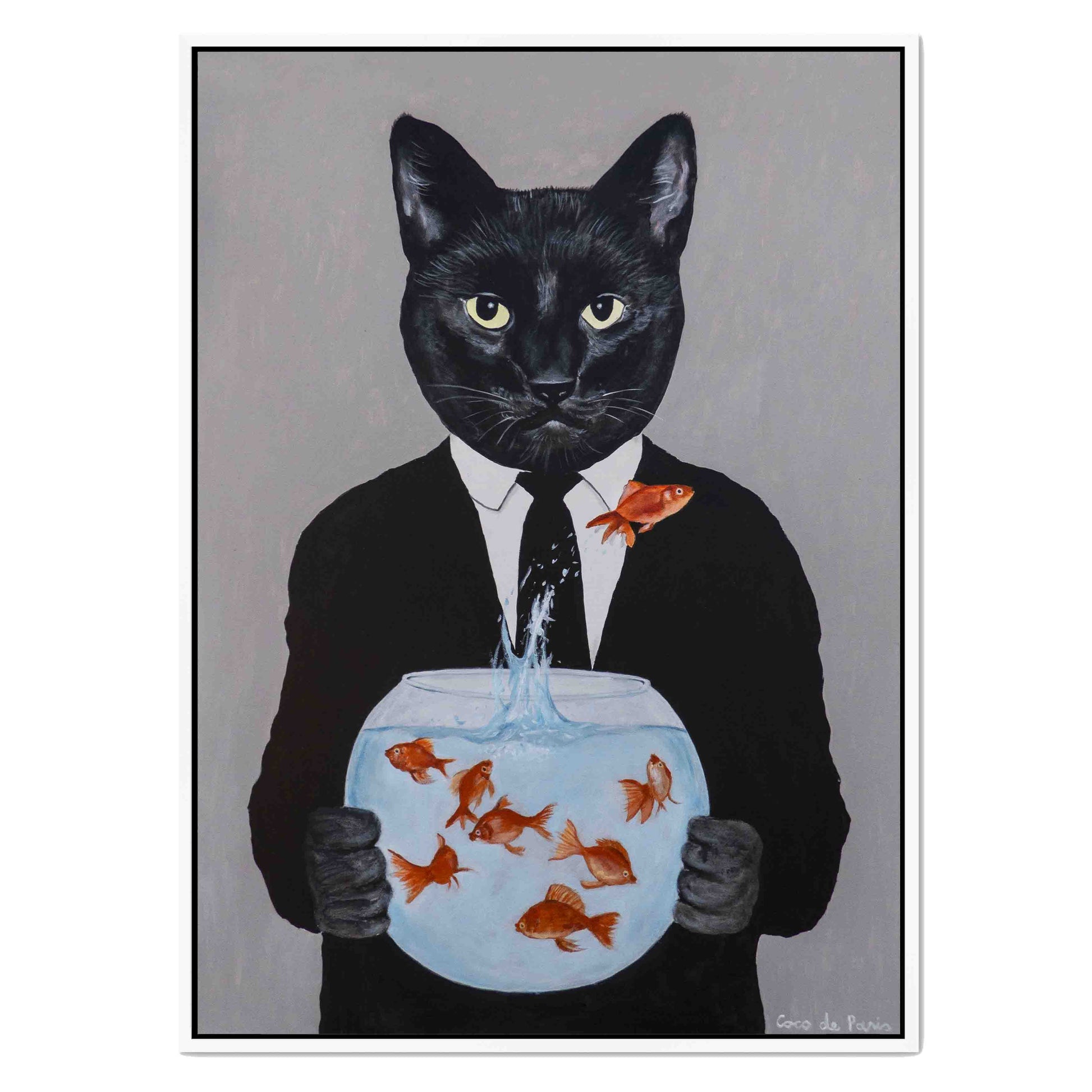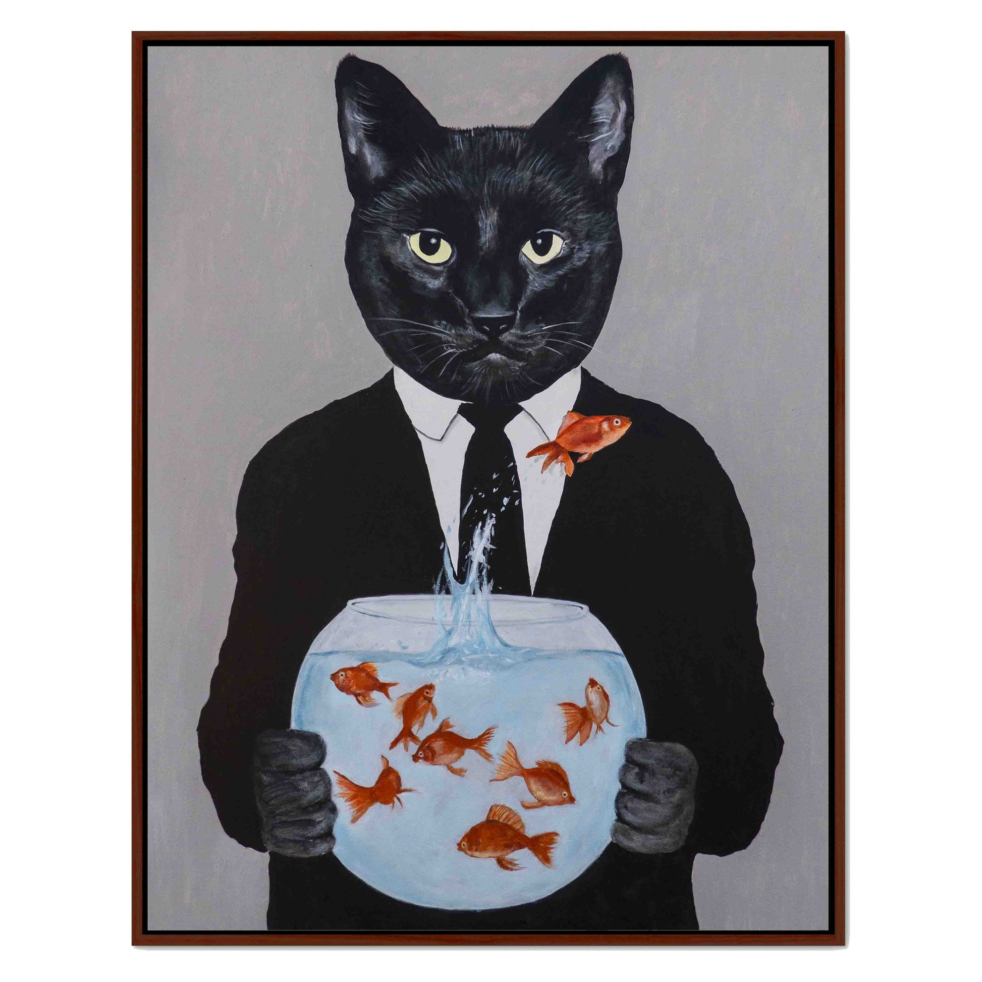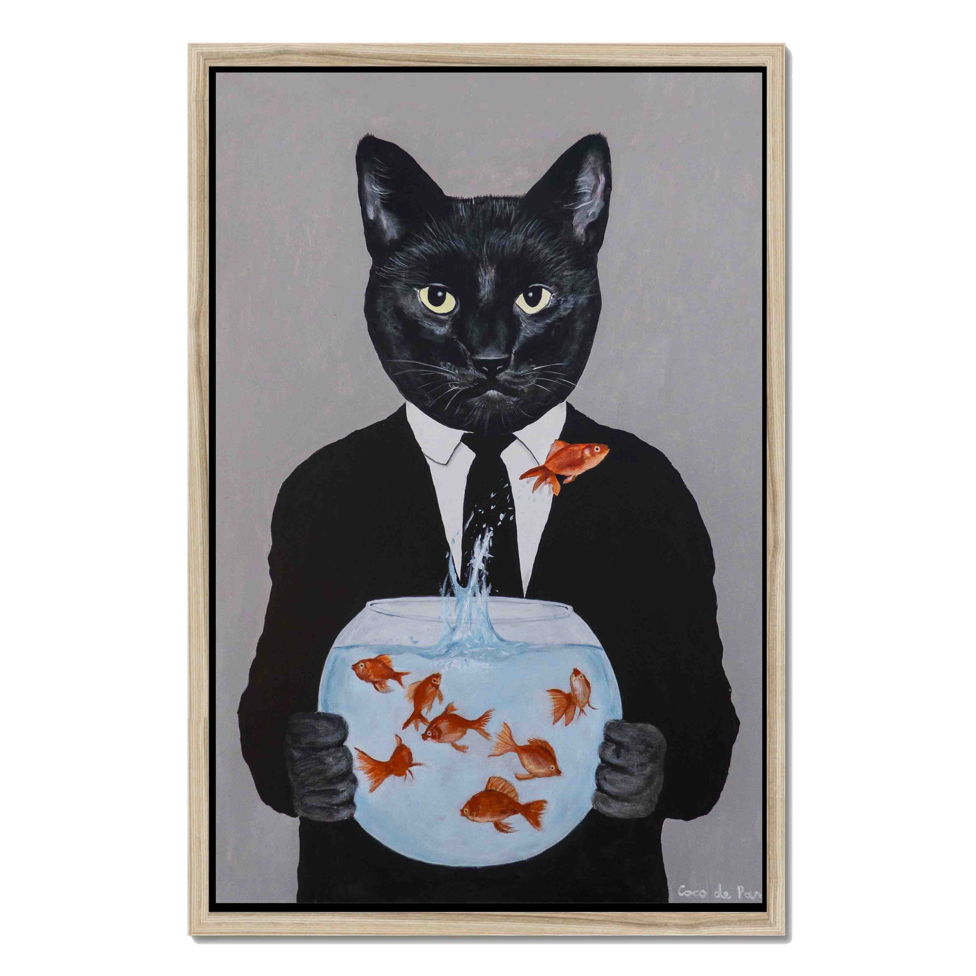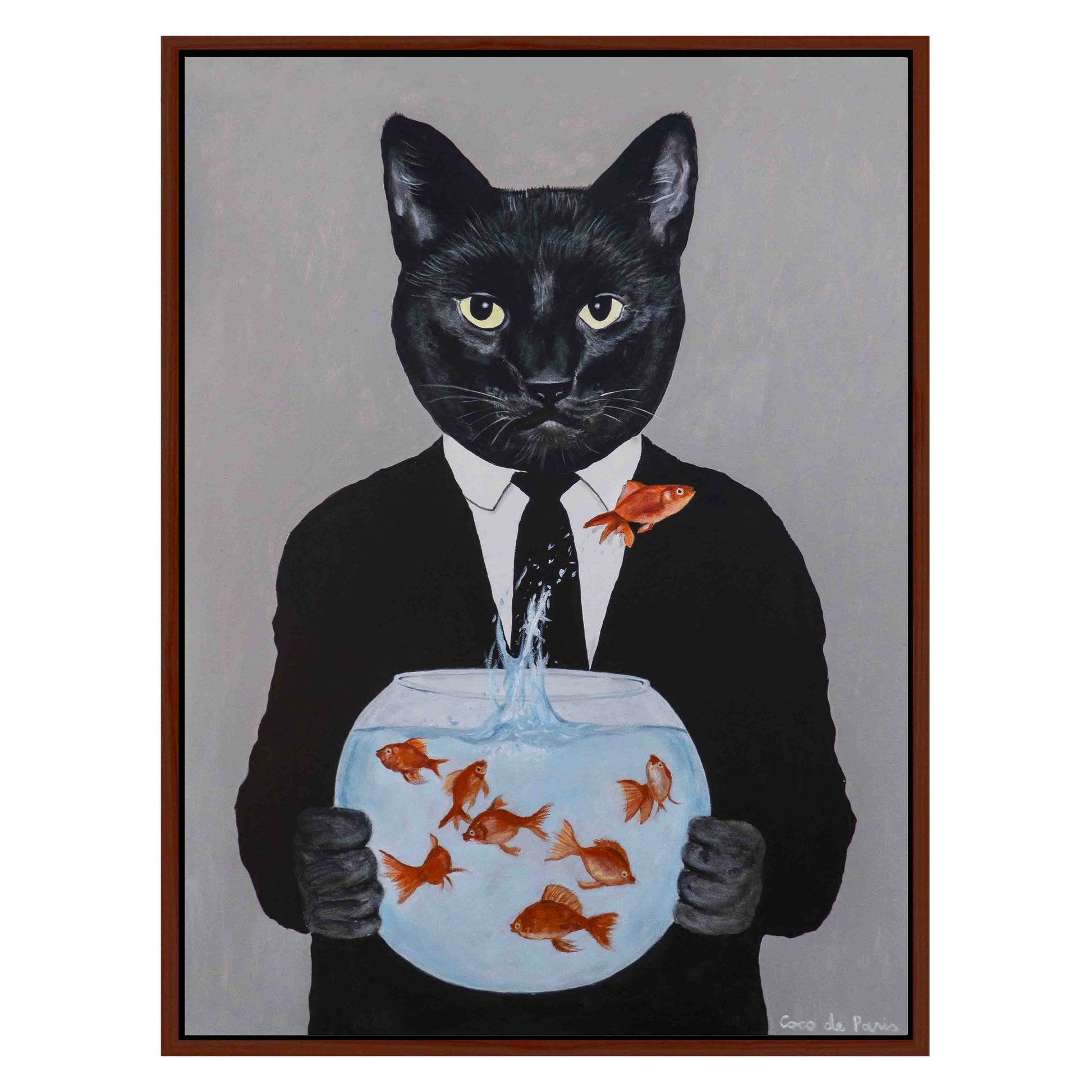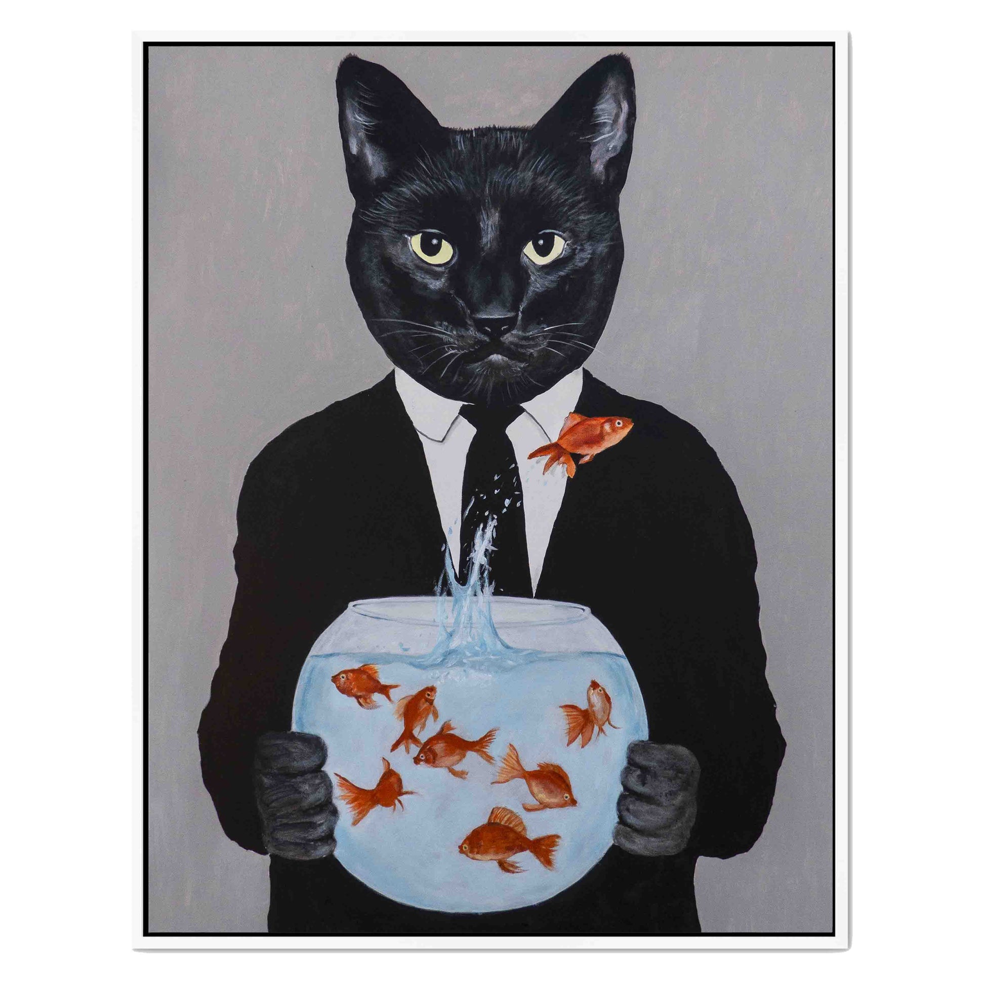 Quirky canvas print of a black cat in a suit holding a fishbowl. A surreal, humorous wall art piece perfect for cat lovers and eclectic home decor.