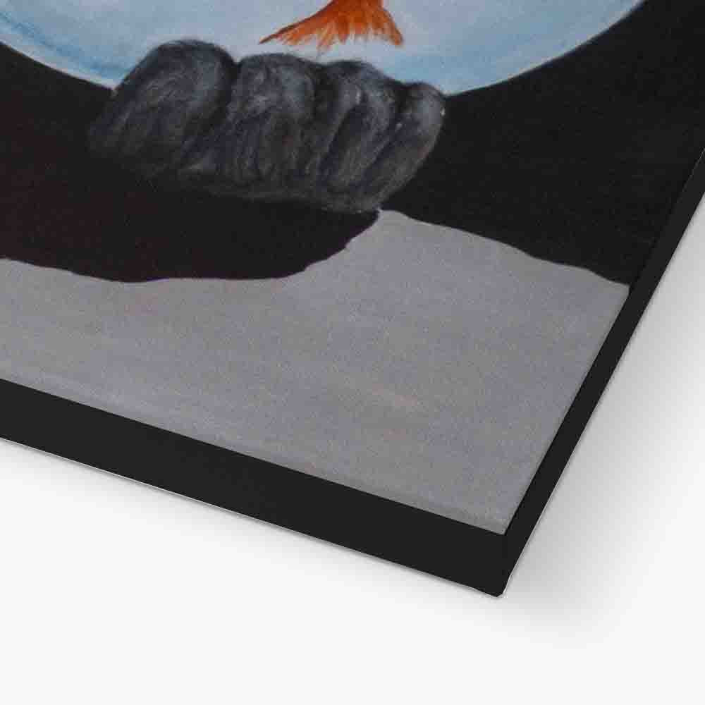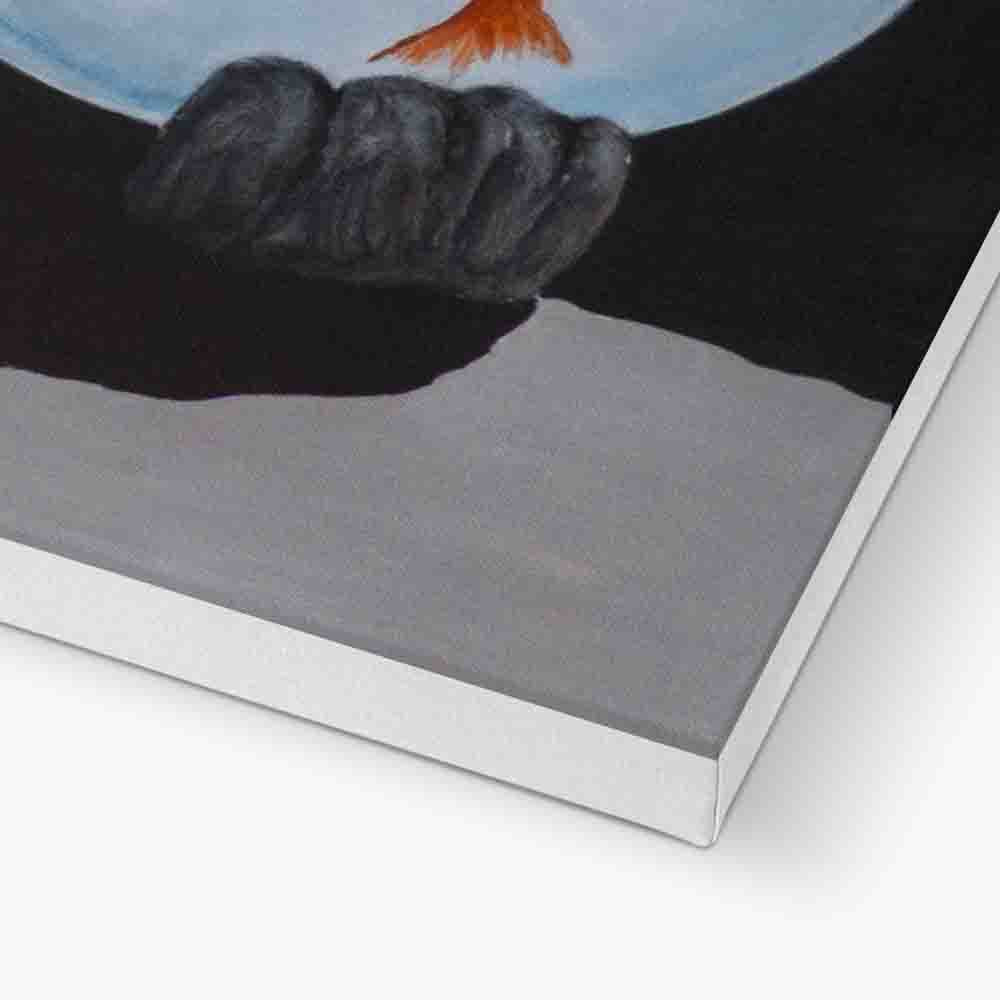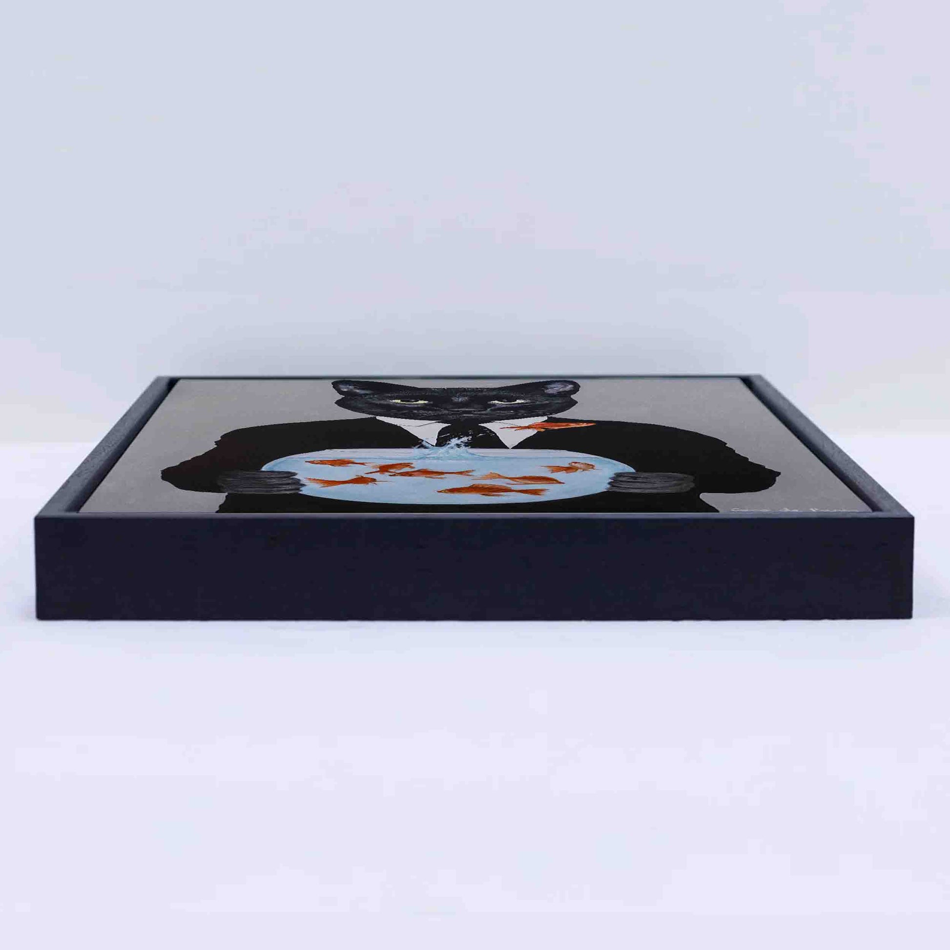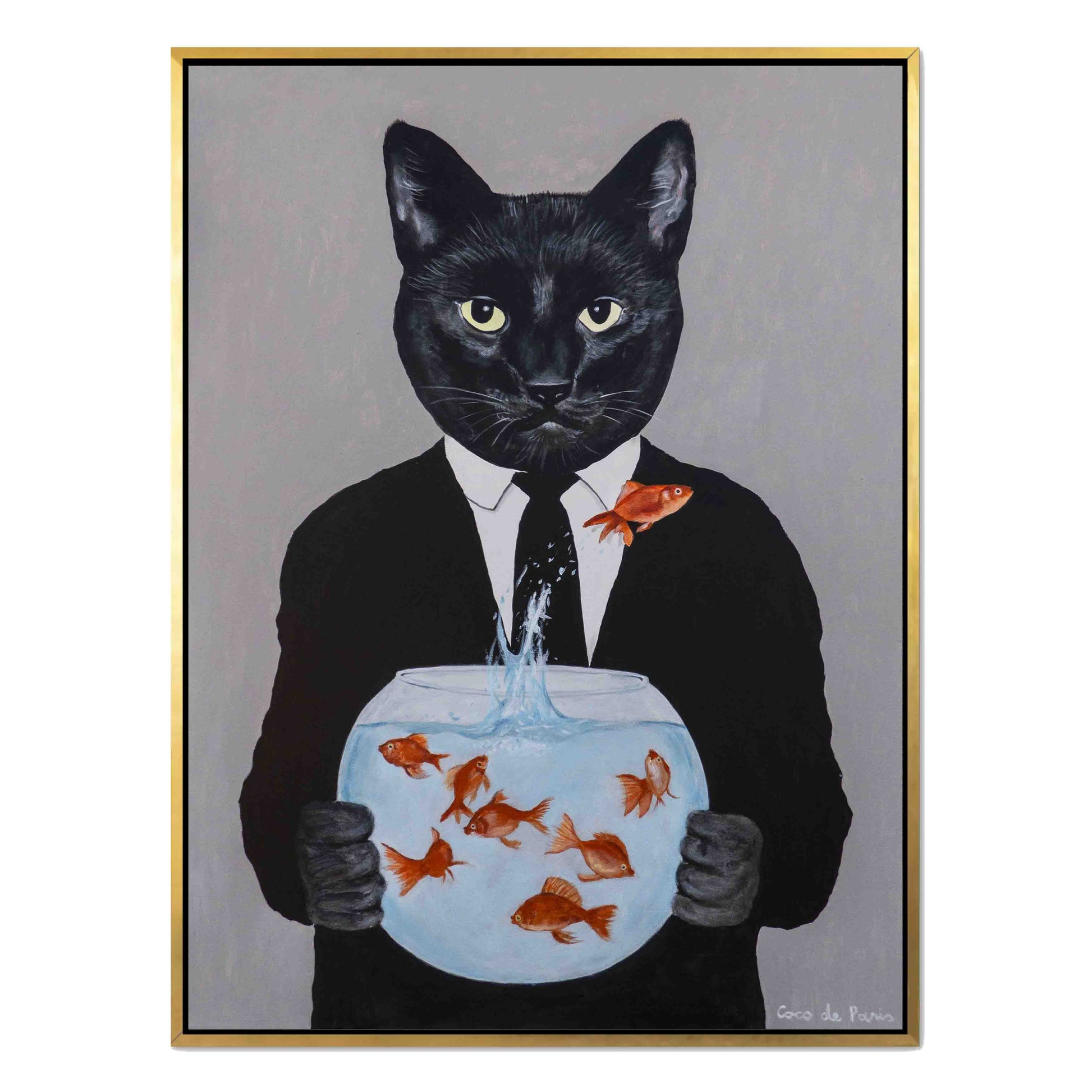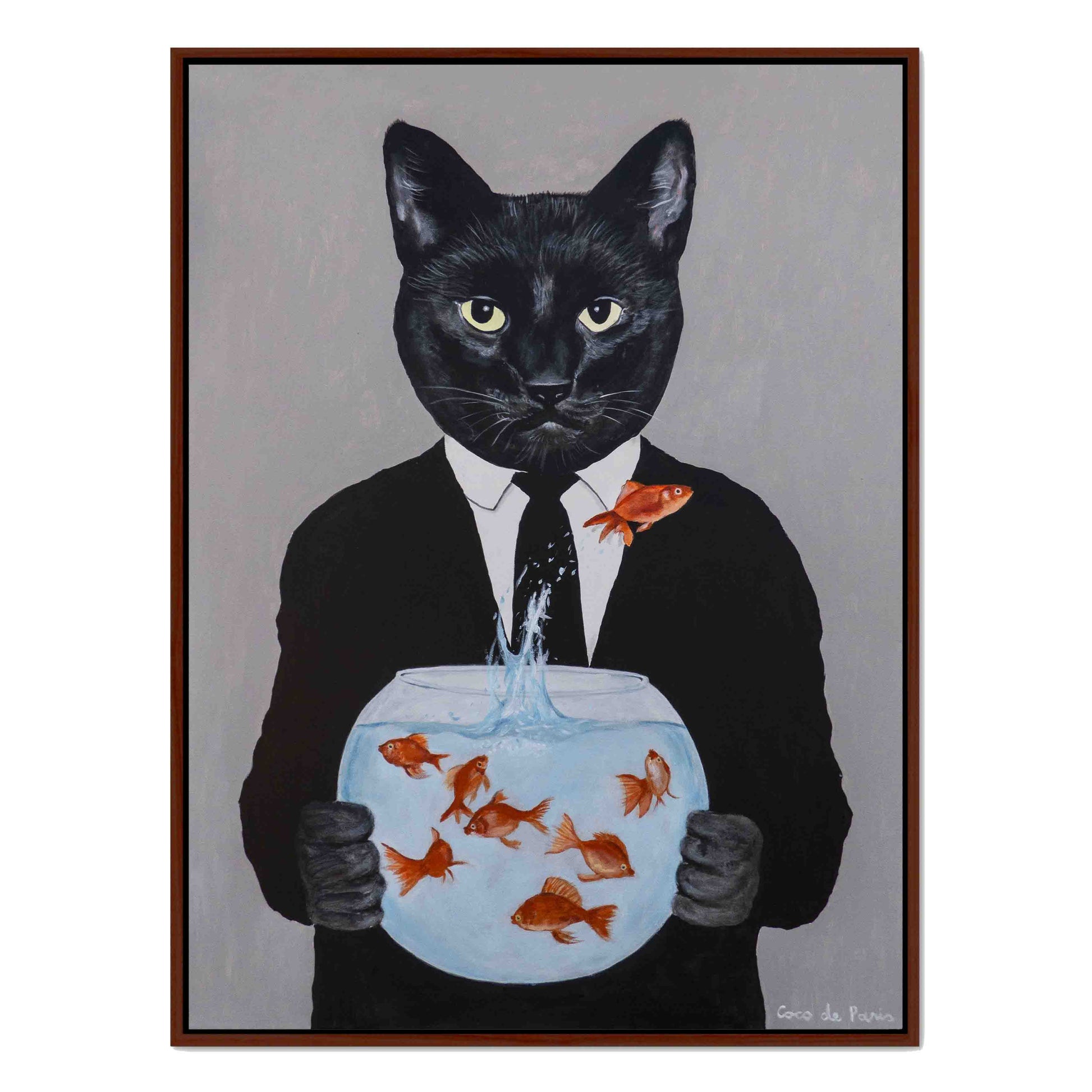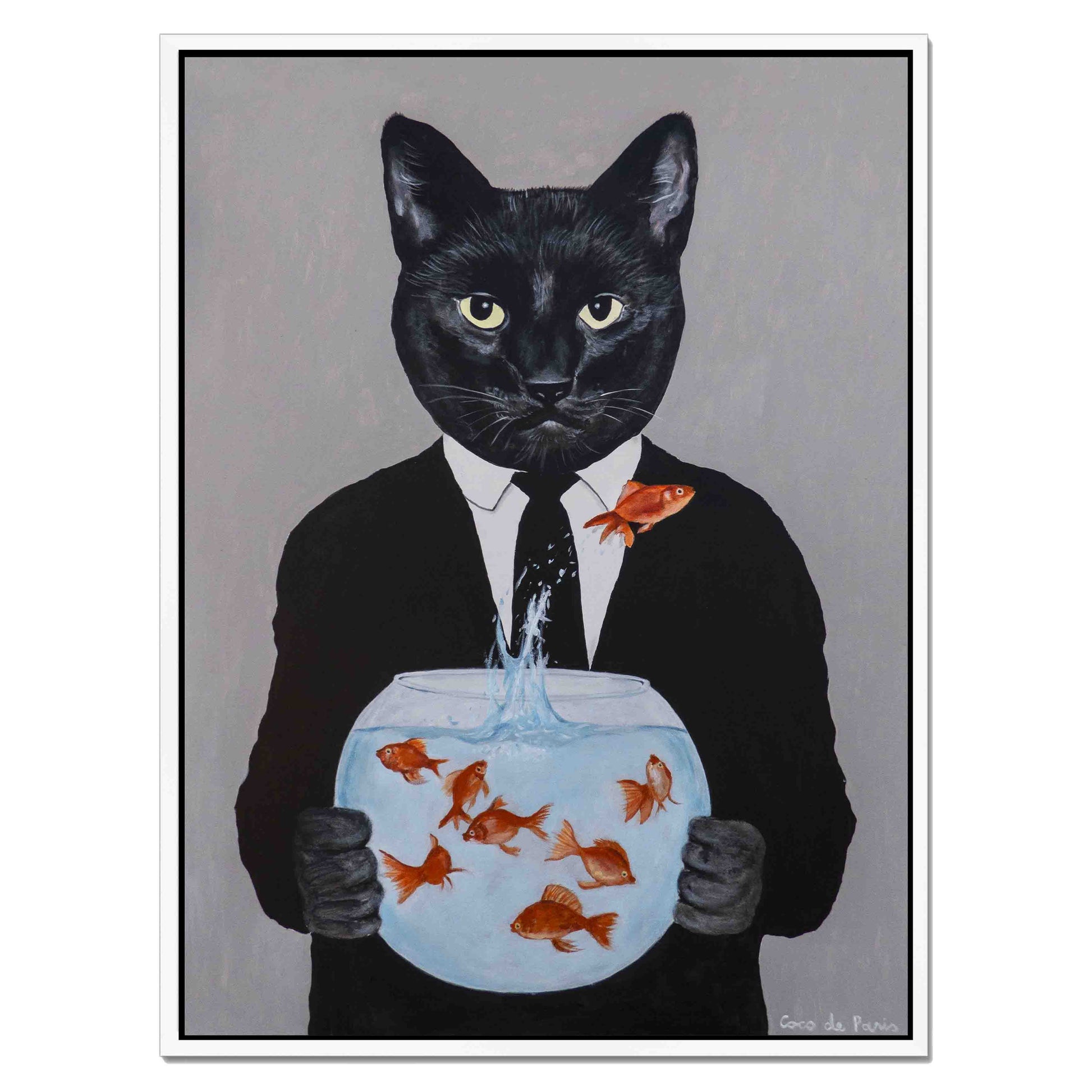 Quirky canvas print of a black cat in a suit holding a fishbowl. A surreal, humorous wall art piece perfect for cat lovers and eclectic home decor.