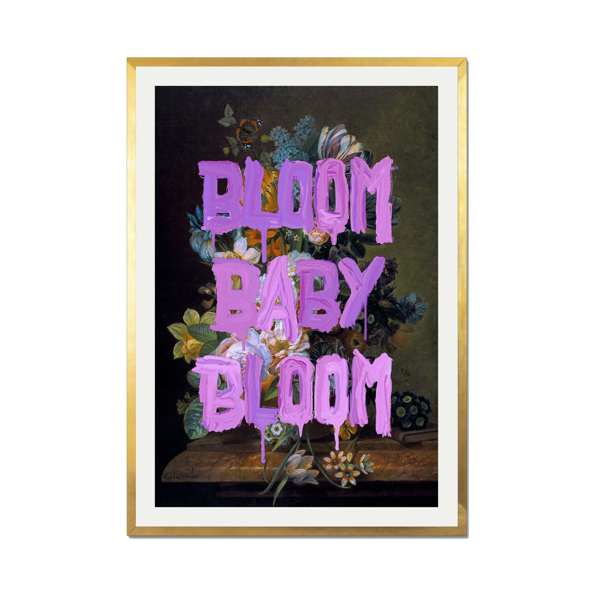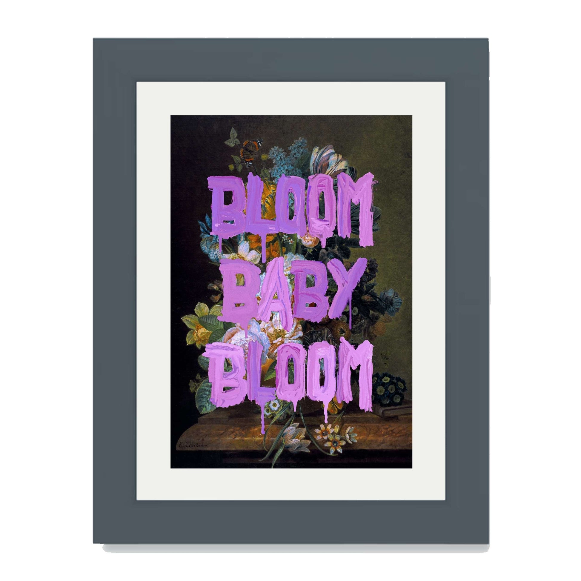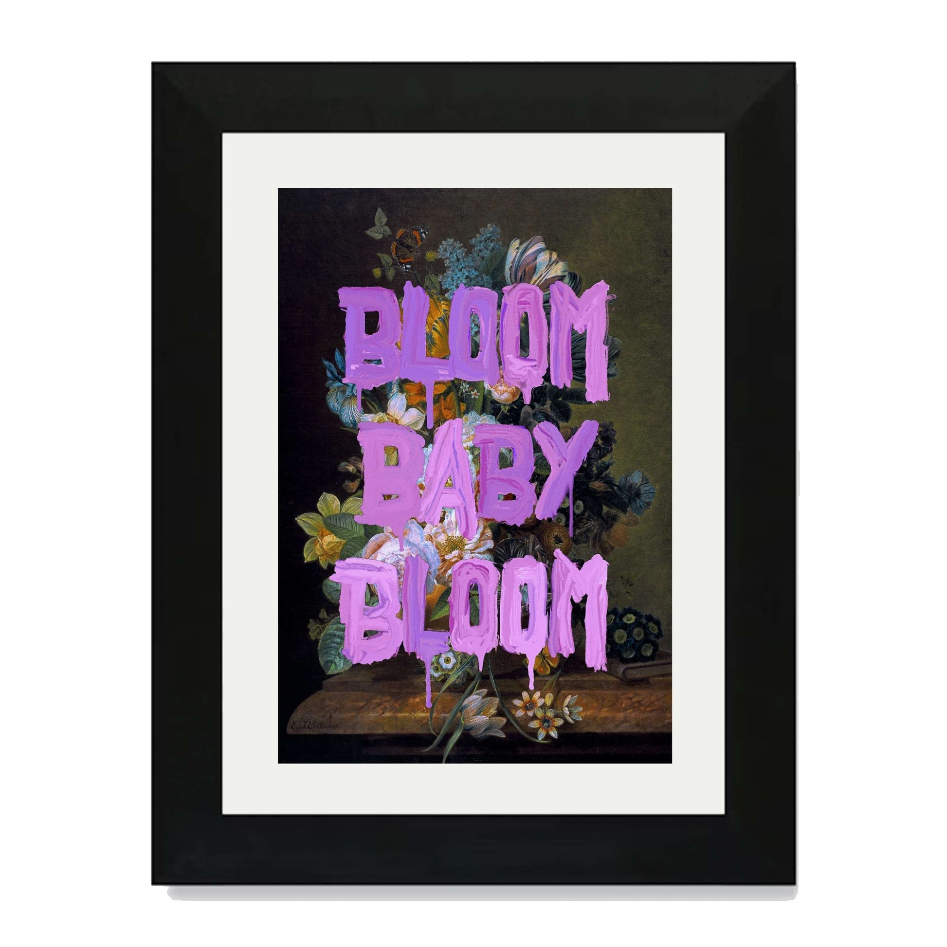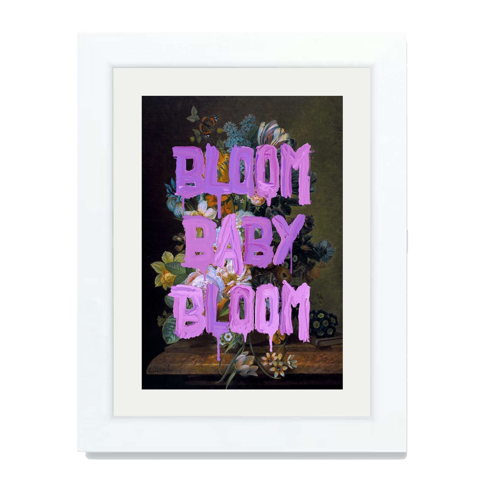BLOOM BABY BLOOM is a bold wall art print with vibrant purple graffiti text over a dark floral still life. A striking mix of vintage beauty and modern motivation for any stylish space.