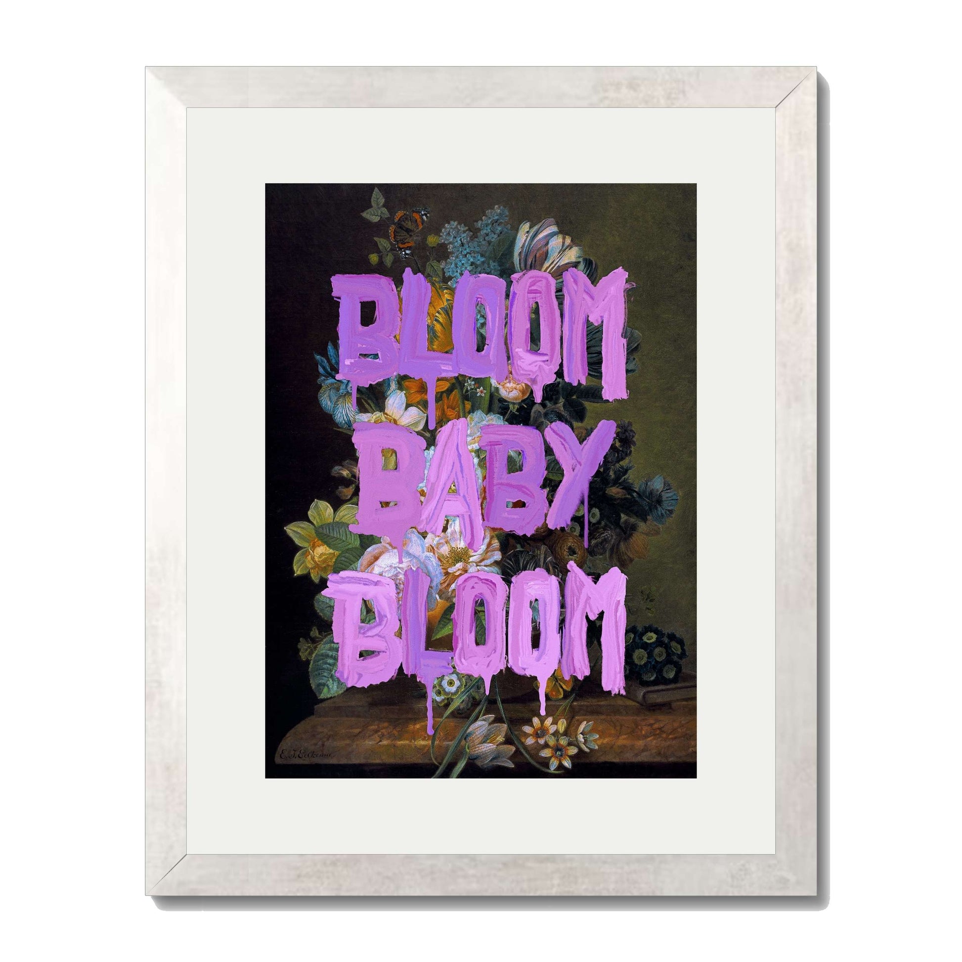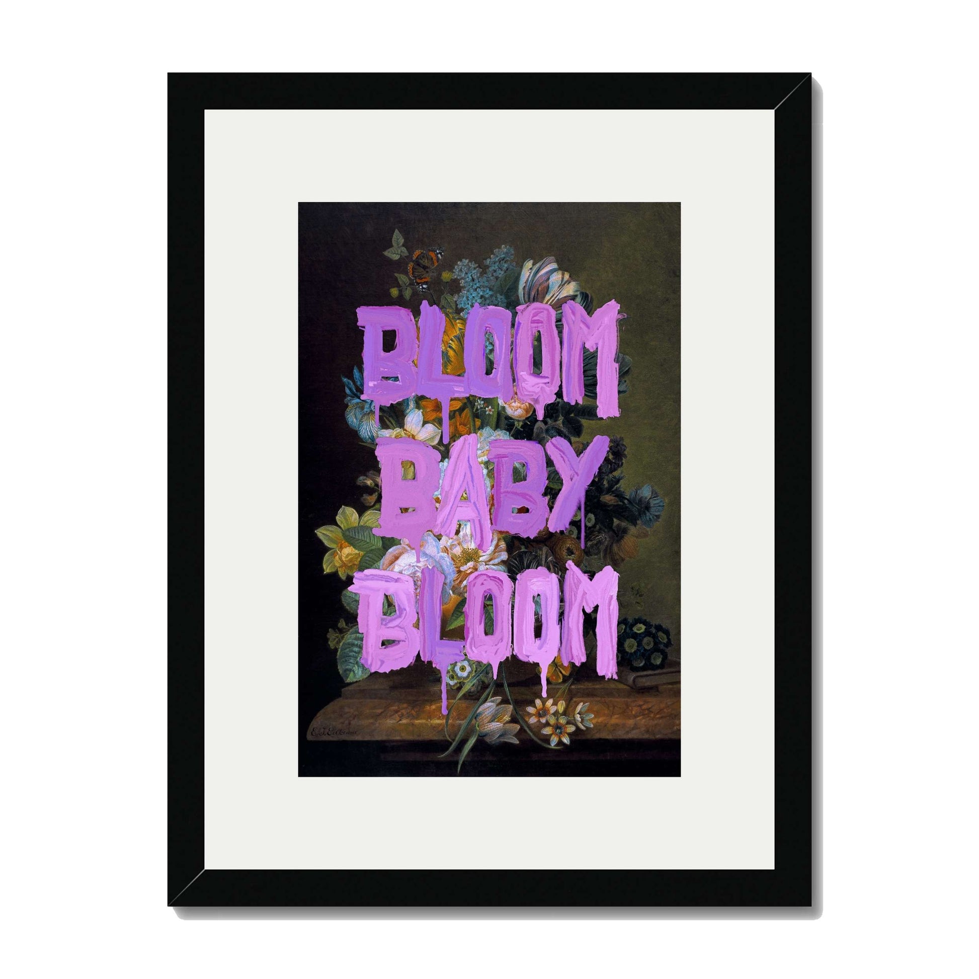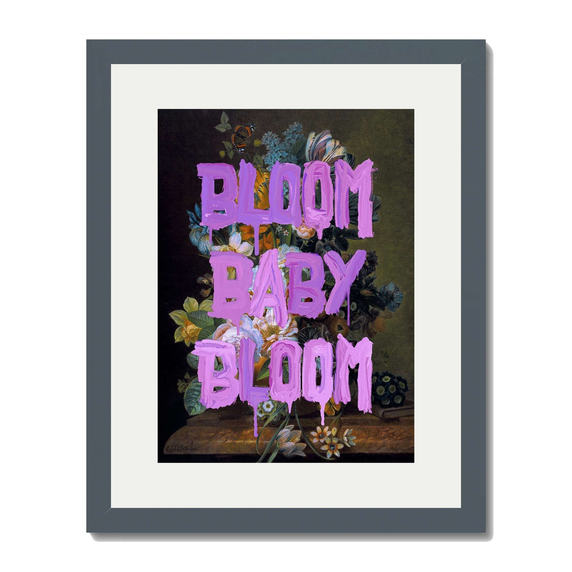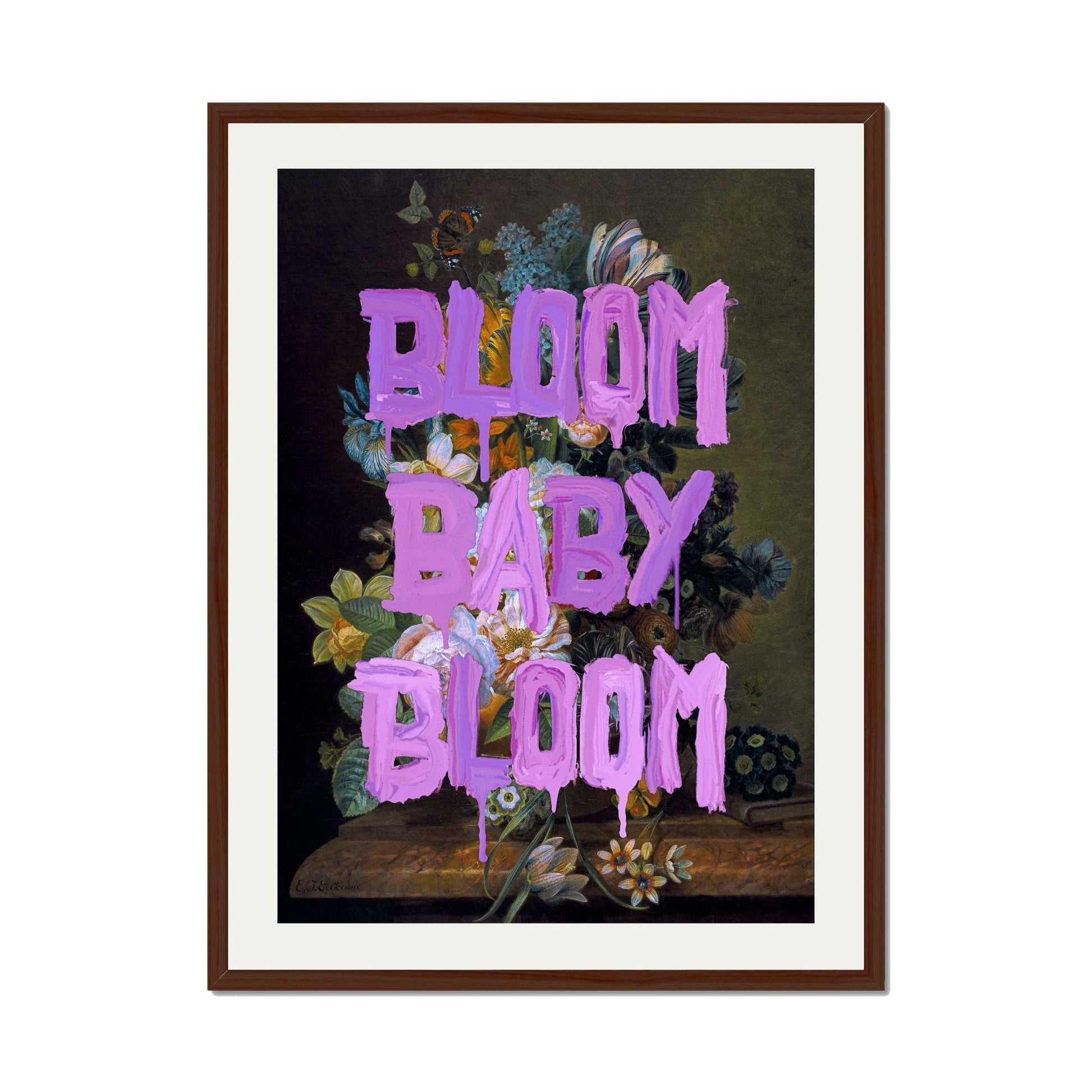 BLOOM BABY BLOOM is a bold wall art print with vibrant purple graffiti text over a dark floral still life. A striking mix of vintage beauty and modern motivation for any stylish space.