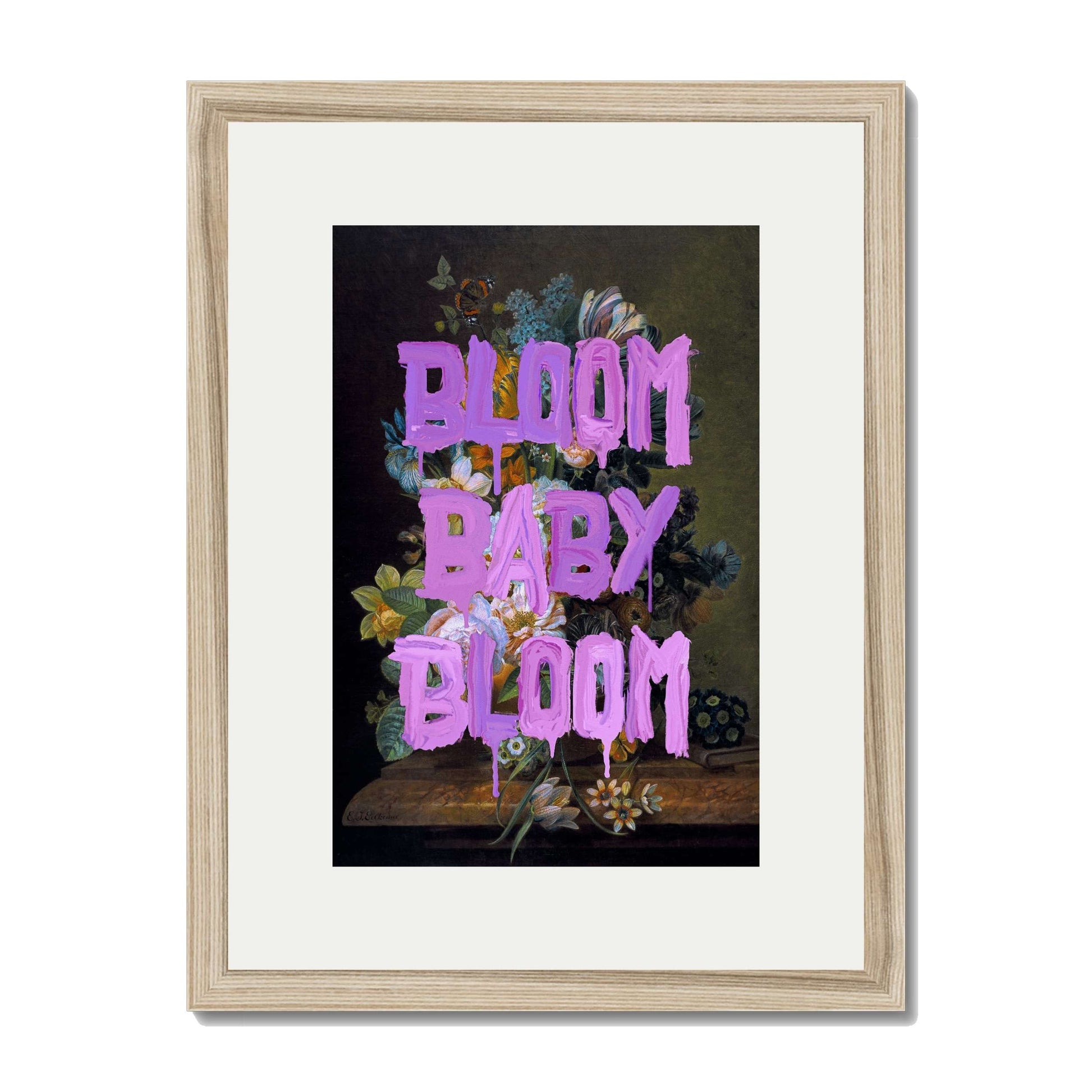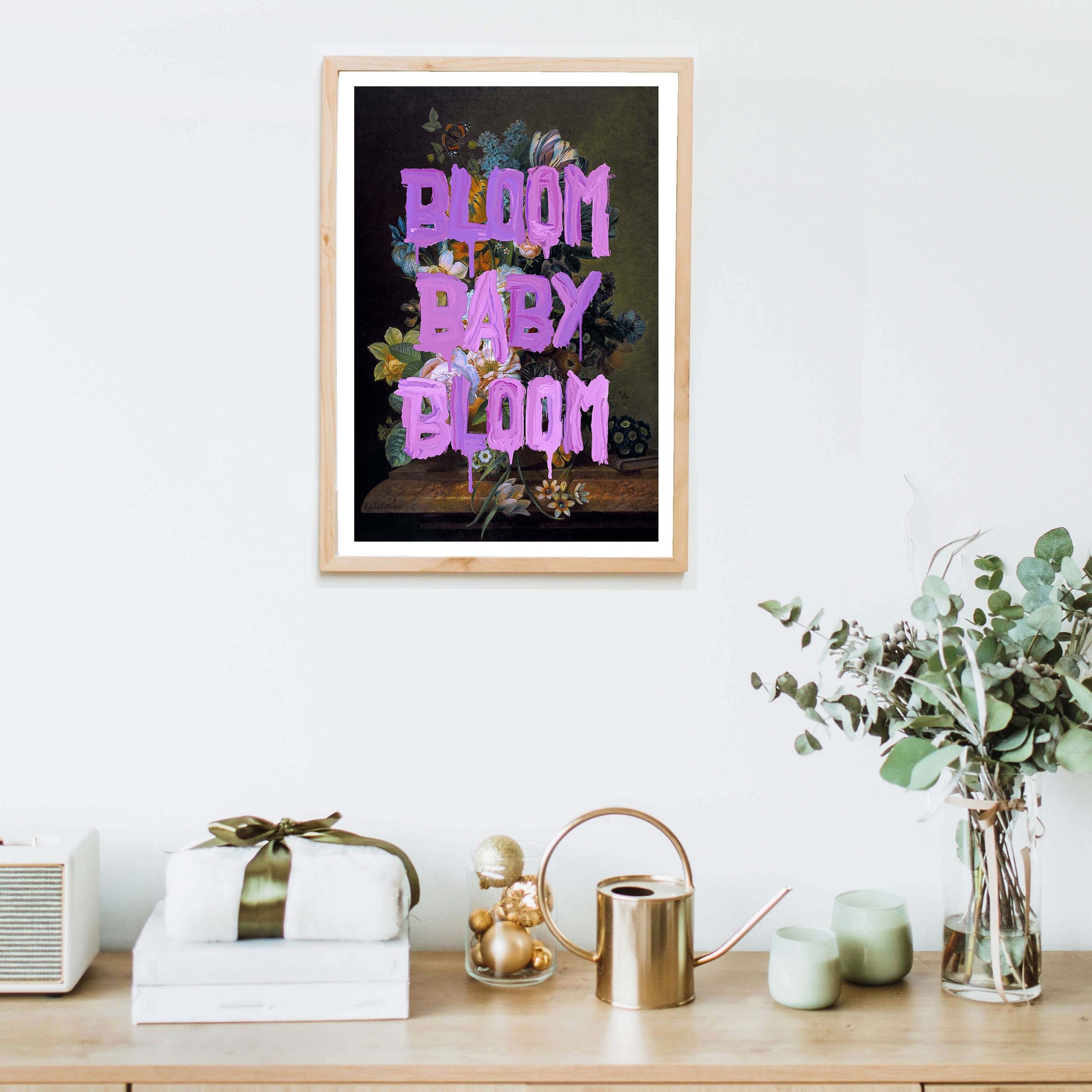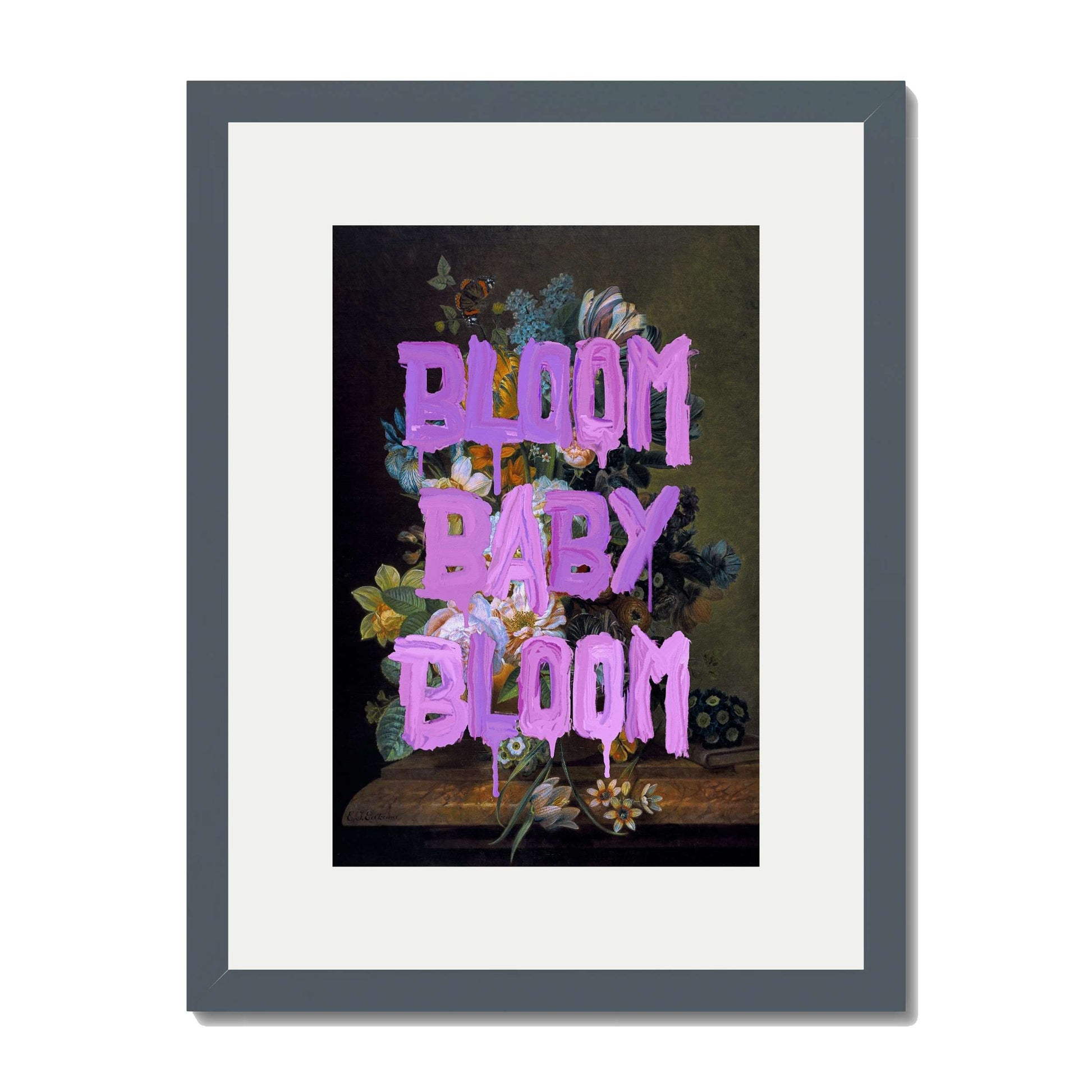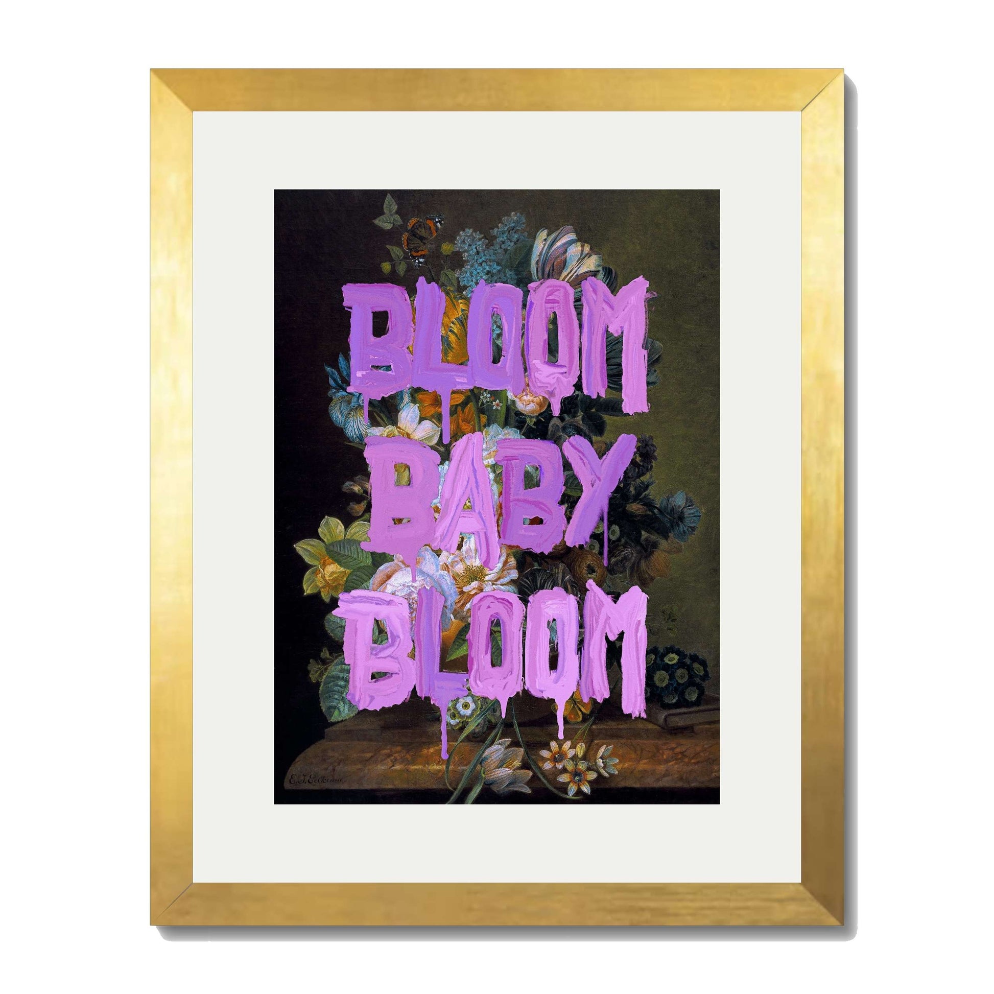 BLOOM BABY BLOOM is a bold wall art print with vibrant purple graffiti text over a dark floral still life. A striking mix of vintage beauty and modern motivation for any stylish space.