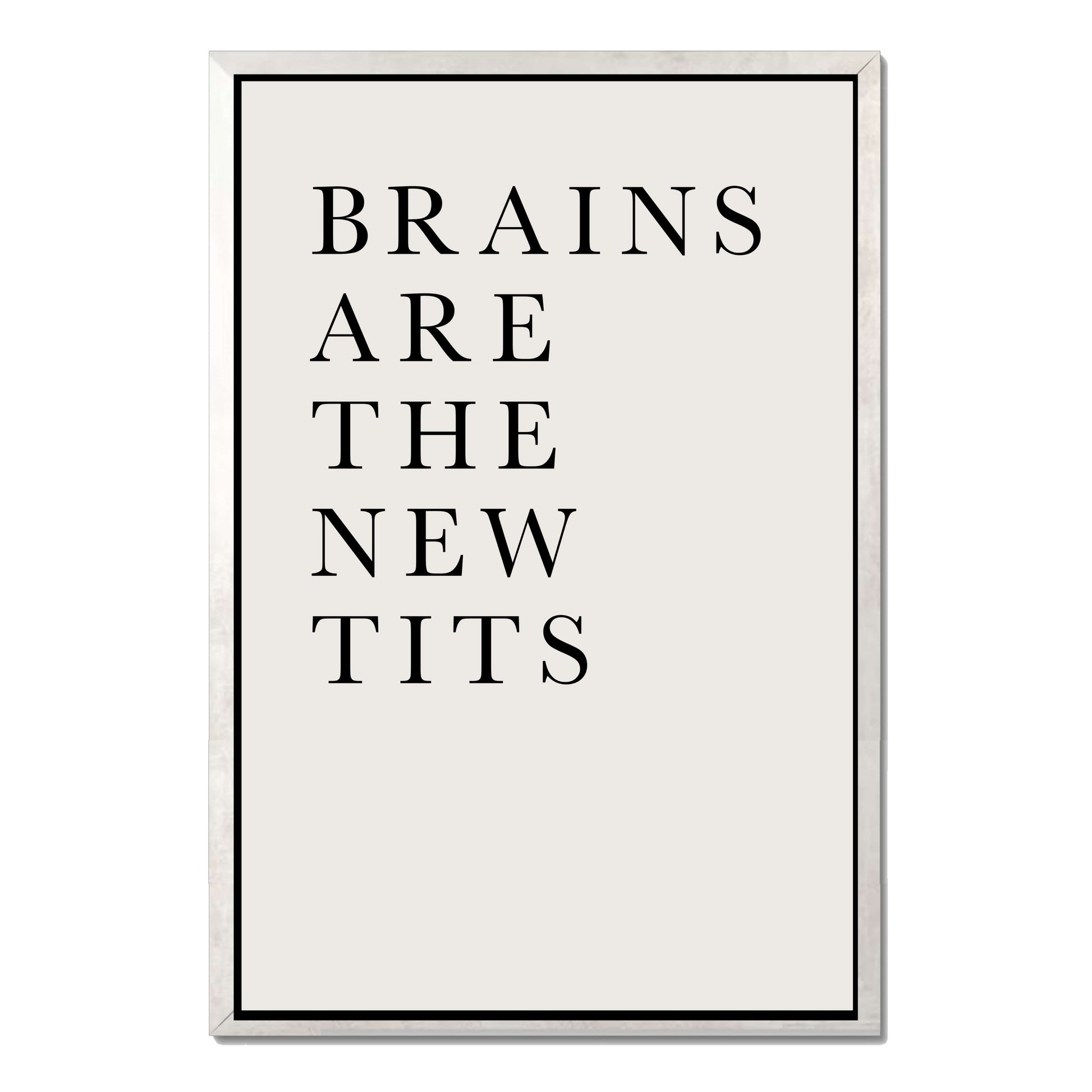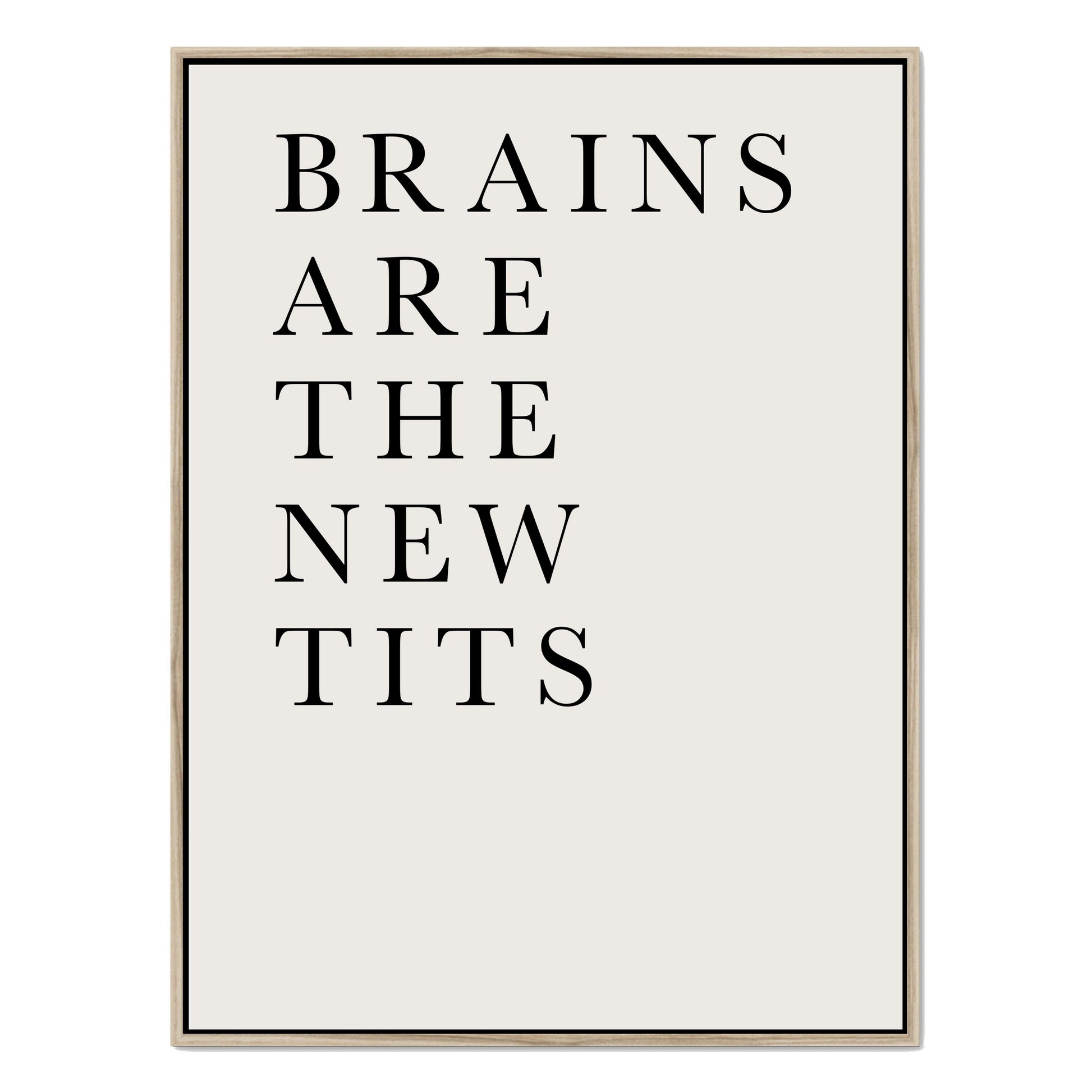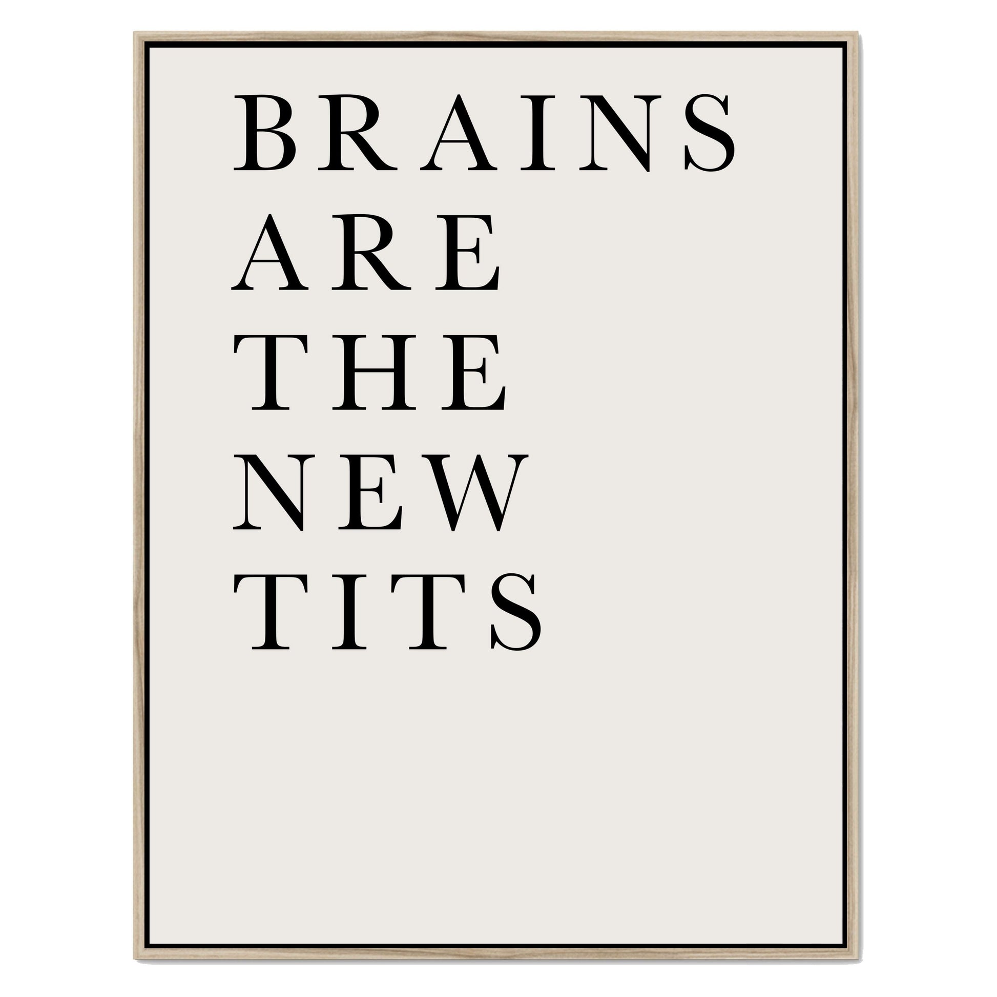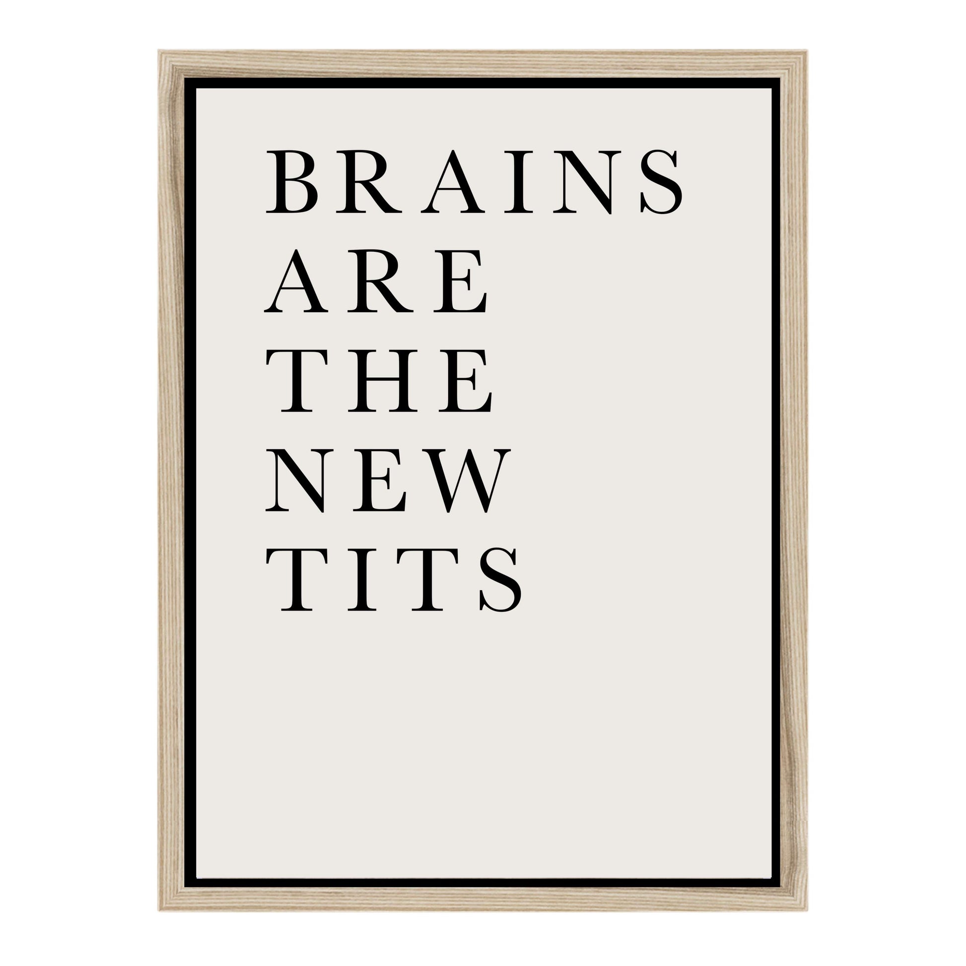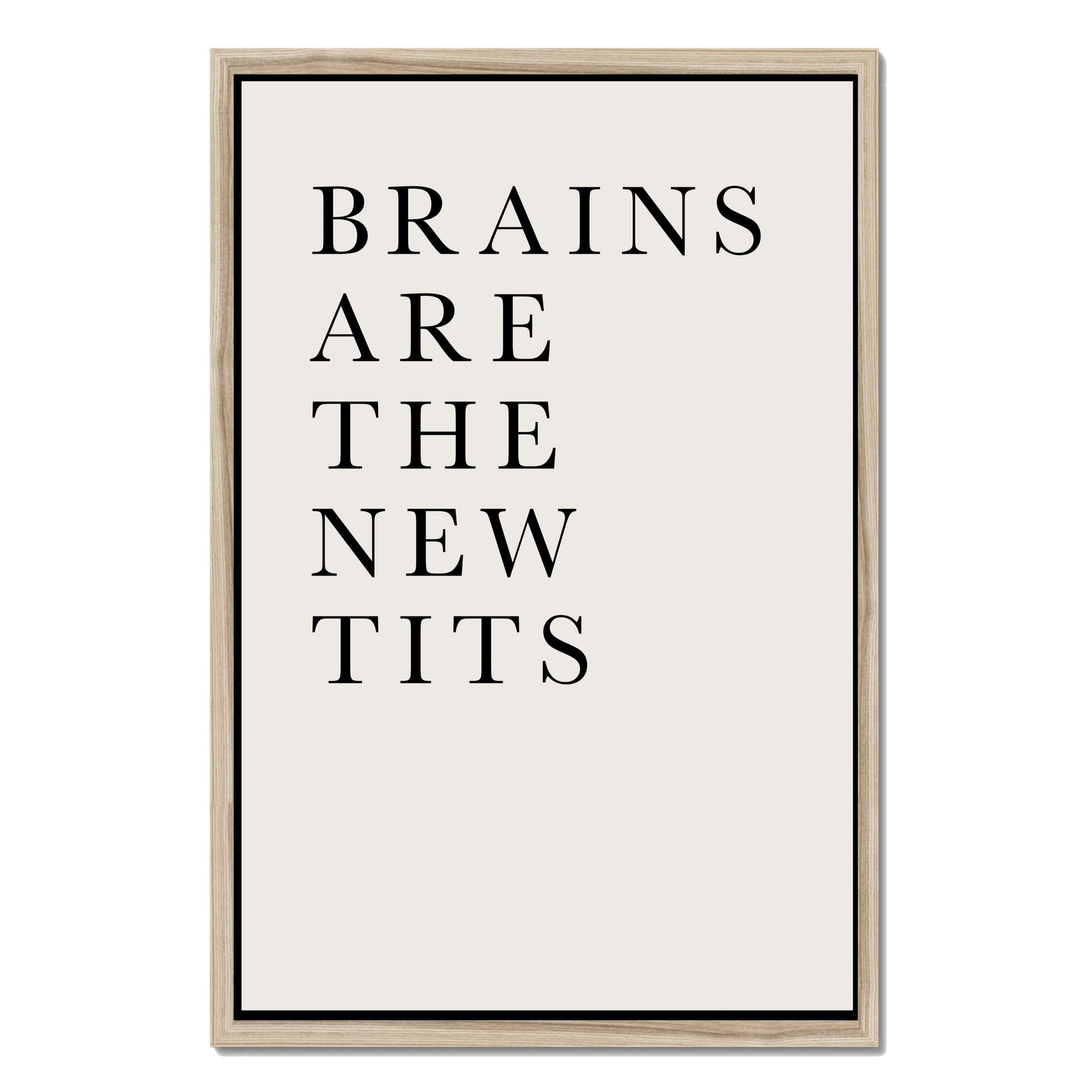 BRAINS ARE THE NEW TITS is a bold, feminist typographic canvas print featuring a powerful statement in sleek black serif font on a minimalist beige background. Perfect for modern, empowering interiors.
