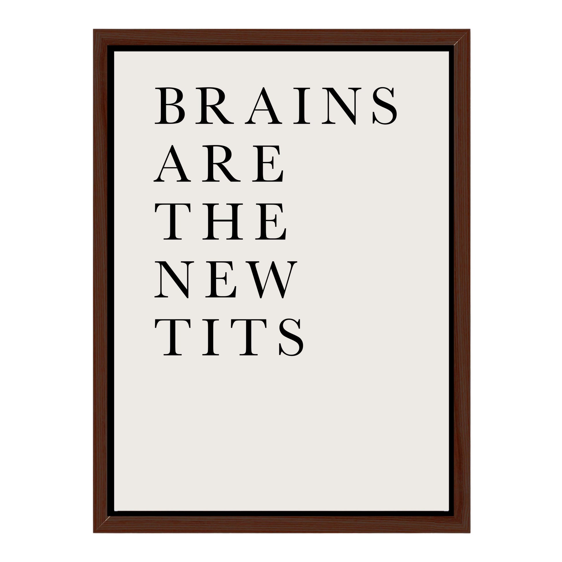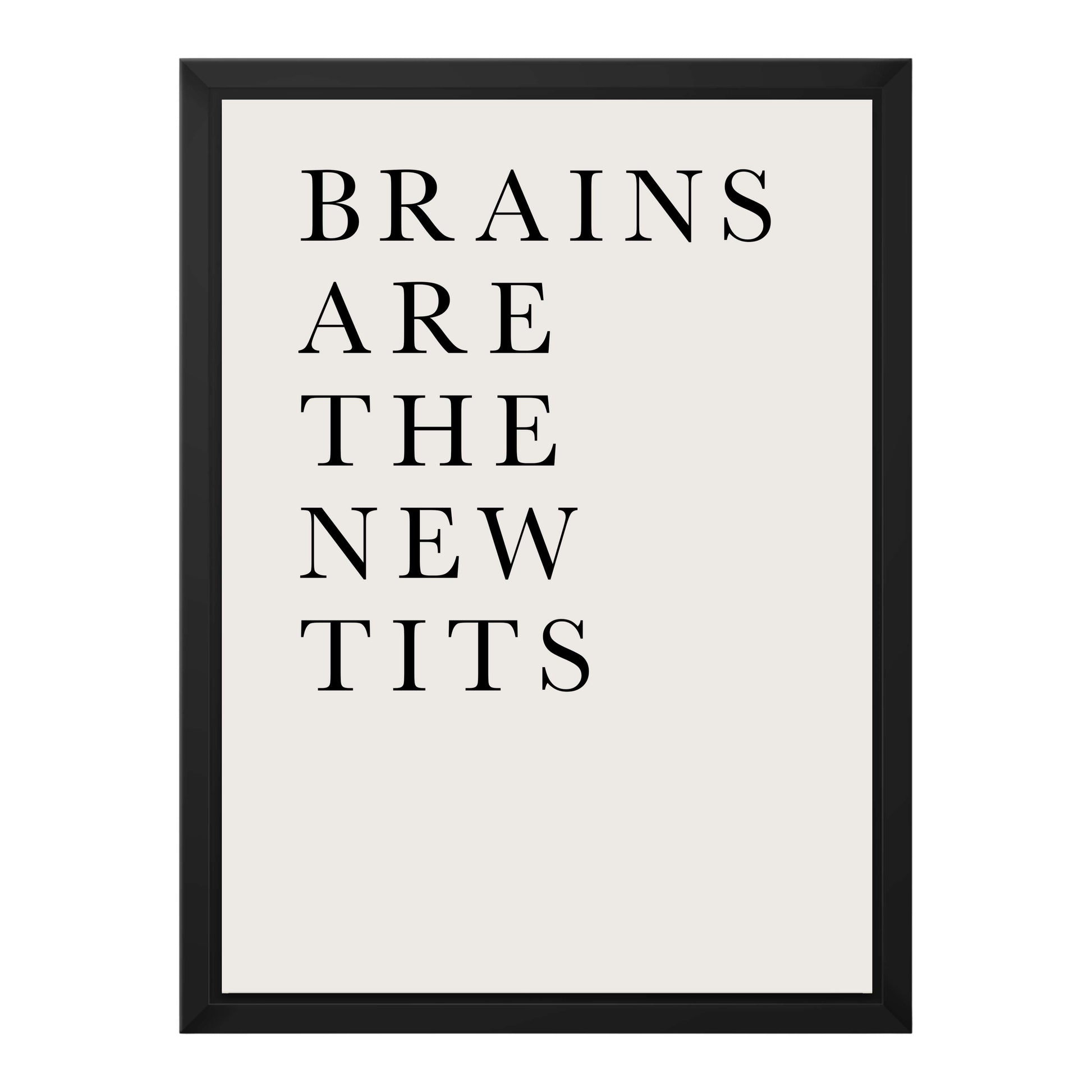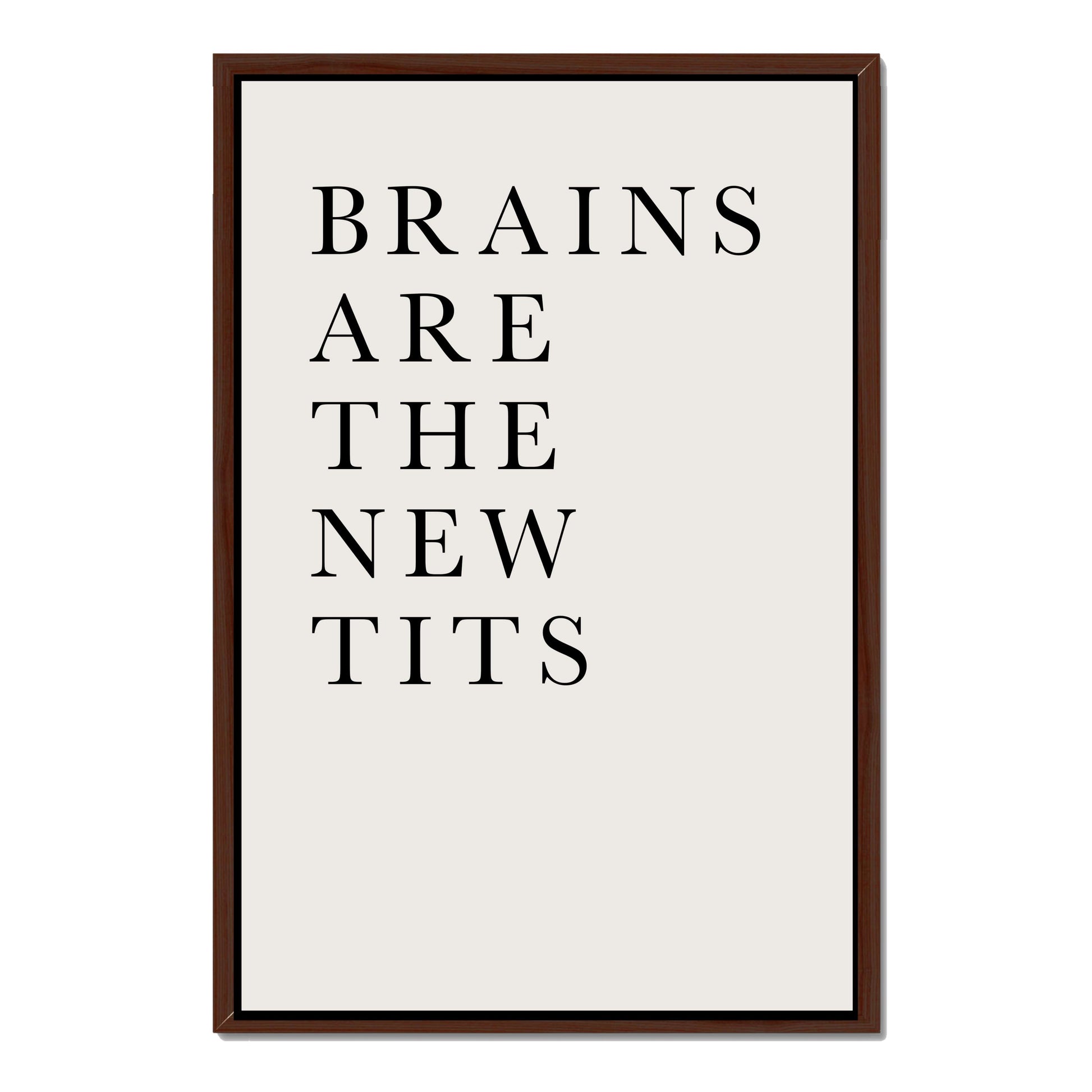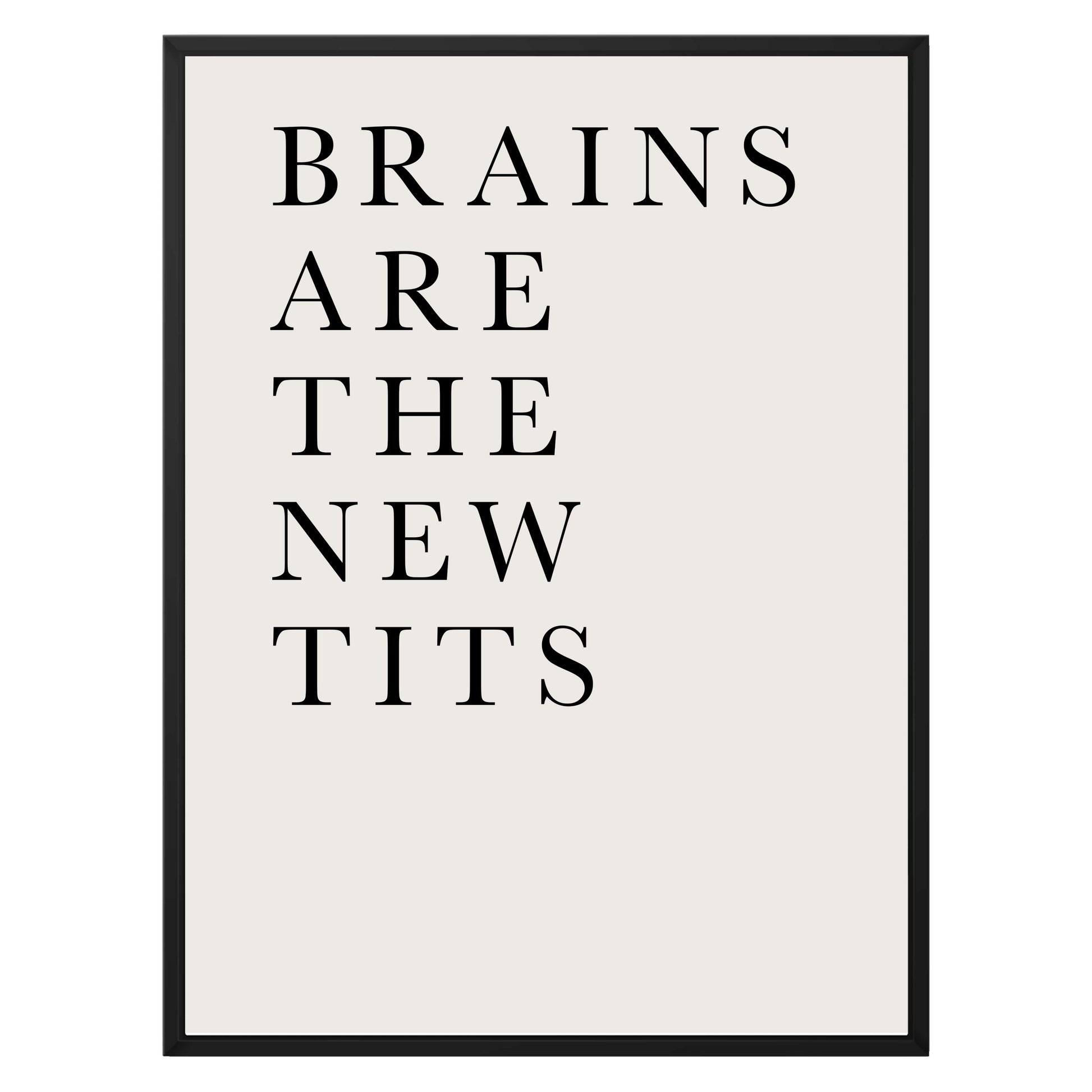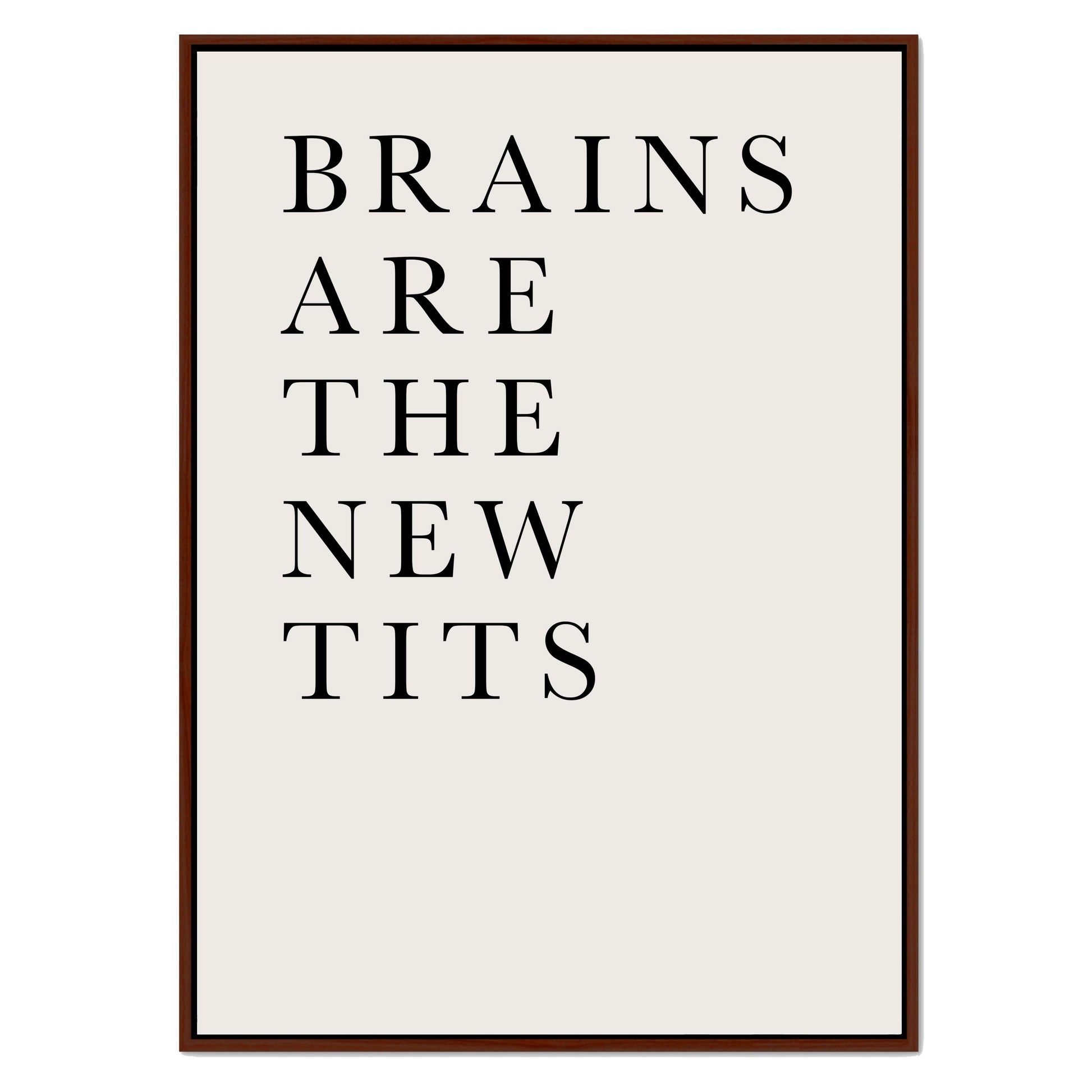 BRAINS ARE THE NEW TITS is a bold, feminist typographic canvas print featuring a powerful statement in sleek black serif font on a minimalist beige background. Perfect for modern, empowering interiors.