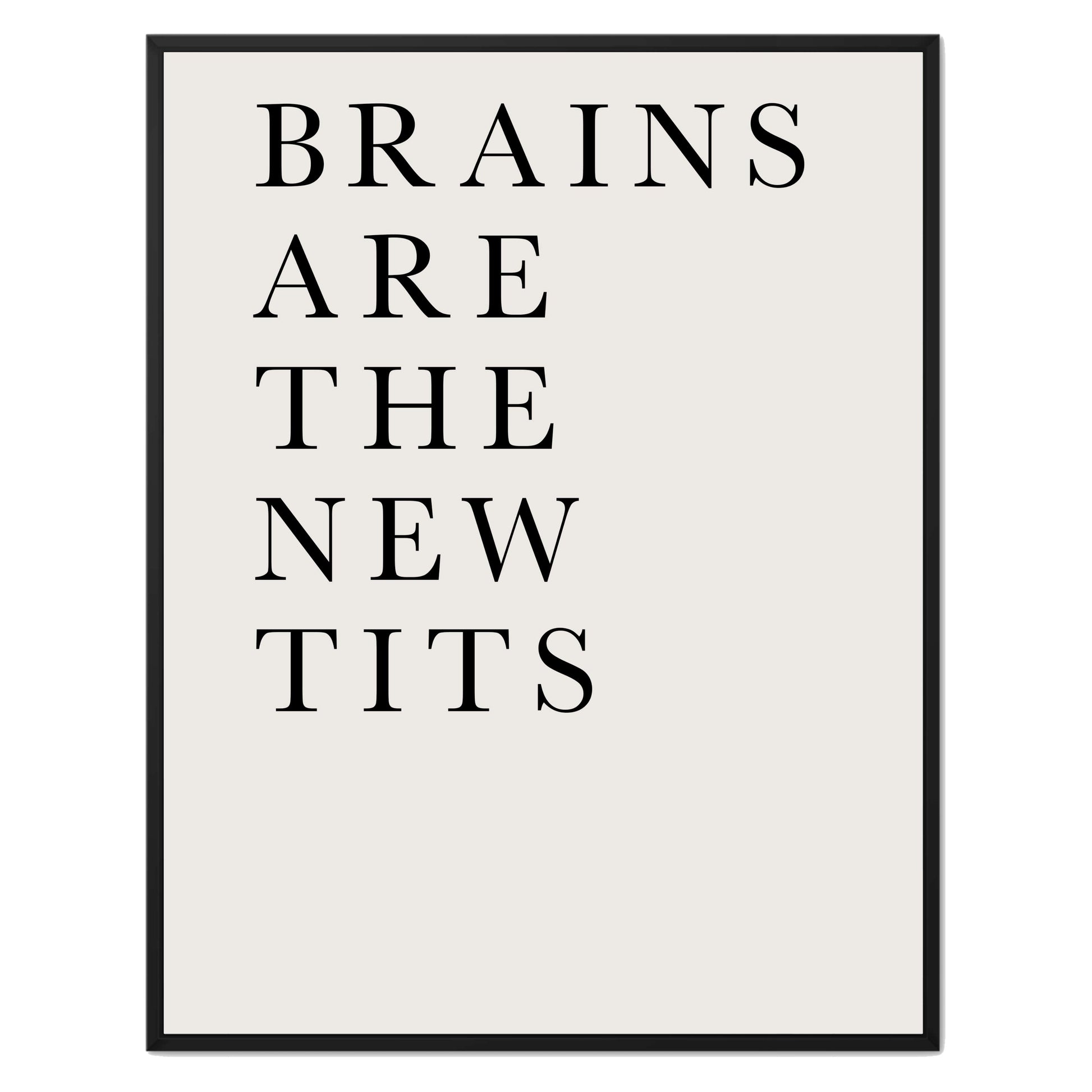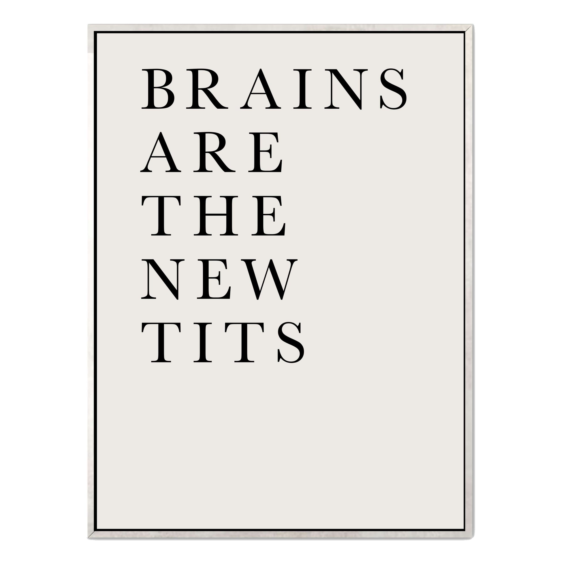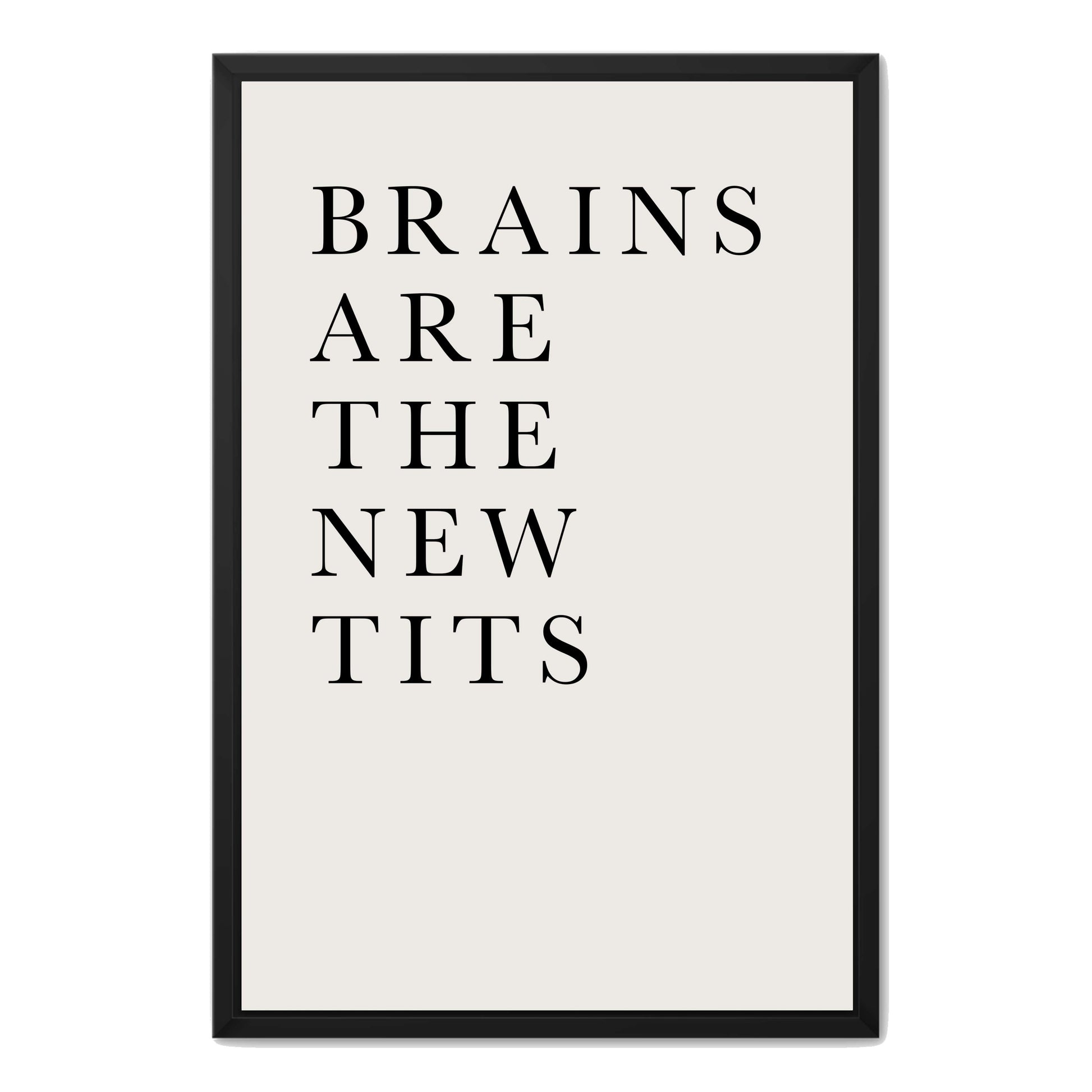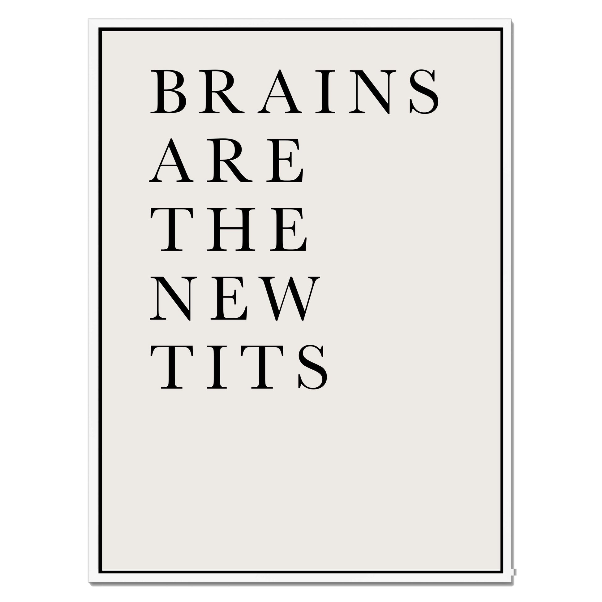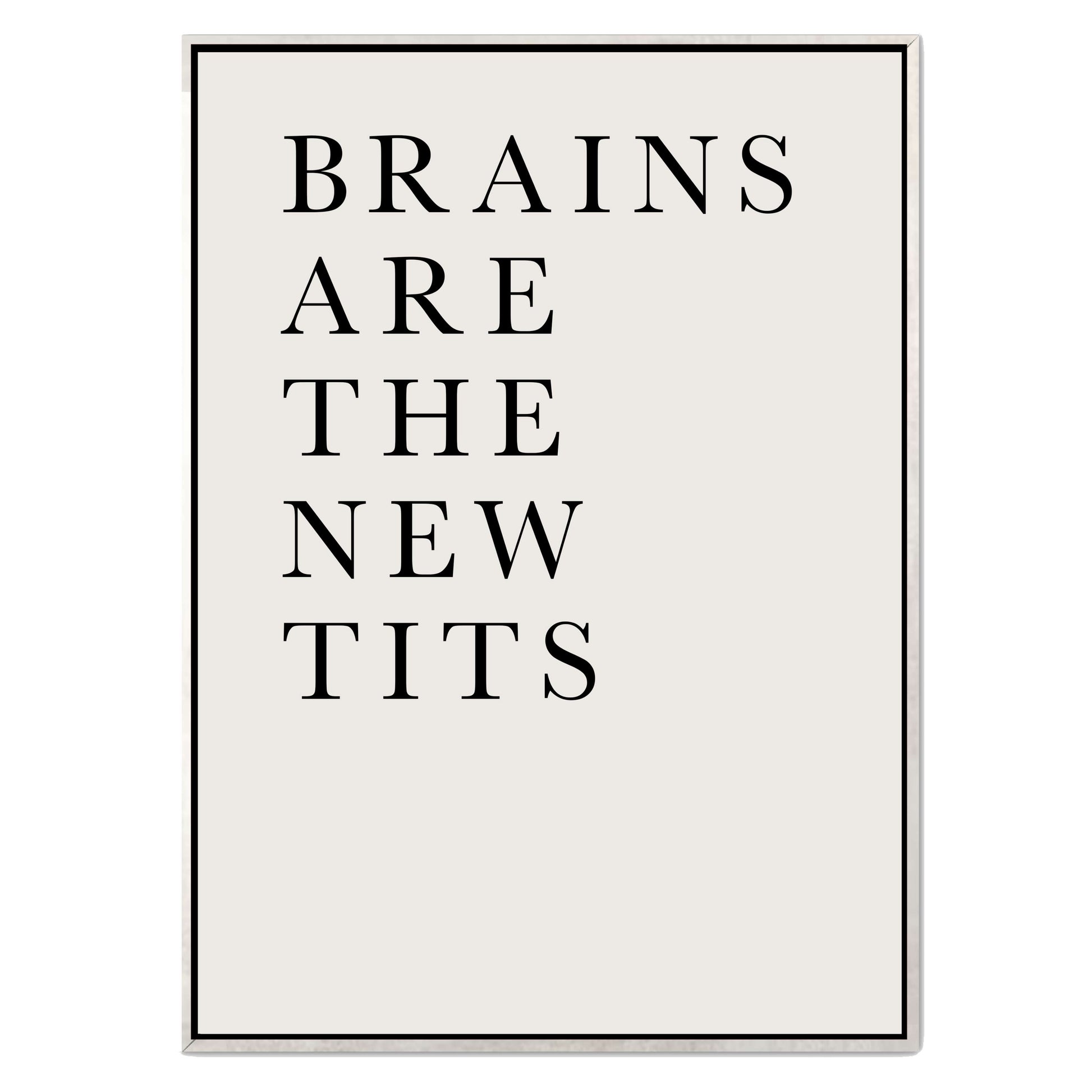 BRAINS ARE THE NEW TITS is a bold, feminist typographic canvas print featuring a powerful statement in sleek black serif font on a minimalist beige background. Perfect for modern, empowering interiors.