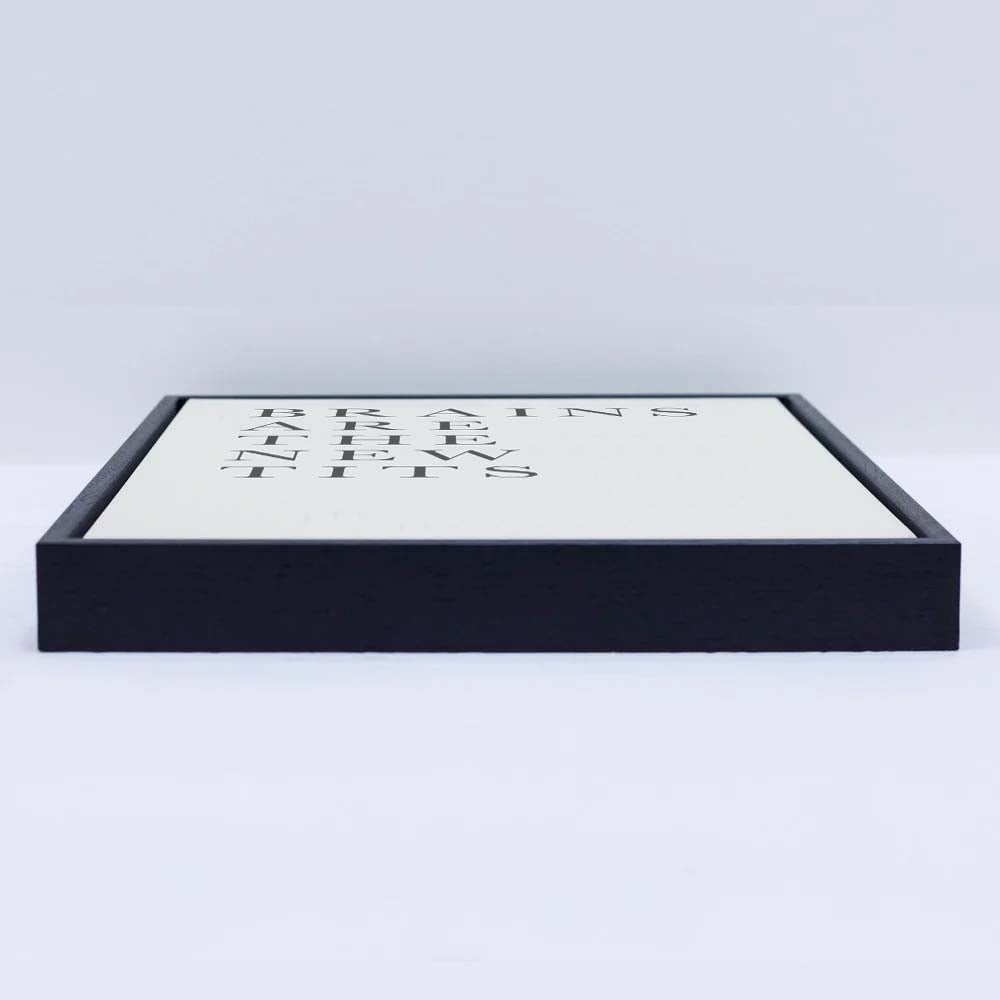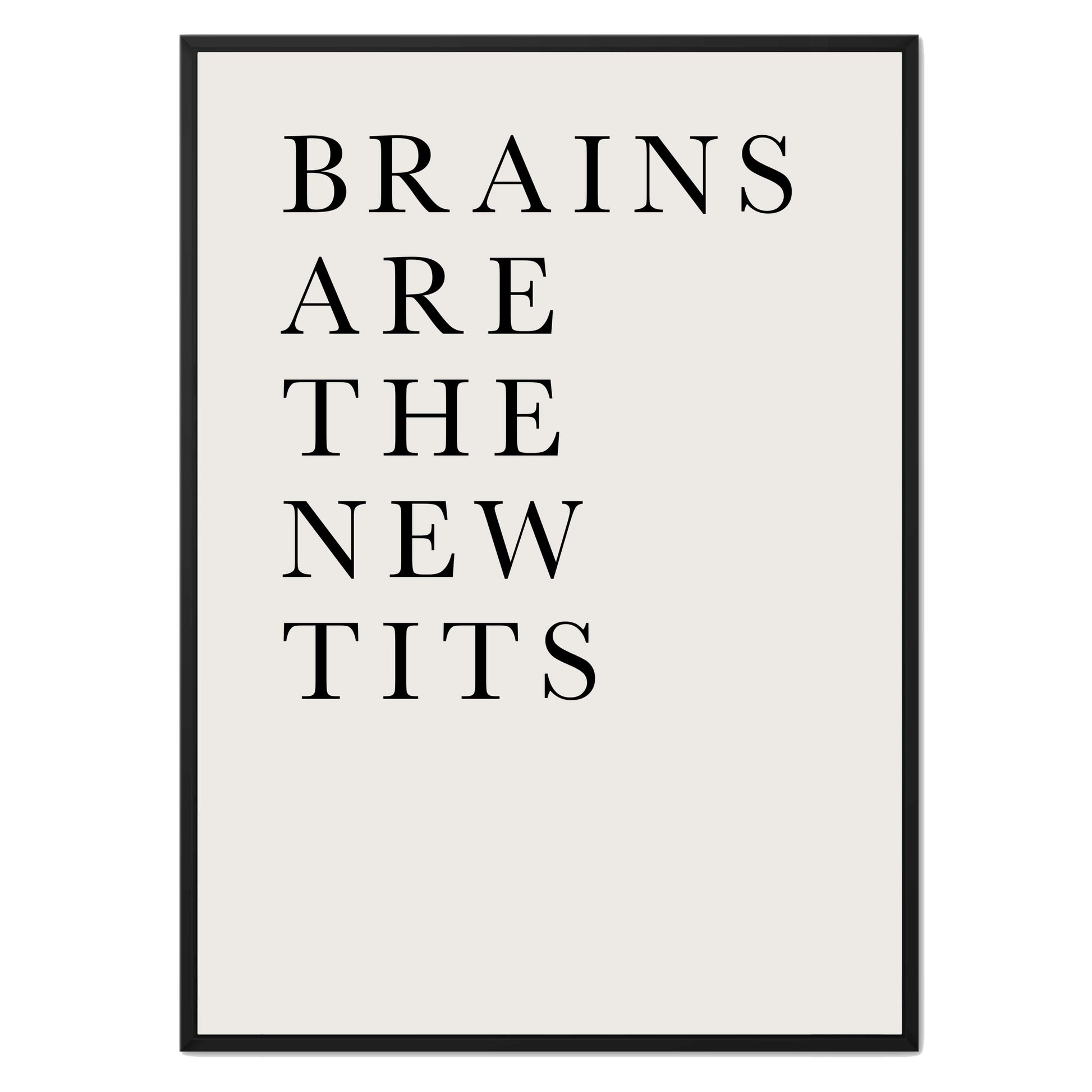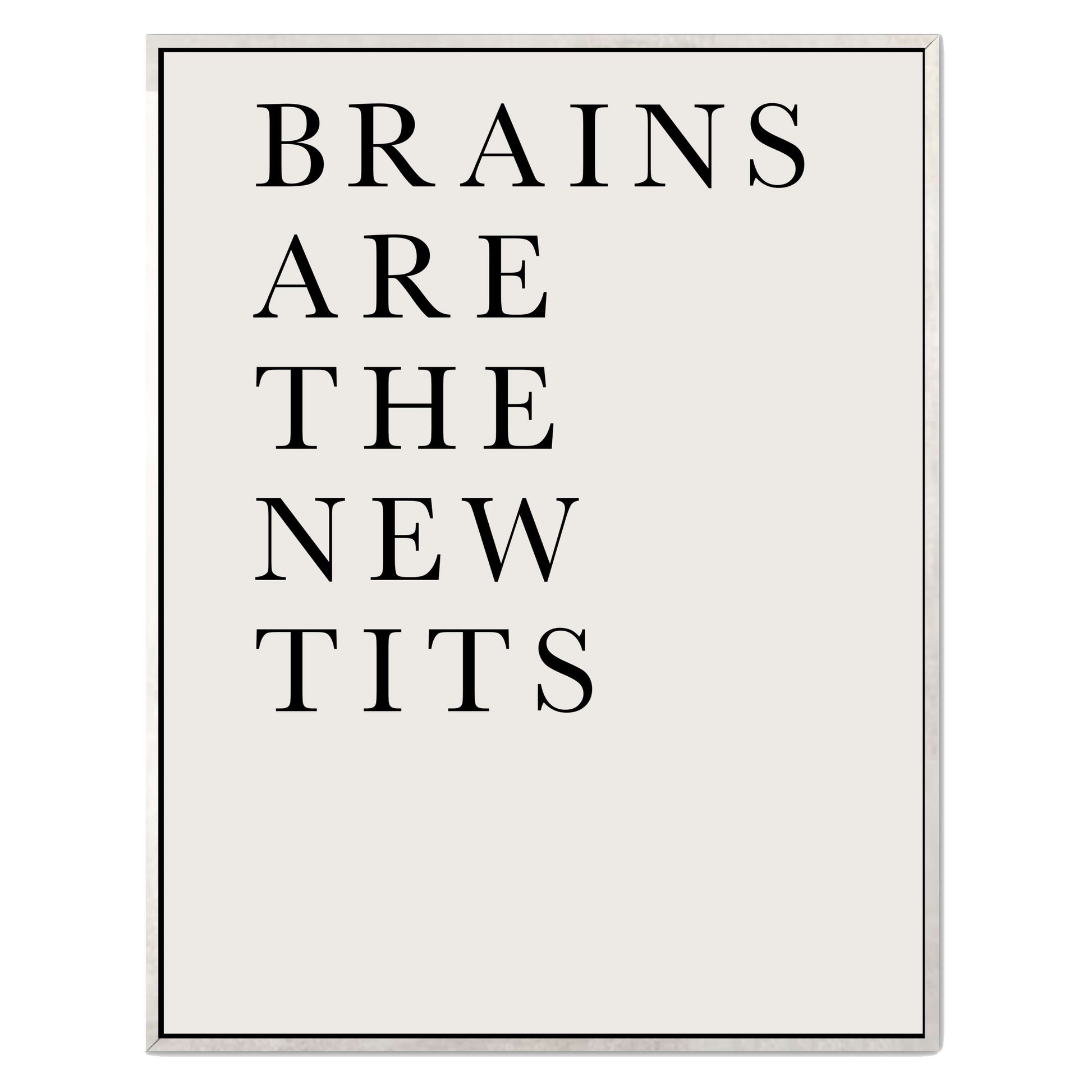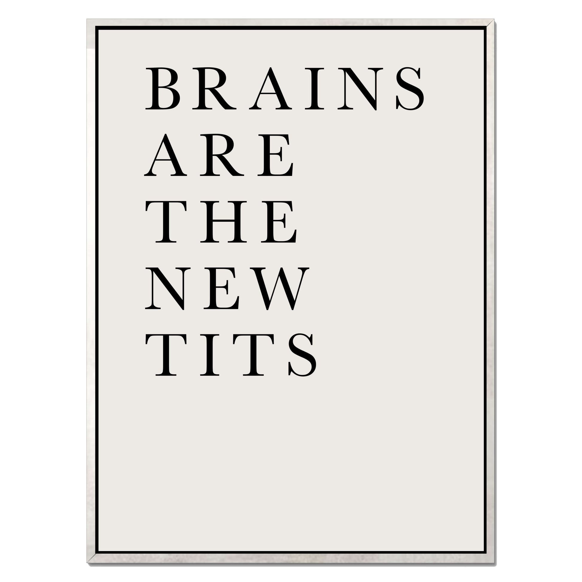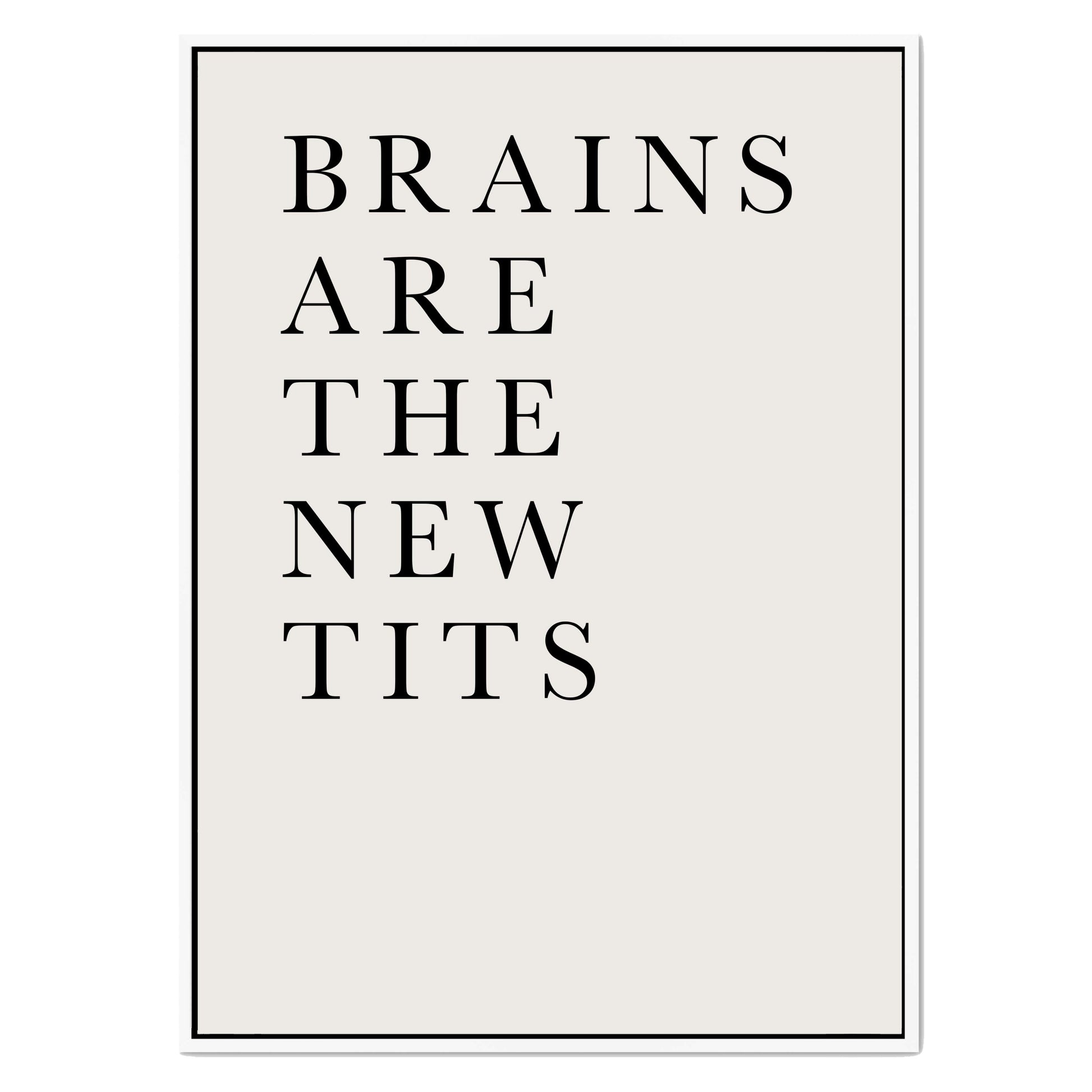 BRAINS ARE THE NEW TITS is a bold, feminist typographic canvas print featuring a powerful statement in sleek black serif font on a minimalist beige background. Perfect for modern, empowering interiors.