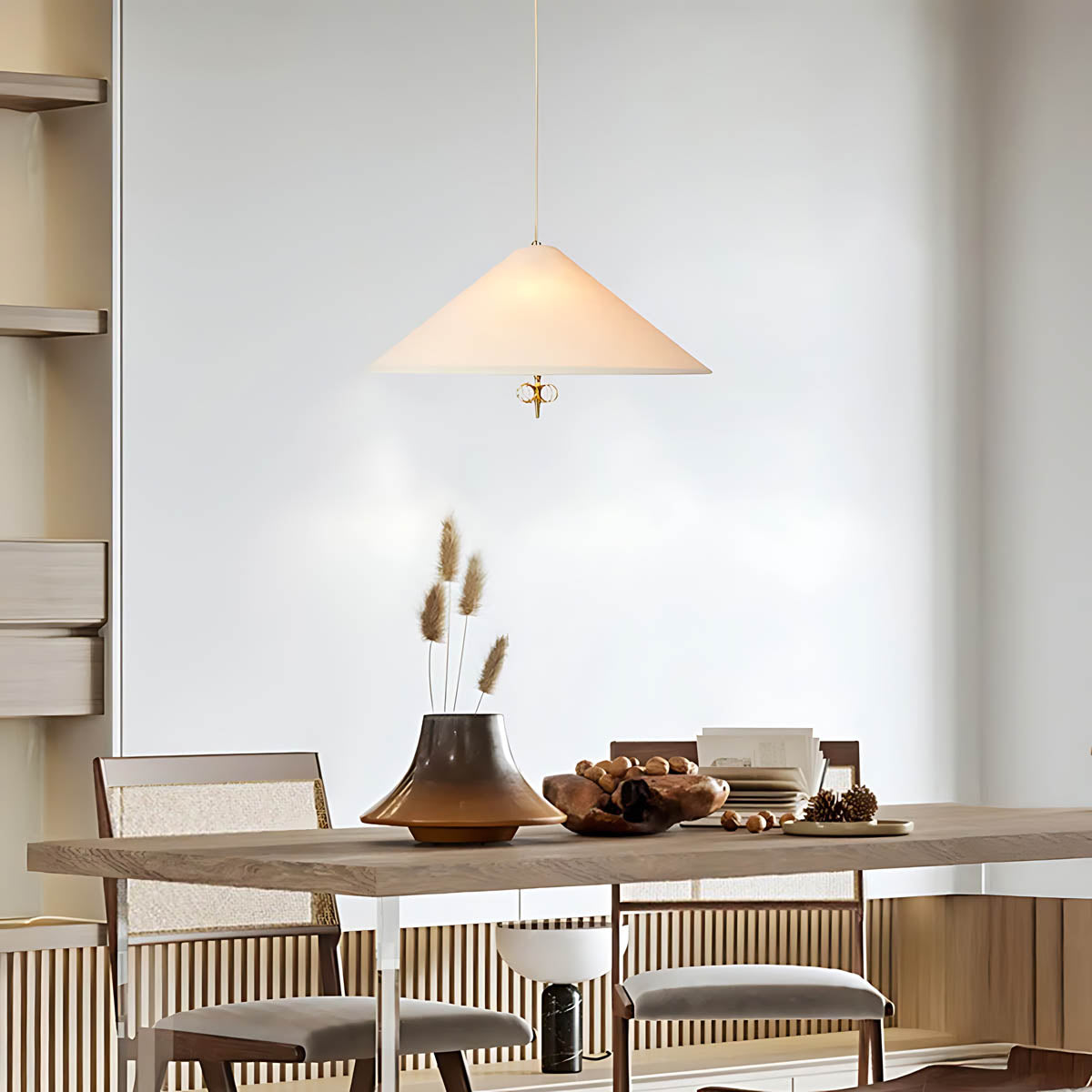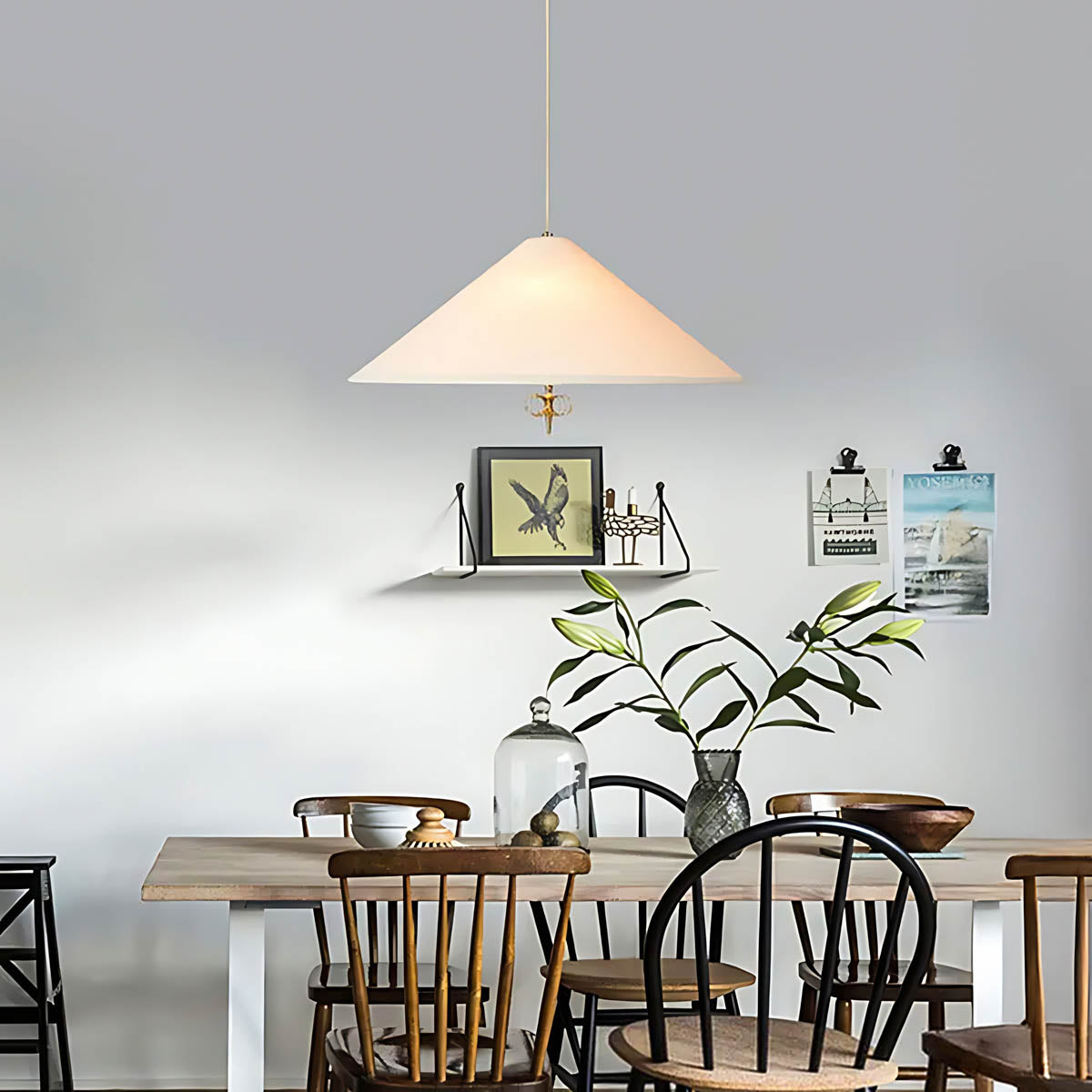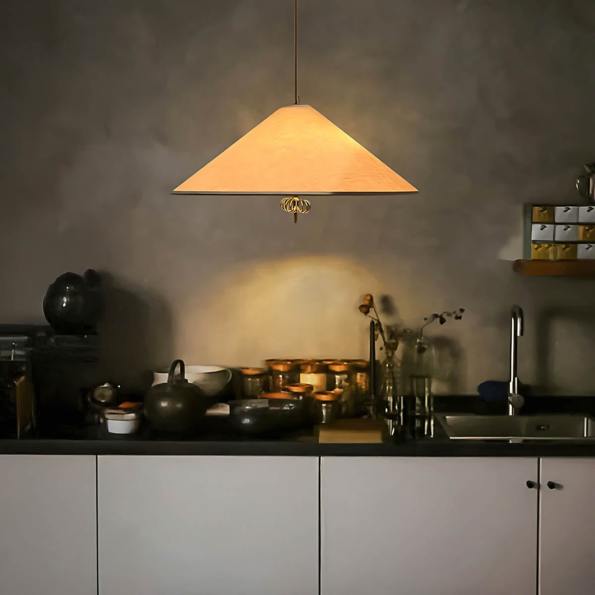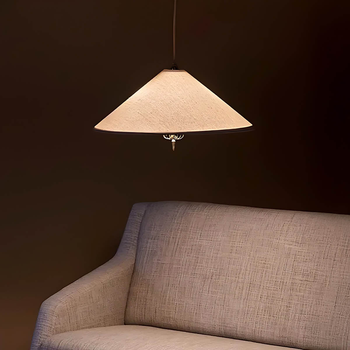 Its wide, conical shade casts a gentle, glare-free glow downward for perfect task lighting over dining tables, kitchen islands, and cozy reading corners, while the subtly translucent textile adds ambient radiance around the room.