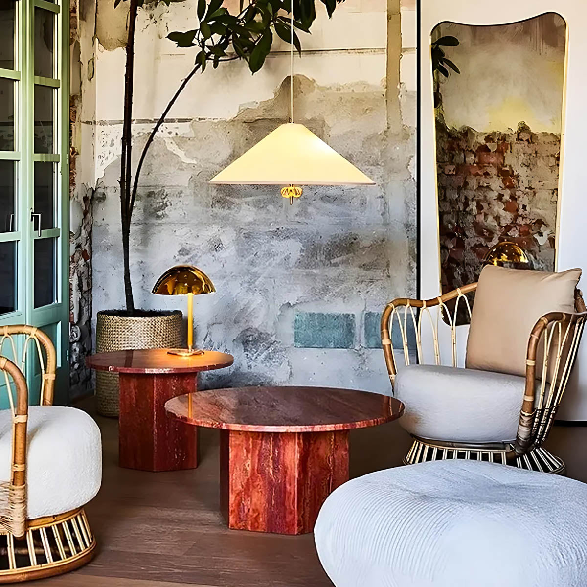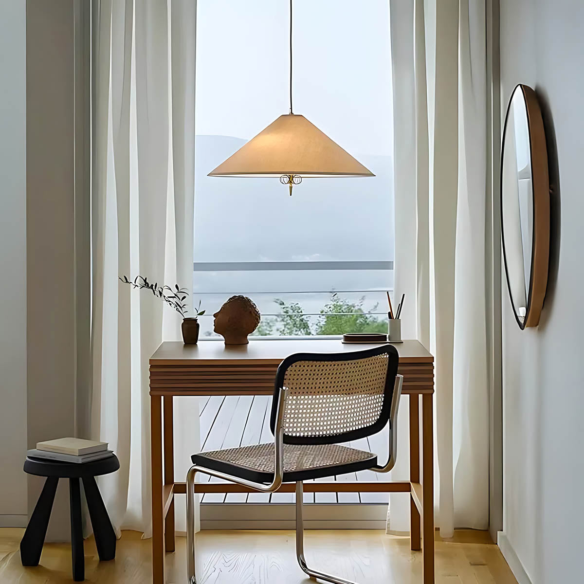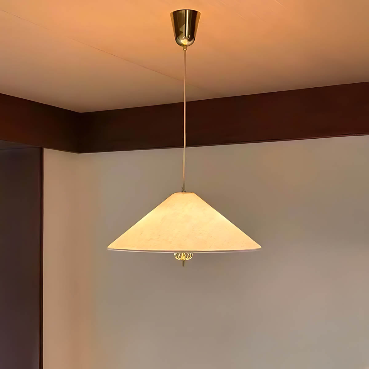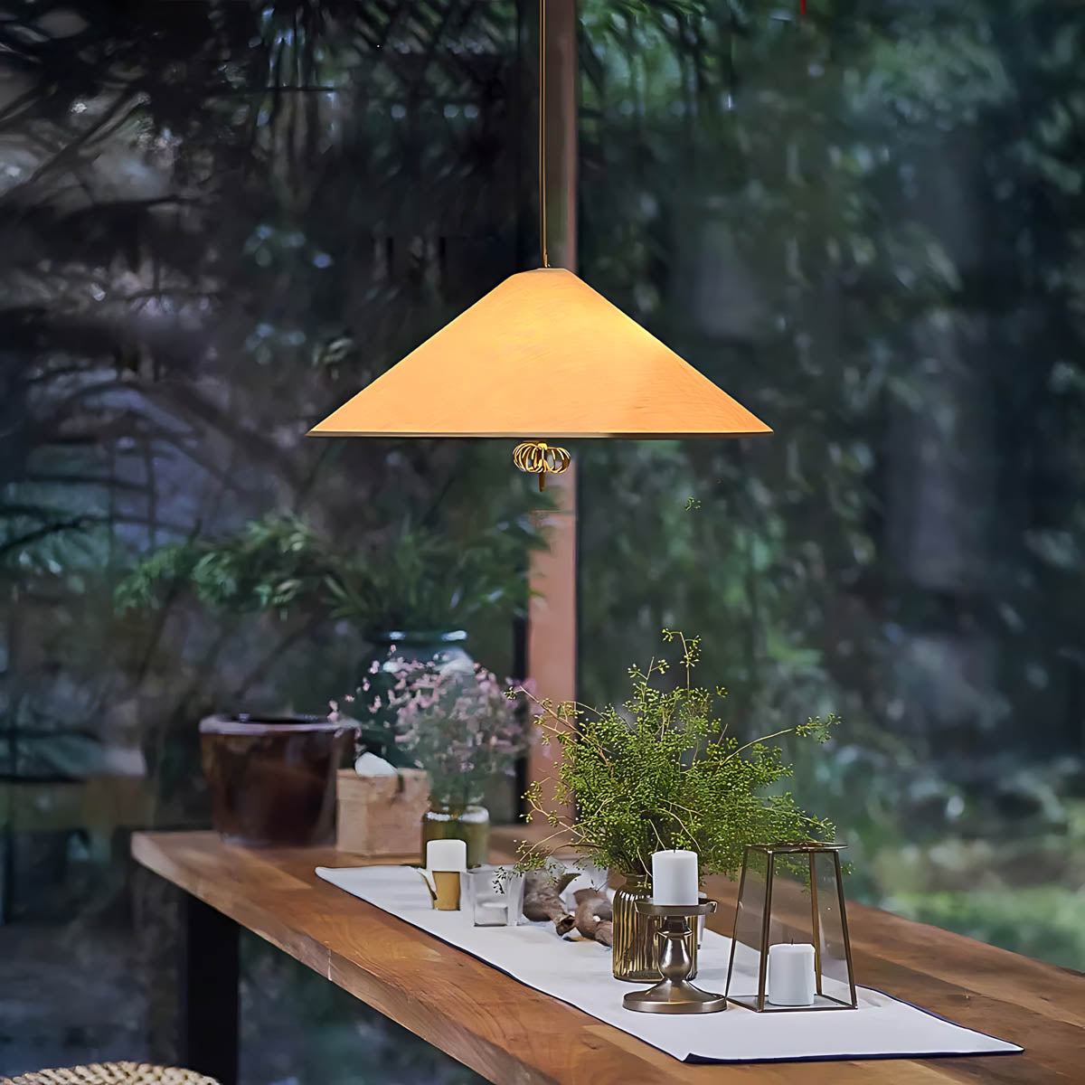 Its wide, conical shade casts a gentle, glare-free glow downward for perfect task lighting over dining tables, kitchen islands, and cozy reading corners, while the subtly translucent textile adds ambient radiance around the room.