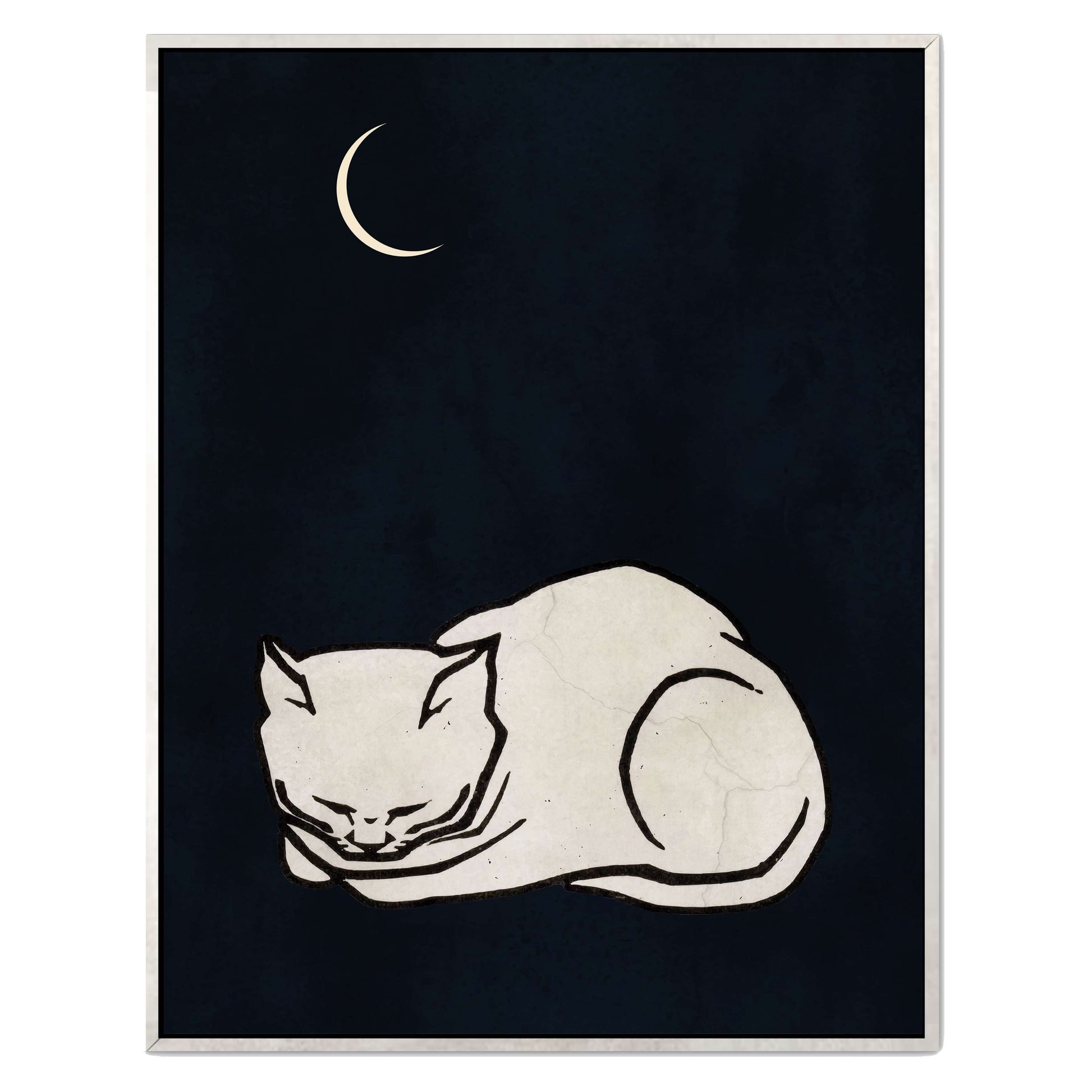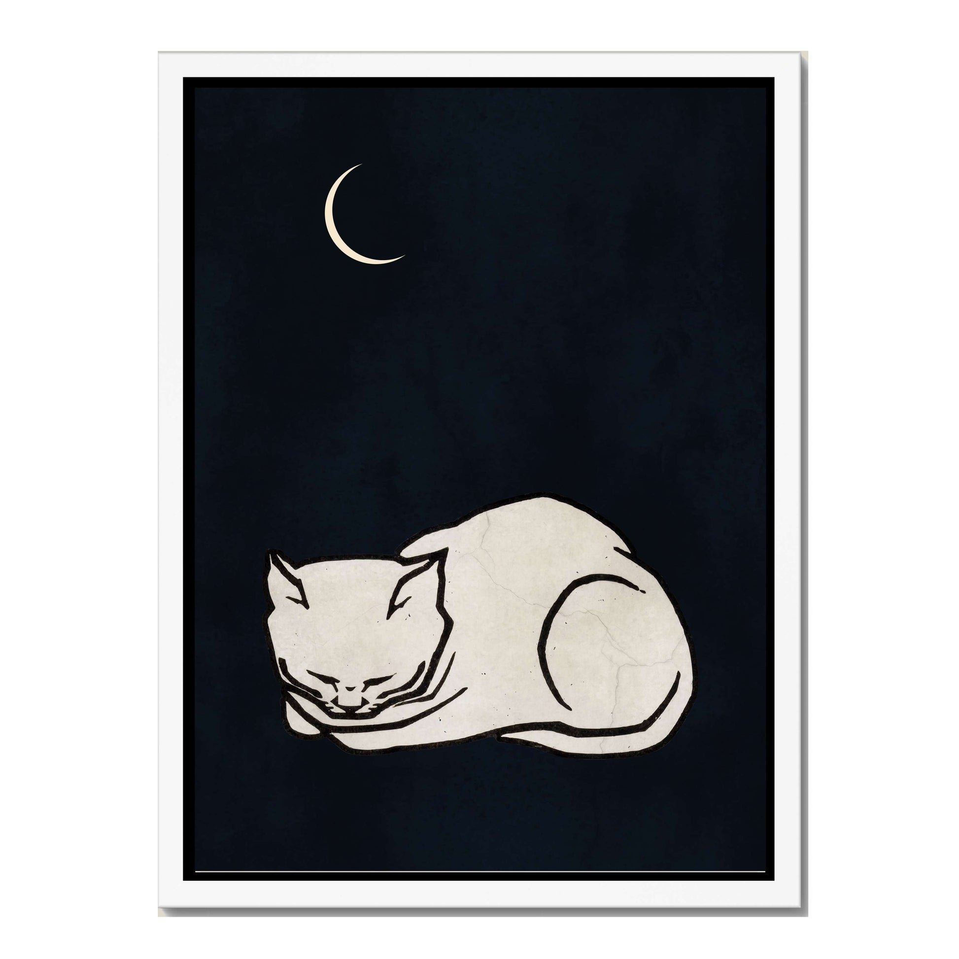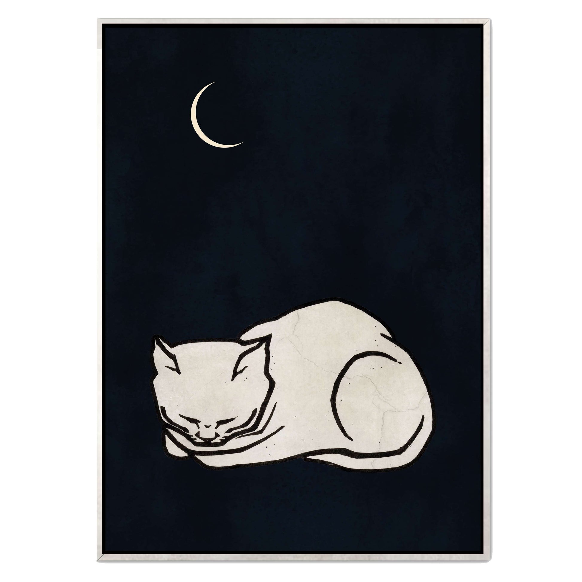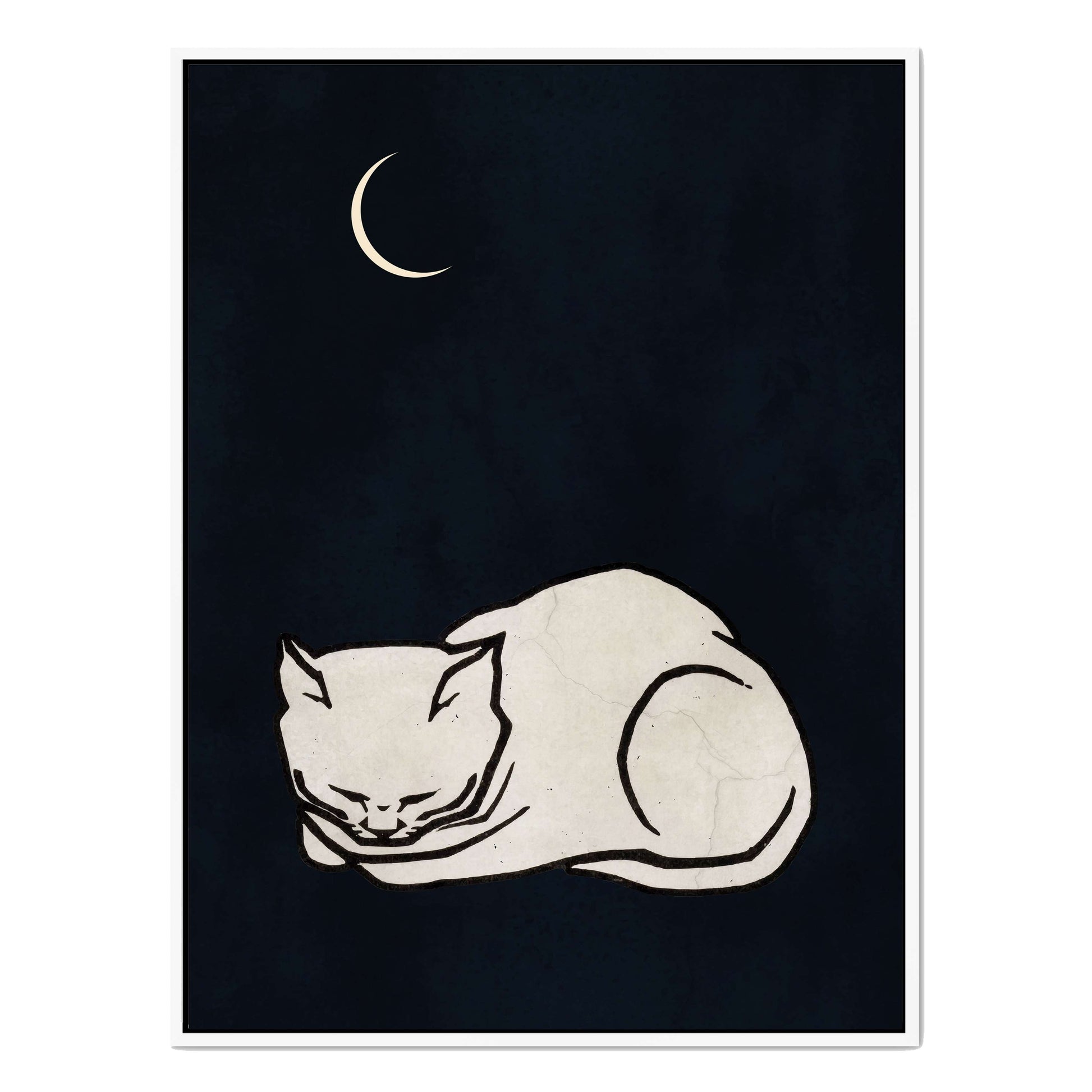 COZY DREAMS is a calming minimalist art print featuring a curled-up white cat sleeping peacefully beneath a glowing crescent moon on a deep, night-sky background. Perfect for creating a tranquil, comforting vibe in bedrooms, nurseries, or cozy spaces.