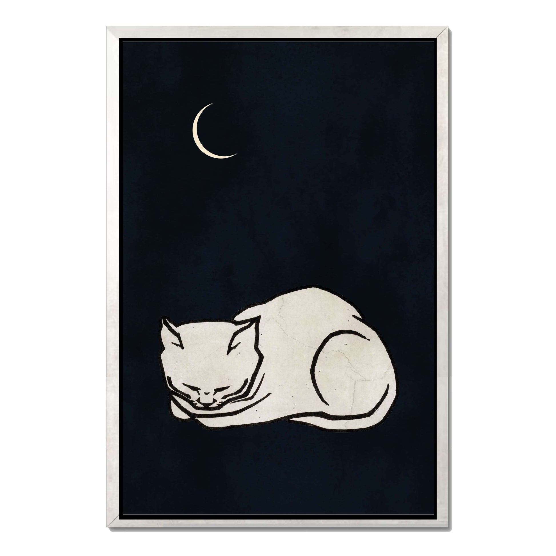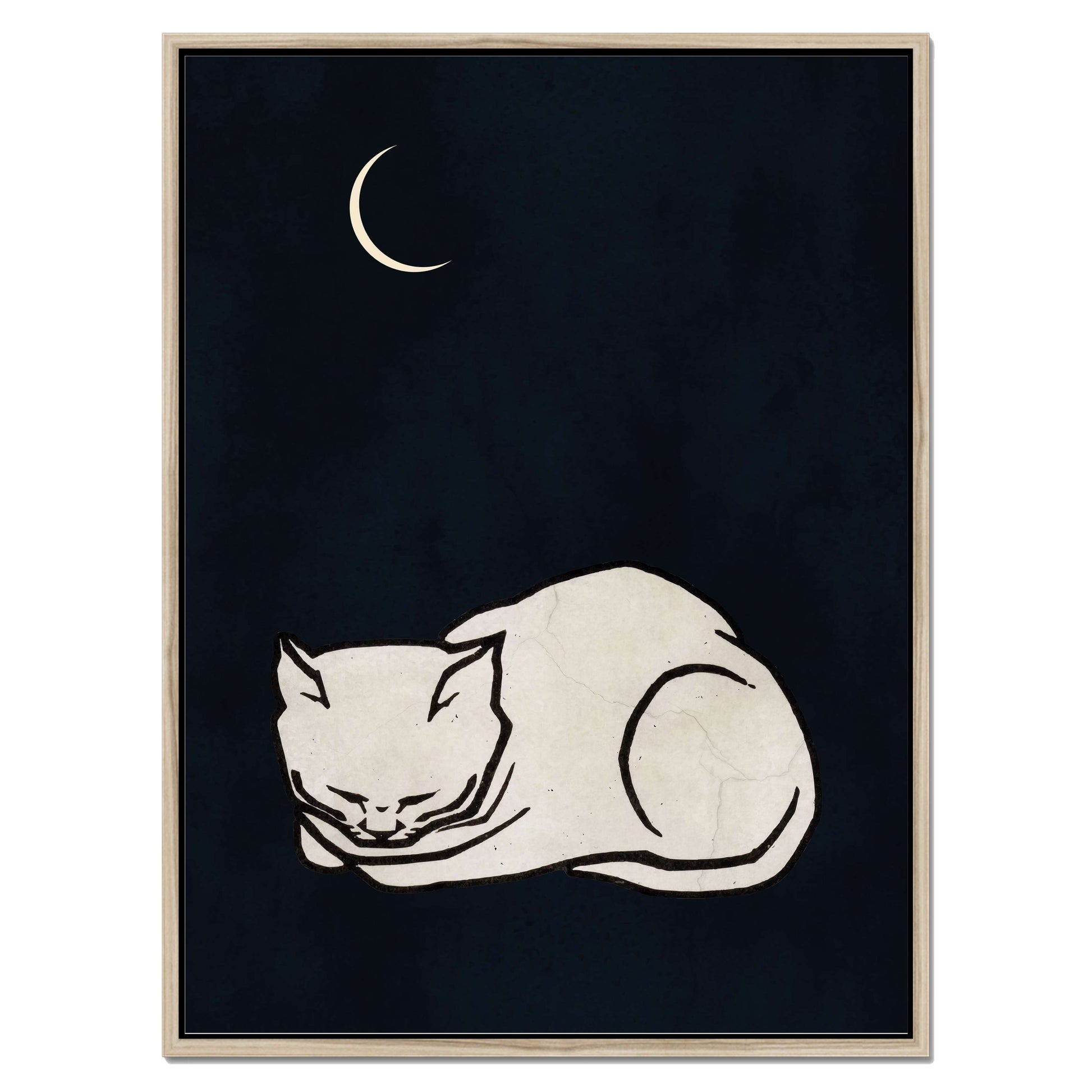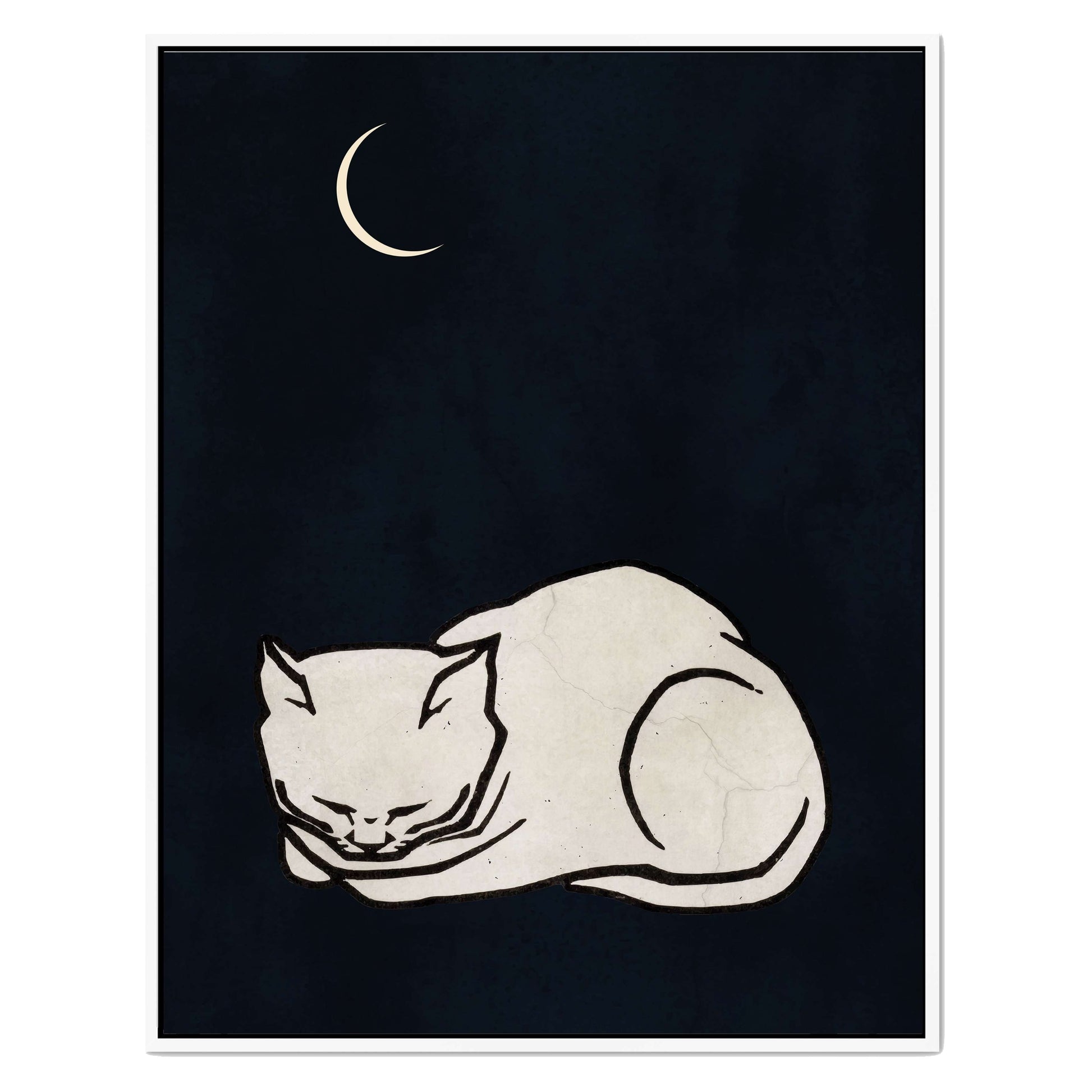 COZY DREAMS is a calming minimalist art print featuring a curled-up white cat sleeping peacefully beneath a glowing crescent moon on a deep, night-sky background. Perfect for creating a tranquil, comforting vibe in bedrooms, nurseries, or cozy spaces.