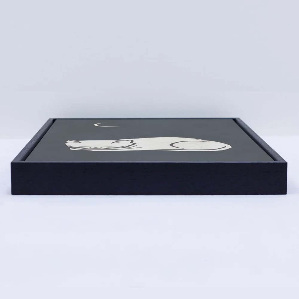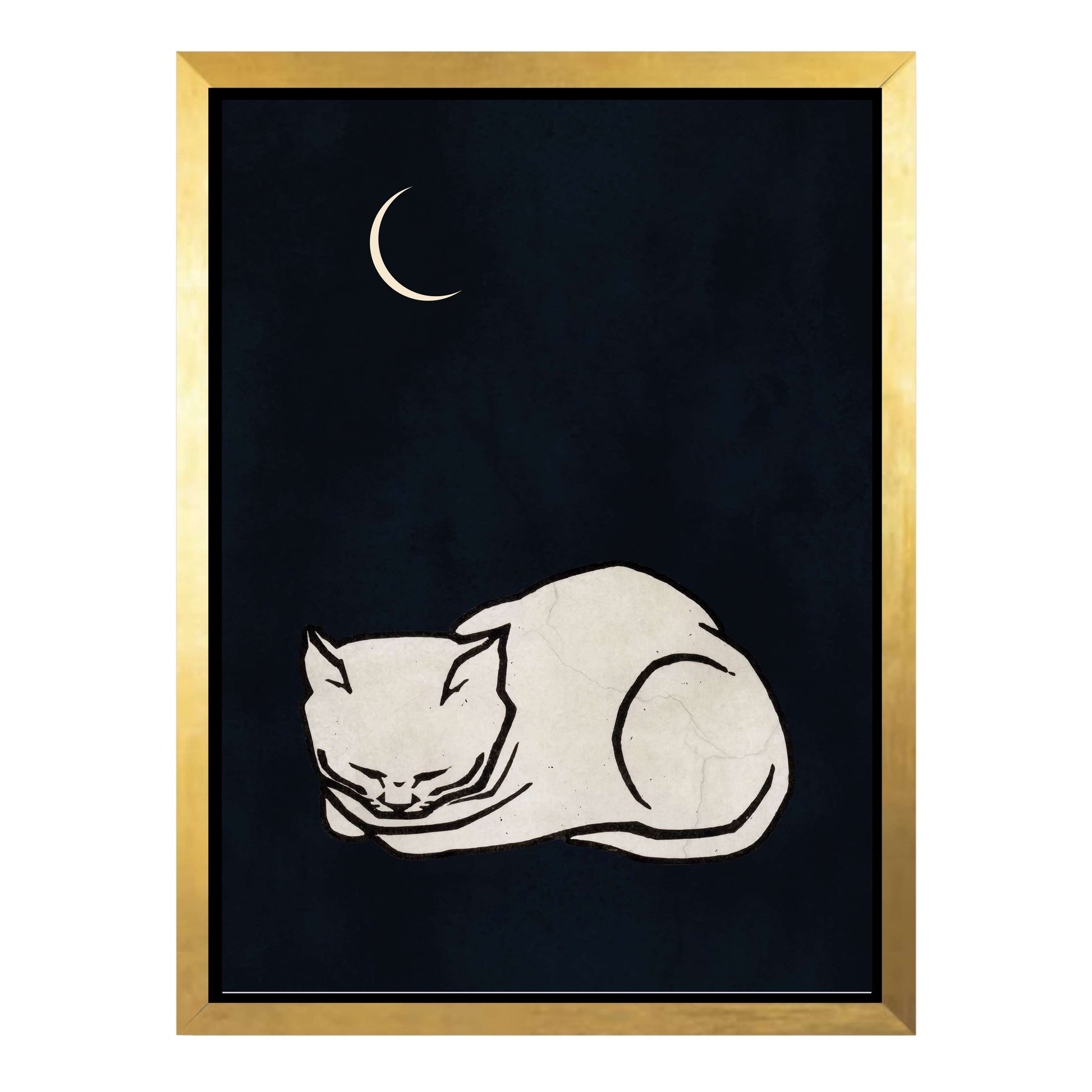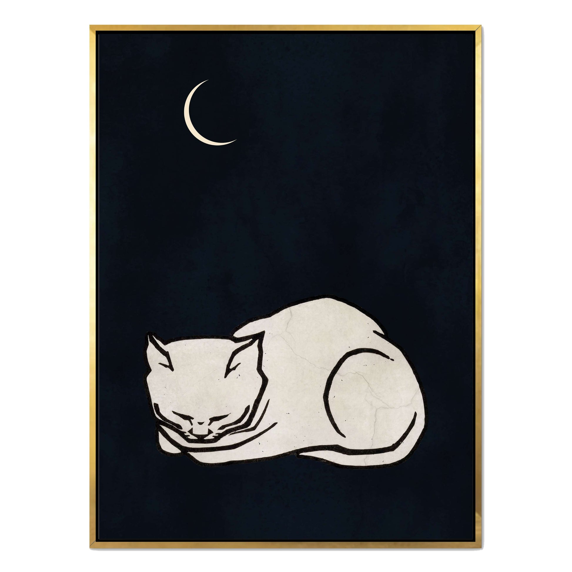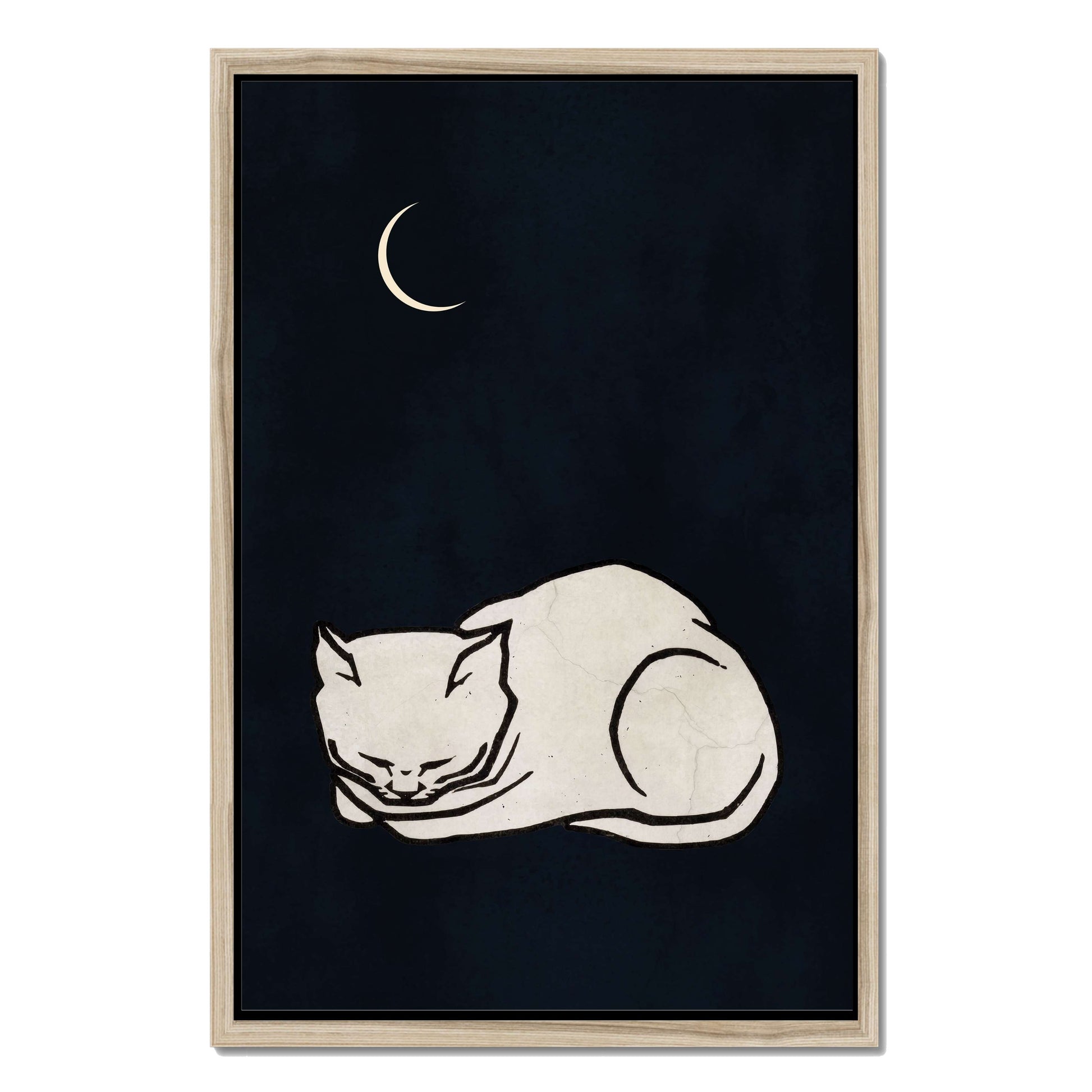 COZY DREAMS is a calming minimalist art print featuring a curled-up white cat sleeping peacefully beneath a glowing crescent moon on a deep, night-sky background. Perfect for creating a tranquil, comforting vibe in bedrooms, nurseries, or cozy spaces.