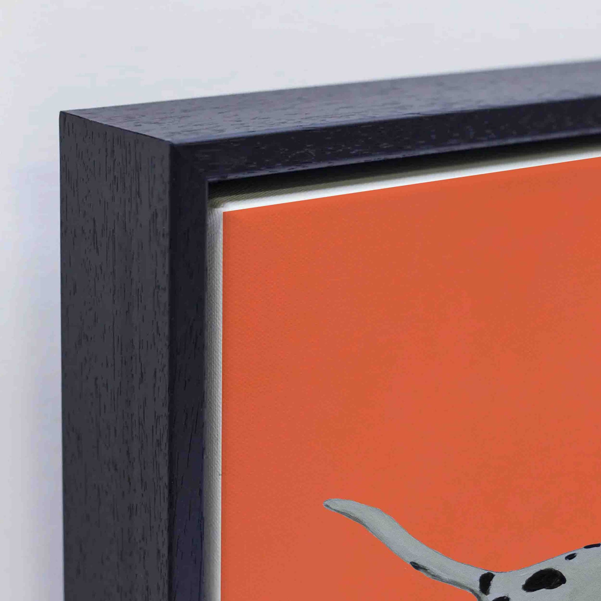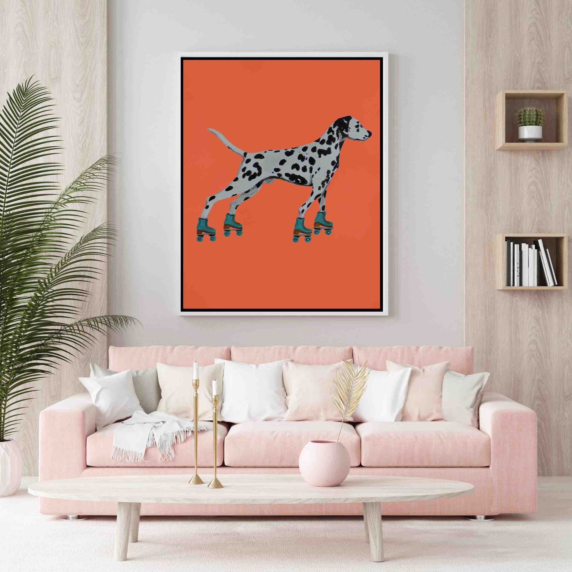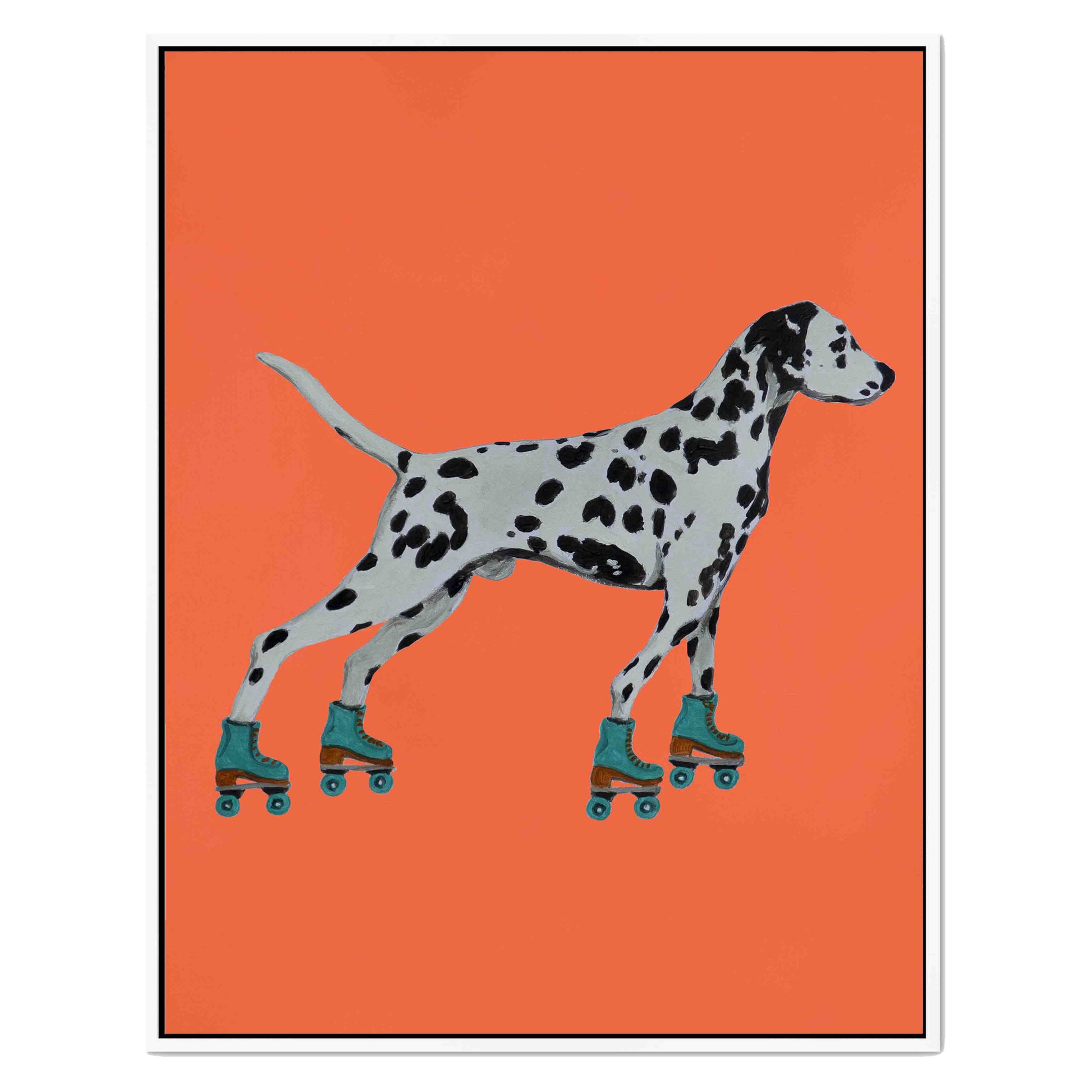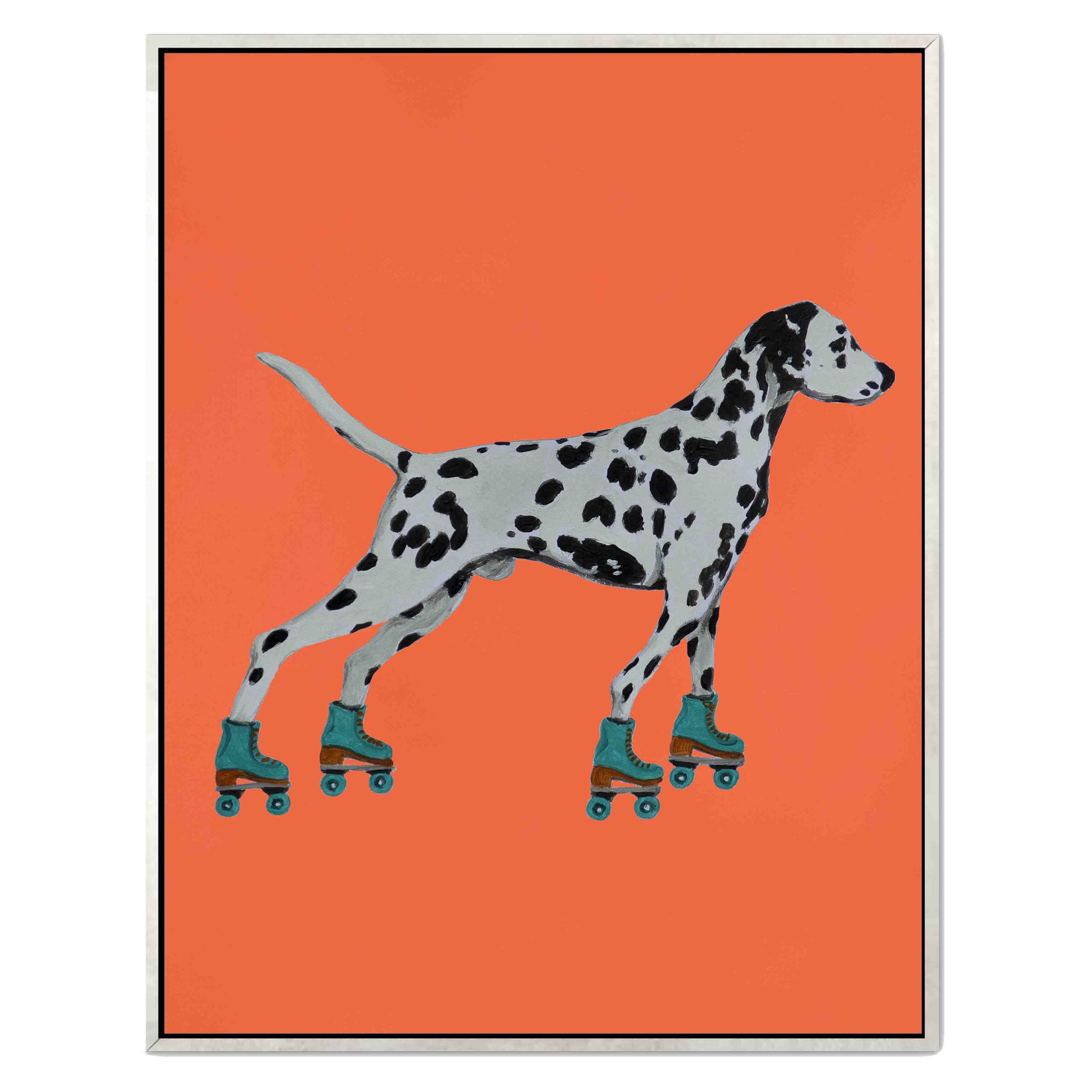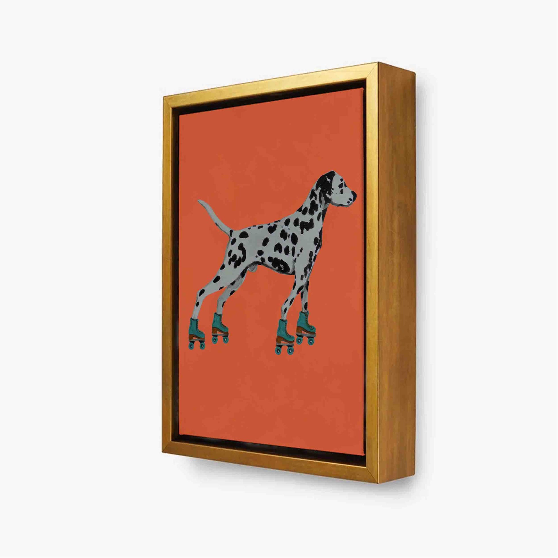 Whimsical canvas print of a Dalmatian on roller skates with a bold orange background. Playful, surreal wall art for dog lovers and quirky home decor.