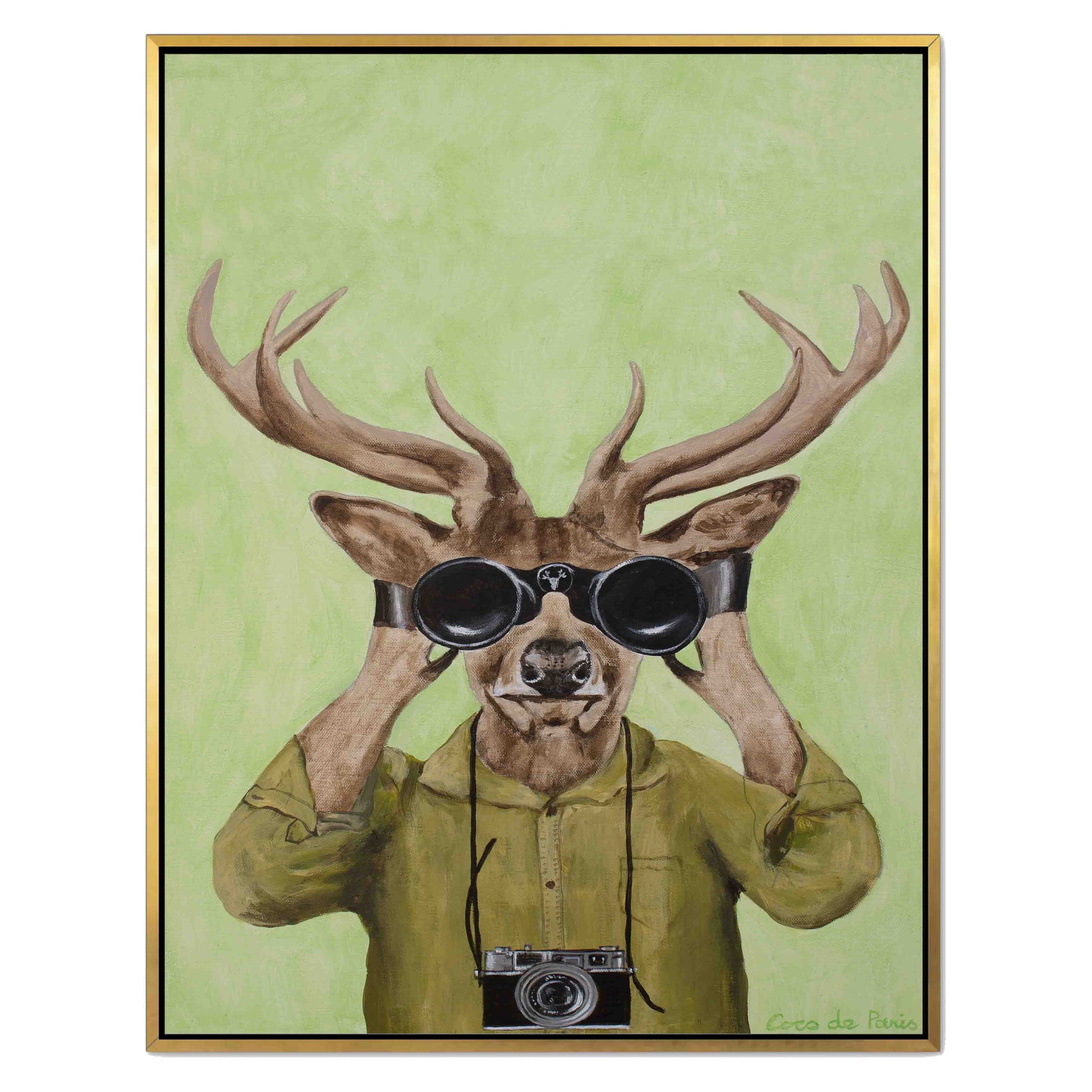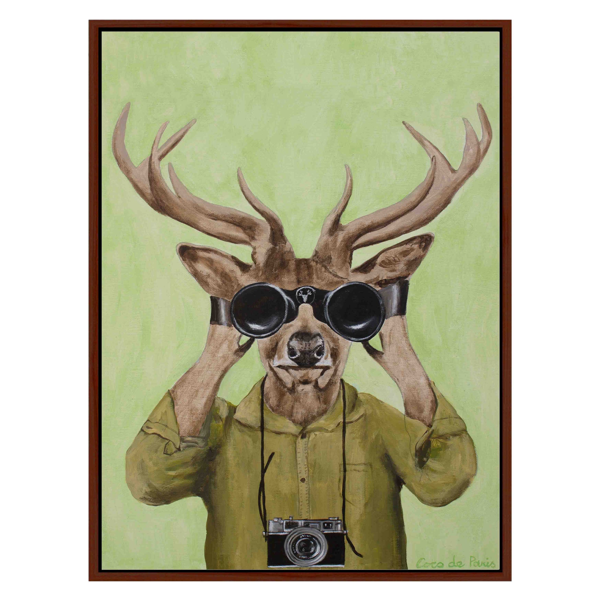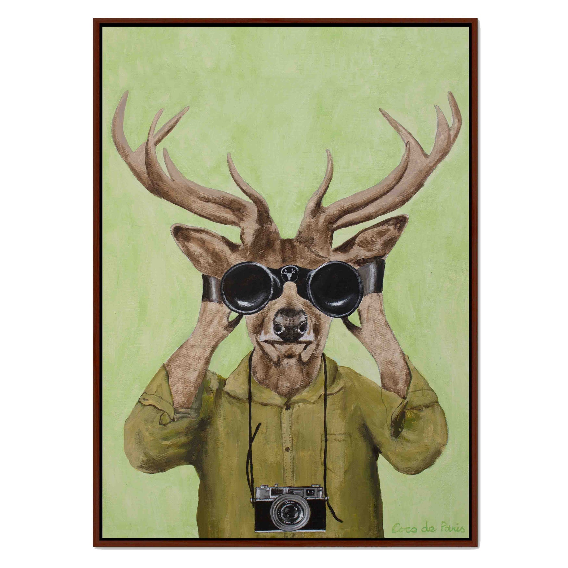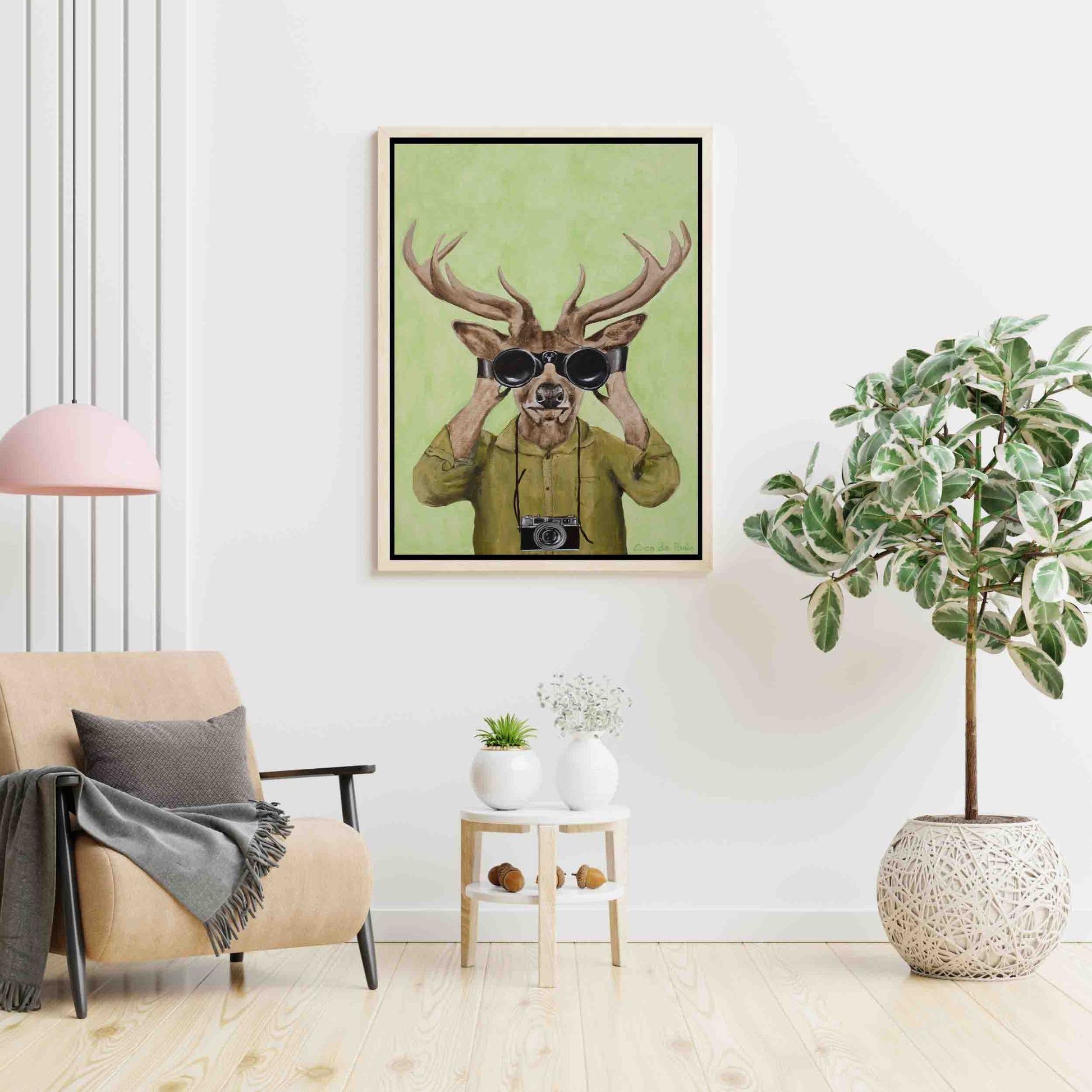 Whimsical canvas print of a deer with binoculars and a vintage camera on a bright green background. A quirky, humorous wall art piece for hunters and nature lovers.