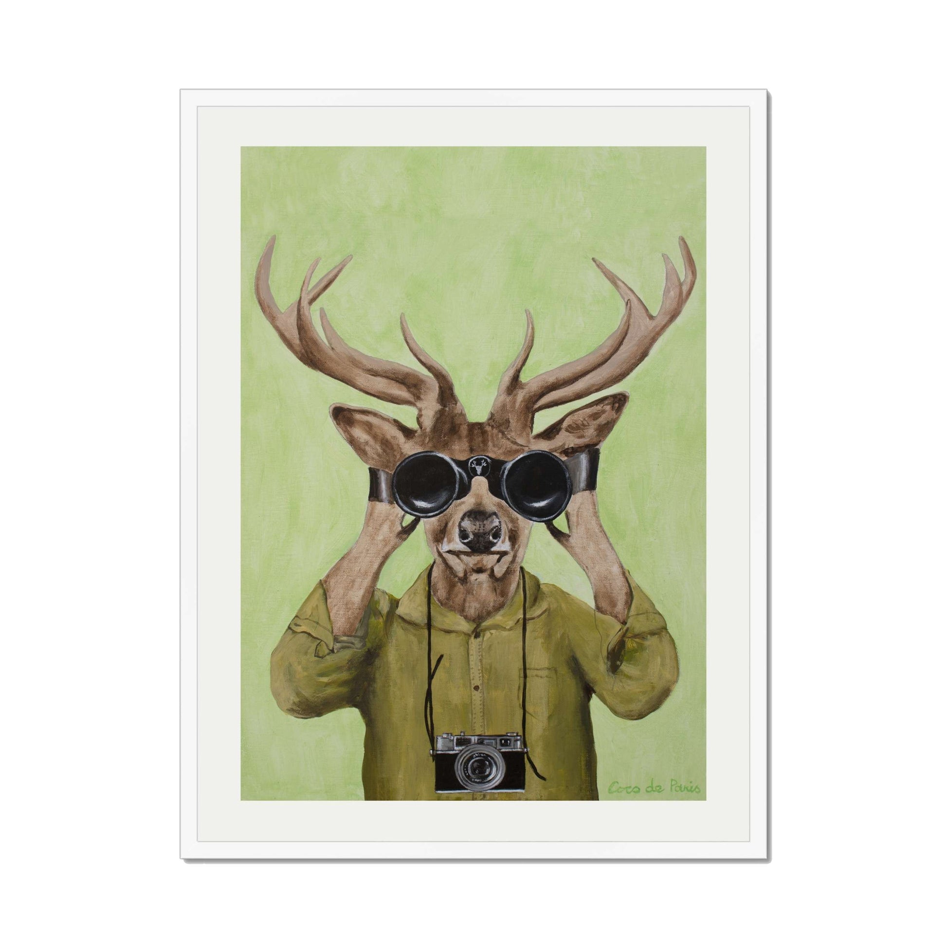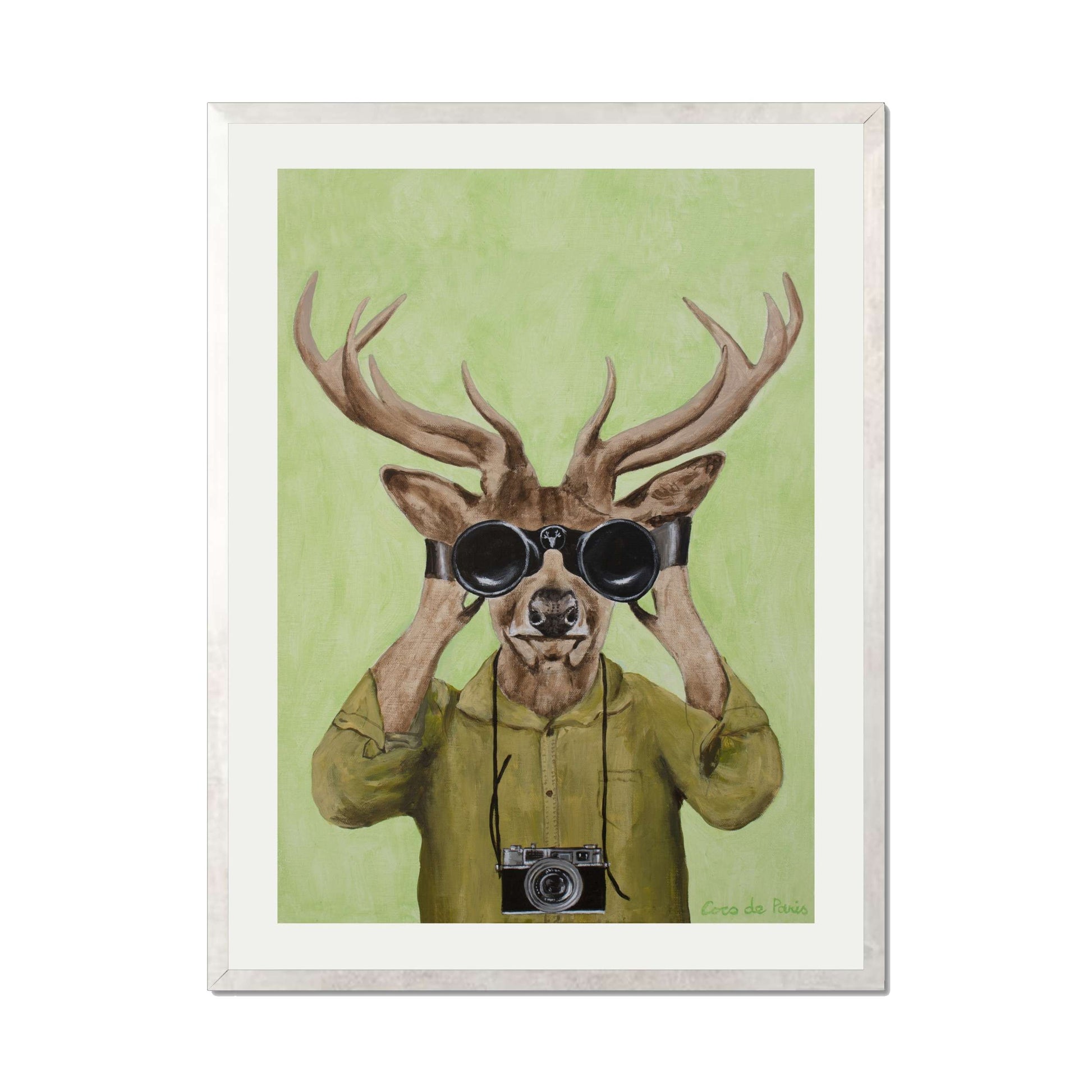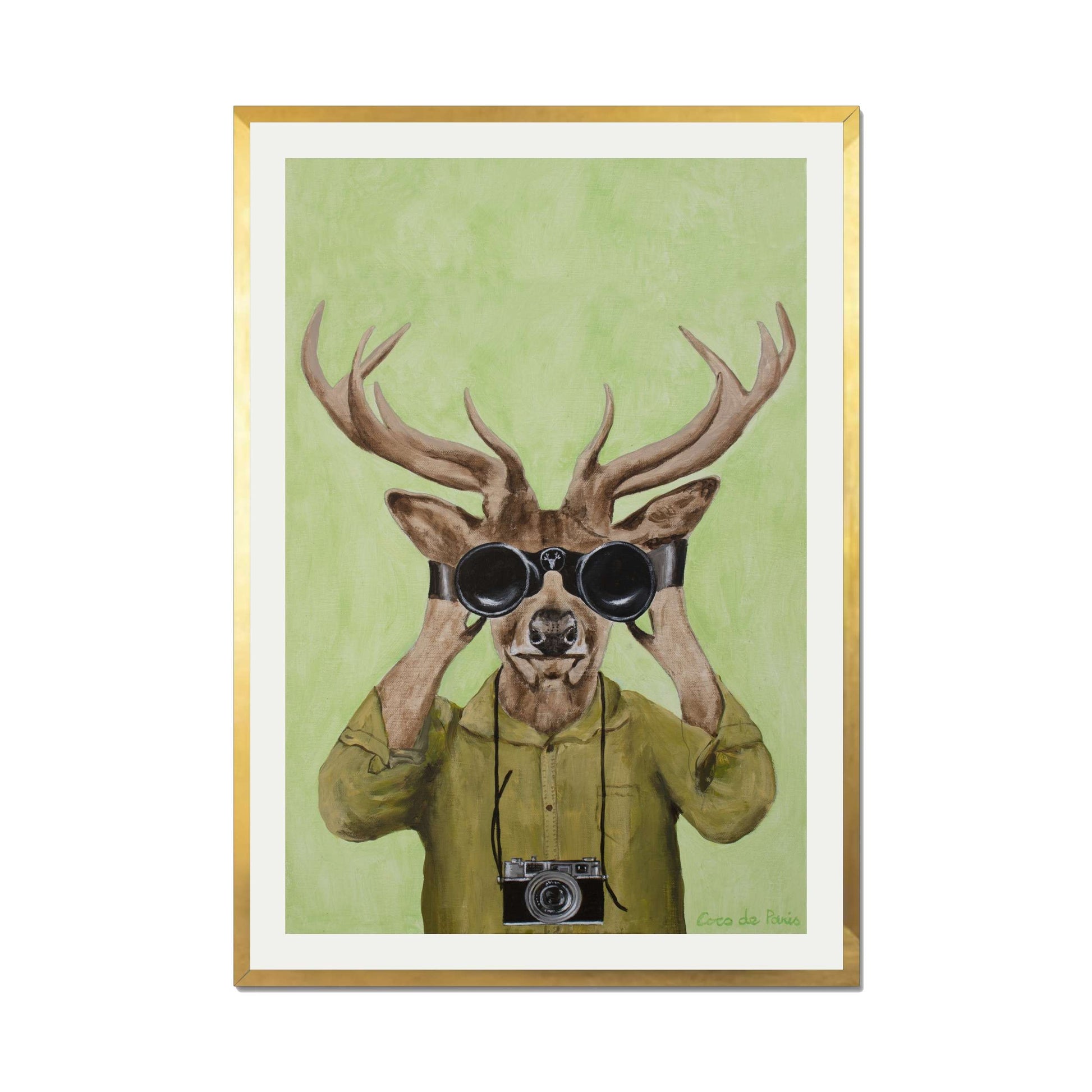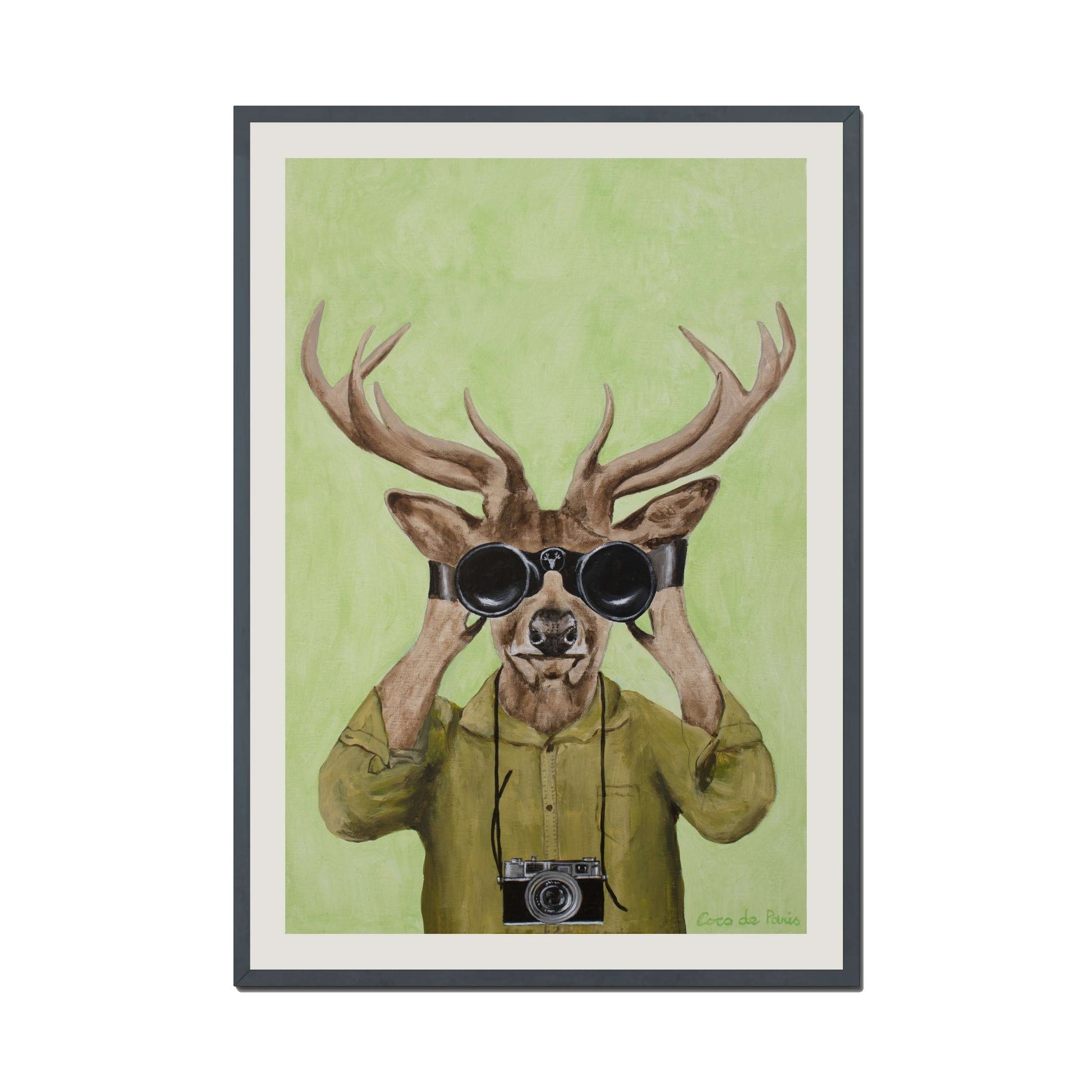 Add a clever twist of humor with DEER HUNTERS, a playful animal art print featuring a stylish deer dressed in a khaki shirt, peering through binoculars with a vintage camera slung around its neck. Set against a soft green background, this quirky and imaginative piece brings personality, nature-inspired wit, and artistic flair to any space.