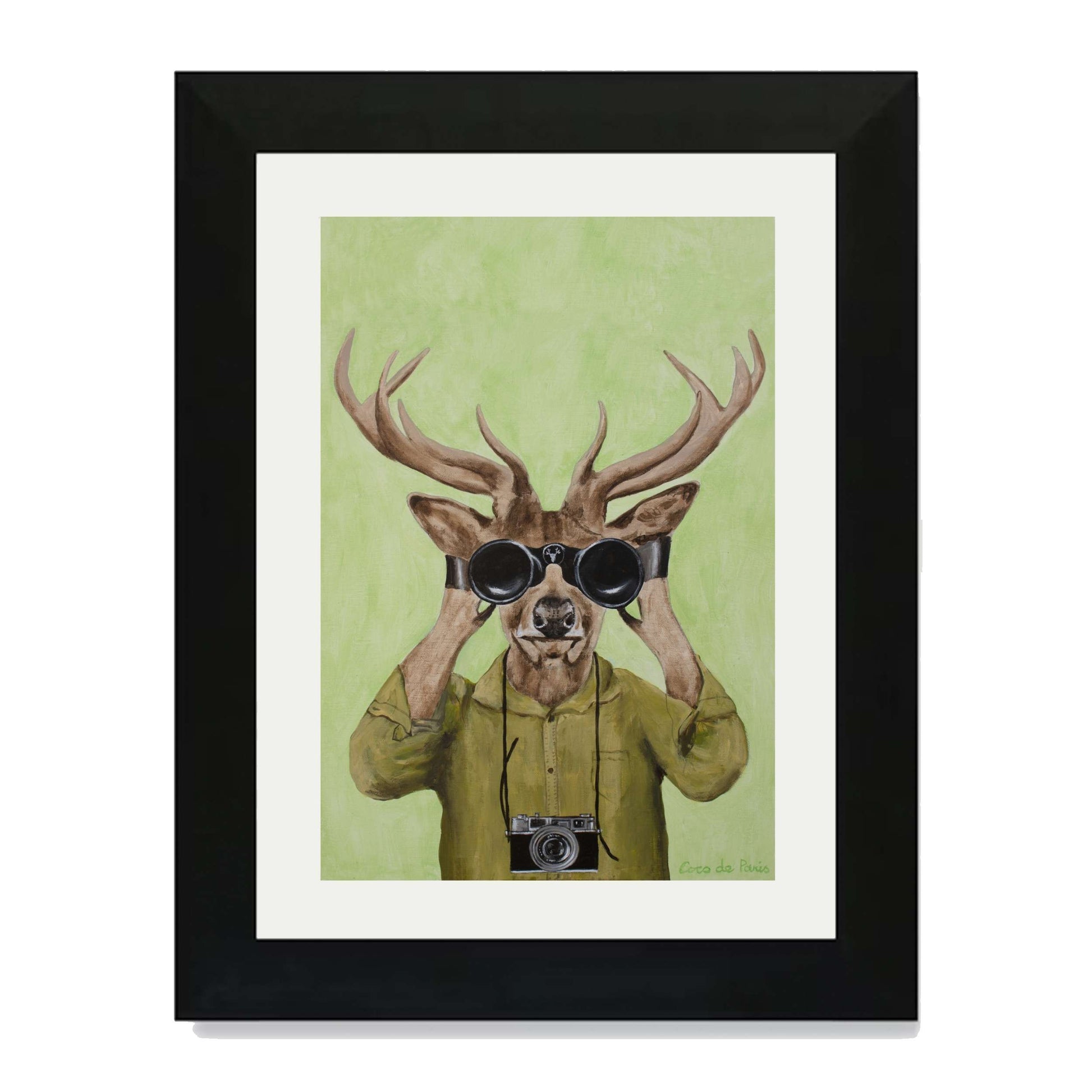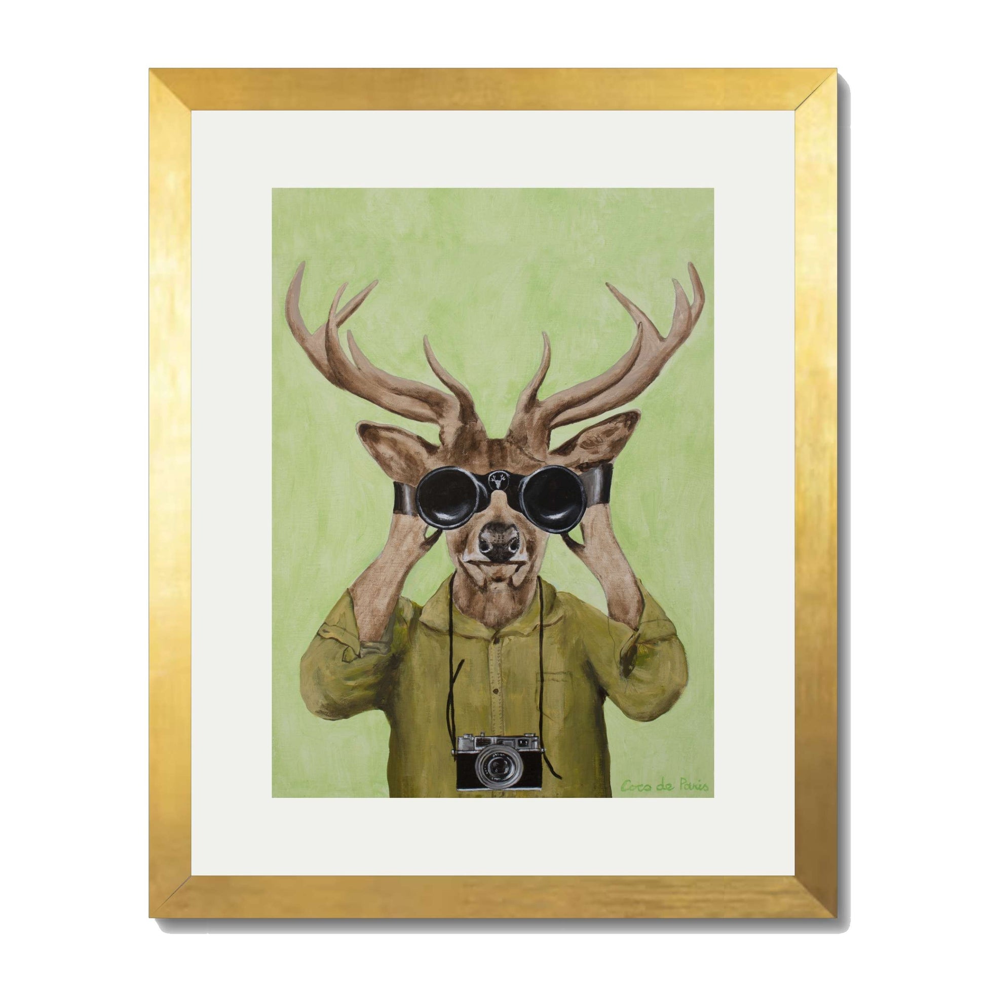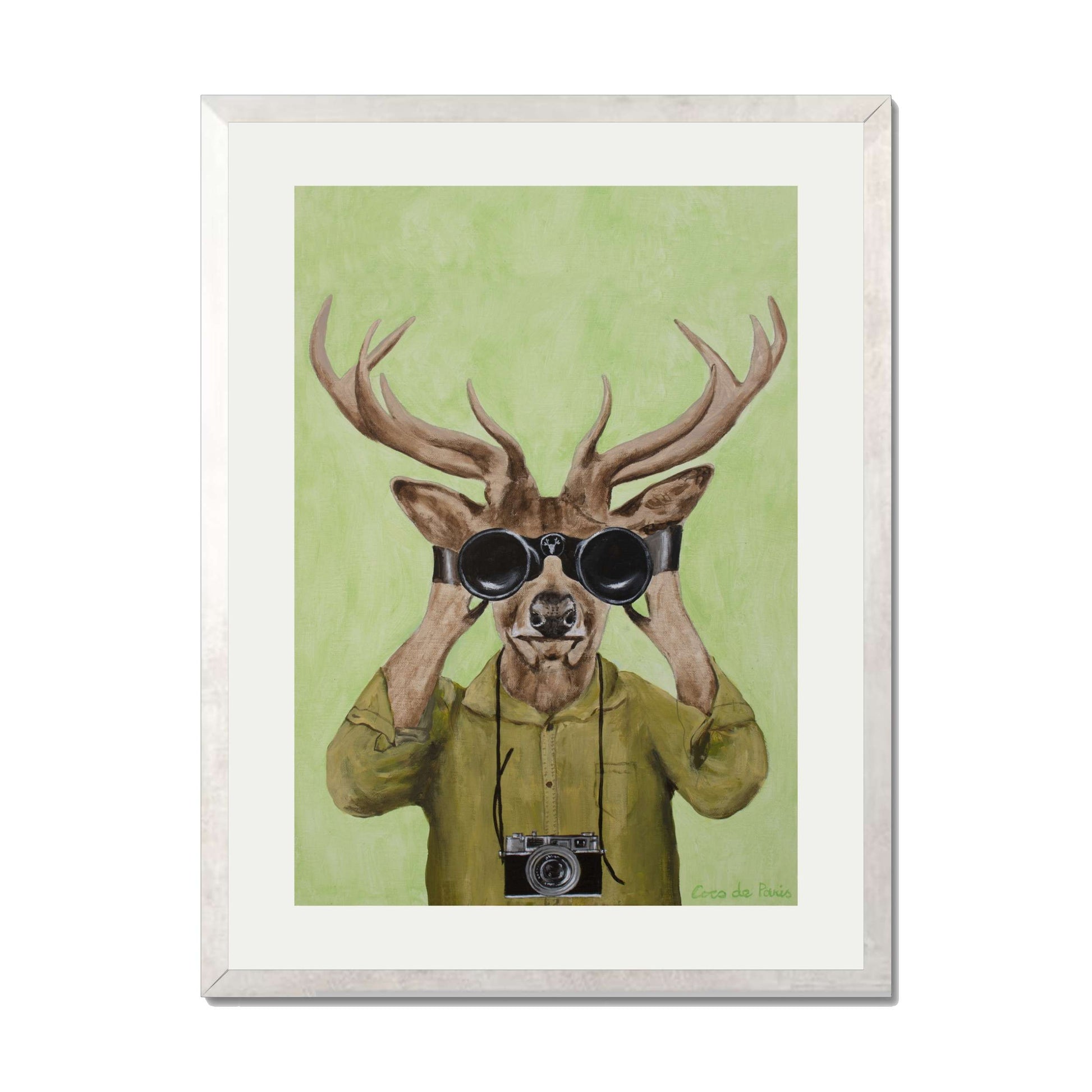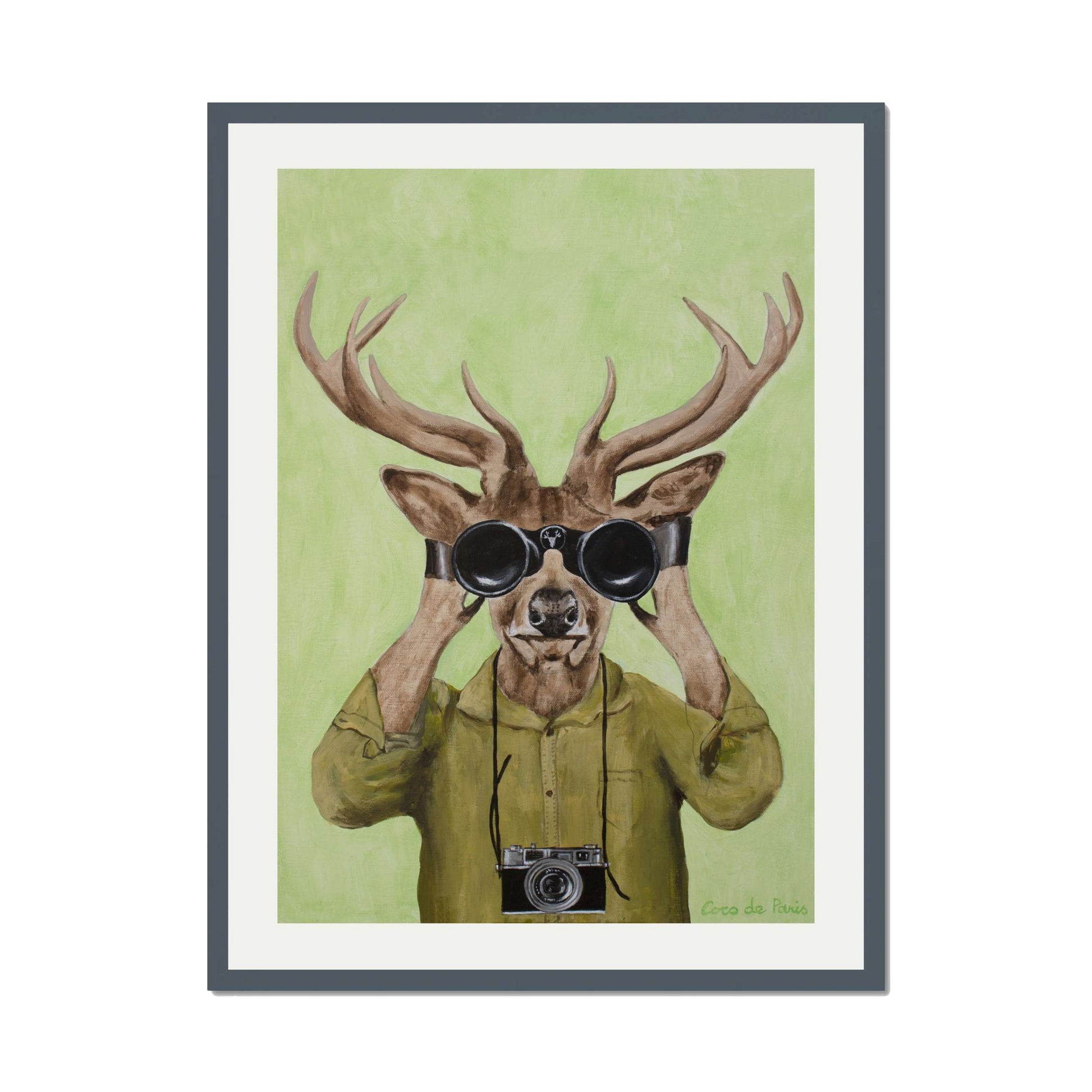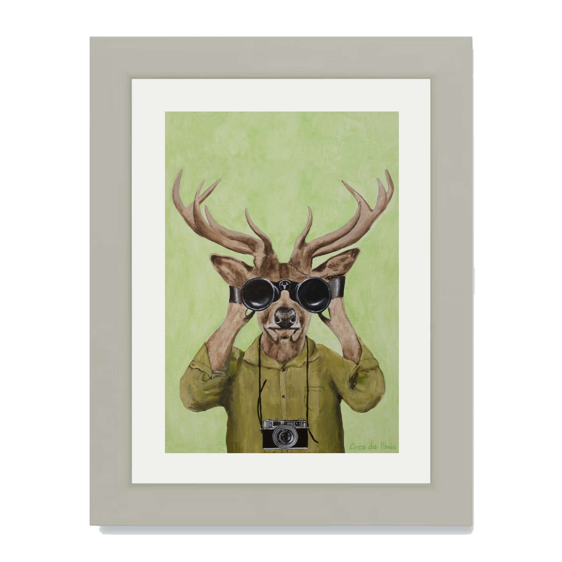 Add a clever twist of humor with DEER HUNTERS, a playful animal art print featuring a stylish deer dressed in a khaki shirt, peering through binoculars with a vintage camera slung around its neck. Set against a soft green background, this quirky and imaginative piece brings personality, nature-inspired wit, and artistic flair to any space.