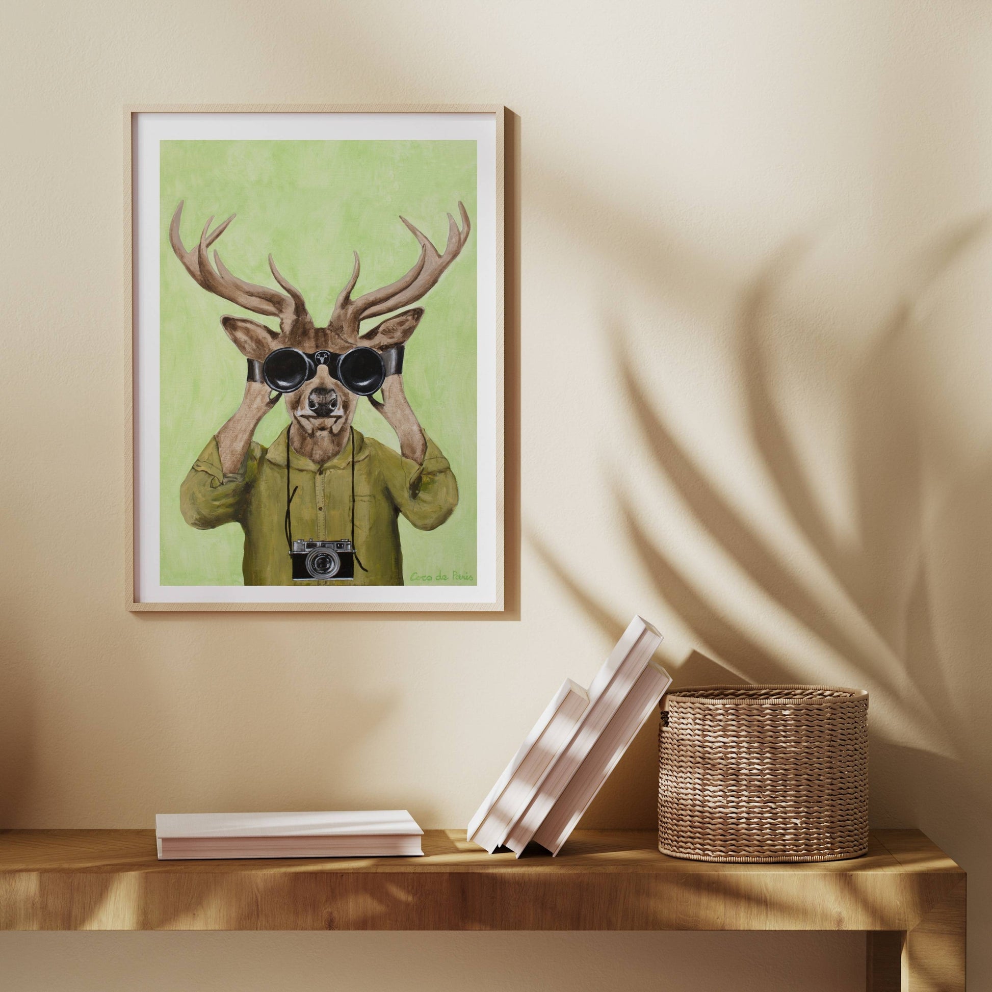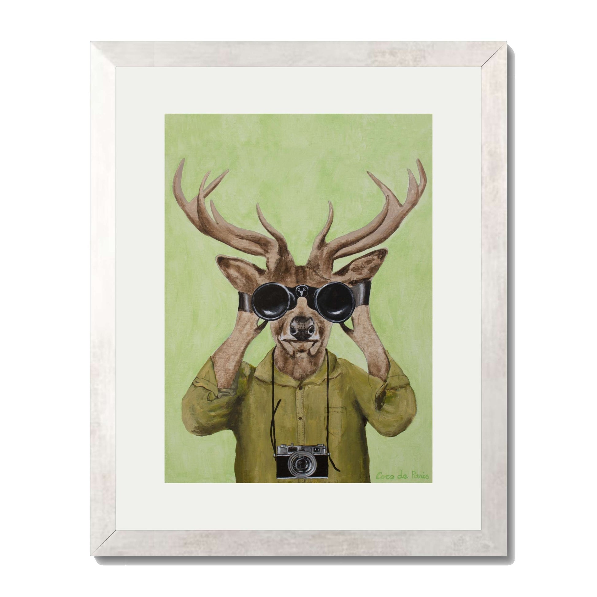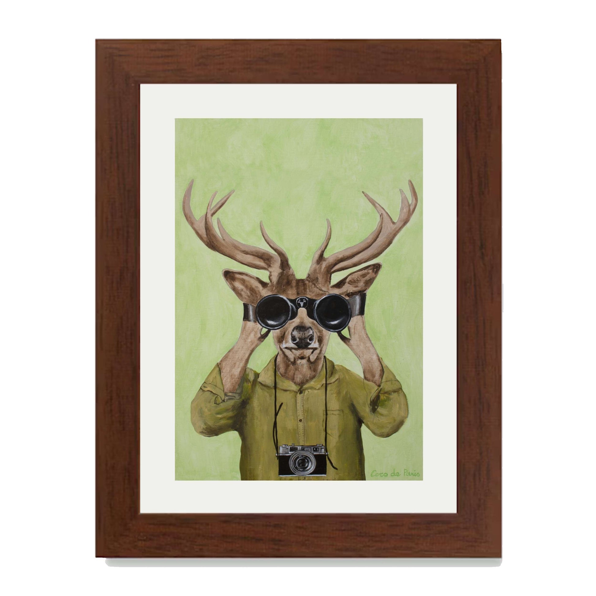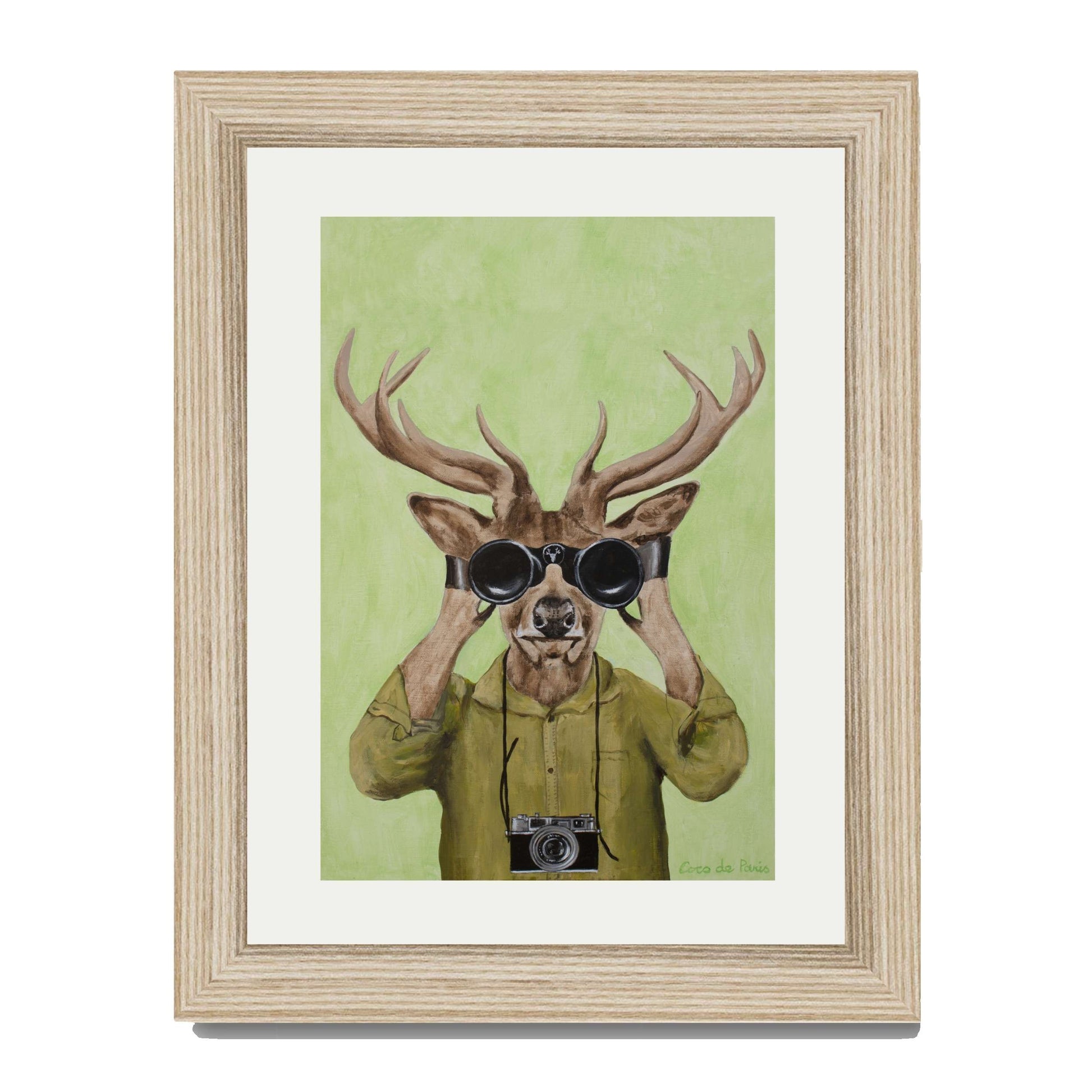 Add a clever twist of humor with DEER HUNTERS, a playful animal art print featuring a stylish deer dressed in a khaki shirt, peering through binoculars with a vintage camera slung around its neck. Set against a soft green background, this quirky and imaginative piece brings personality, nature-inspired wit, and artistic flair to any space.