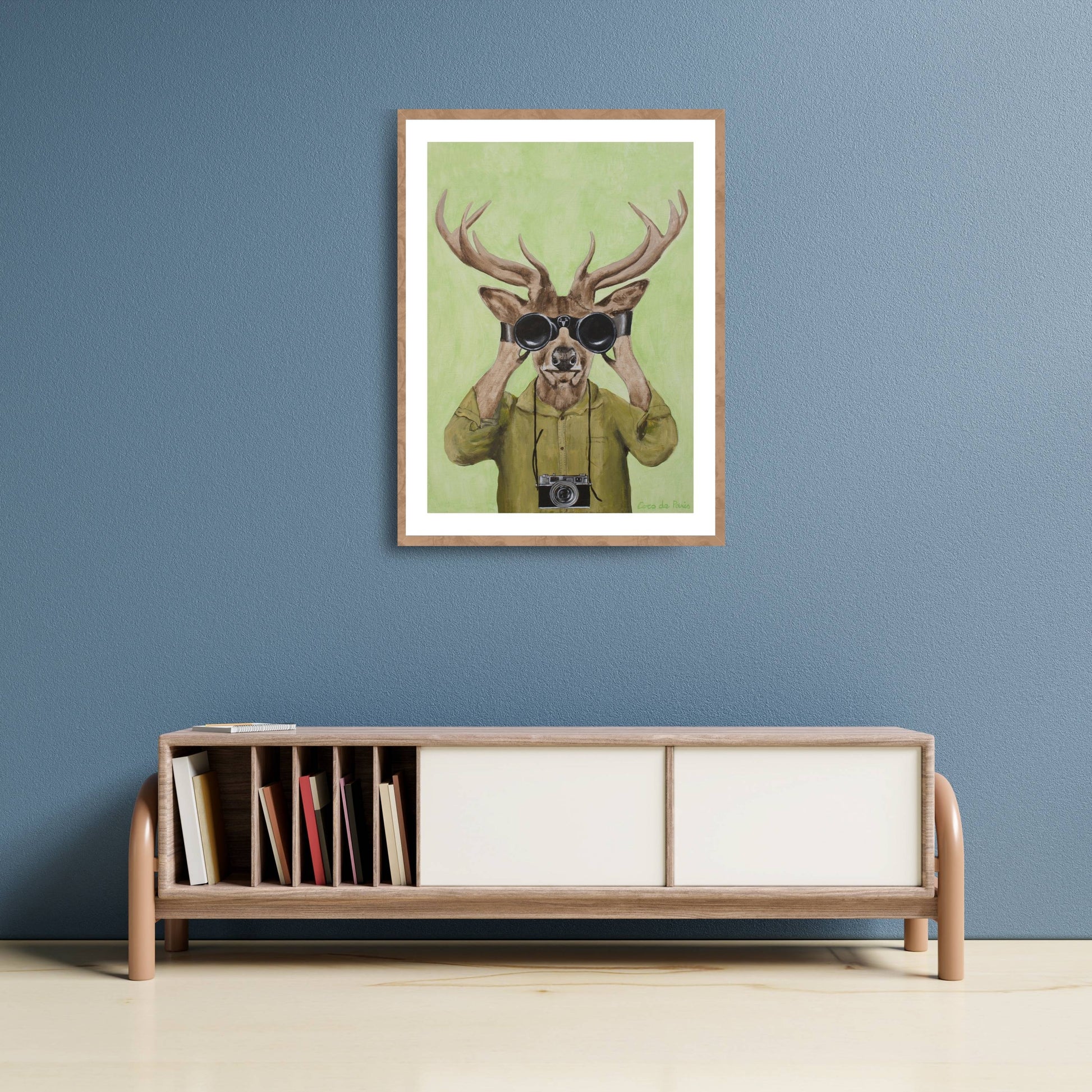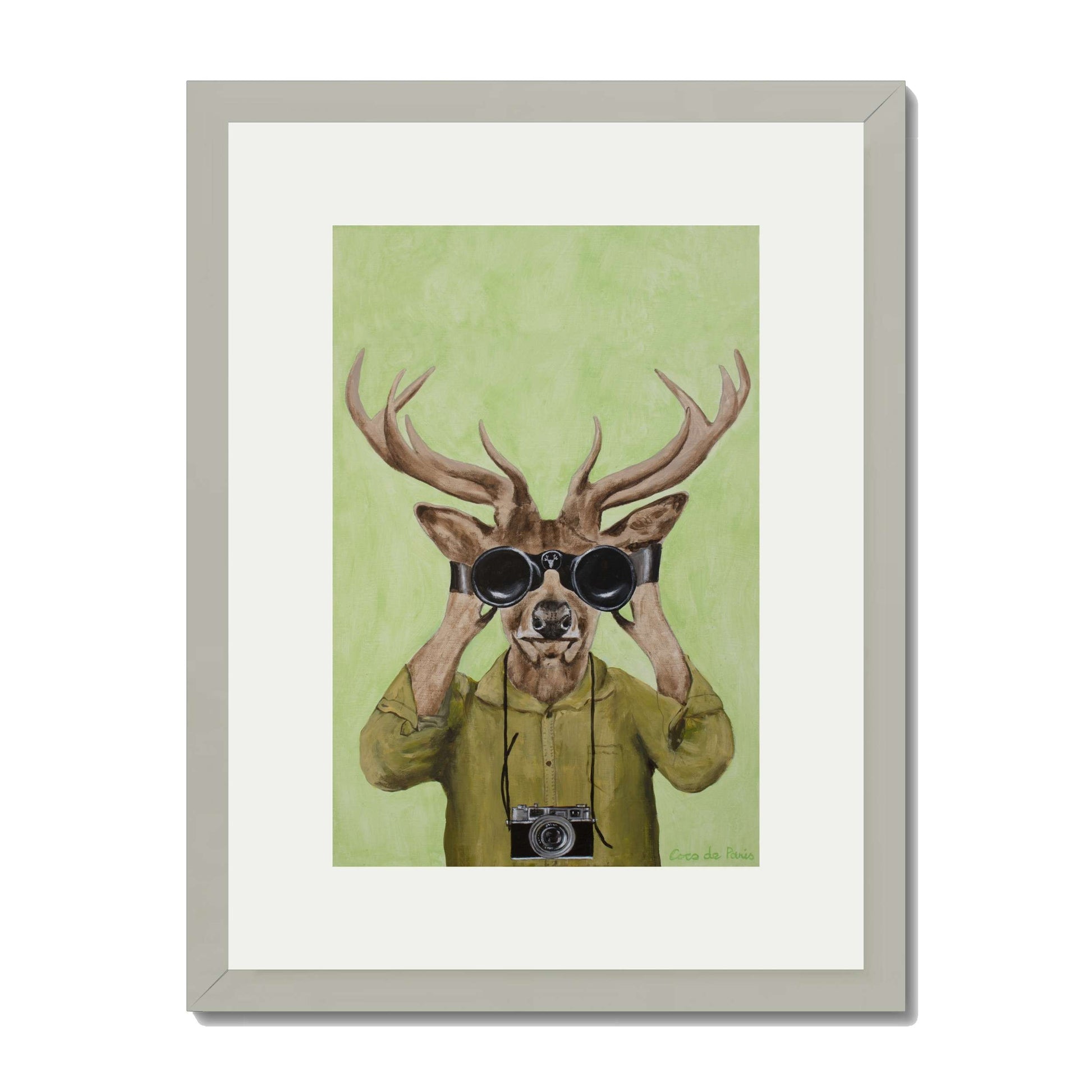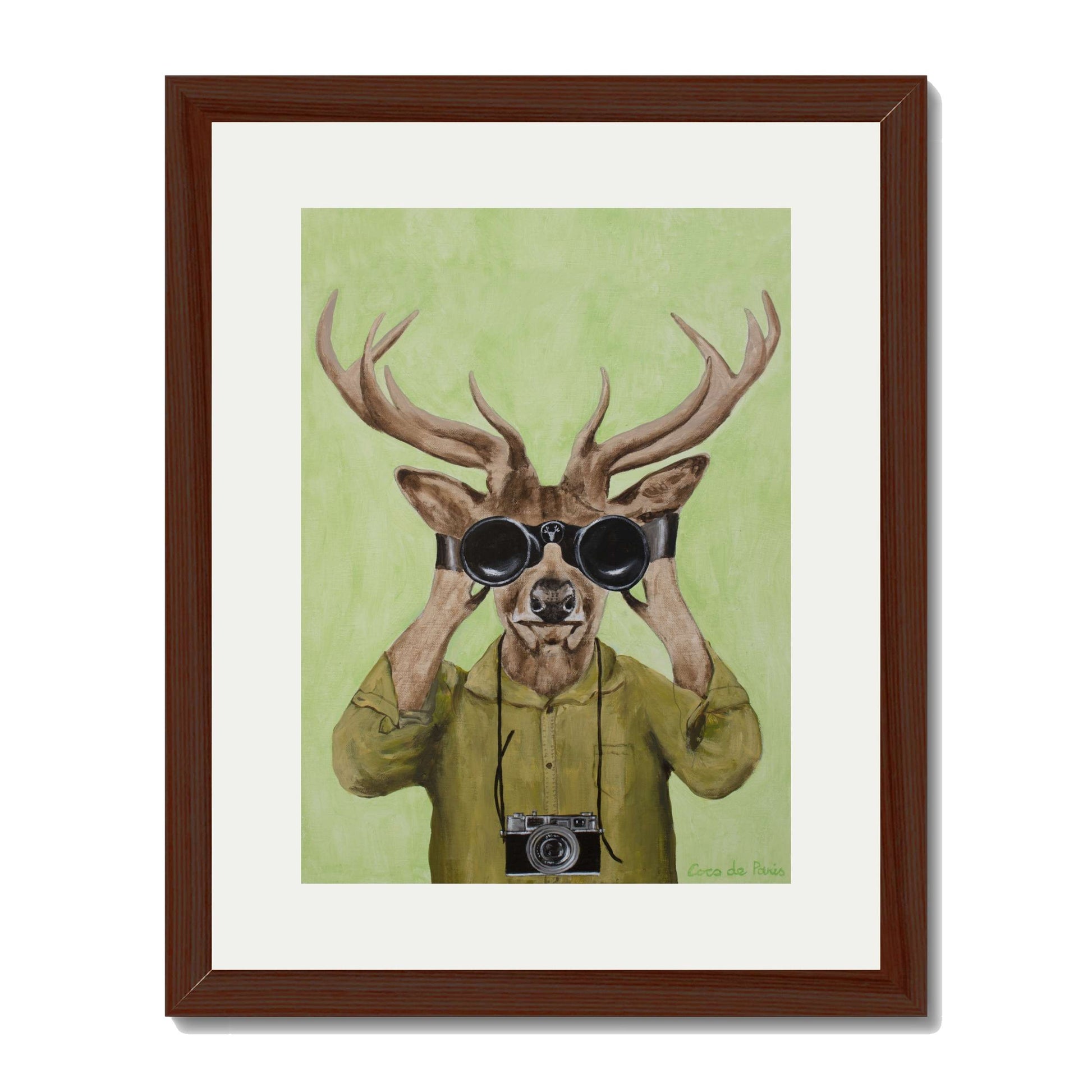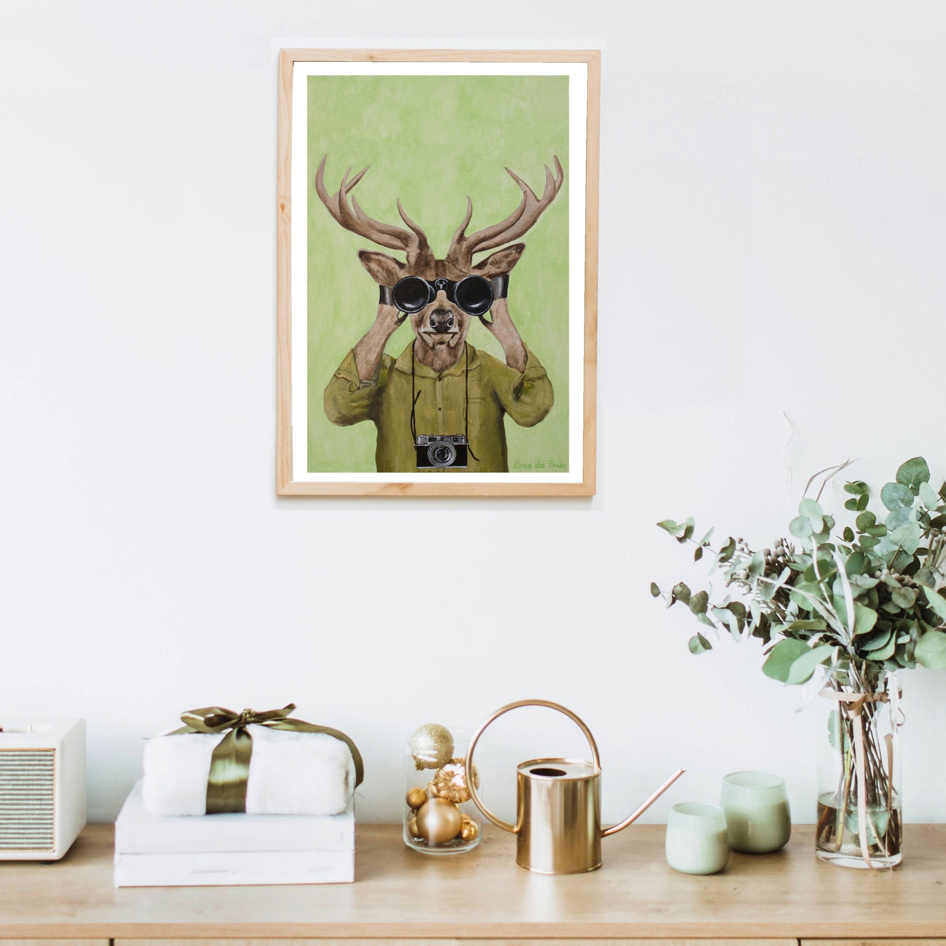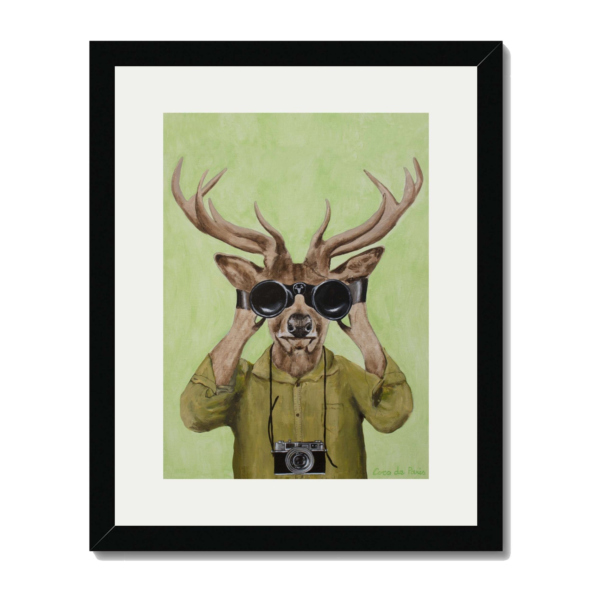 Add a clever twist of humor with DEER HUNTERS, a playful animal art print featuring a stylish deer dressed in a khaki shirt, peering through binoculars with a vintage camera slung around its neck. Set against a soft green background, this quirky and imaginative piece brings personality, nature-inspired wit, and artistic flair to any space.