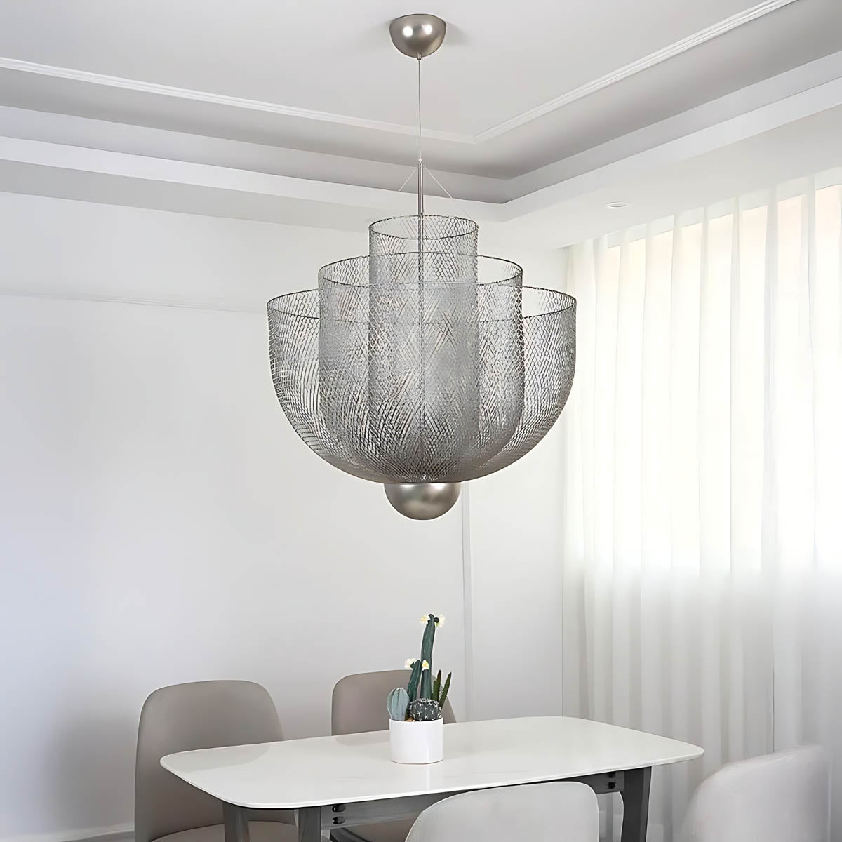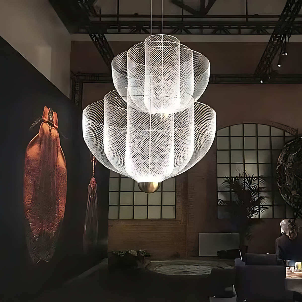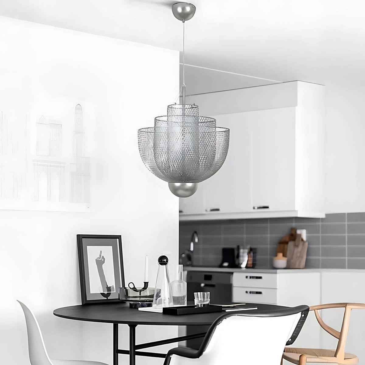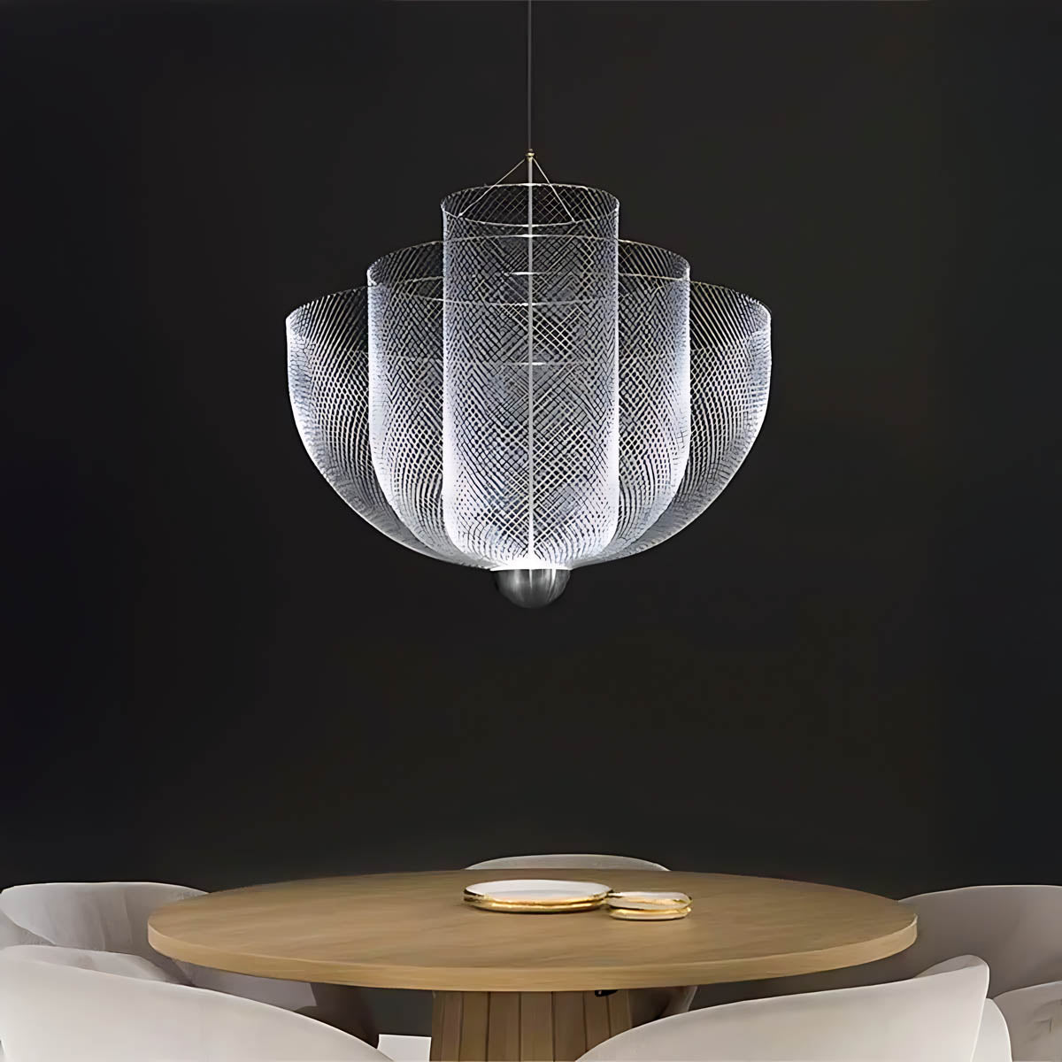 Its layered, scalloped mesh shade floats like a modern lantern, creating an airy silhouette that keeps sightlines open while casting a warm, textural glow with beautiful light-and-shadow play.