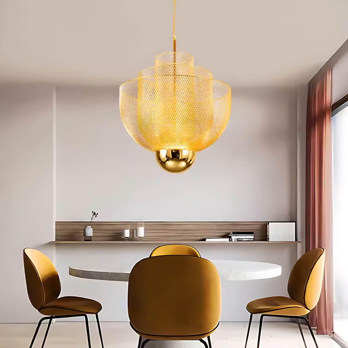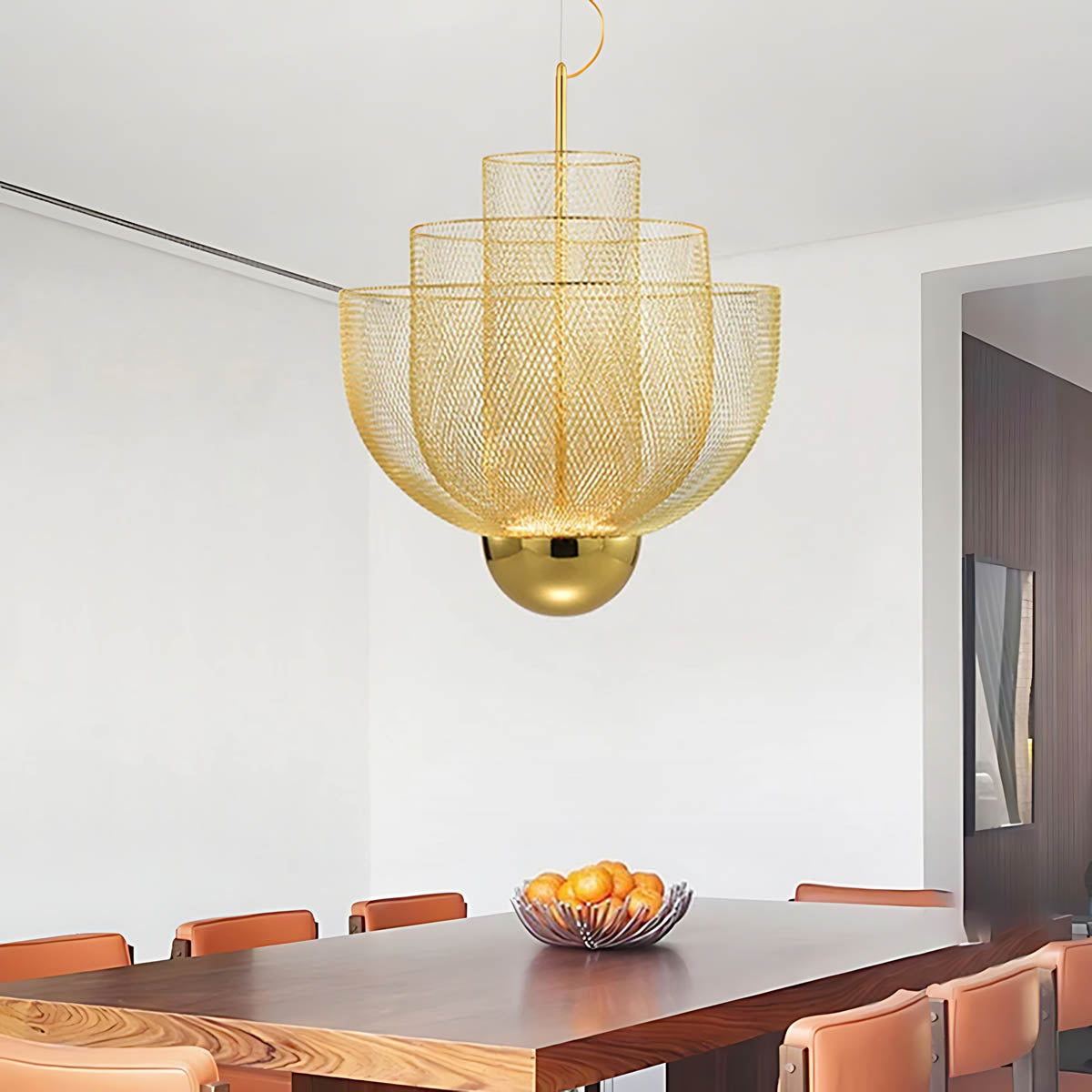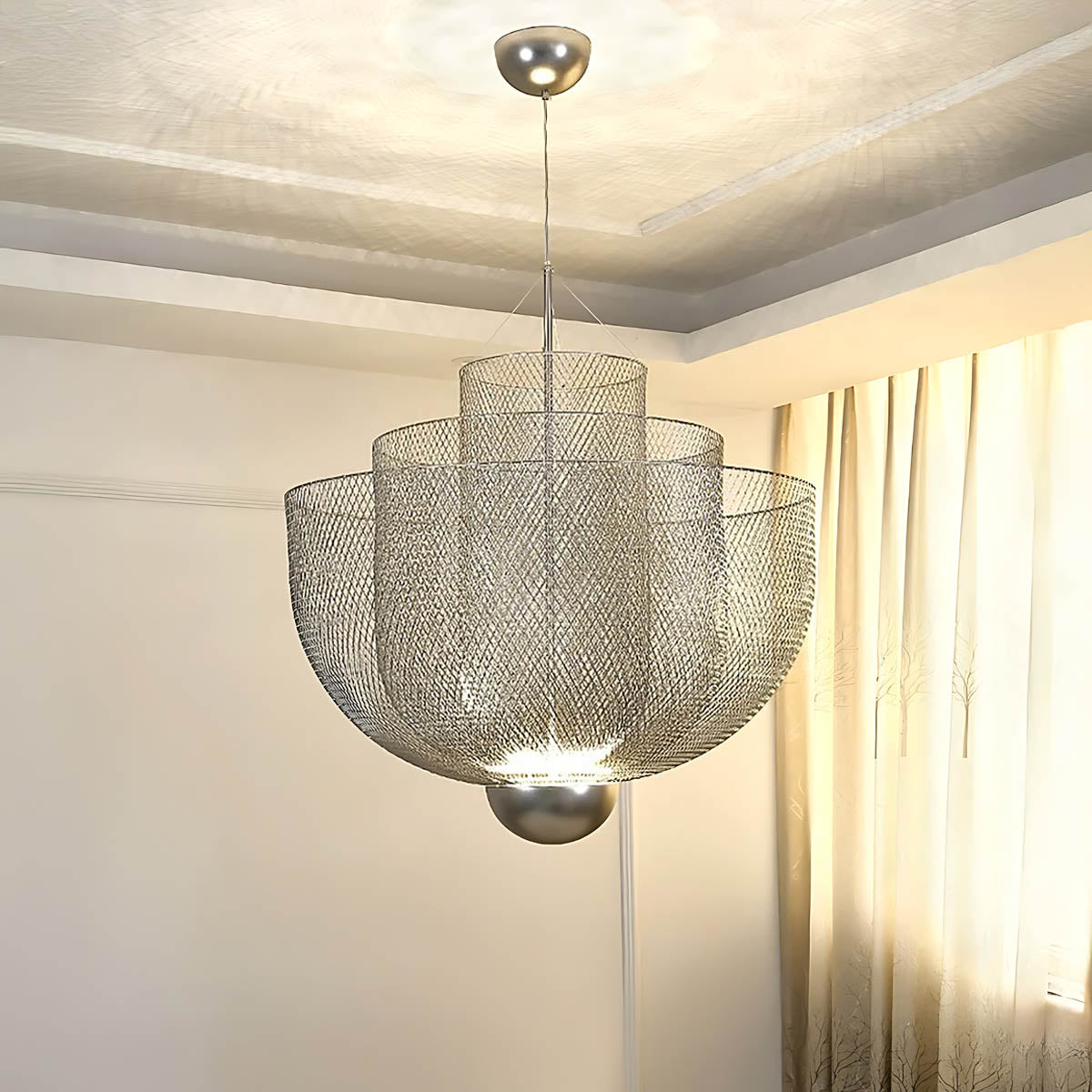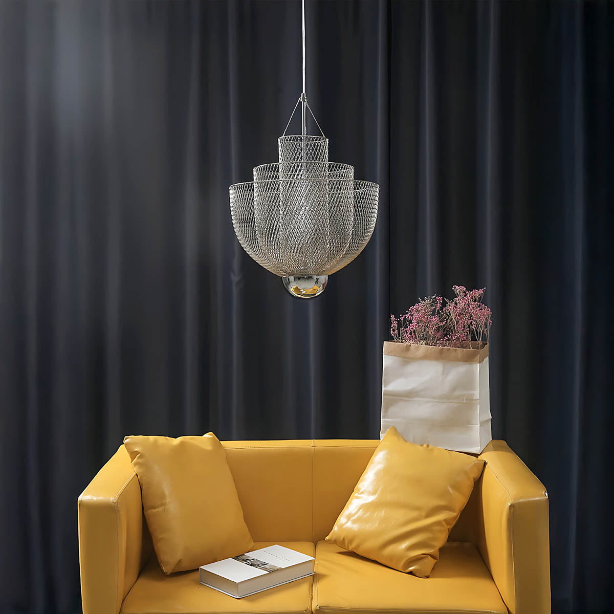 Its layered, scalloped mesh shade floats like a modern lantern, creating an airy silhouette that keeps sightlines open while casting a warm, textural glow with beautiful light-and-shadow play.