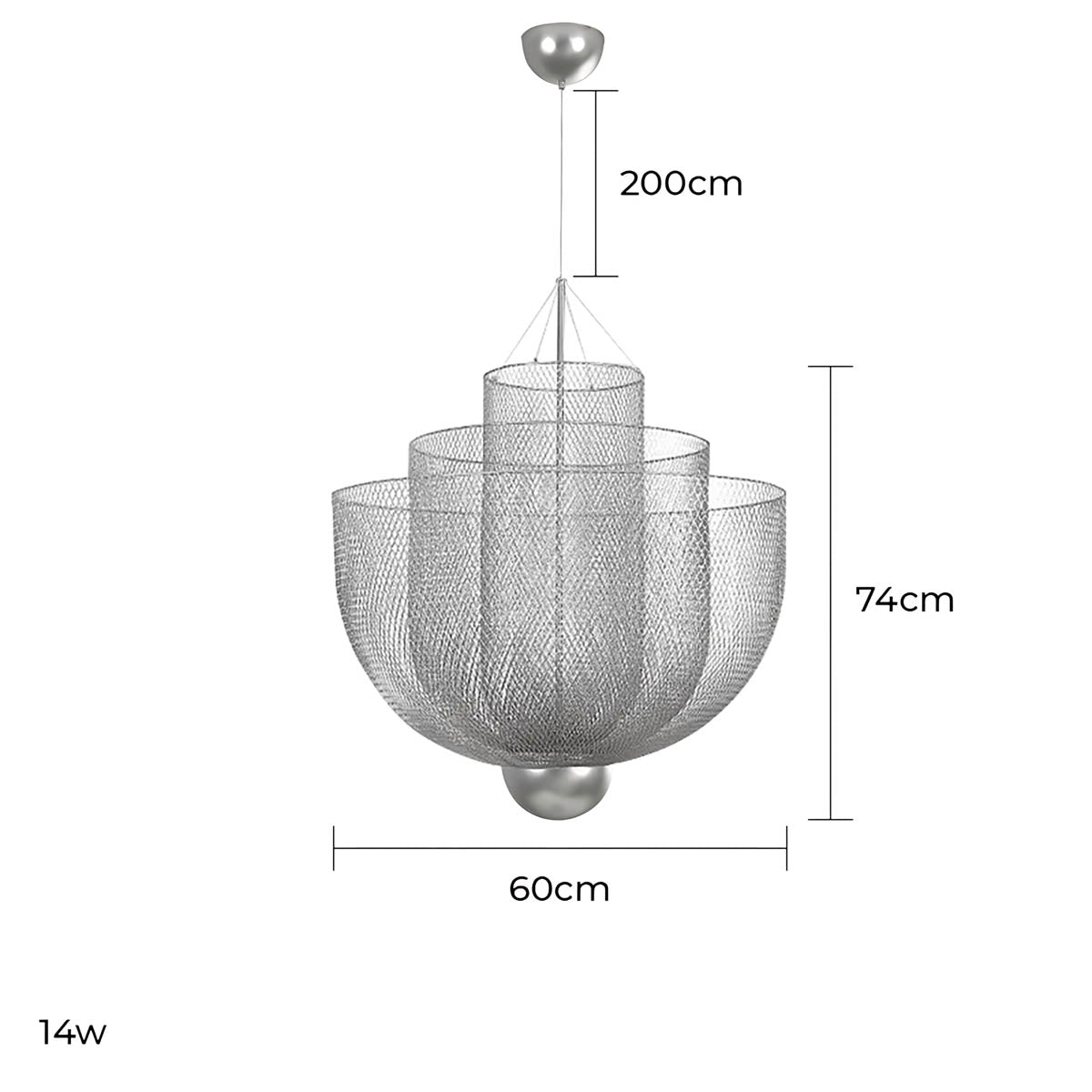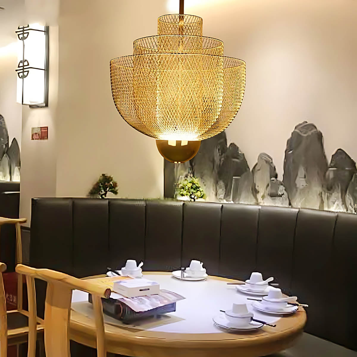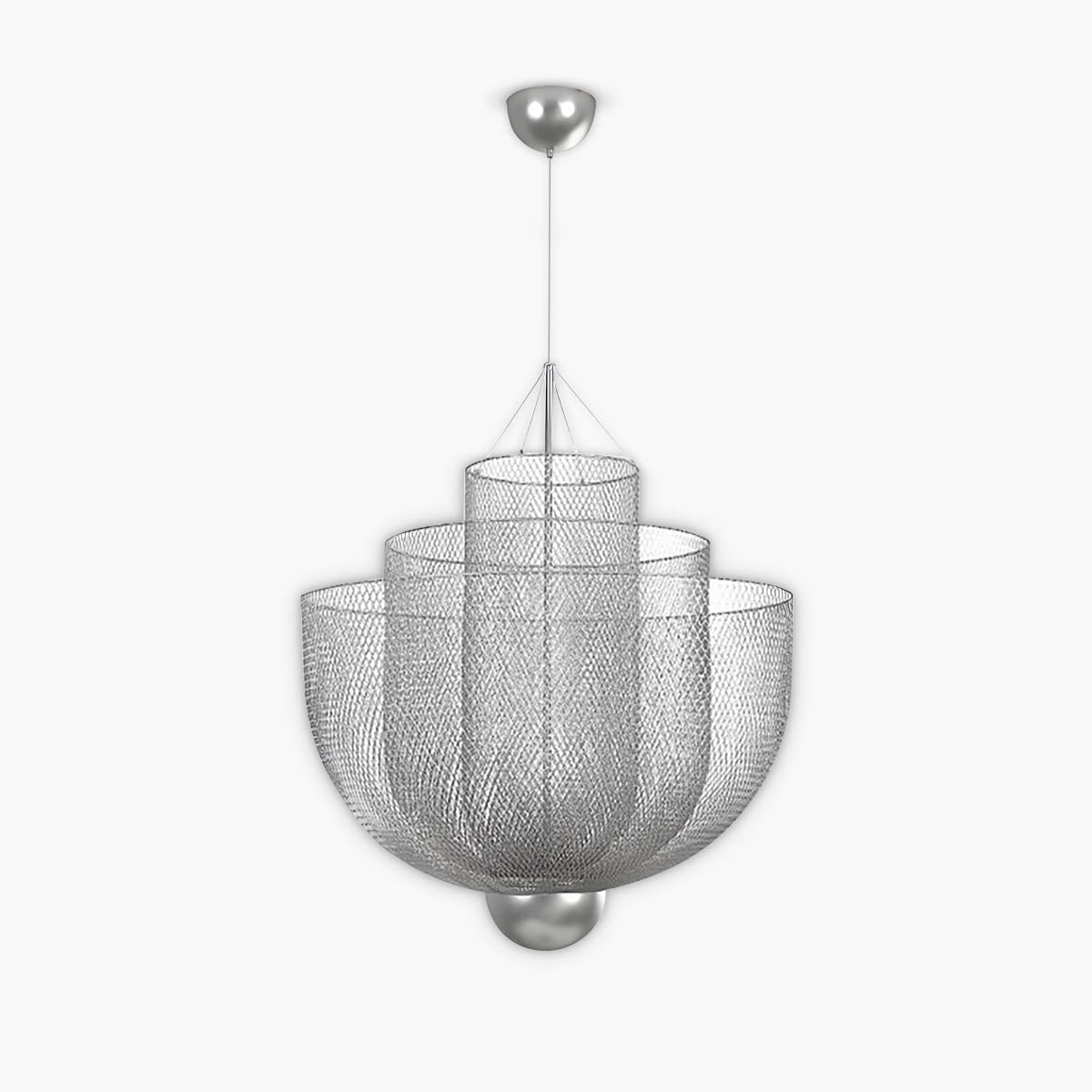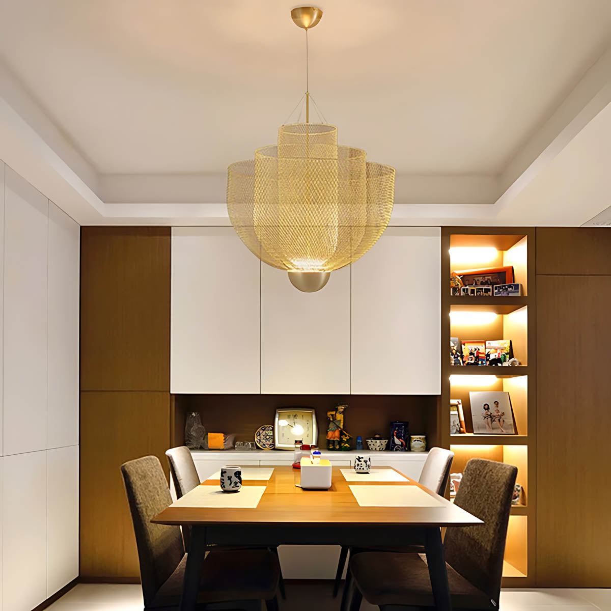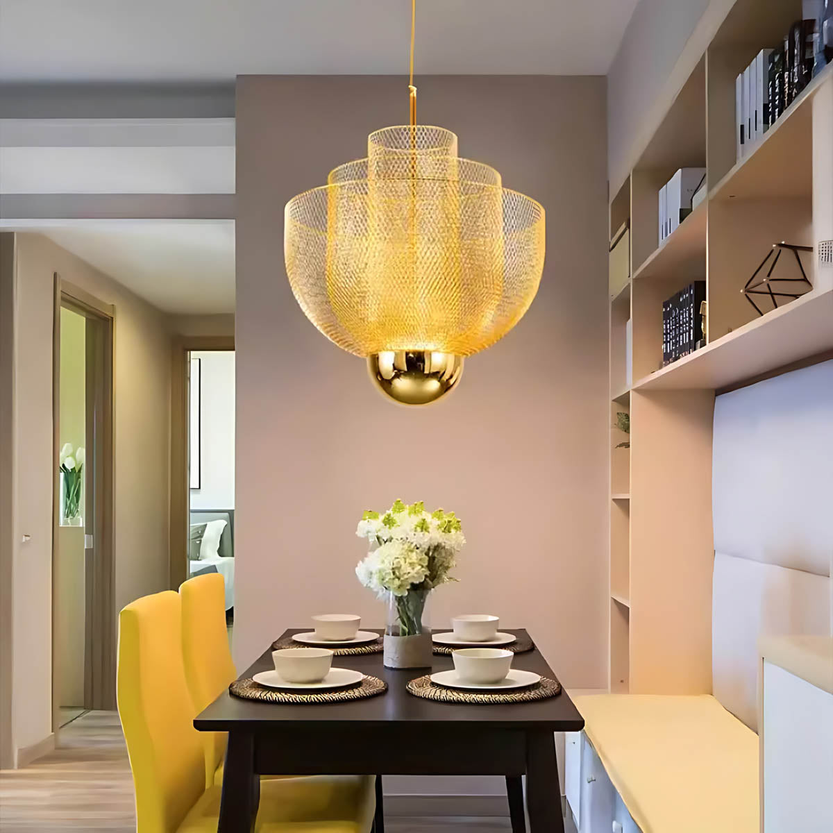 Its layered, scalloped mesh shade floats like a modern lantern, creating an airy silhouette that keeps sightlines open while casting a warm, textural glow with beautiful light-and-shadow play.