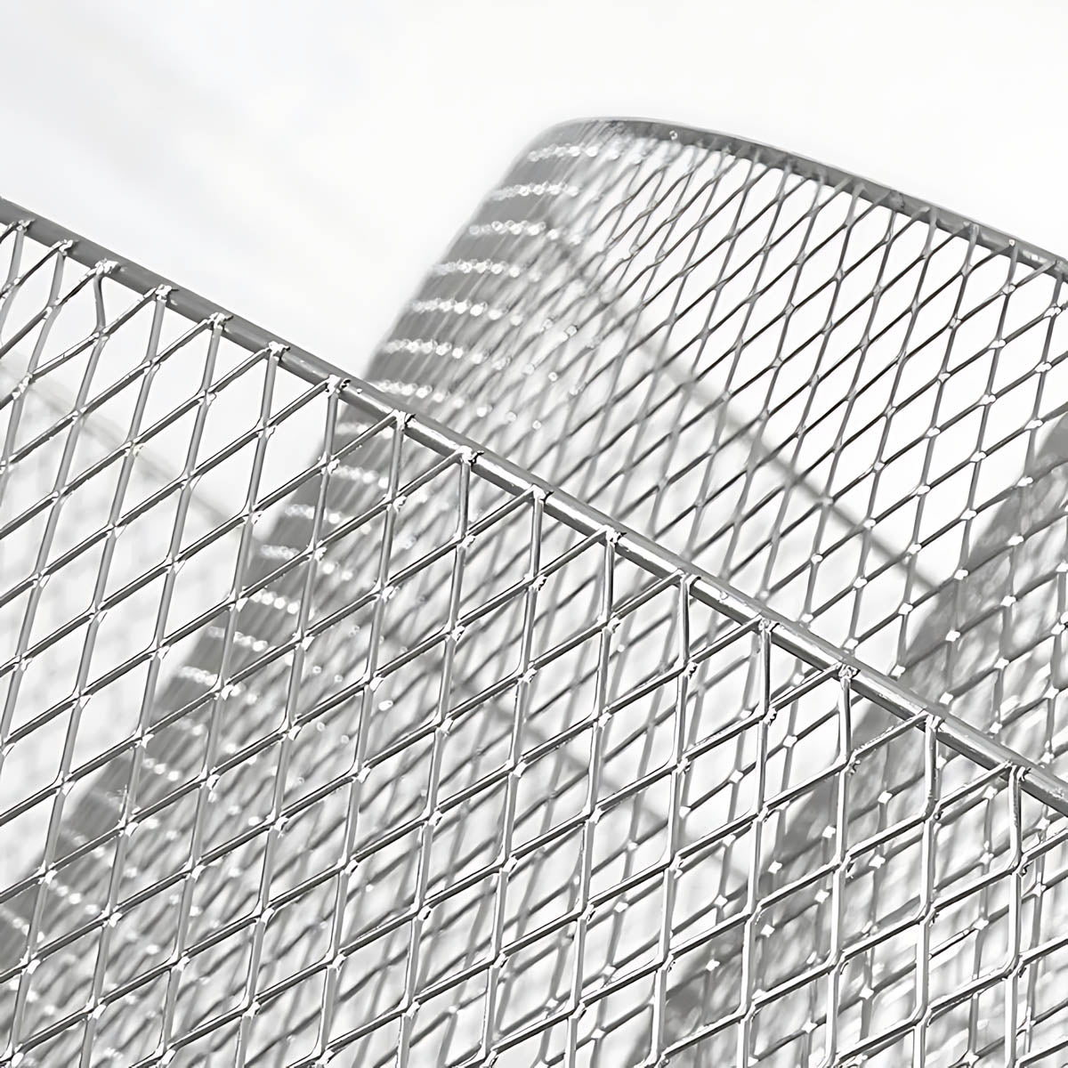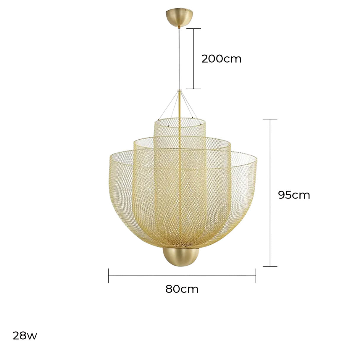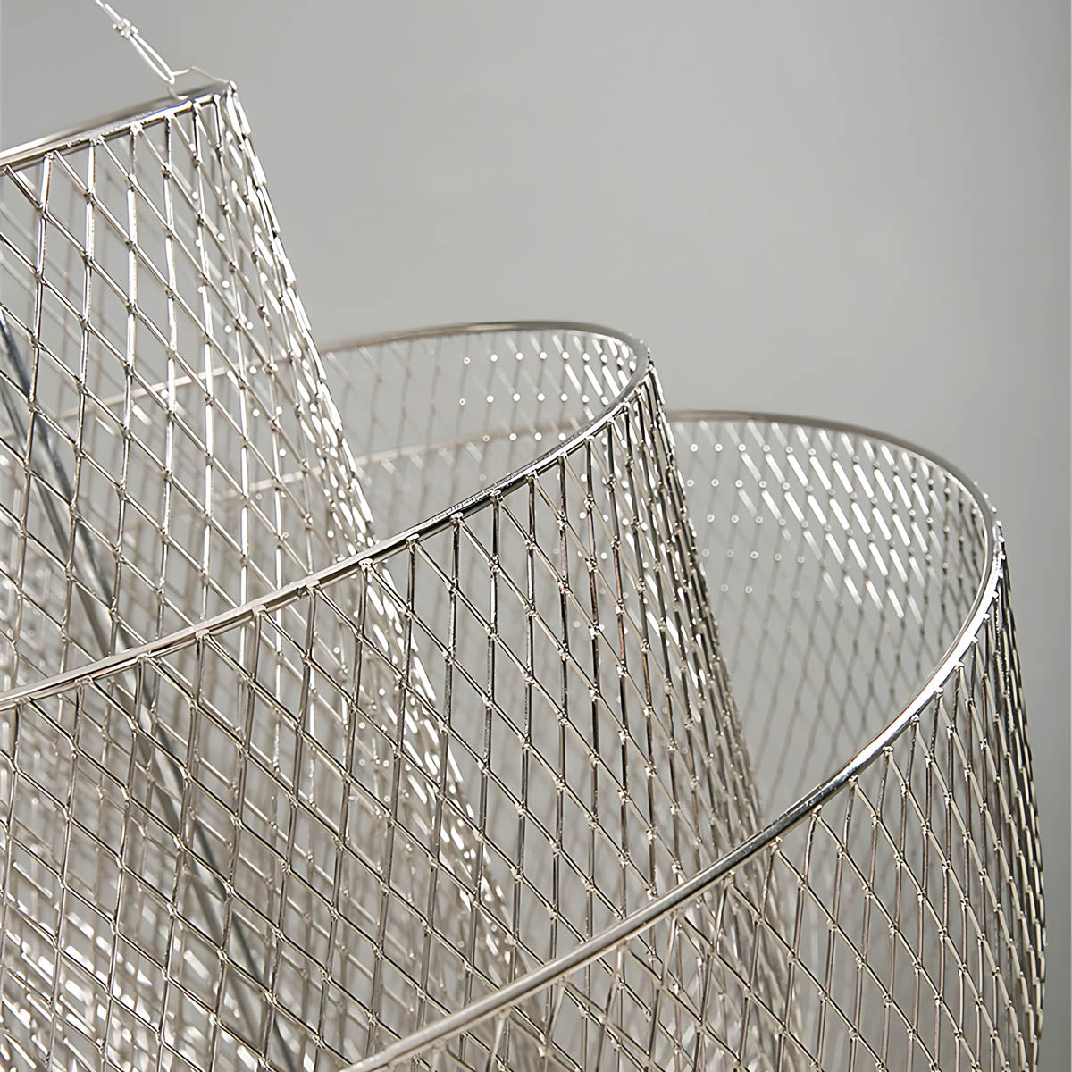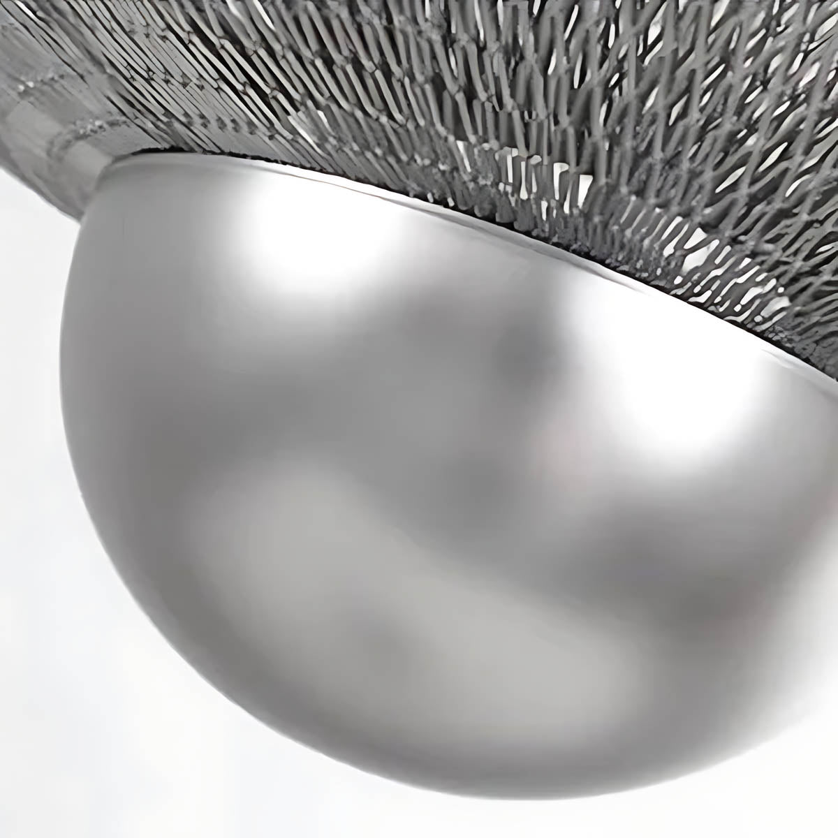 Its layered, scalloped mesh shade floats like a modern lantern, creating an airy silhouette that keeps sightlines open while casting a warm, textural glow with beautiful light-and-shadow play.