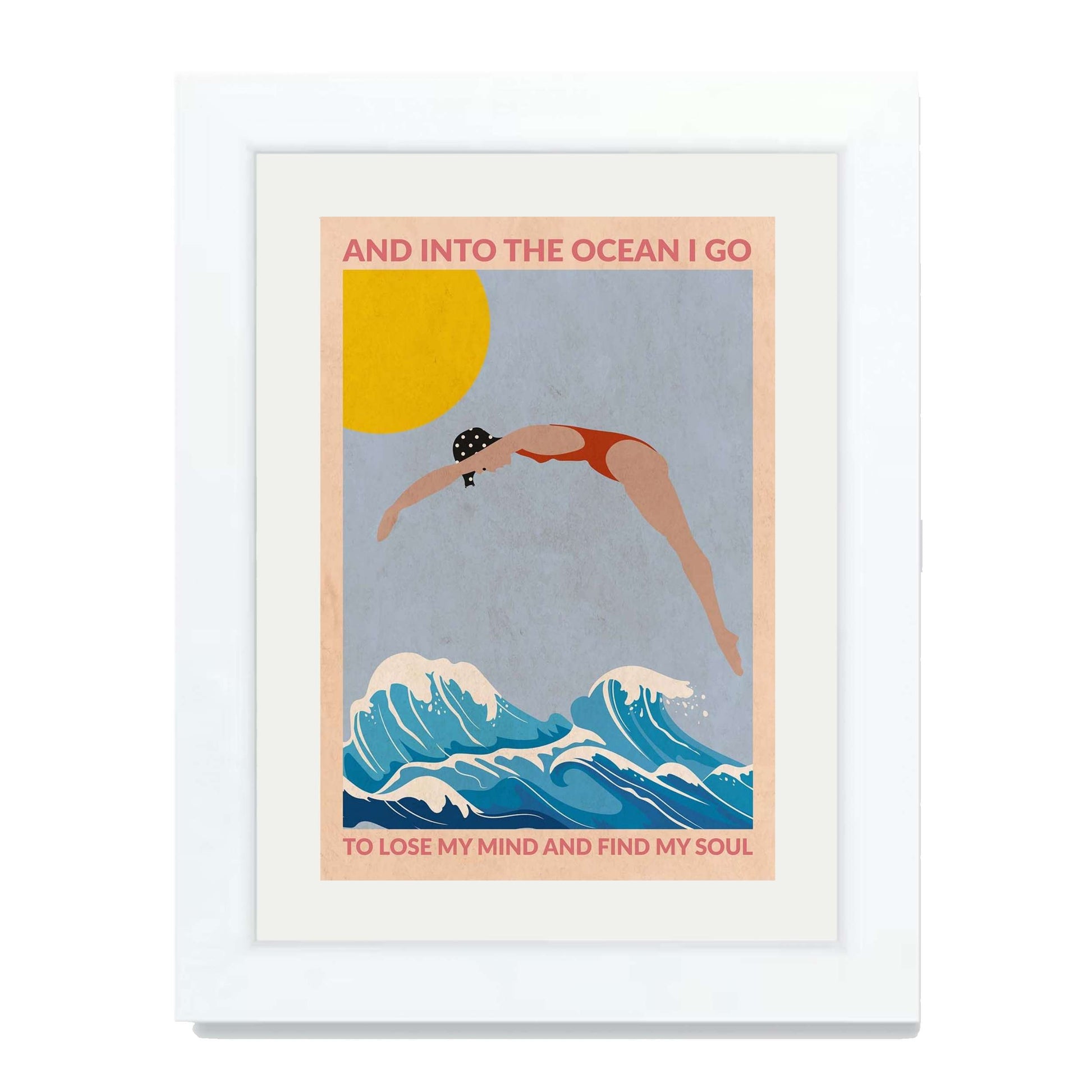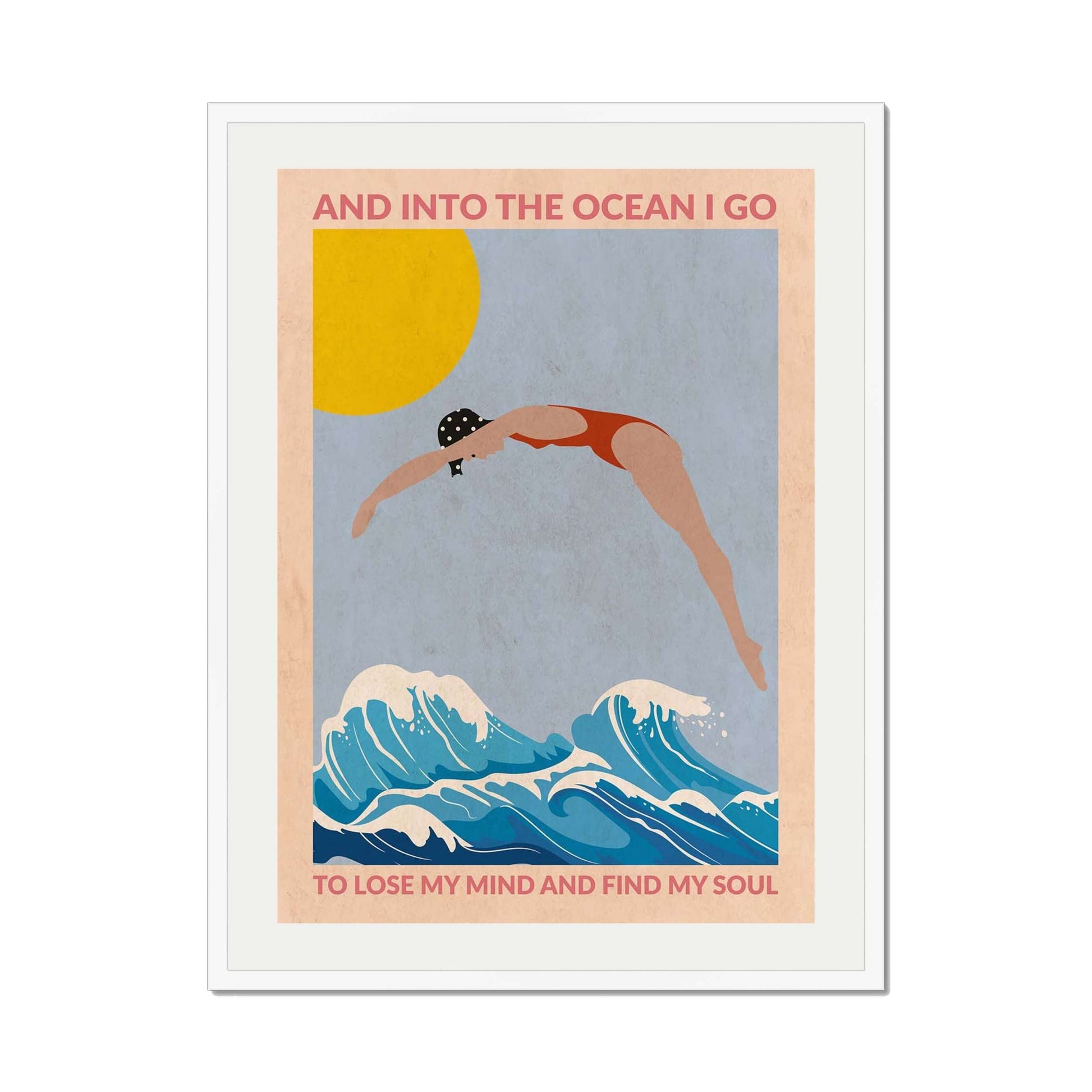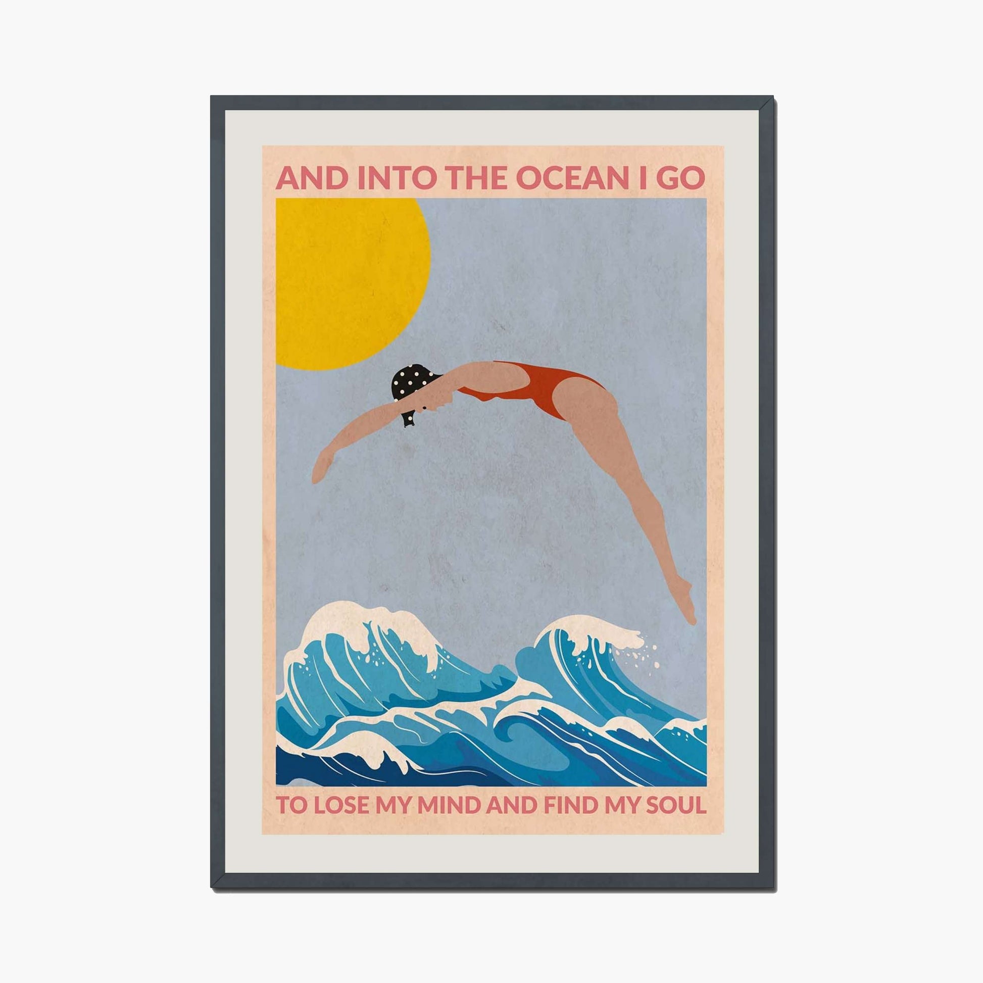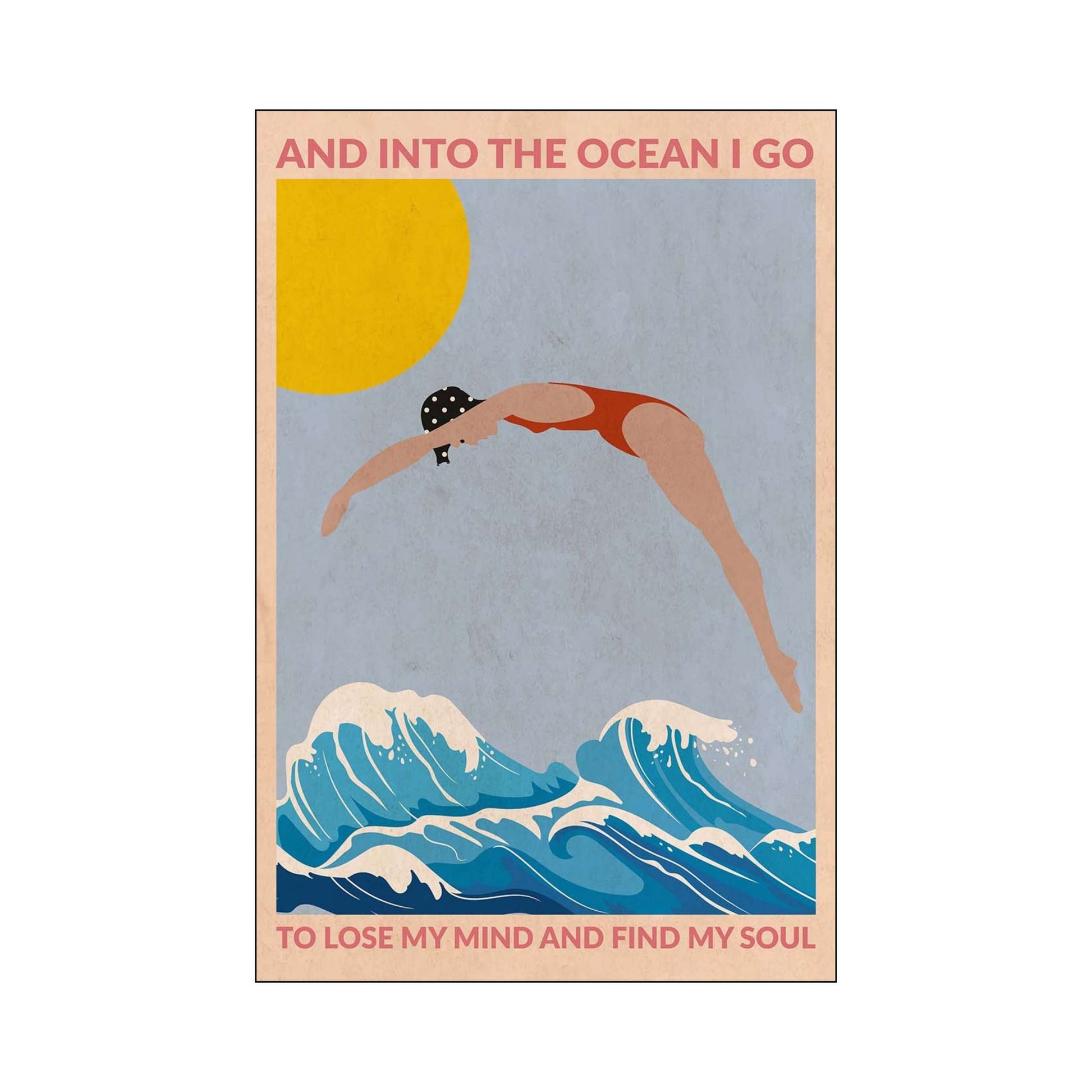 DIVE GIRL (RED) is a retro-style ocean art print featuring a woman diving into blue waves beneath a golden sun, framed by an inspiring ocean quote—perfect for beach lovers and coastal decor.