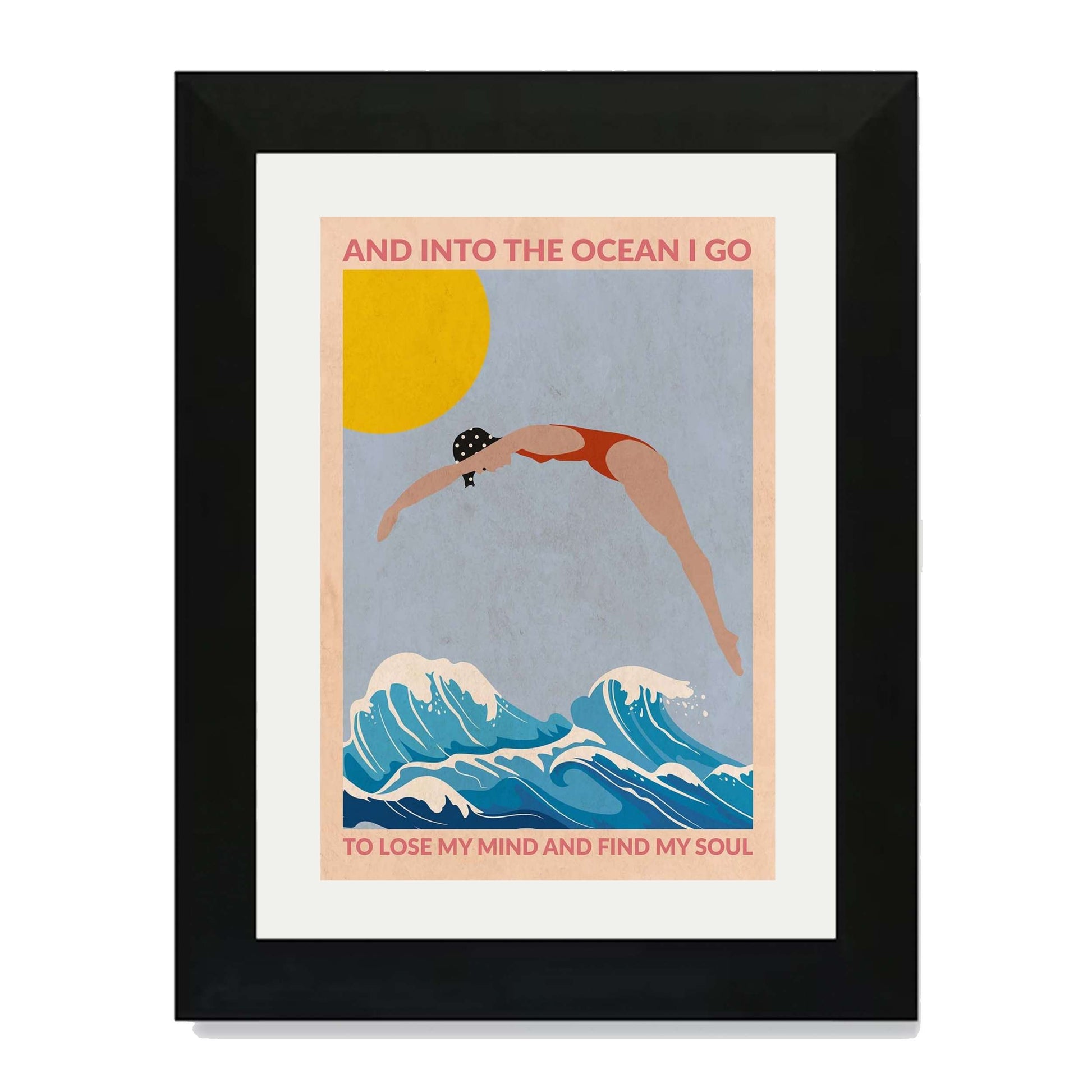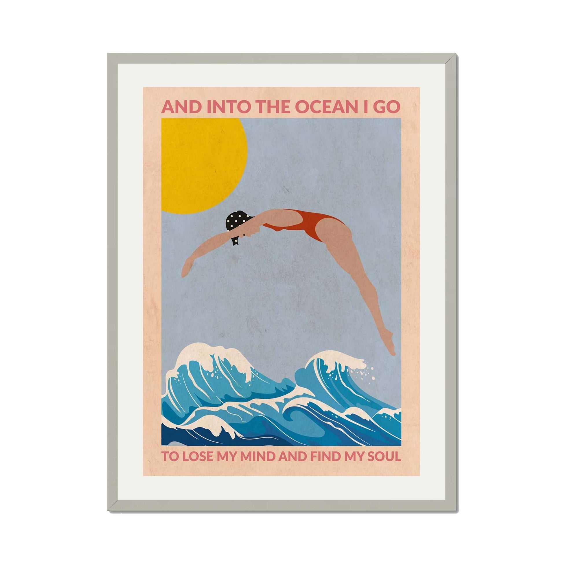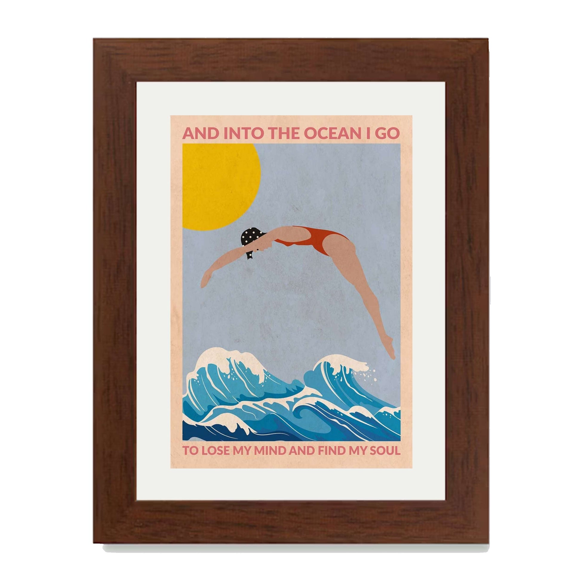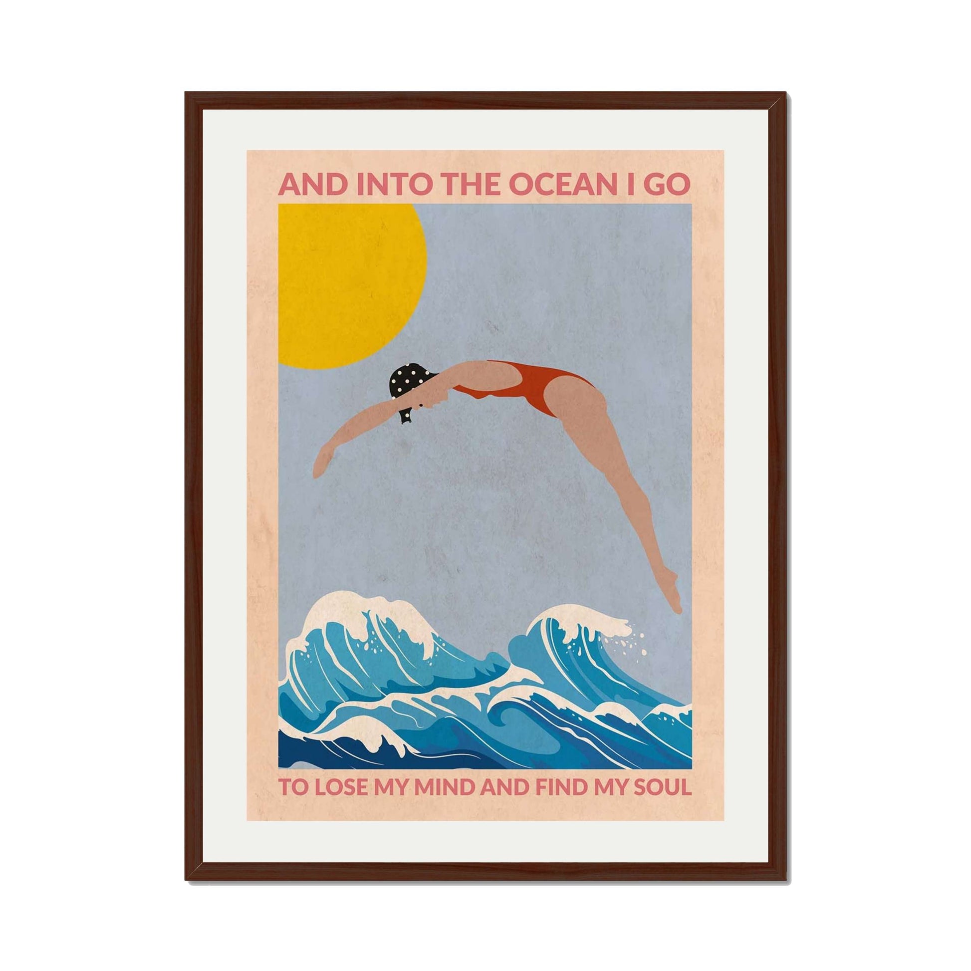 DIVE GIRL (RED) is a retro-style ocean art print featuring a woman diving into blue waves beneath a golden sun, framed by an inspiring ocean quote—perfect for beach lovers and coastal decor.