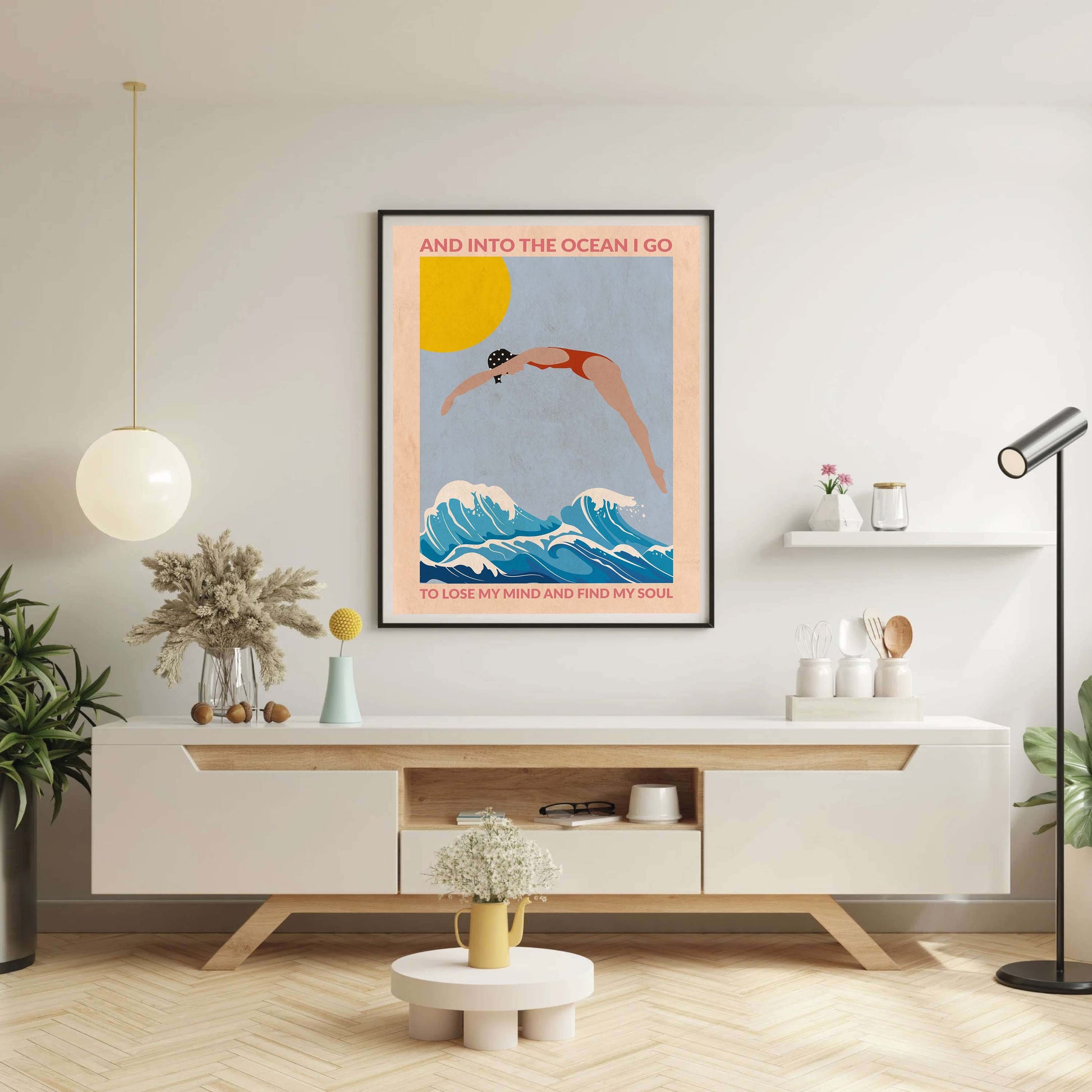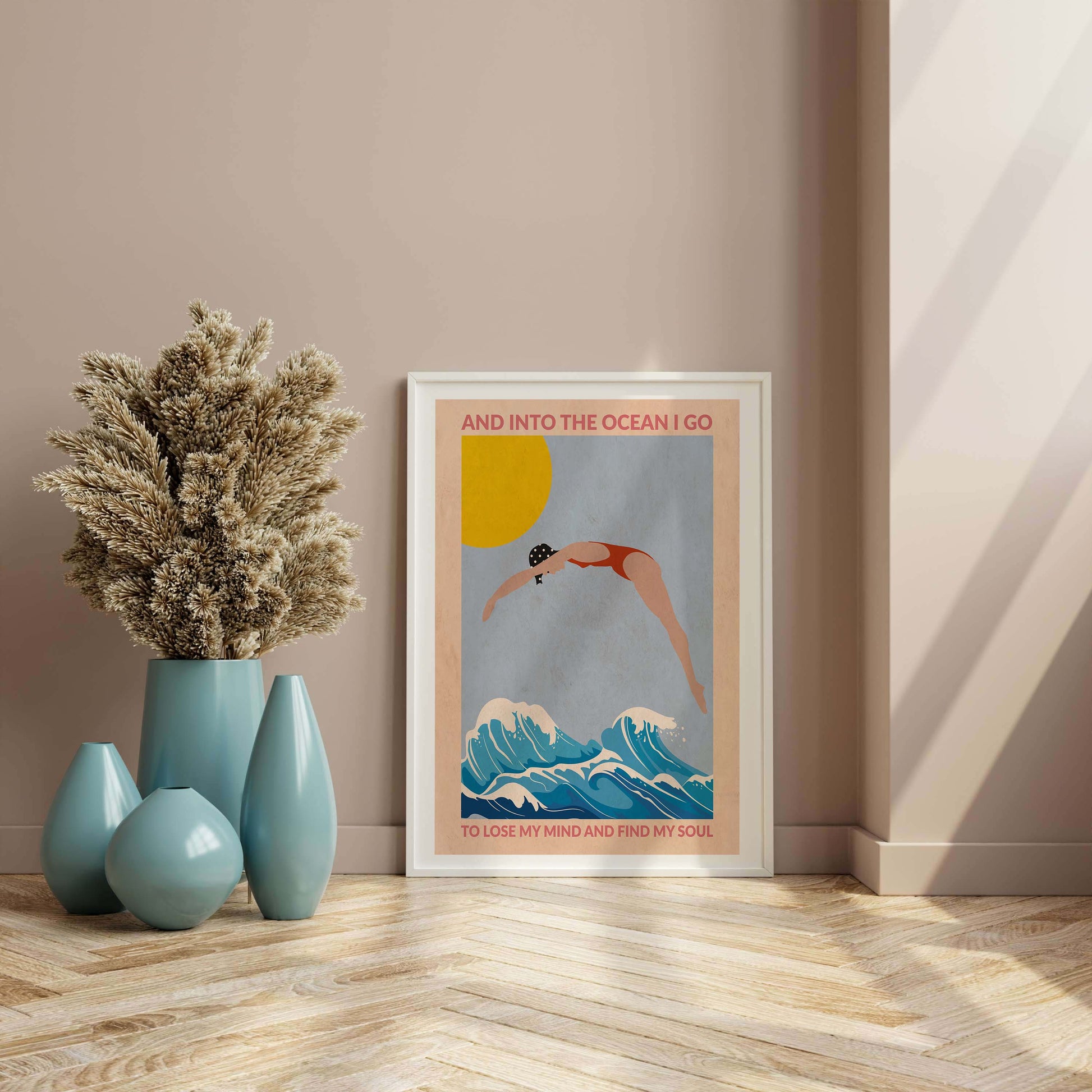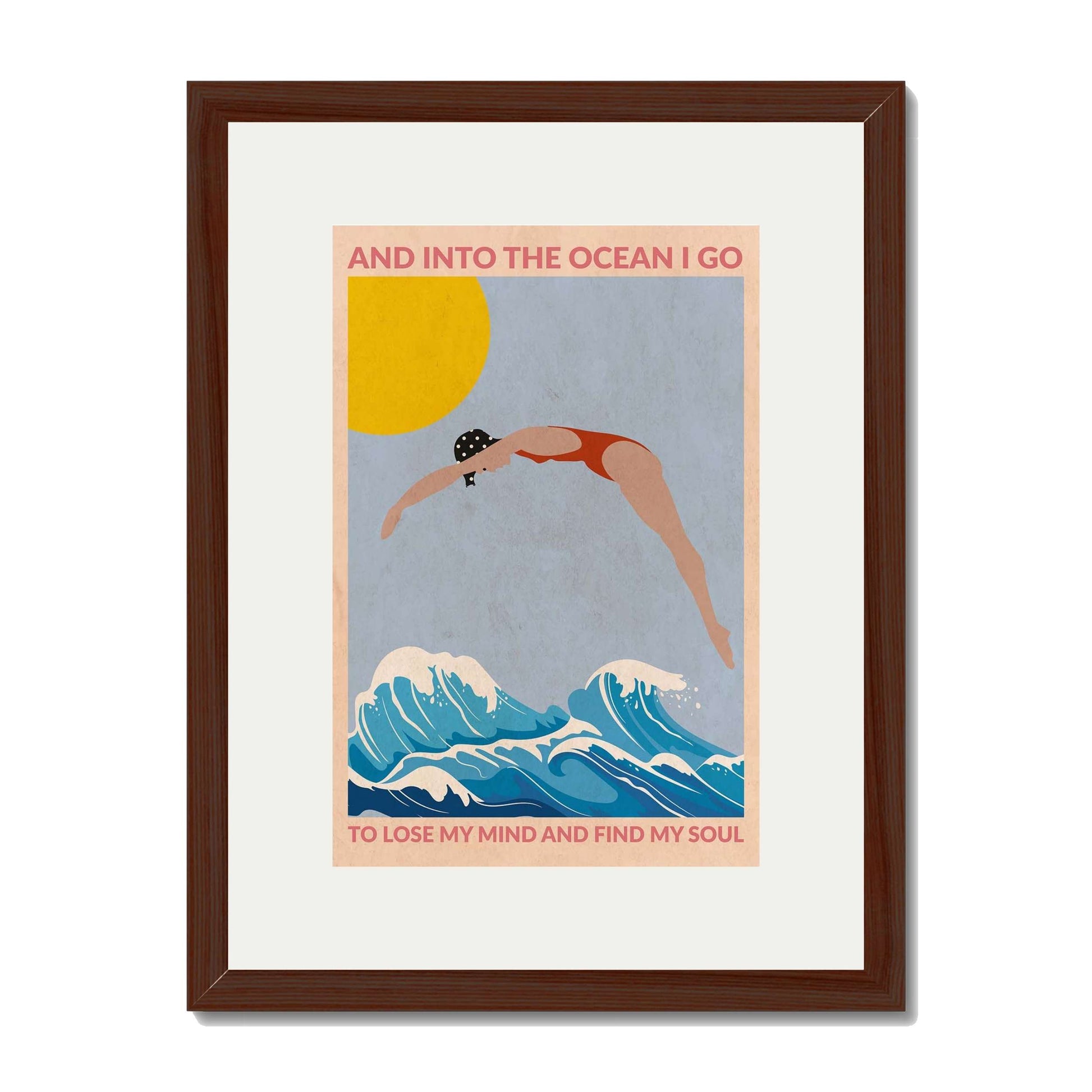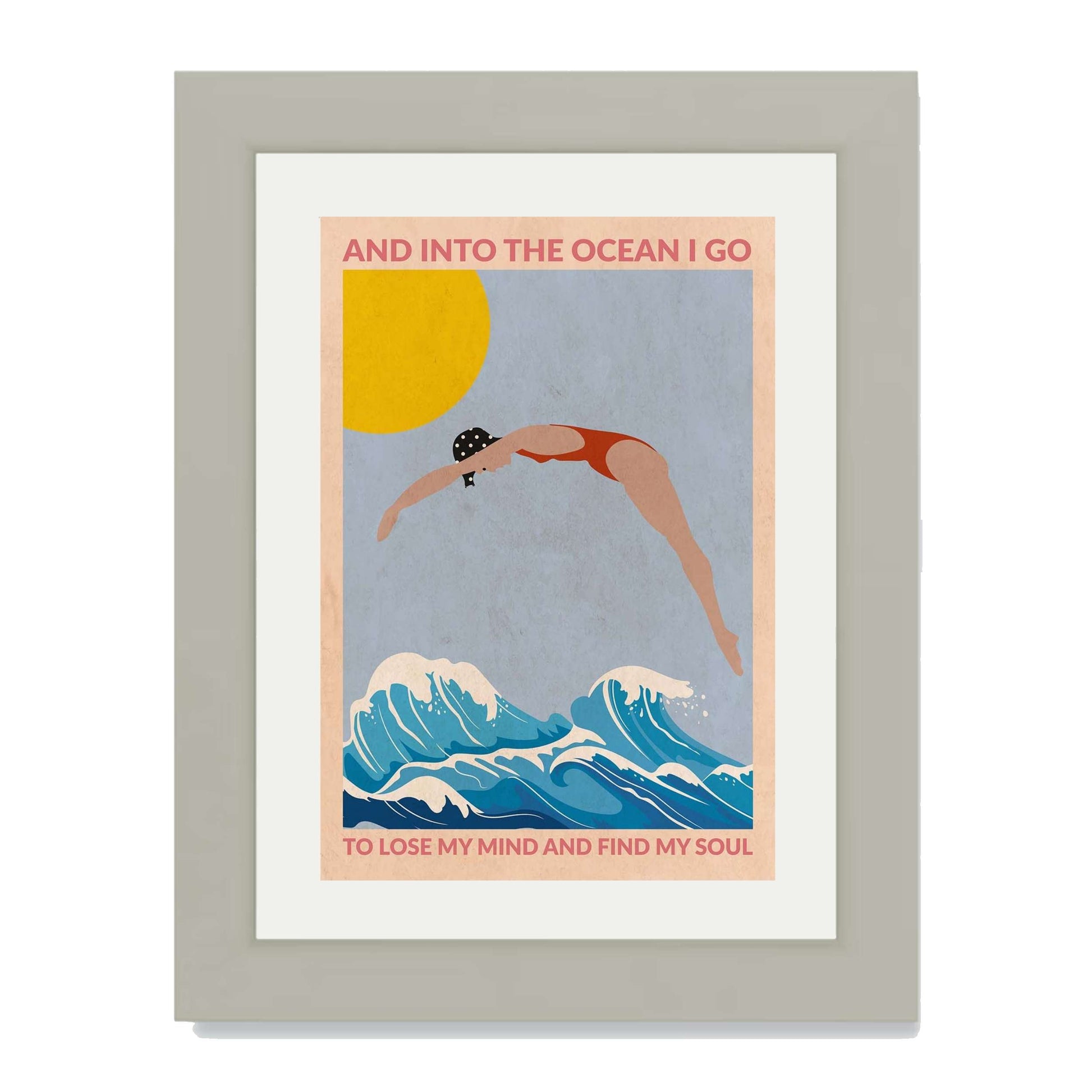 DIVE GIRL (RED) is a retro-style ocean art print featuring a woman diving into blue waves beneath a golden sun, framed by an inspiring ocean quote—perfect for beach lovers and coastal decor.