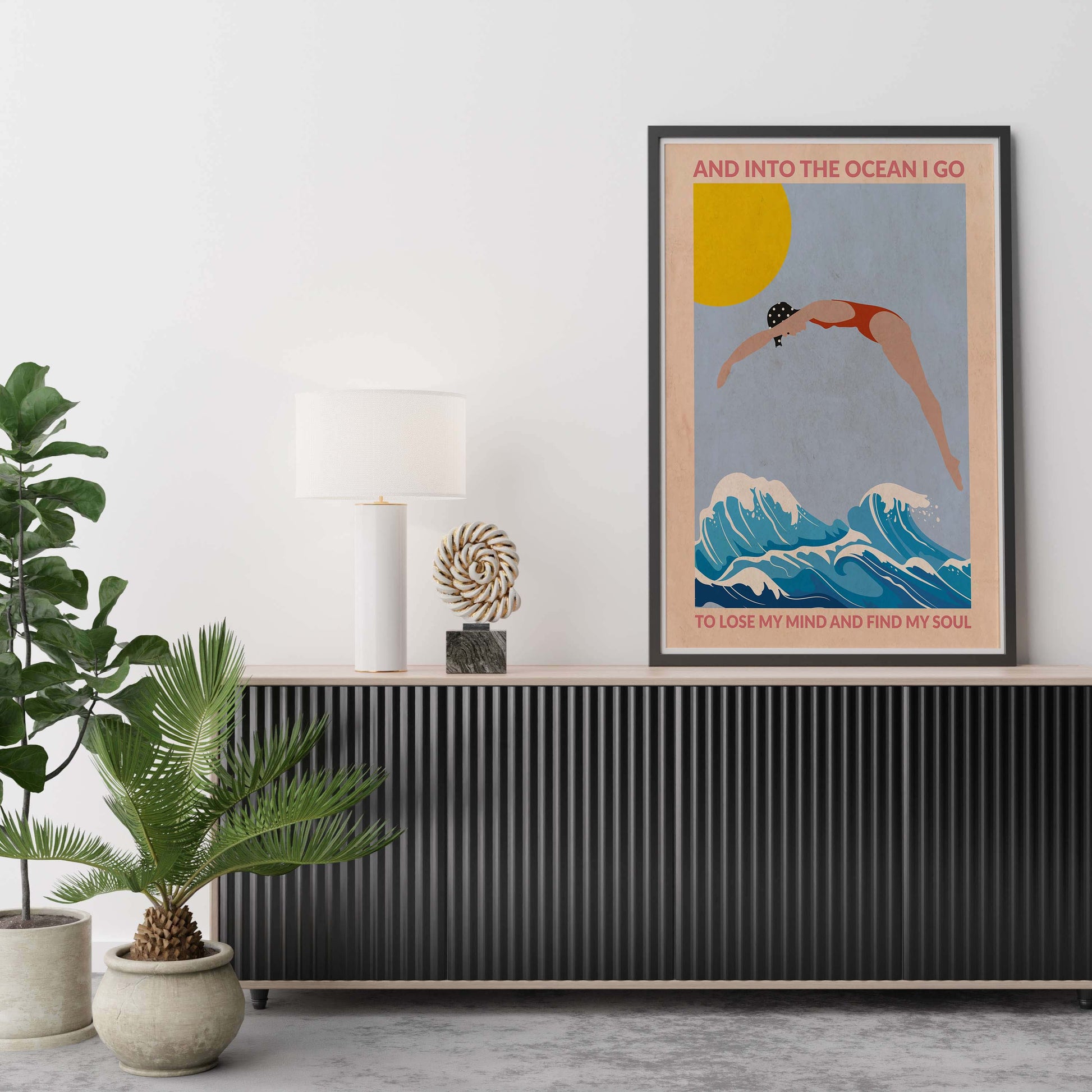 Framed with the quote: “And into the ocean I go / To lose my mind and find my soul”