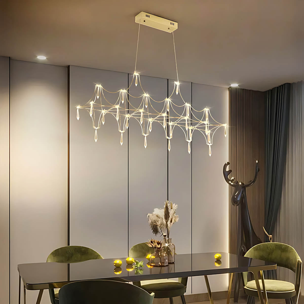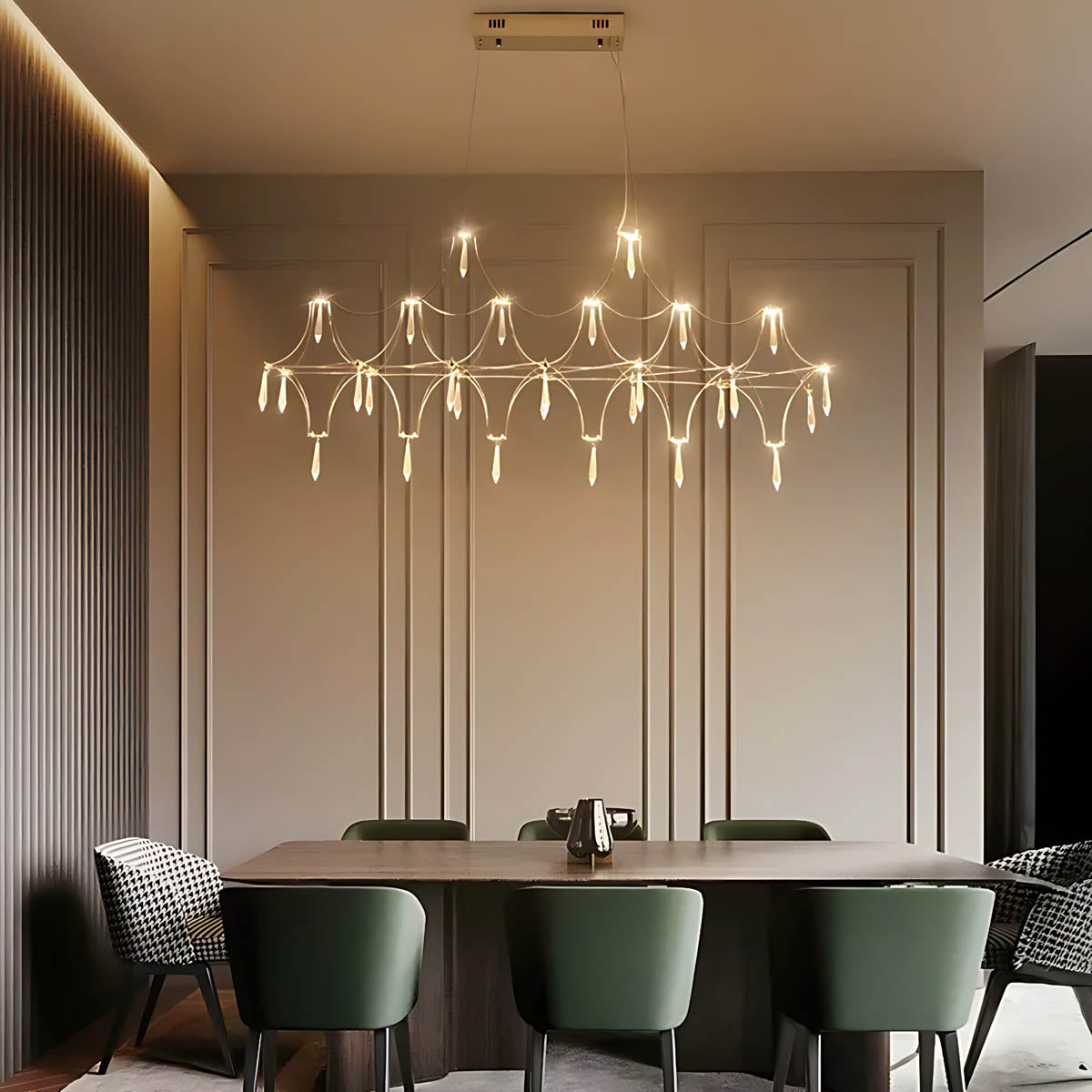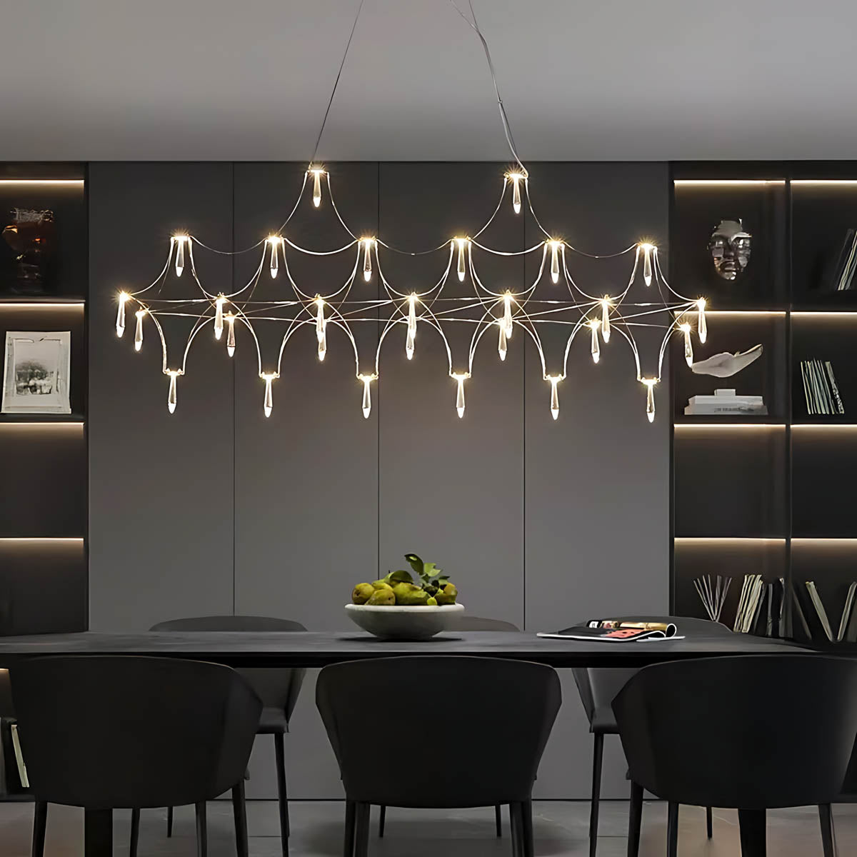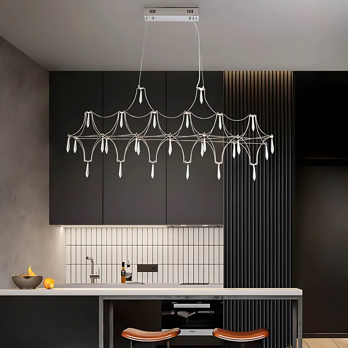 Its sculptural lattice of graceful arches is traced with crystal teardrops that catch and scatter light, creating a refined, champagne-like sparkle over dining tables, kitchen islands, and living rooms.