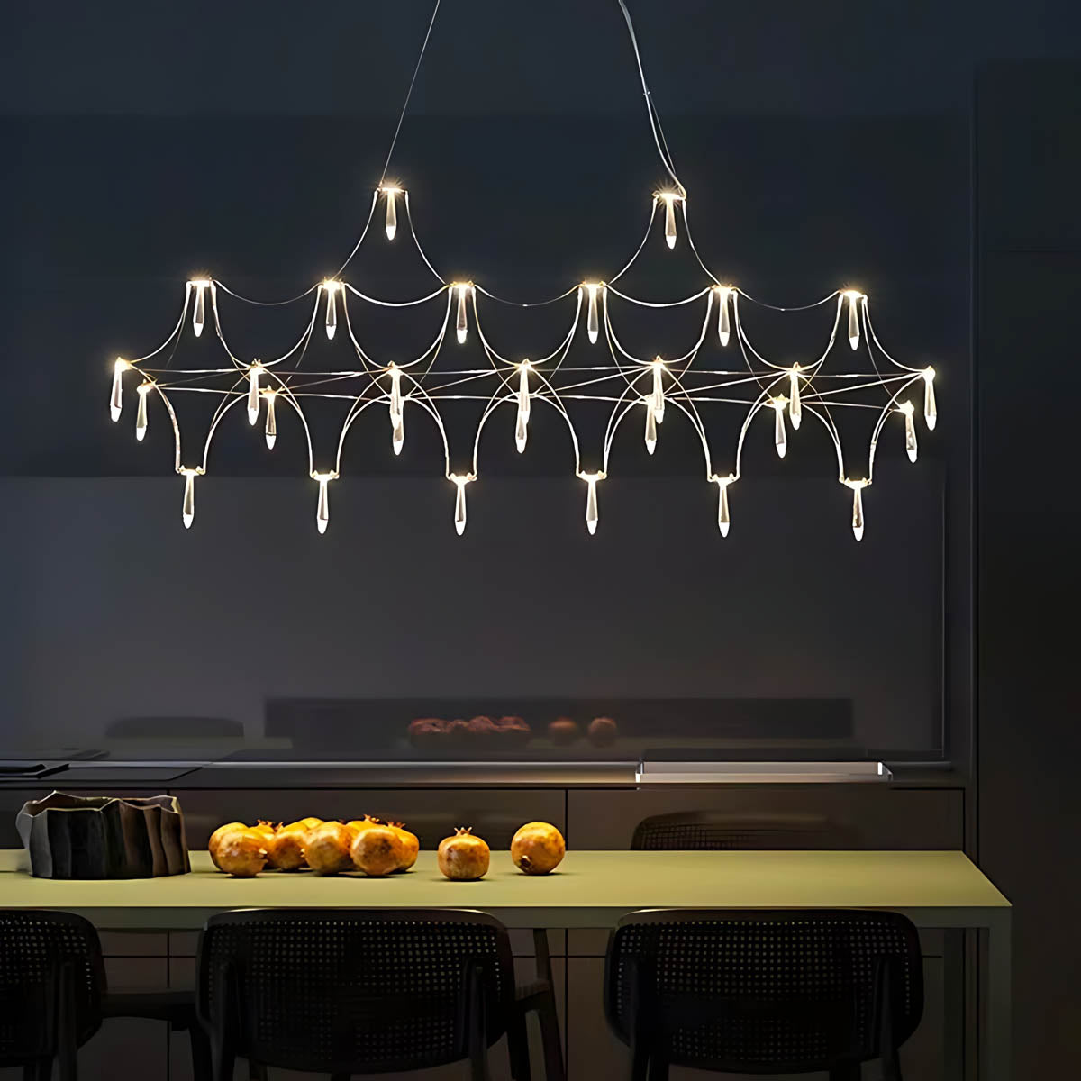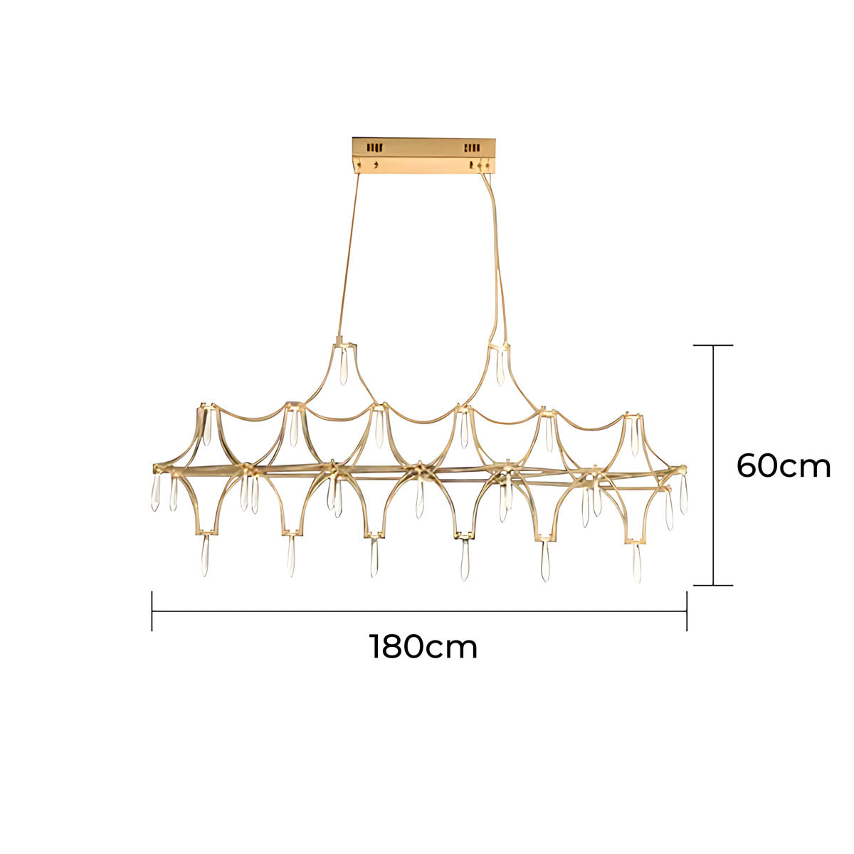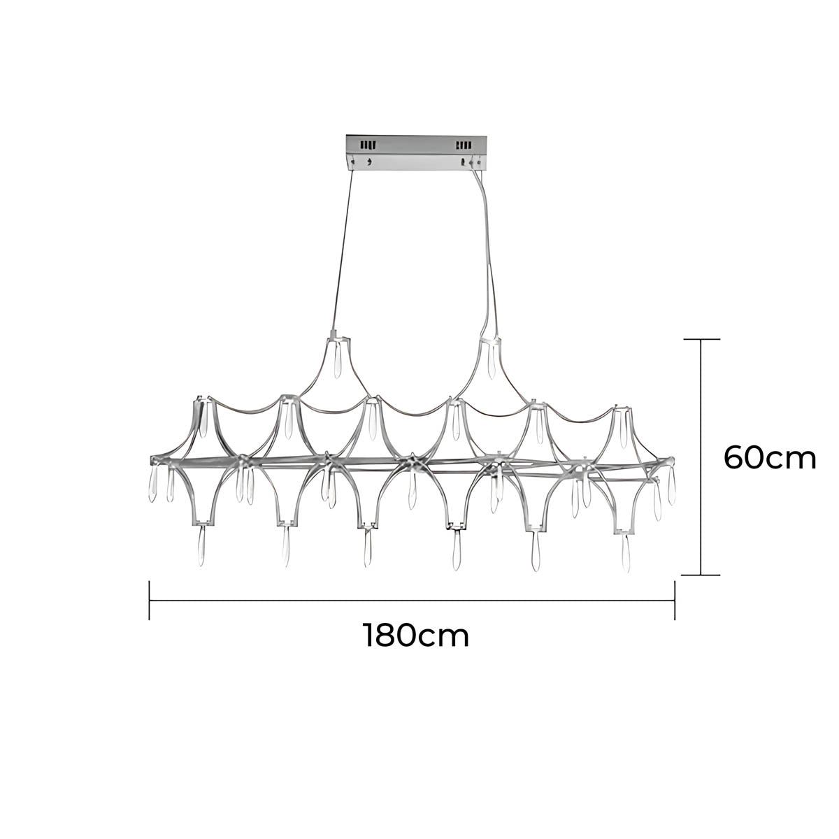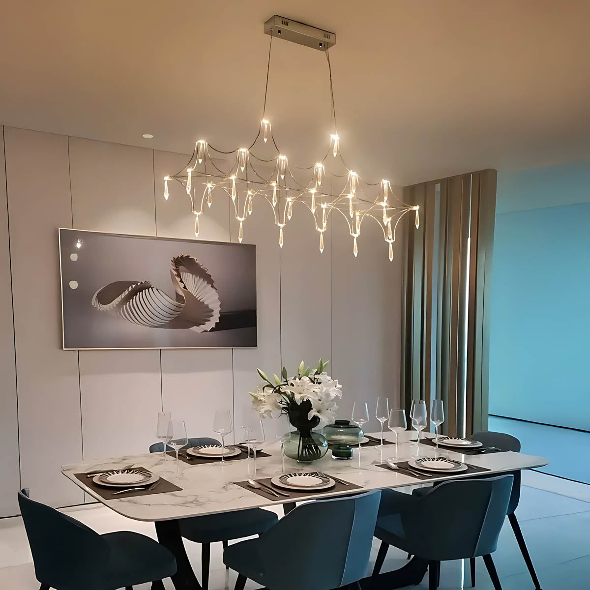 Its sculptural lattice of graceful arches is traced with crystal teardrops that catch and scatter light, creating a refined, champagne-like sparkle over dining tables, kitchen islands, and living rooms.
