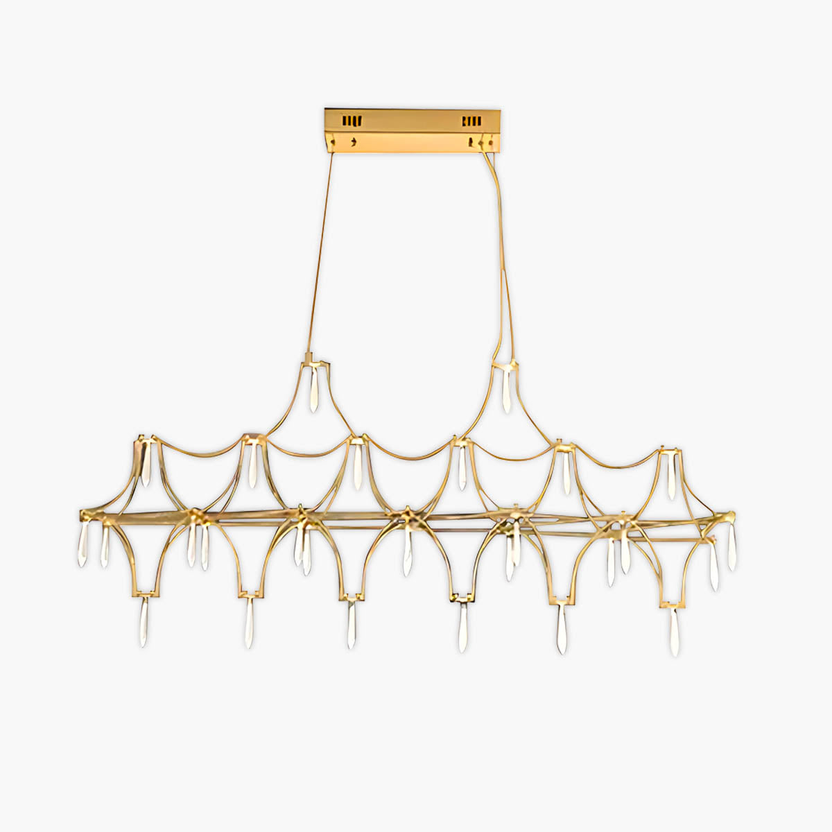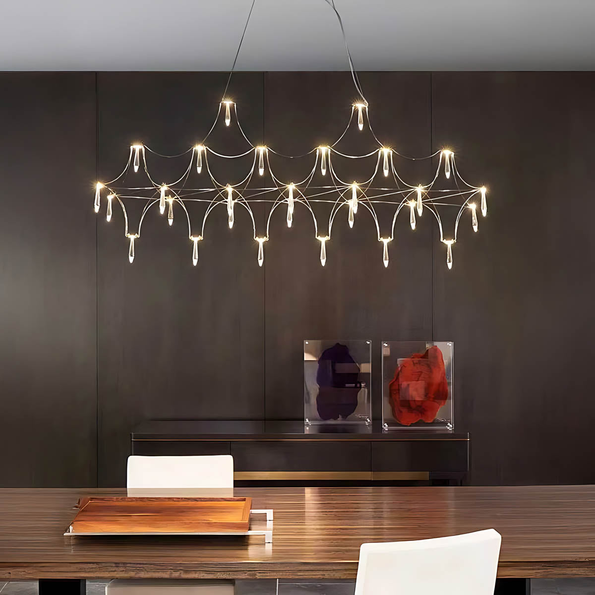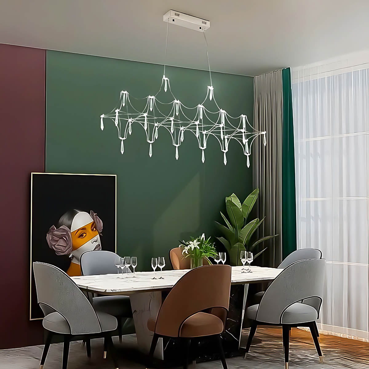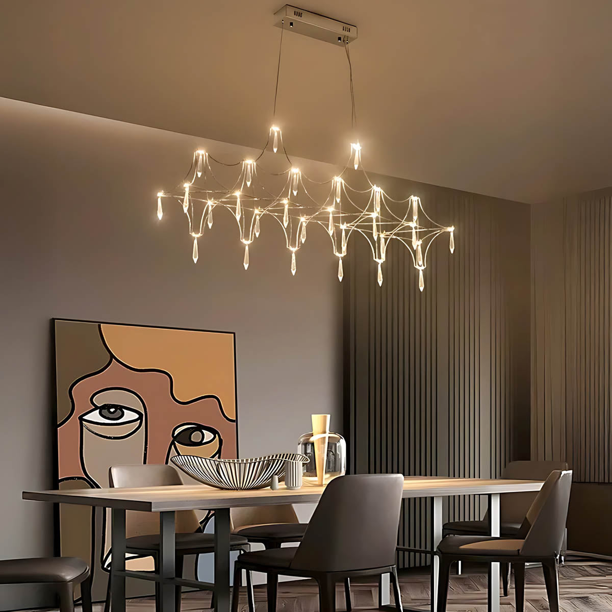 Its sculptural lattice of graceful arches is traced with crystal teardrops that catch and scatter light, creating a refined, champagne-like sparkle over dining tables, kitchen islands, and living rooms.
