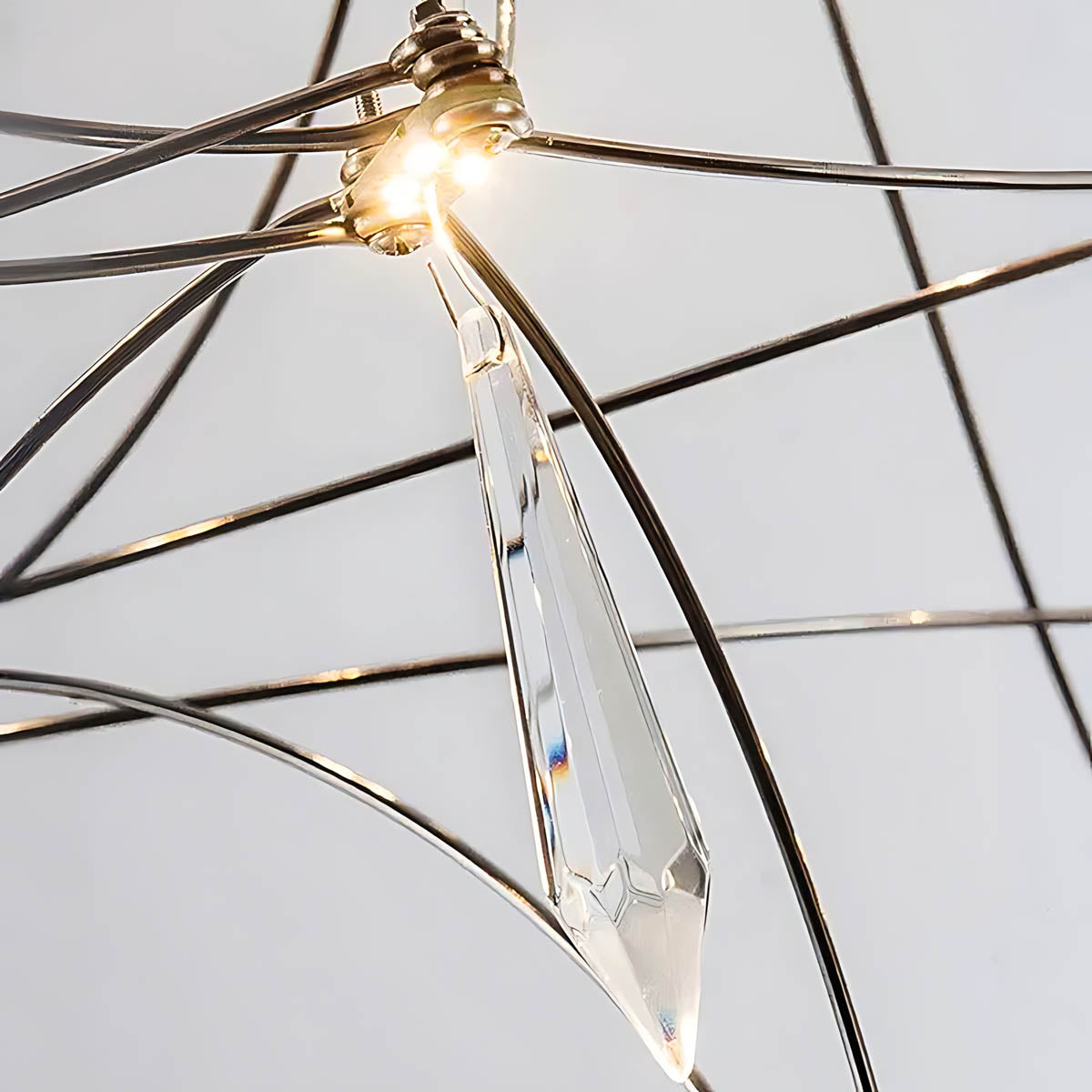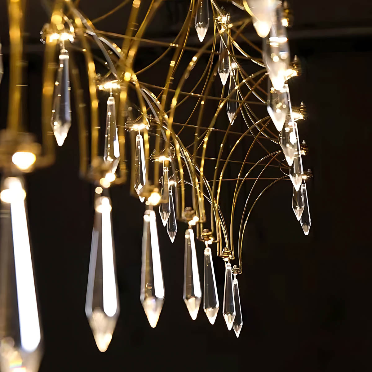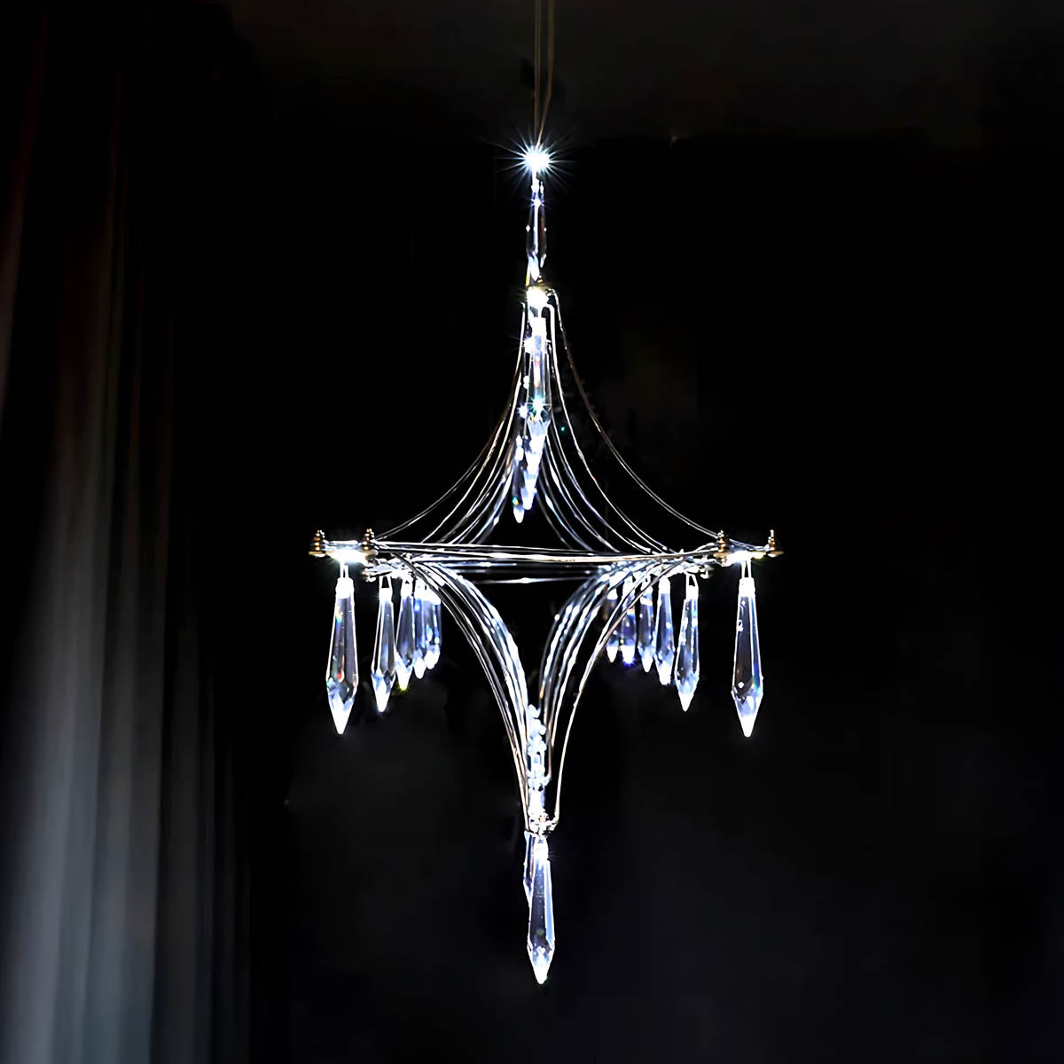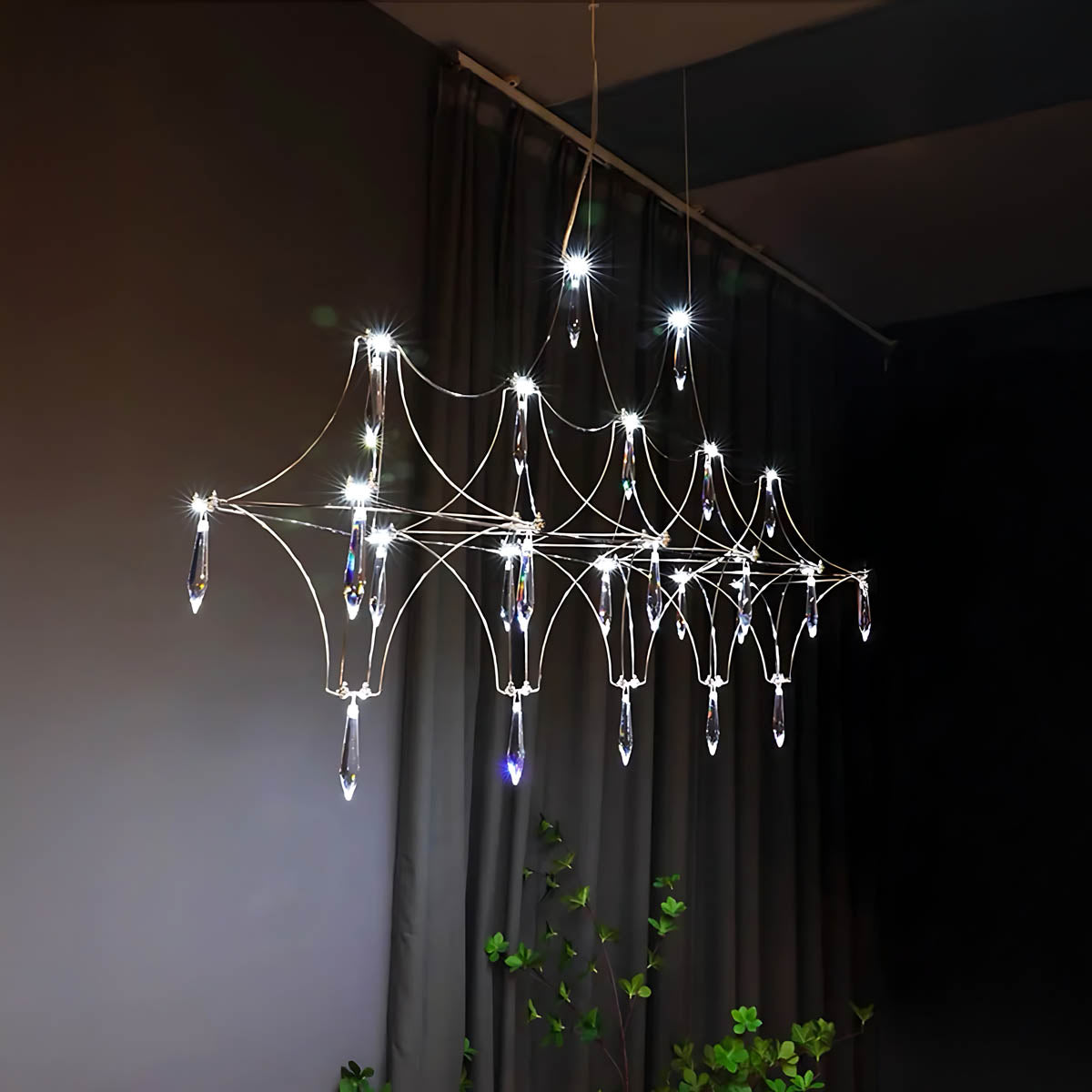 Its sculptural lattice of graceful arches is traced with crystal teardrops that catch and scatter light, creating a refined, champagne-like sparkle over dining tables, kitchen islands, and living rooms.