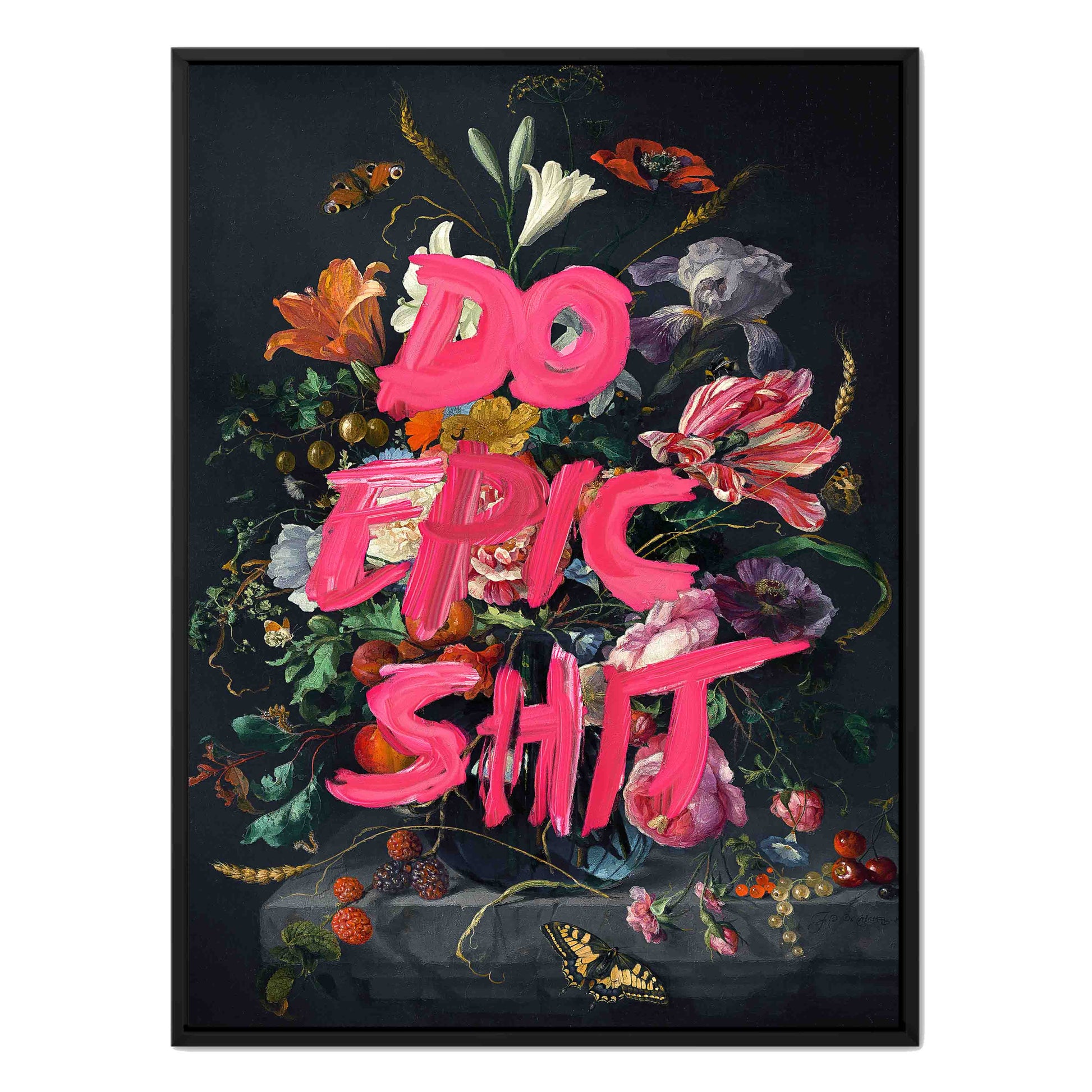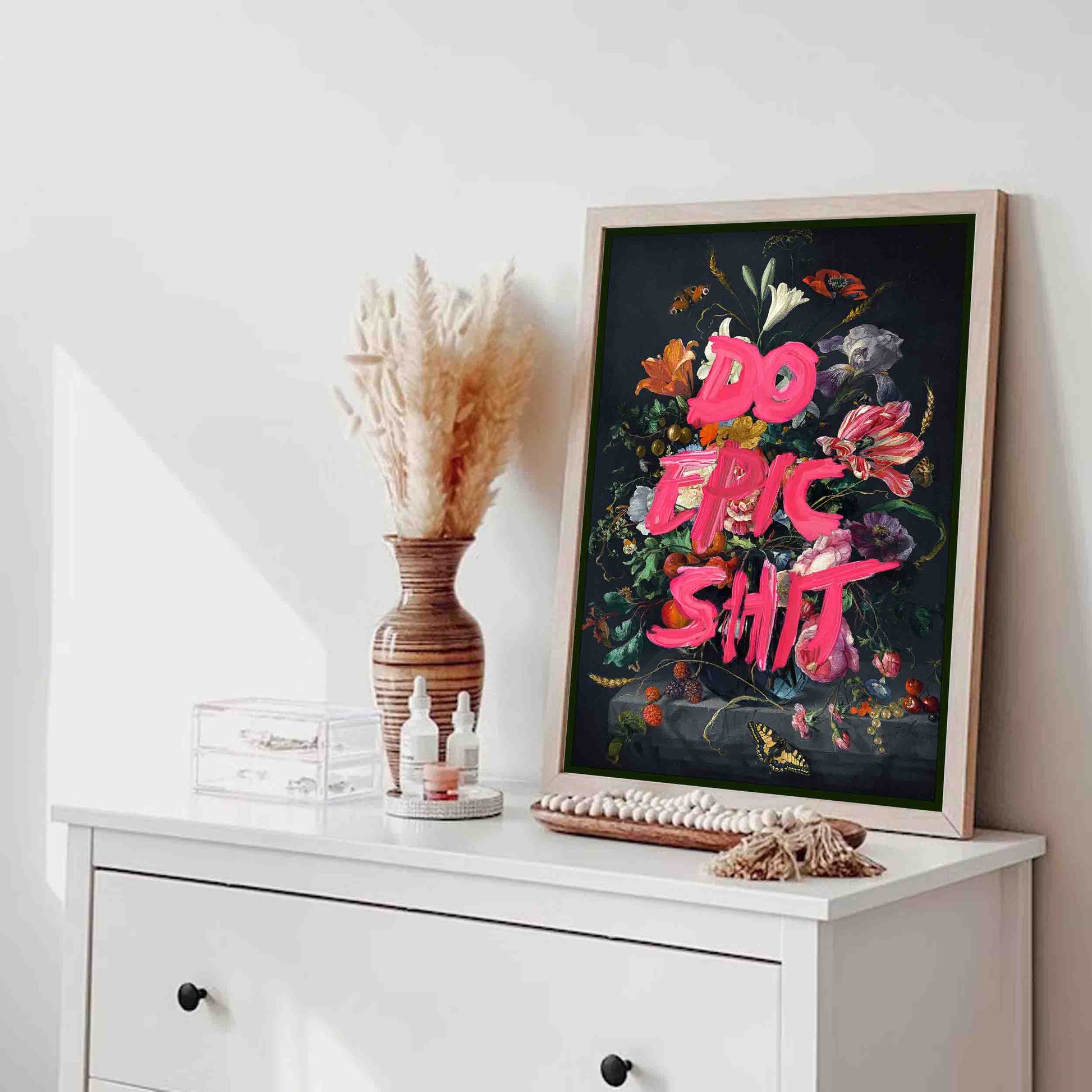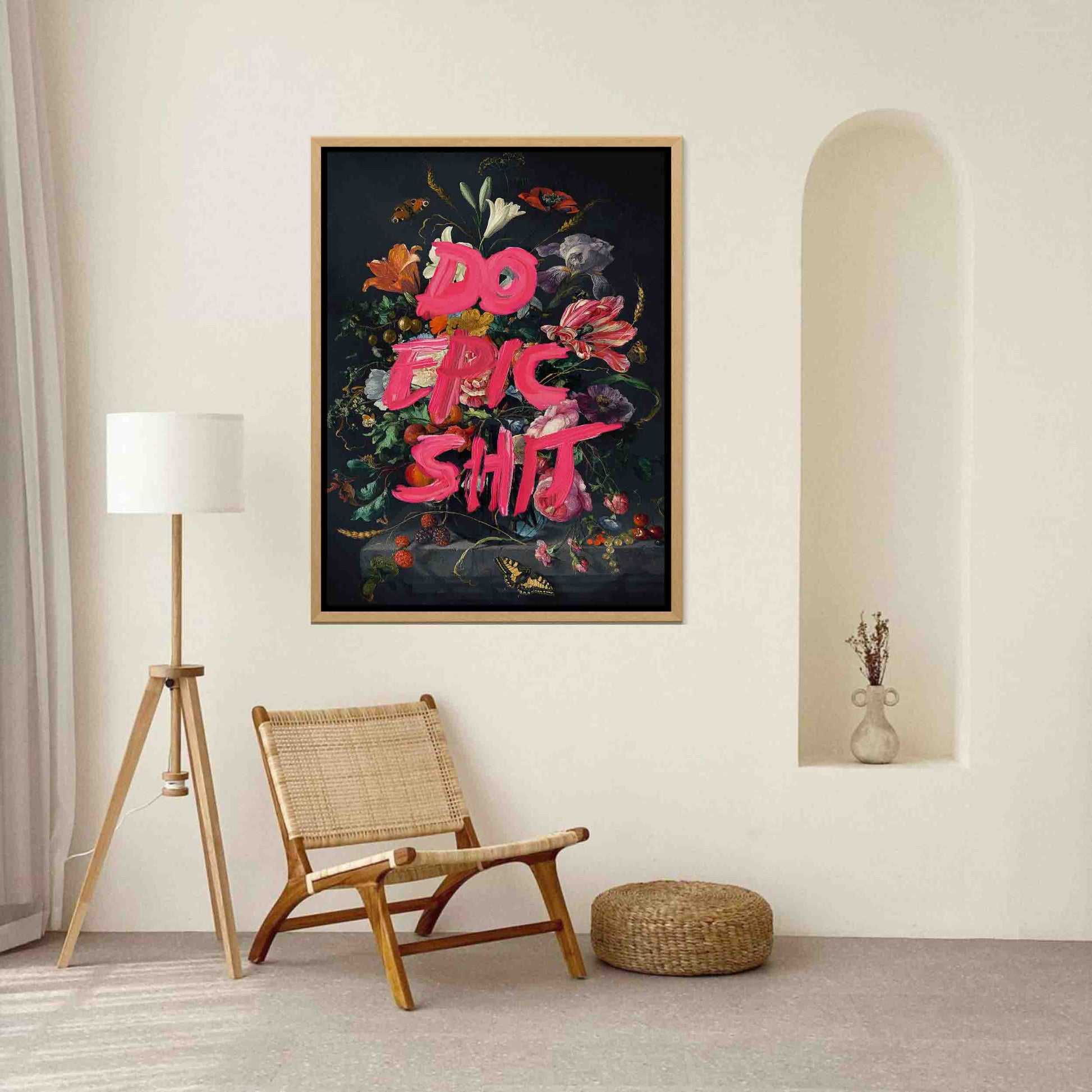 Bold canvas wall art featuring a vintage dark floral bouquet overlaid with neon pink text “DO EPIC SHIT.” A rebellious blend of classical elegance and modern motivation.