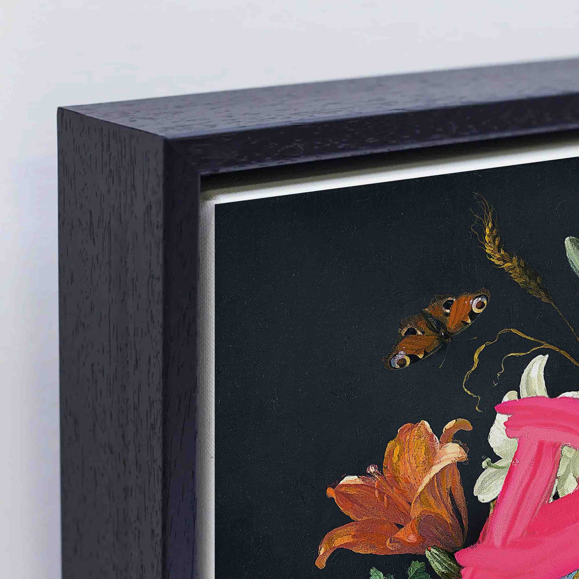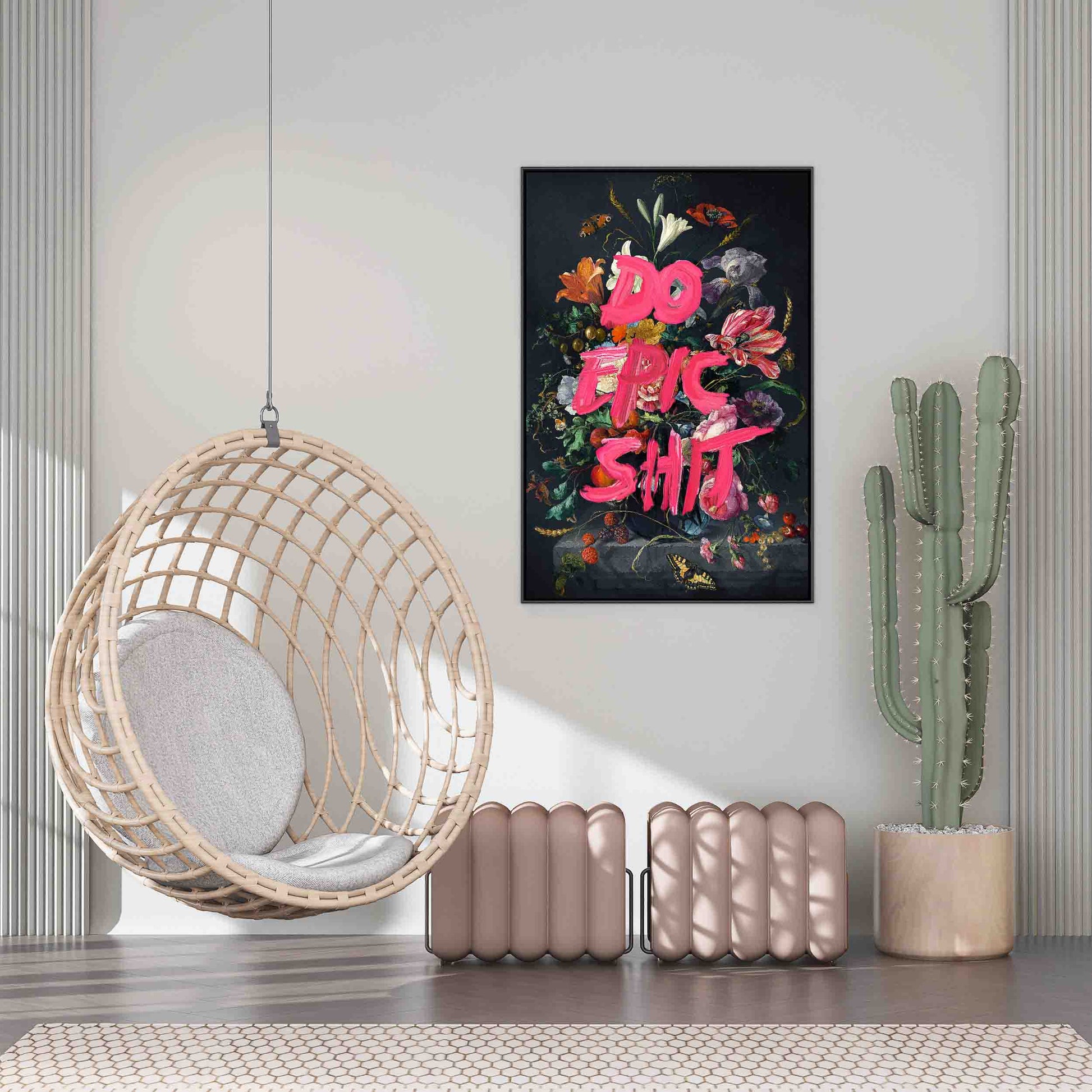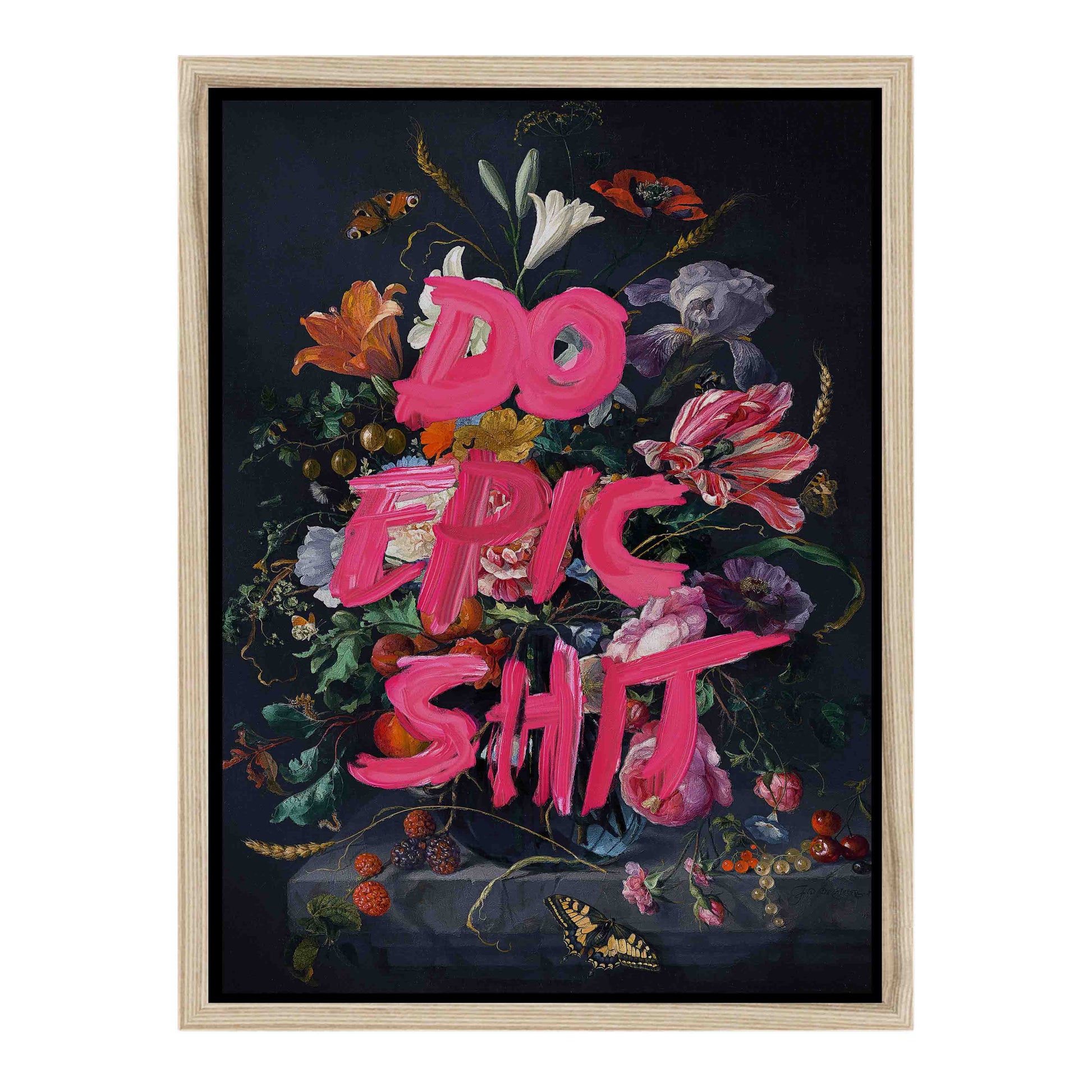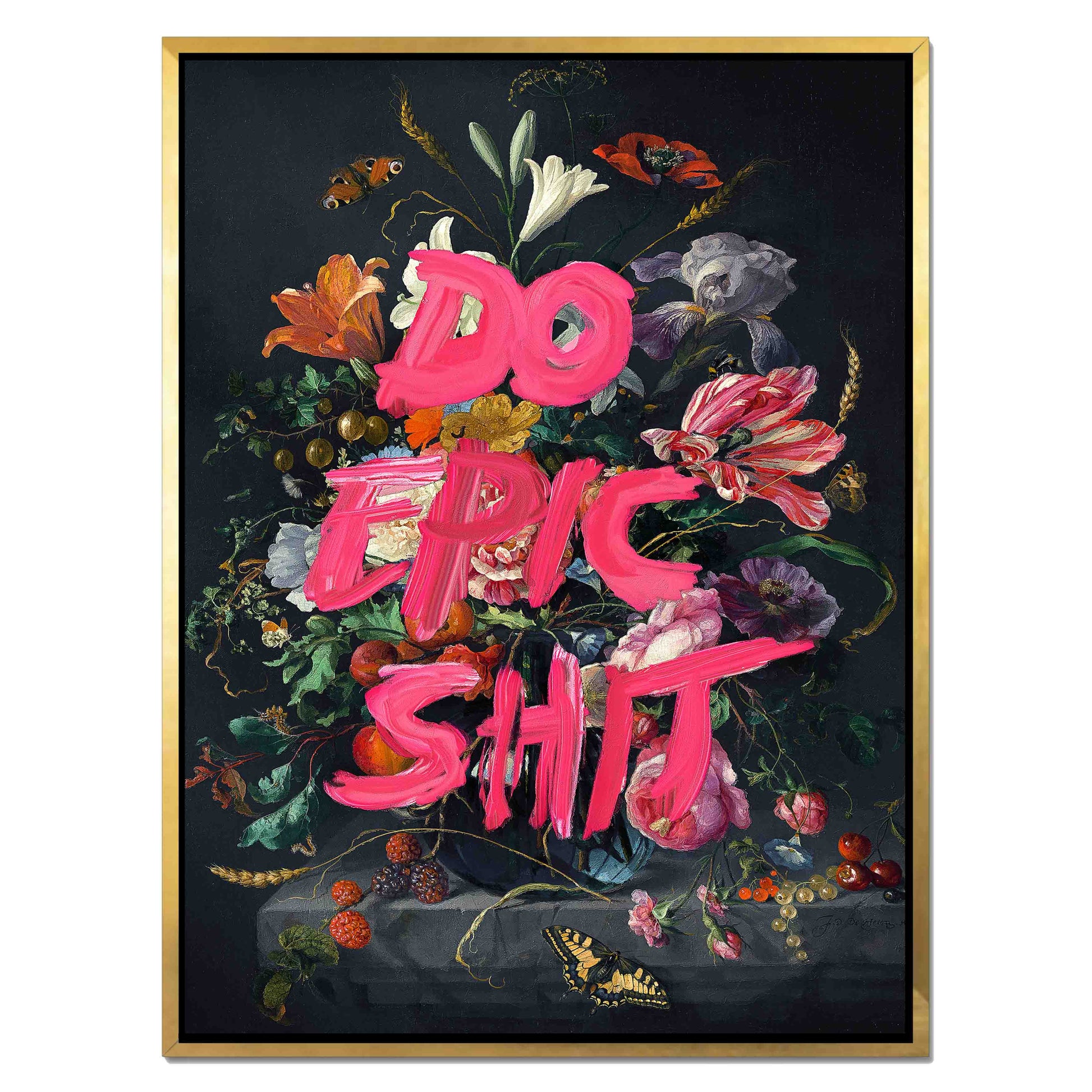 Bold canvas wall art featuring a vintage dark floral bouquet overlaid with neon pink text “DO EPIC SHIT.” A rebellious blend of classical elegance and modern motivation.