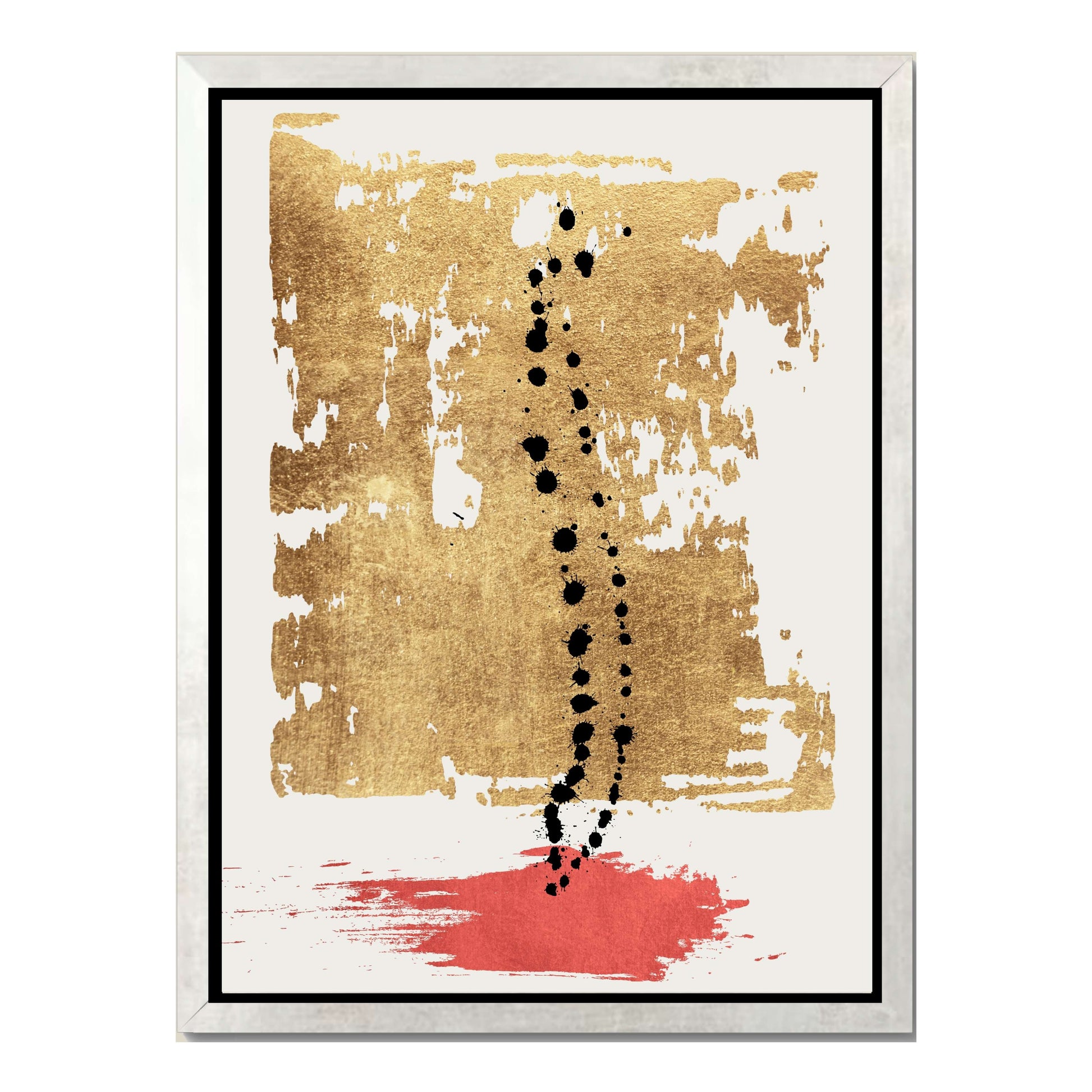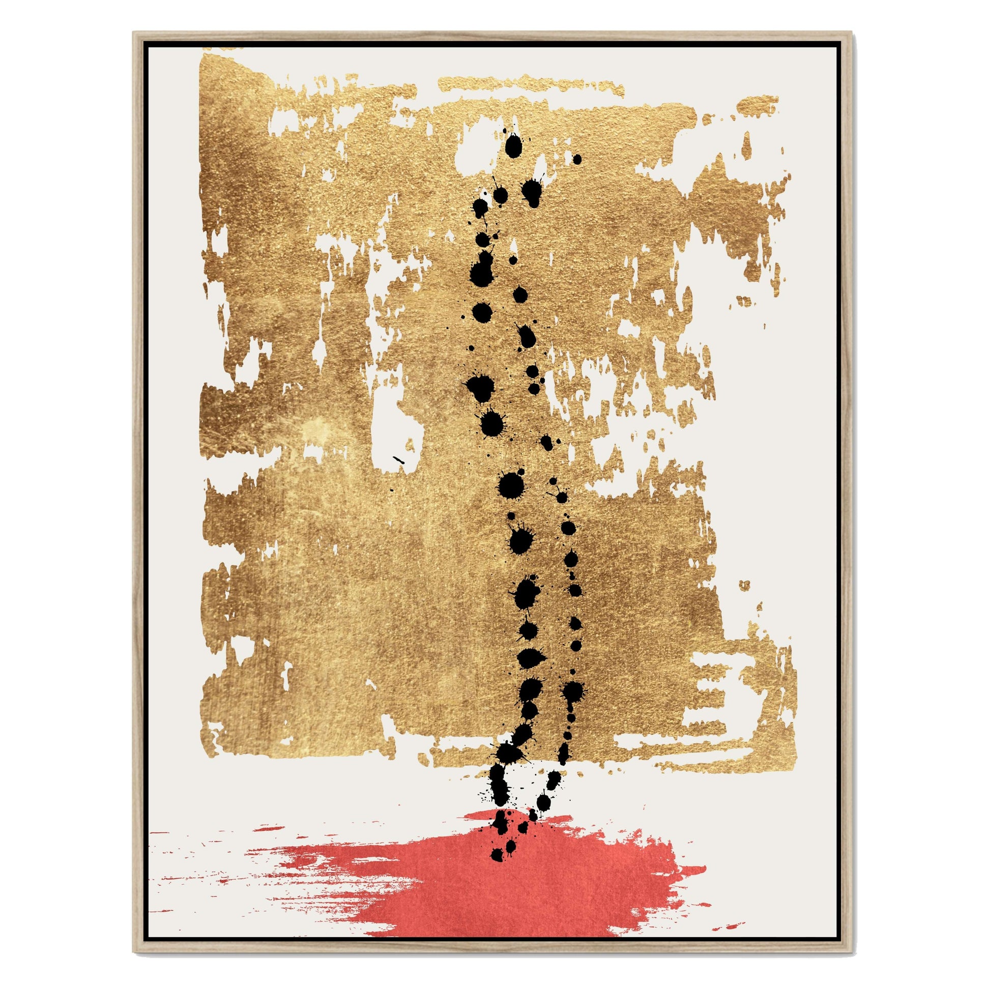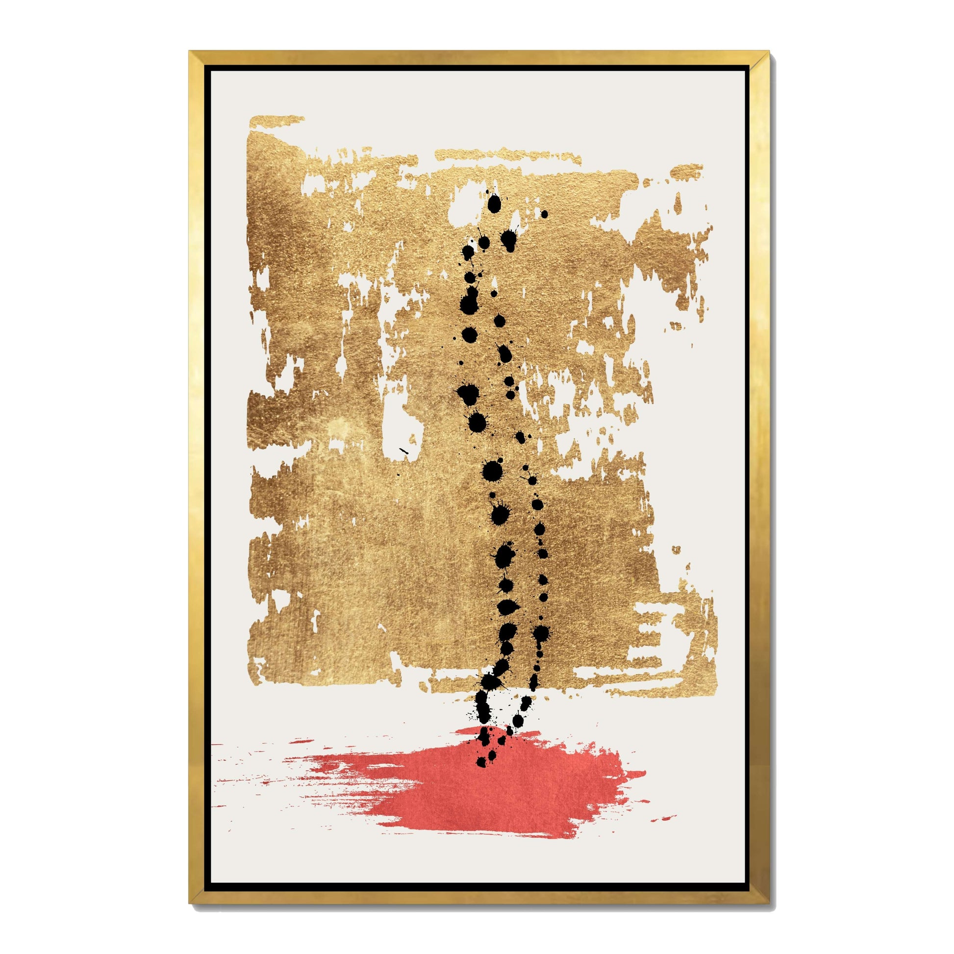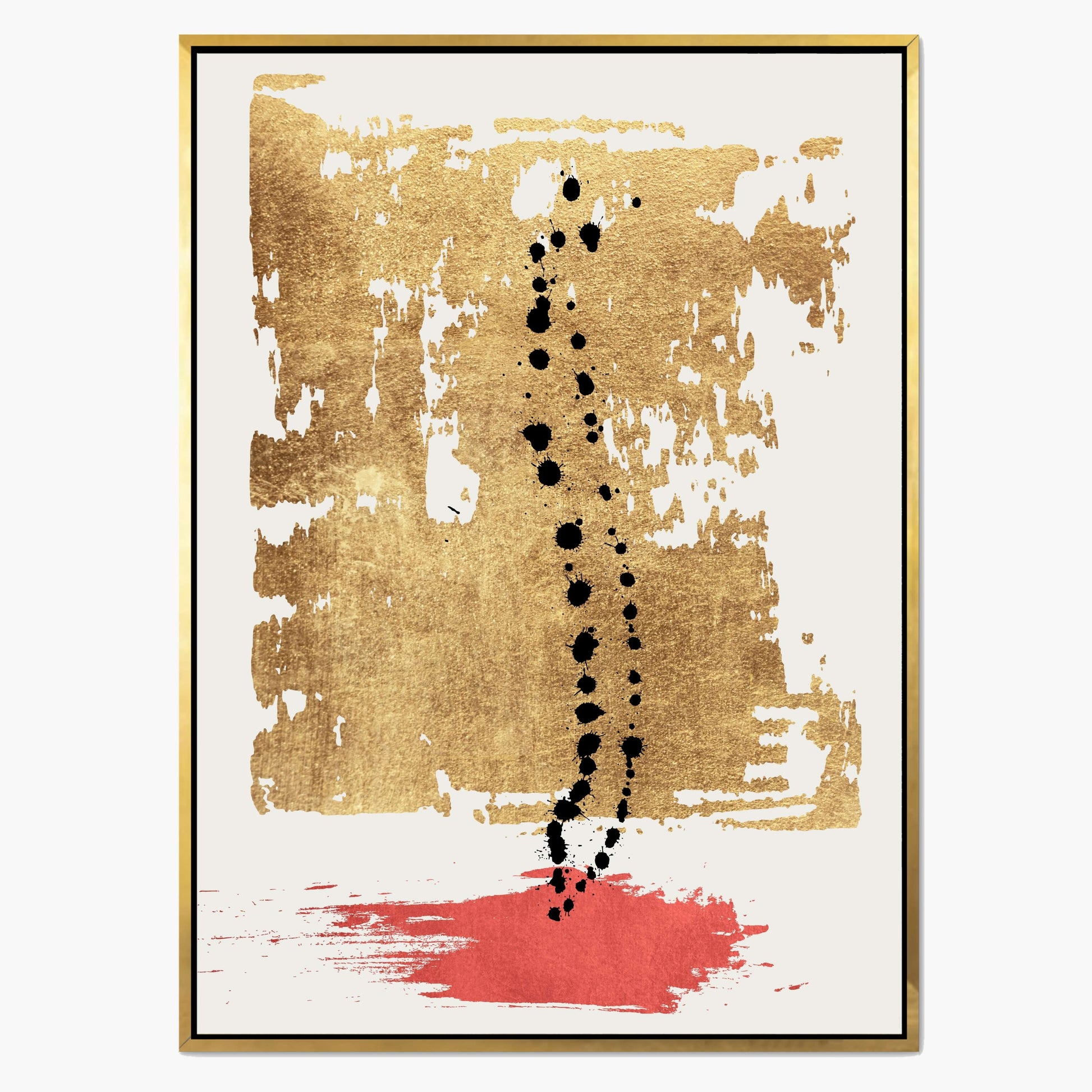 DRIP DROP is a bold modern abstract art print that features dramatic black ink splatters cascading over a rich, textured golden background. A vivid red brushstroke anchors the design, adding striking contrast and energy. This dynamic composition makes a statement in contemporary, industrial, or eclectic interiors.