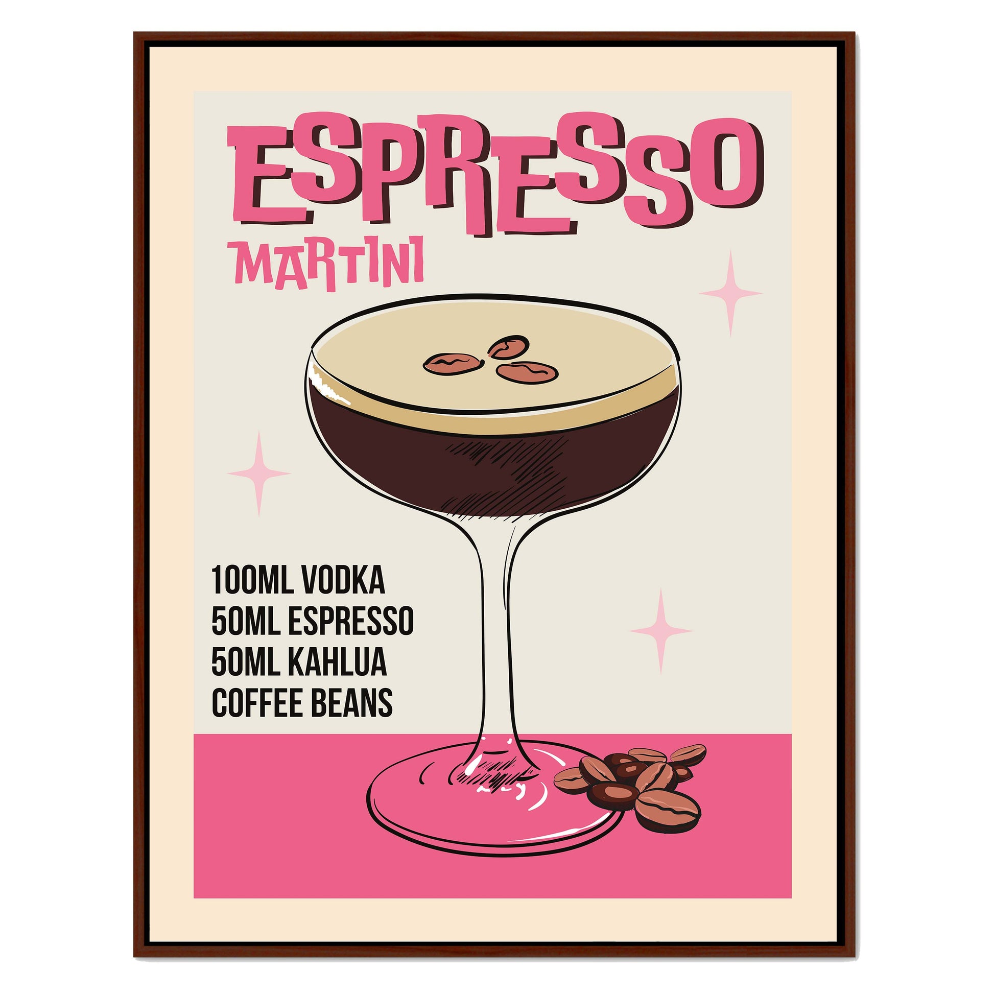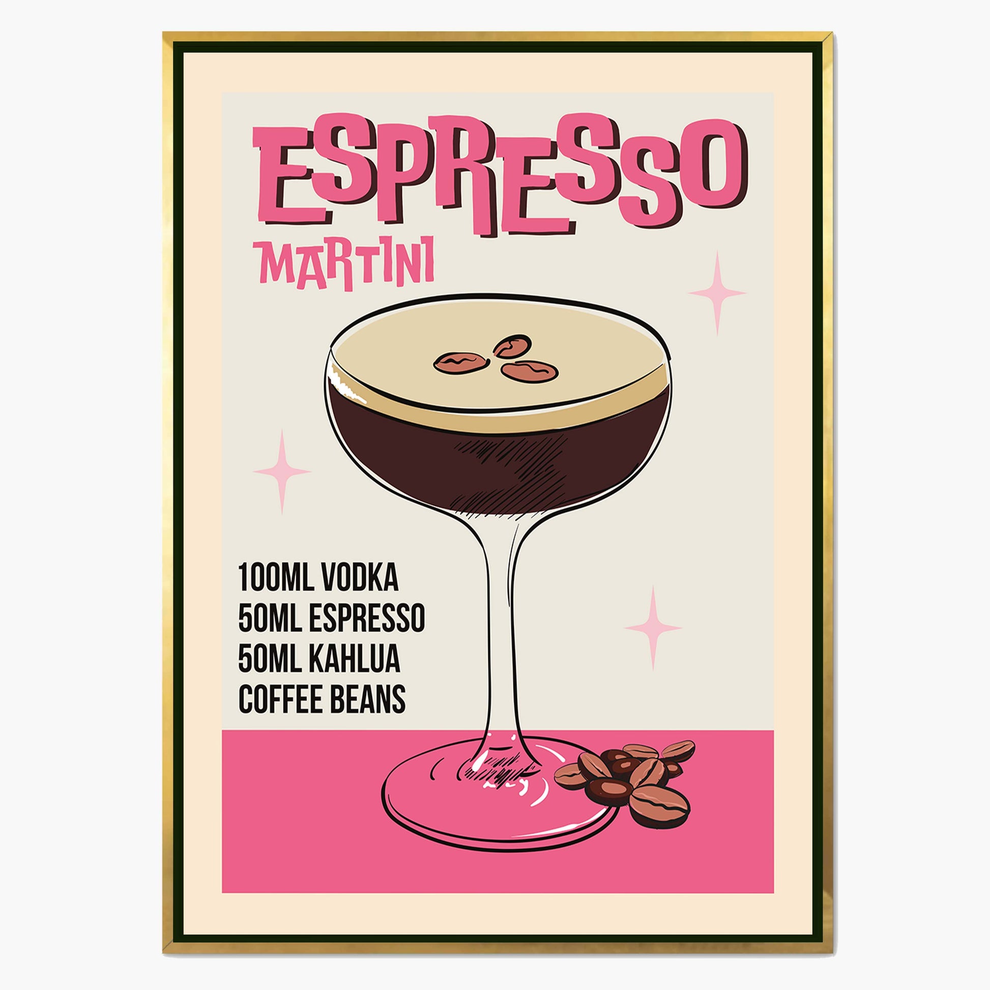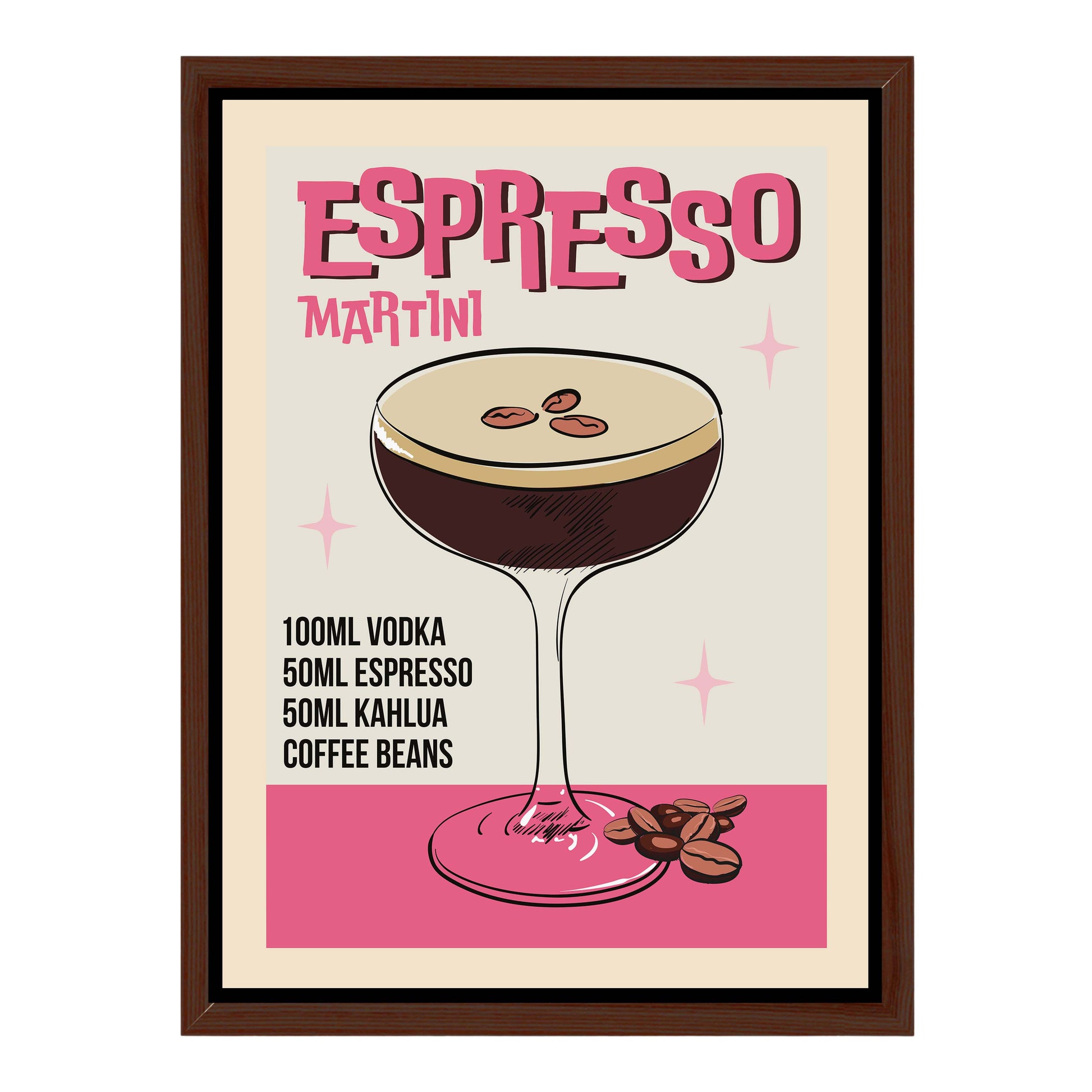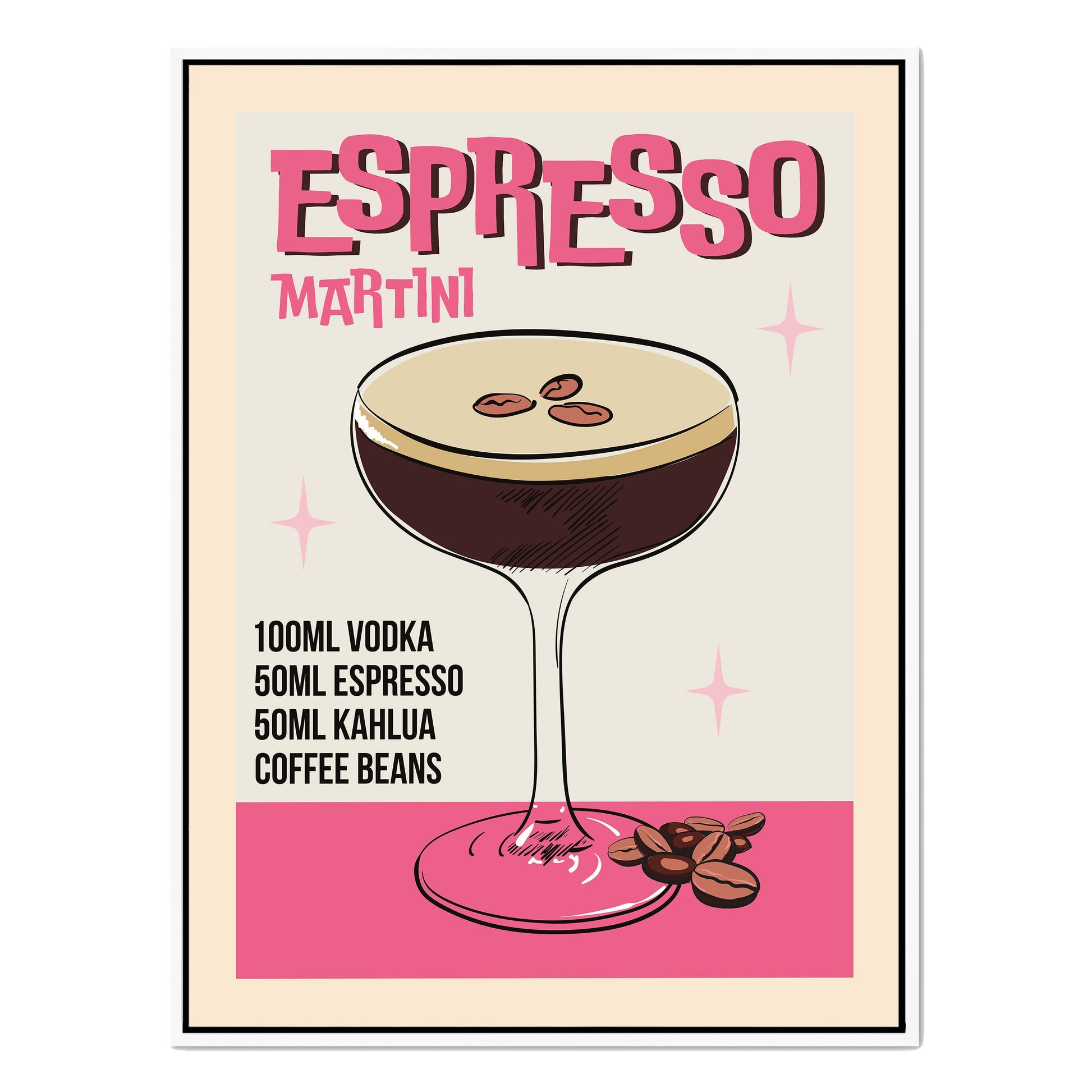 Retro-style canvas wall art featuring an illustrated ESPRESSO MARTINI recipe. A stylish vintage design perfect for coffee lovers, cocktail fans, and home bar decor.