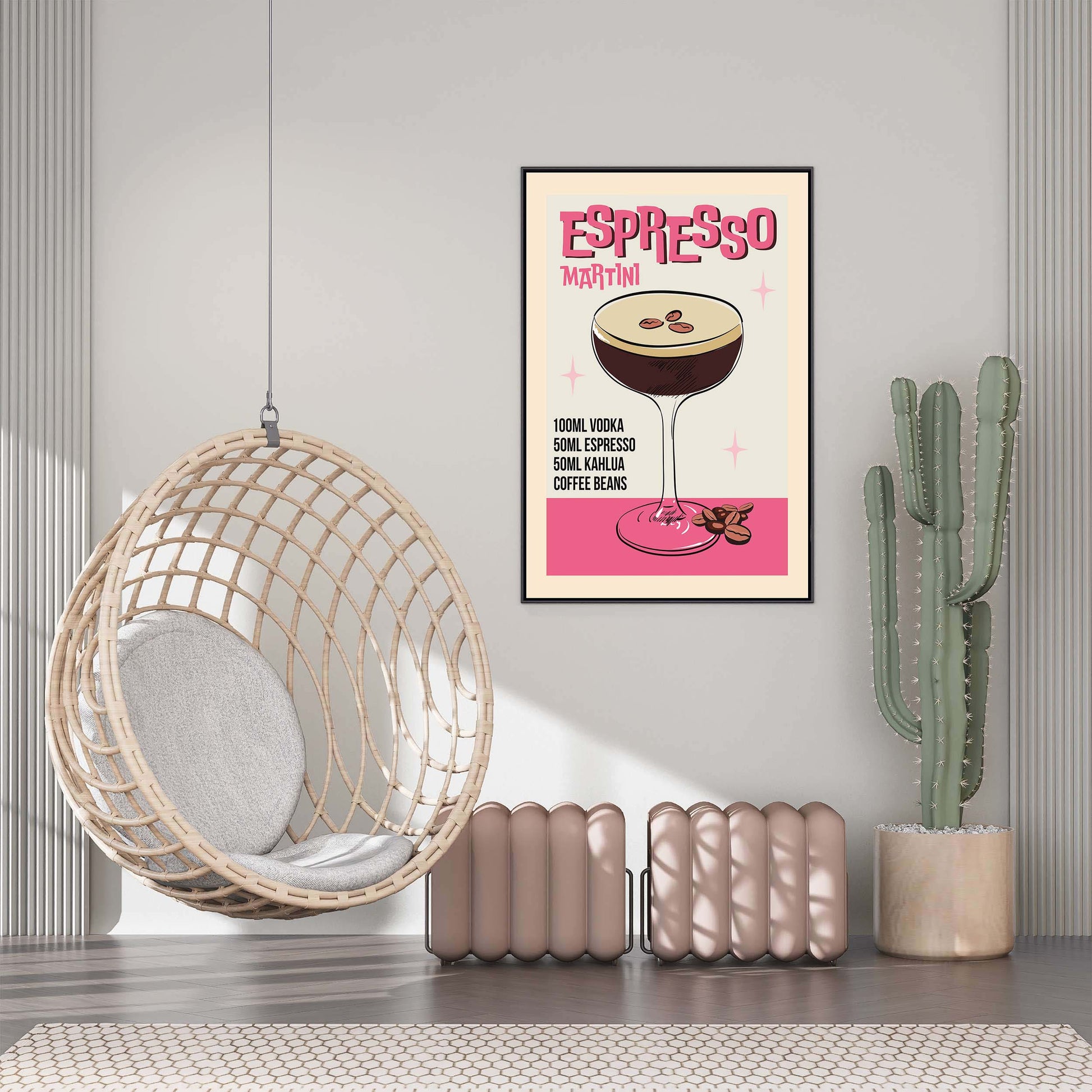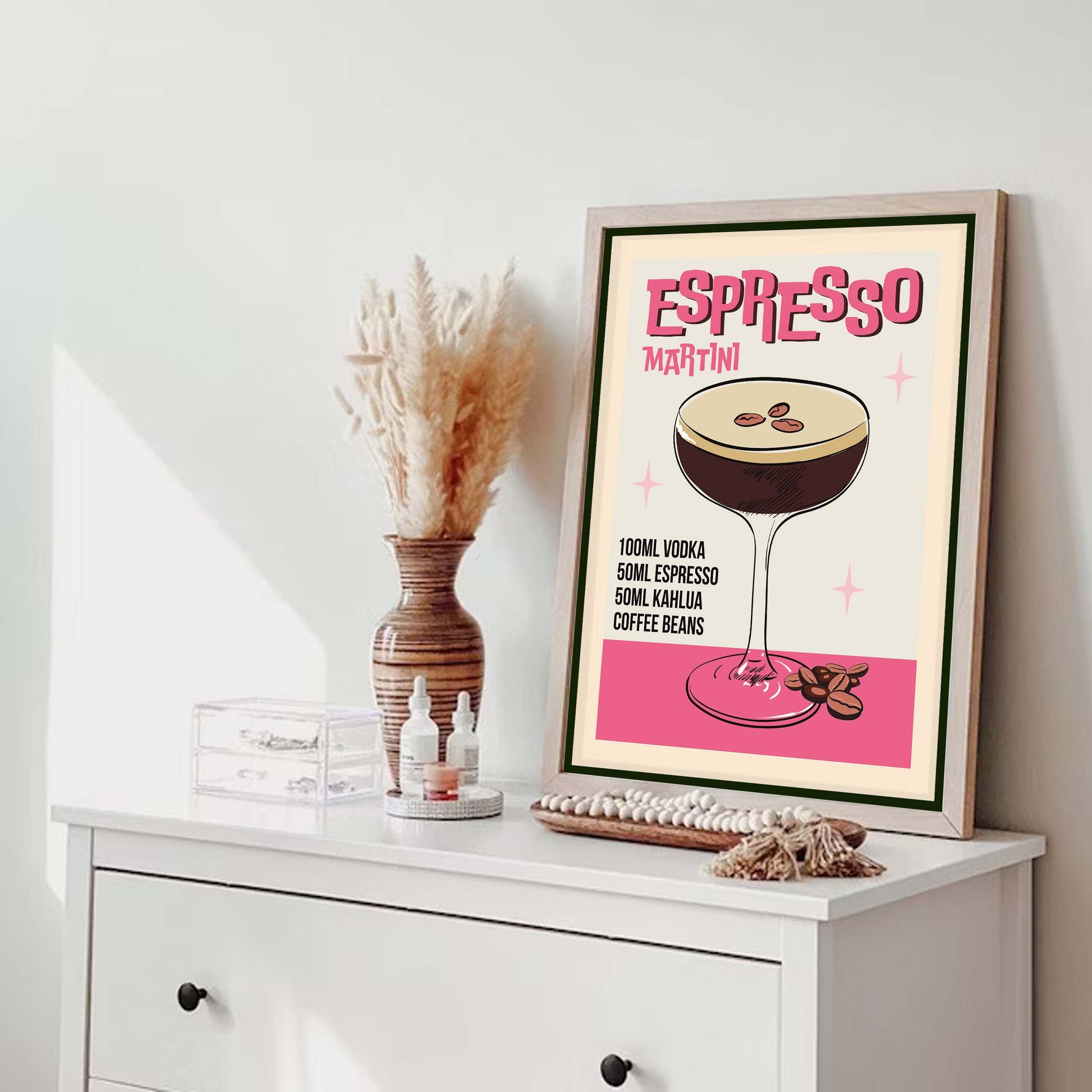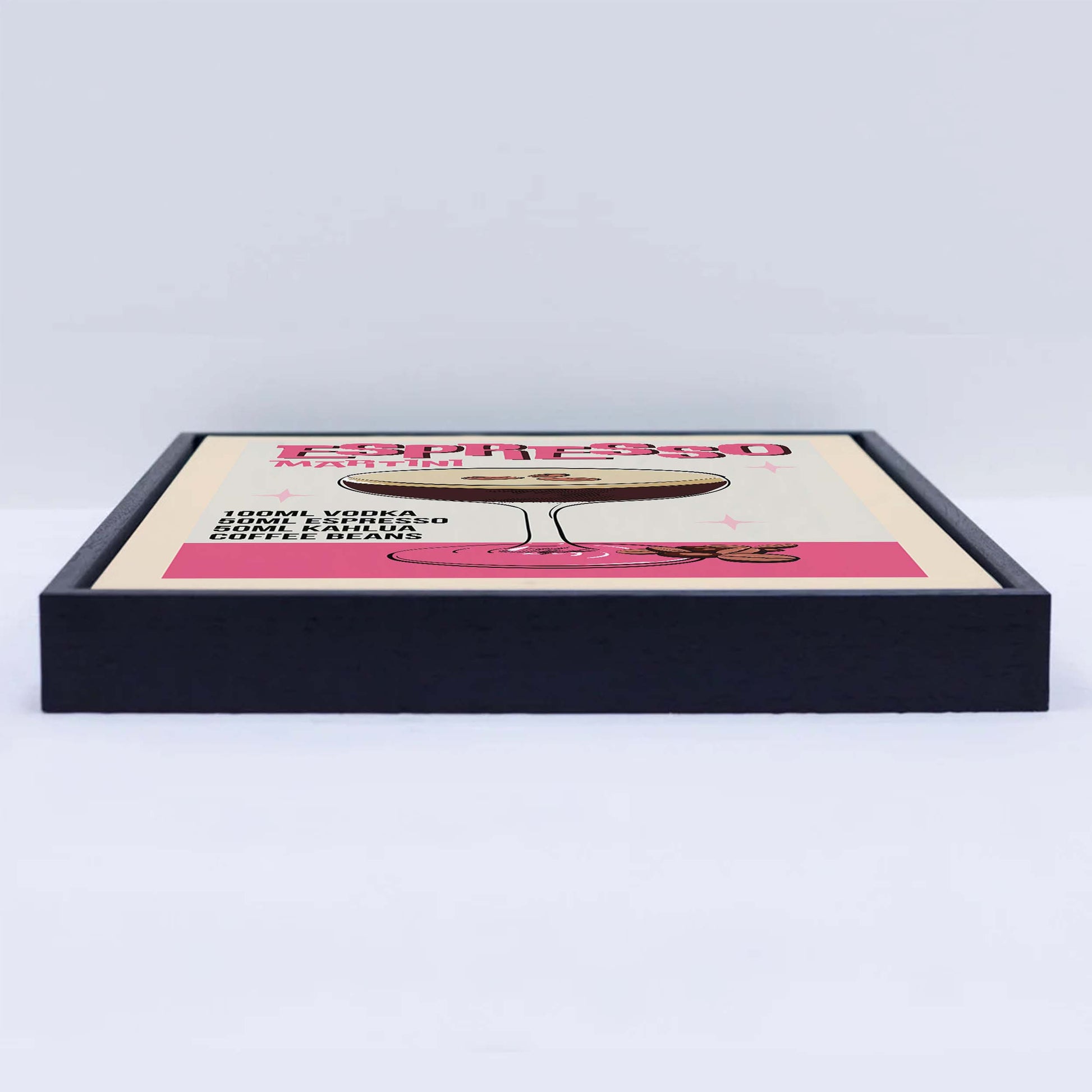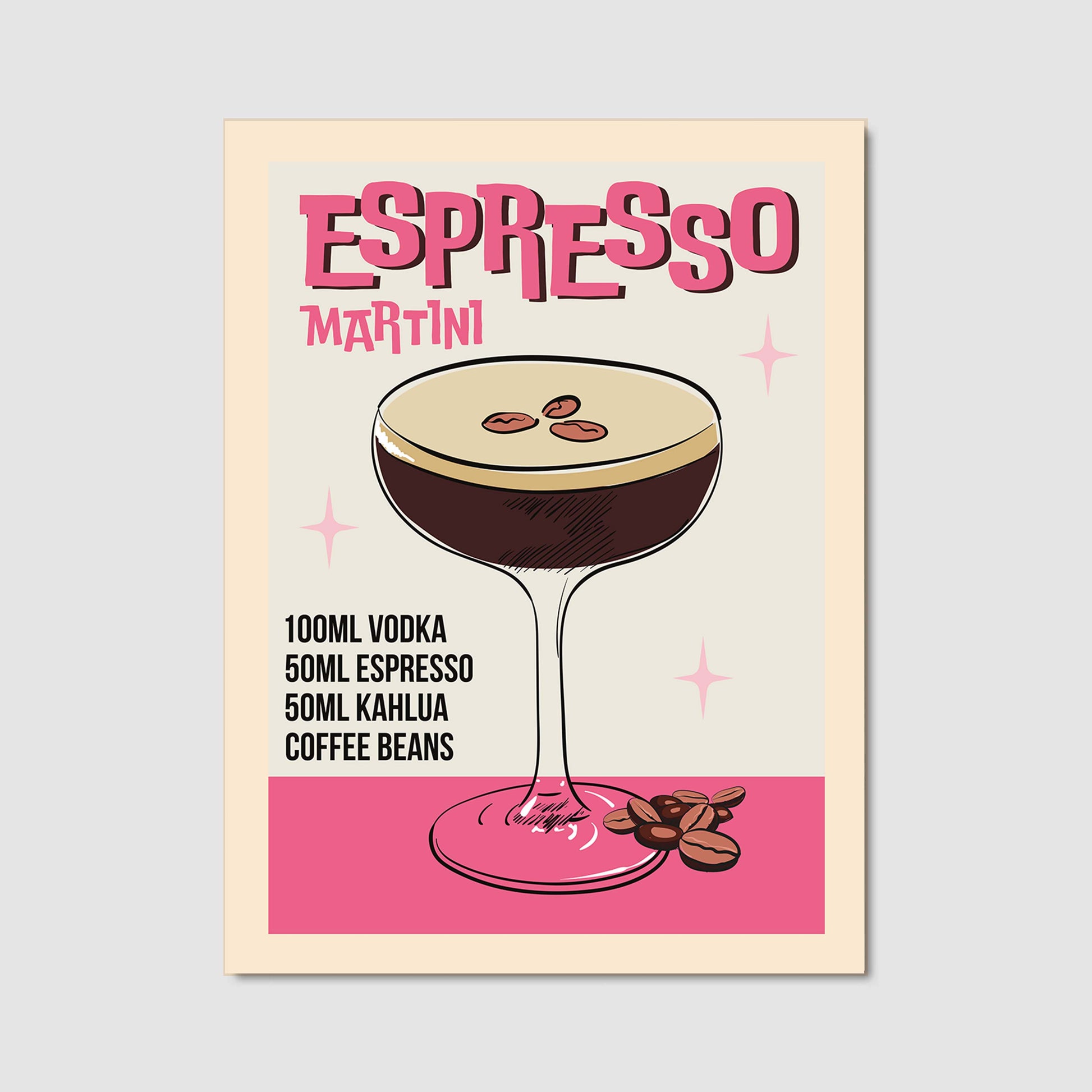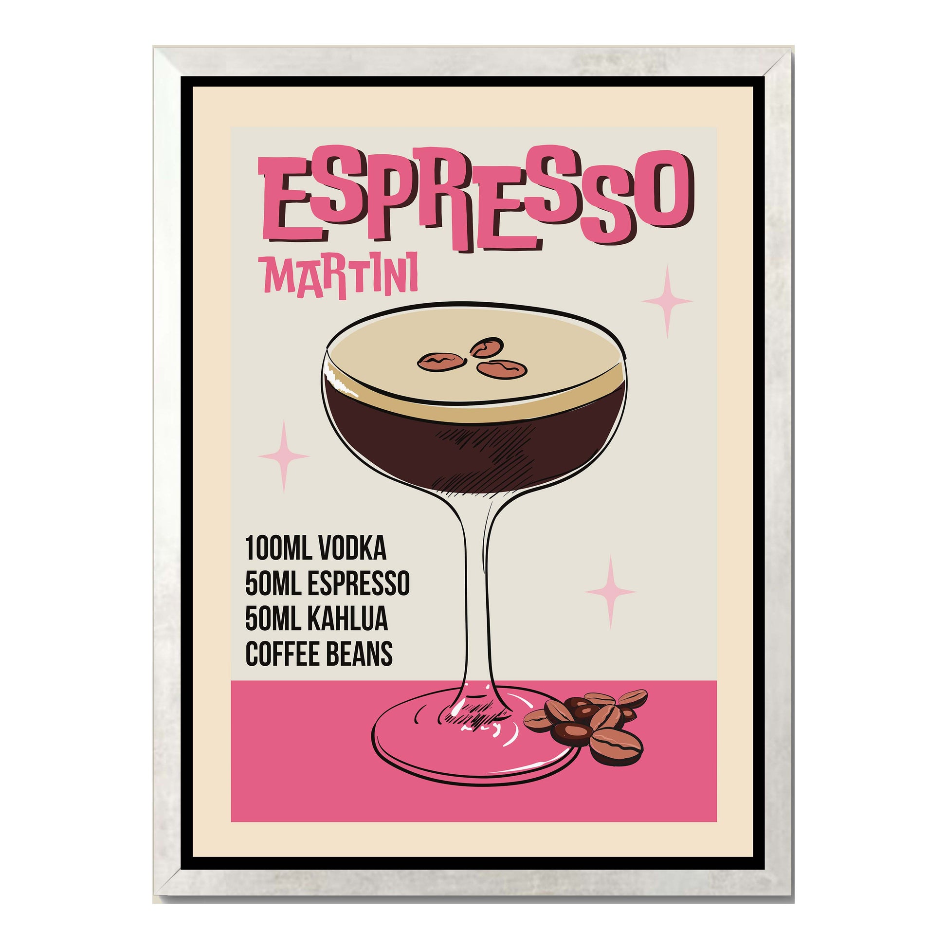 Retro-style canvas wall art featuring an illustrated ESPRESSO MARTINI recipe. A stylish vintage design perfect for coffee lovers, cocktail fans, and home bar decor.