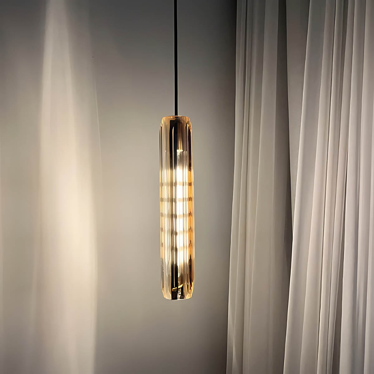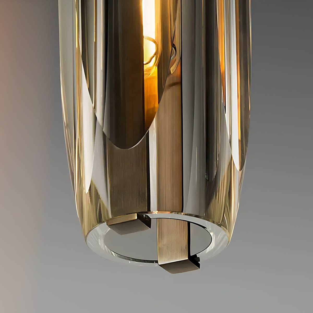 A tall, faceted crystal sleeve surrounds the light source to amplify sparkle and cast a warm, luminous glow, while the slim copper hardware adds sophisticated contrast.