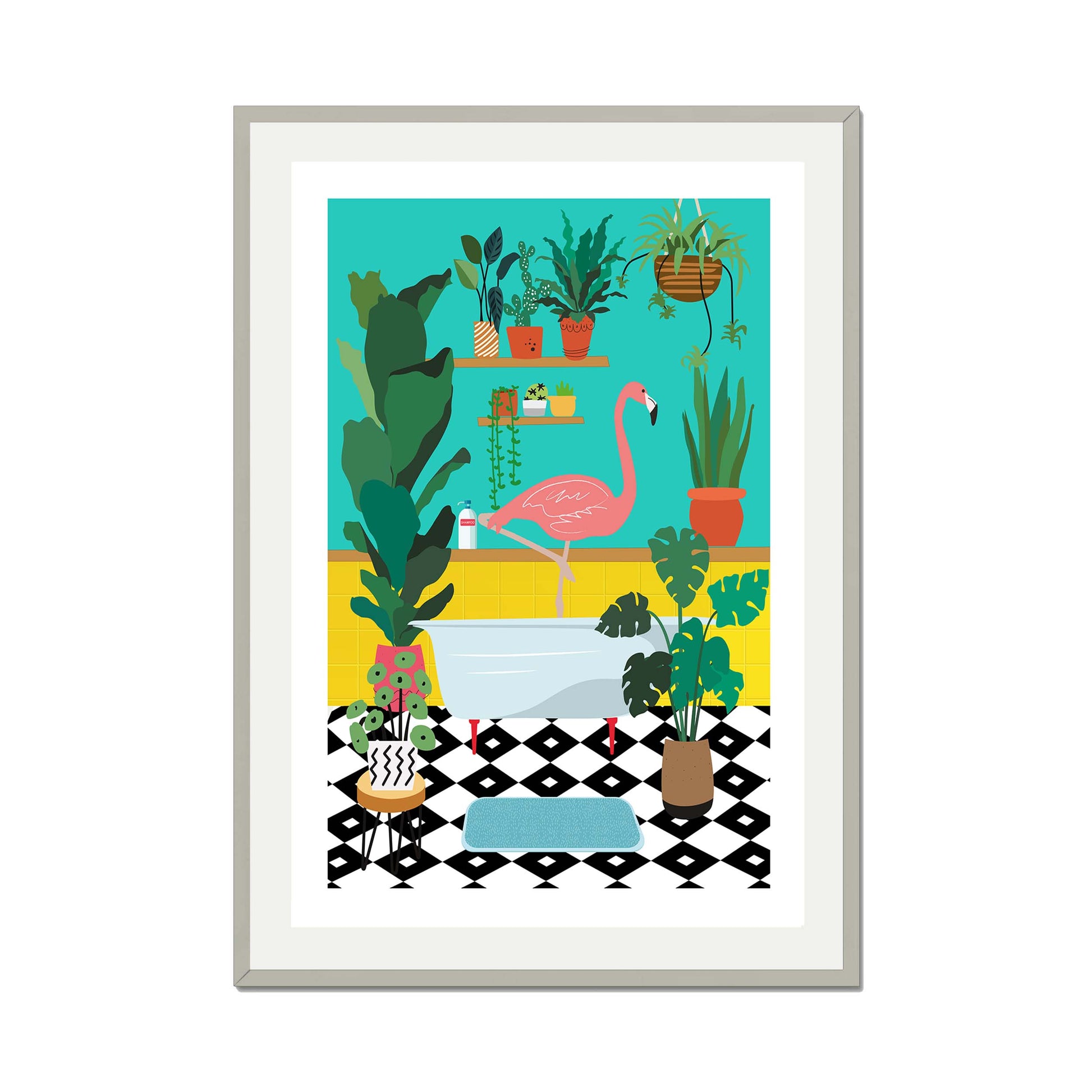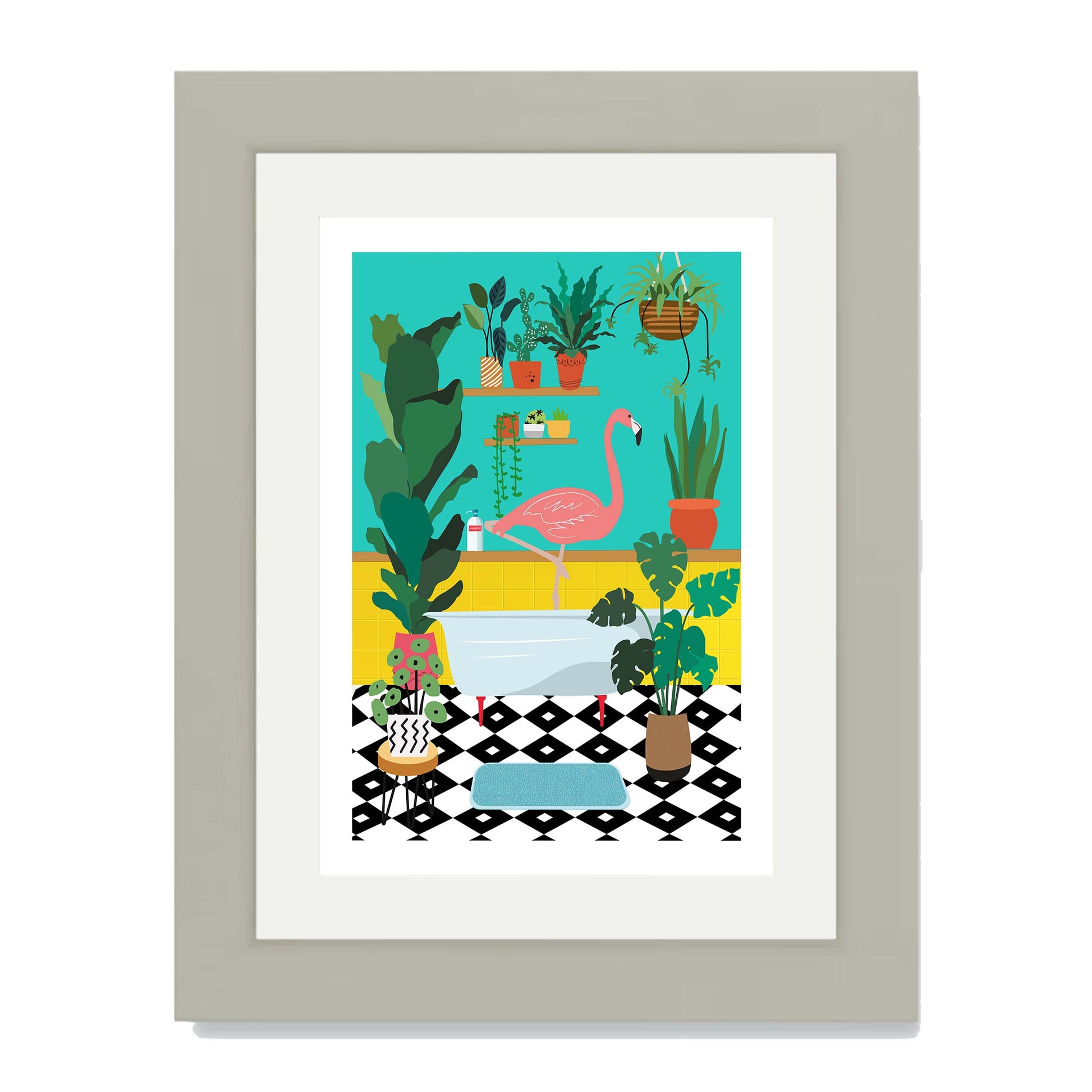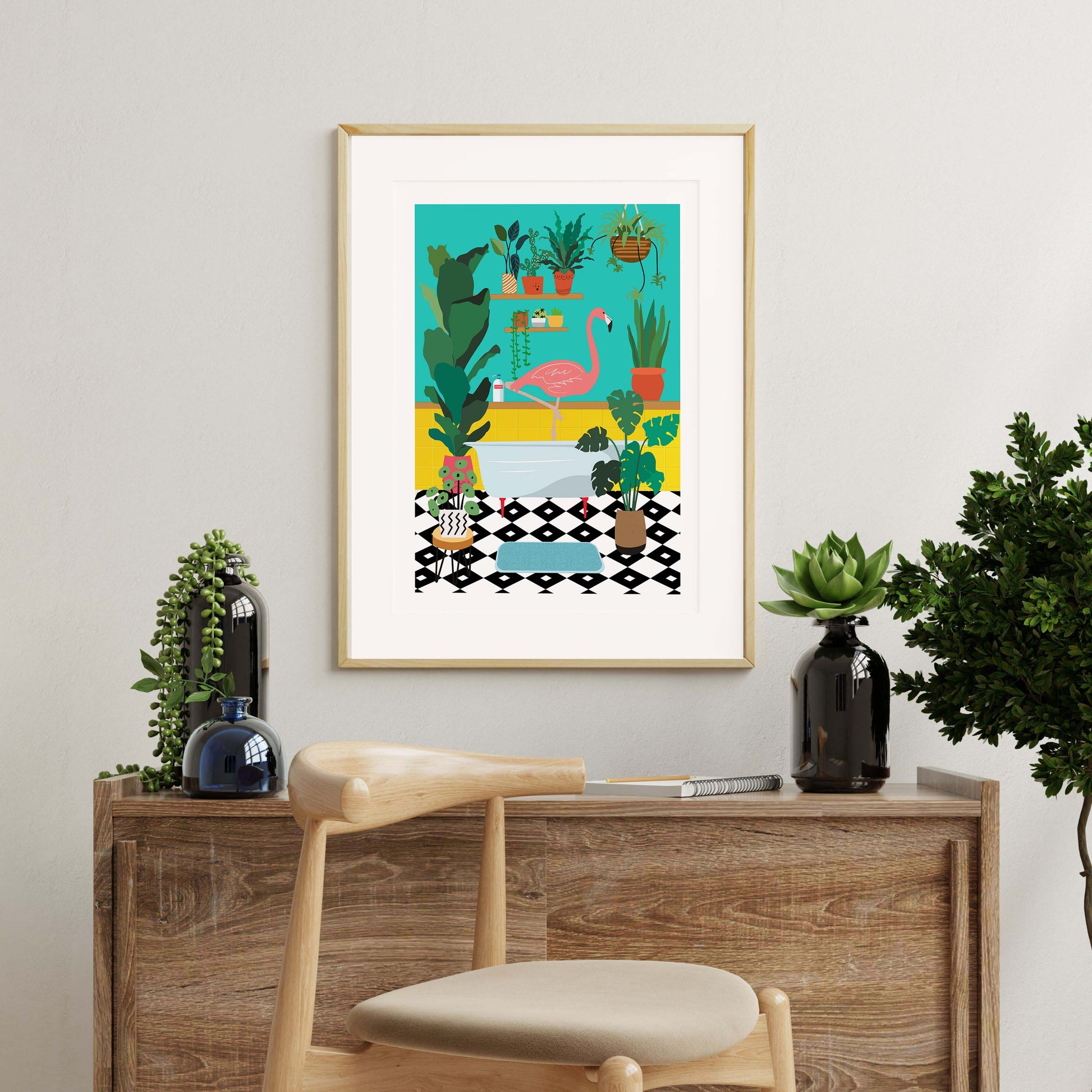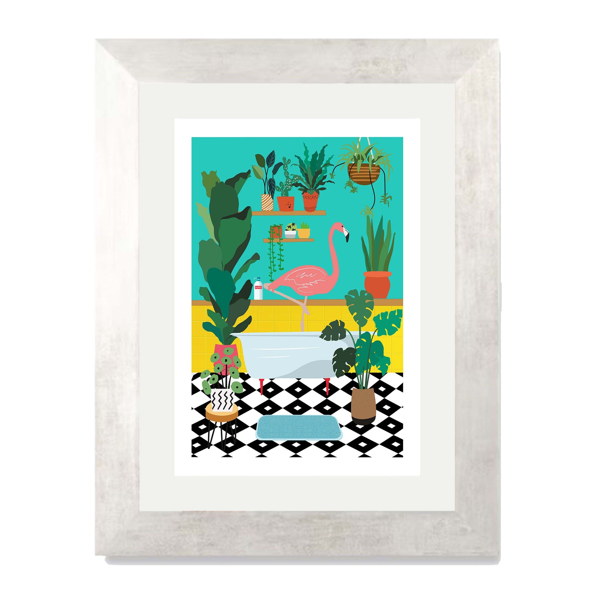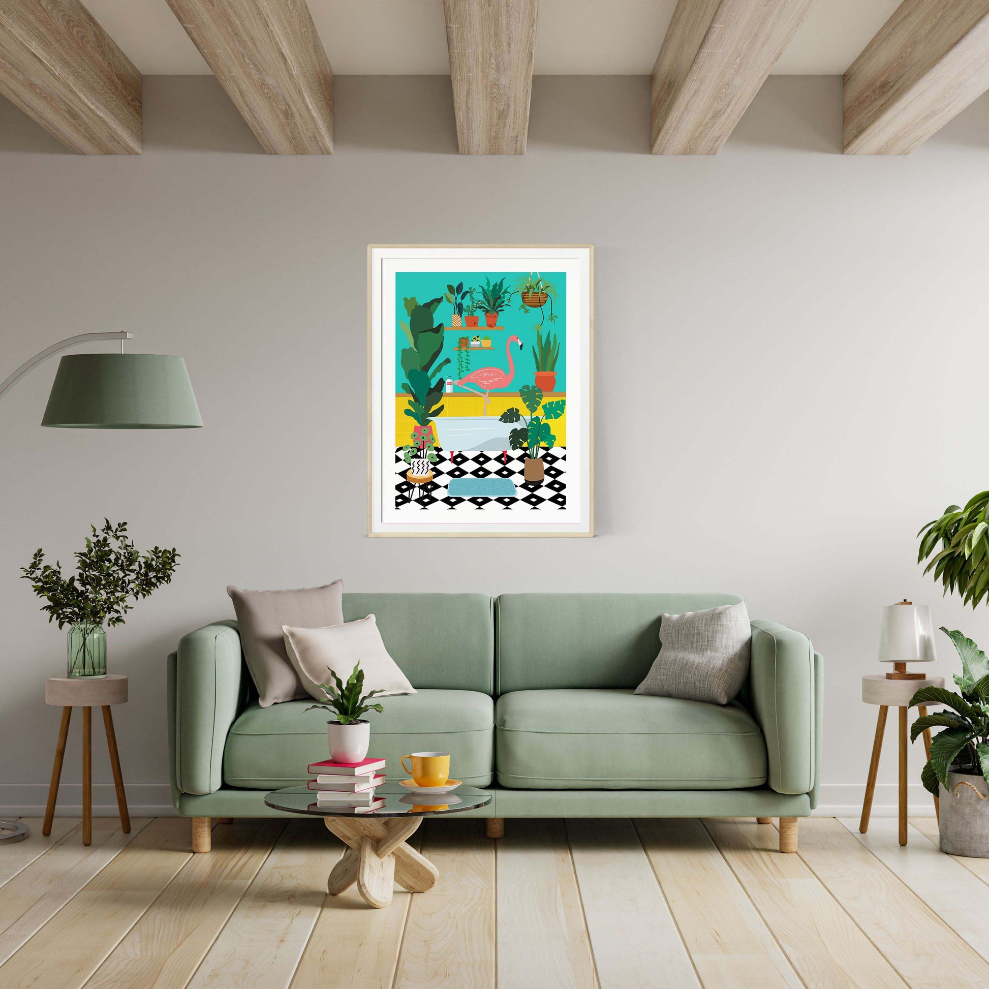 Brighten your space with this whimsical canvas print of a flamingo relaxing in a bathtub surrounded by lush houseplants. Perfect for quirky, plant-filled interiors.