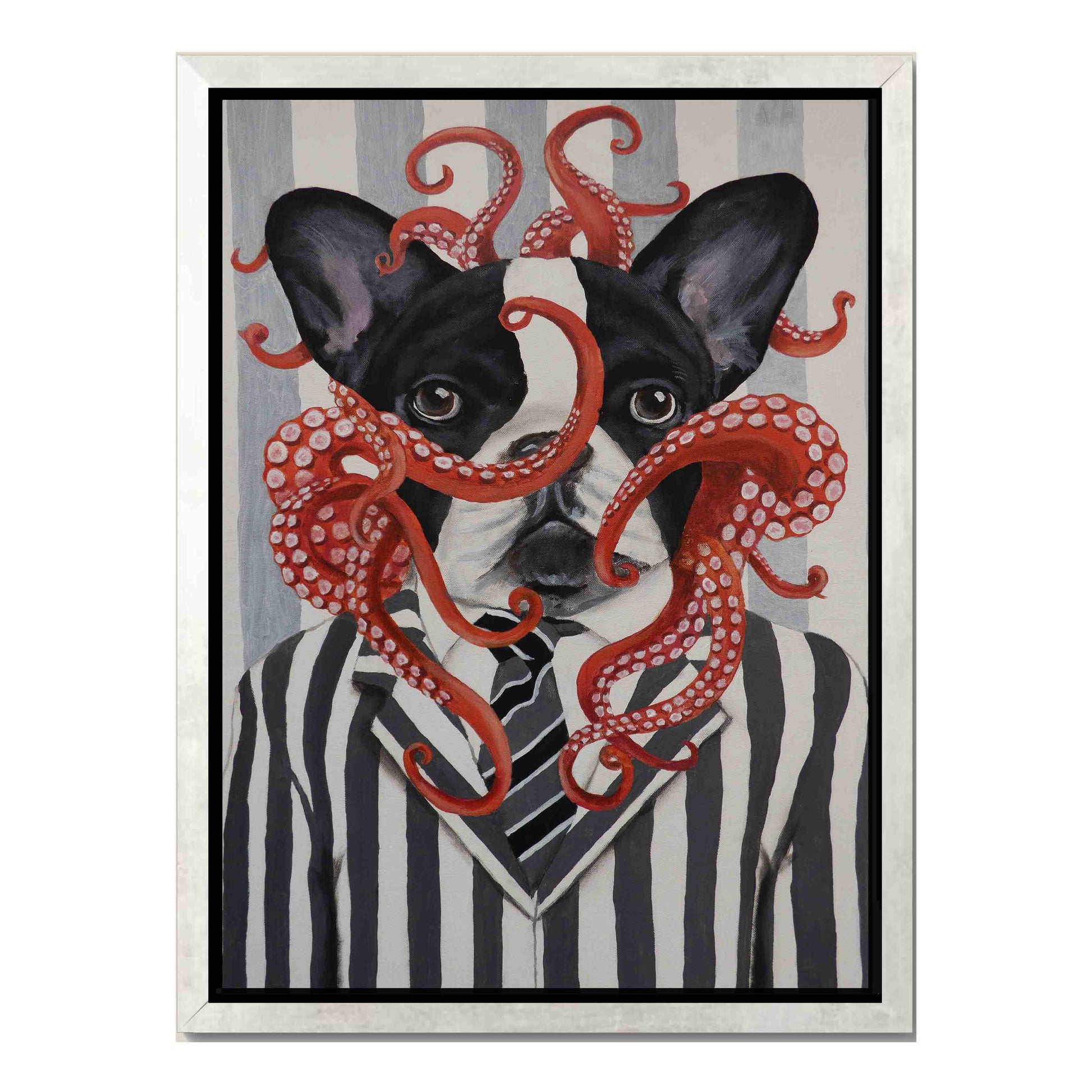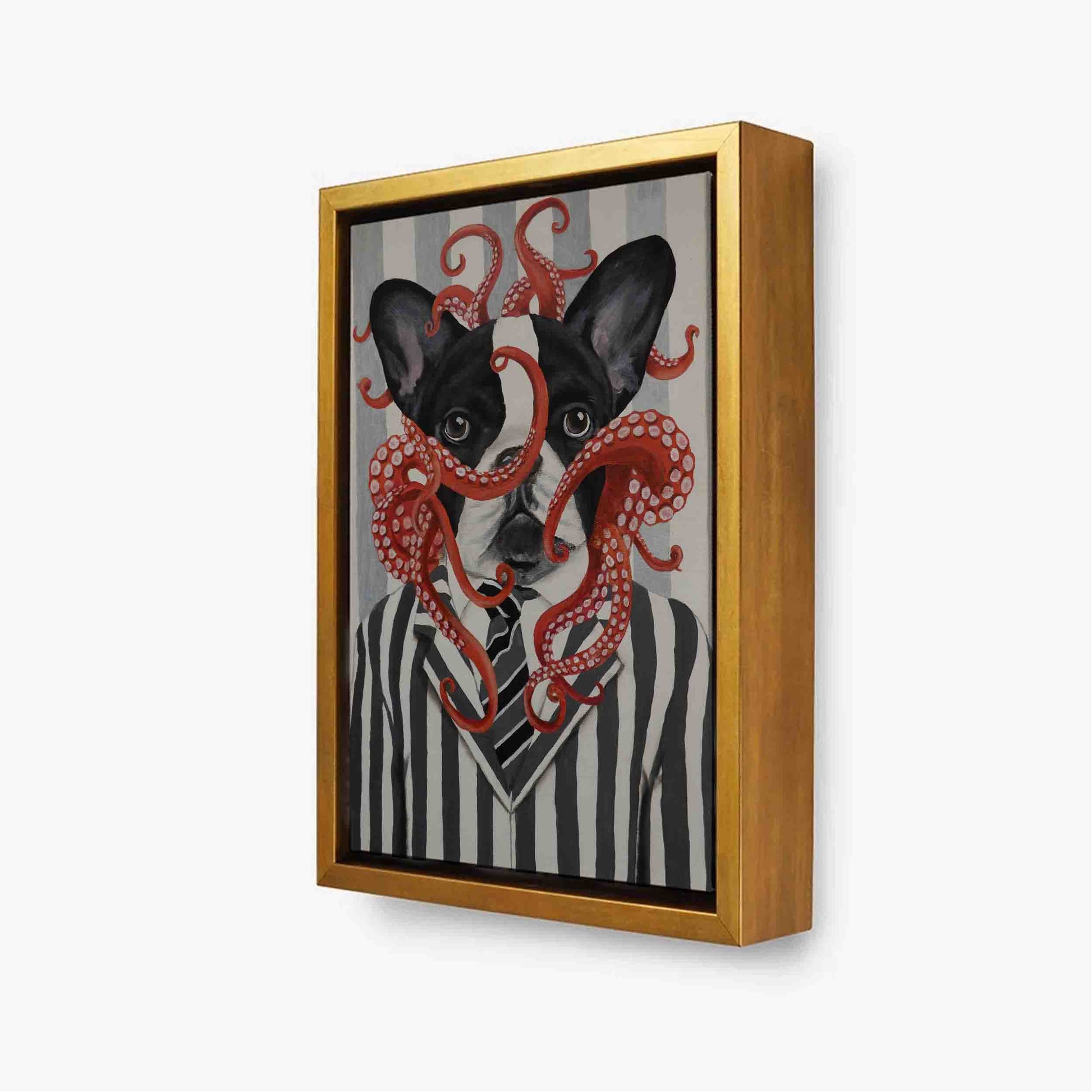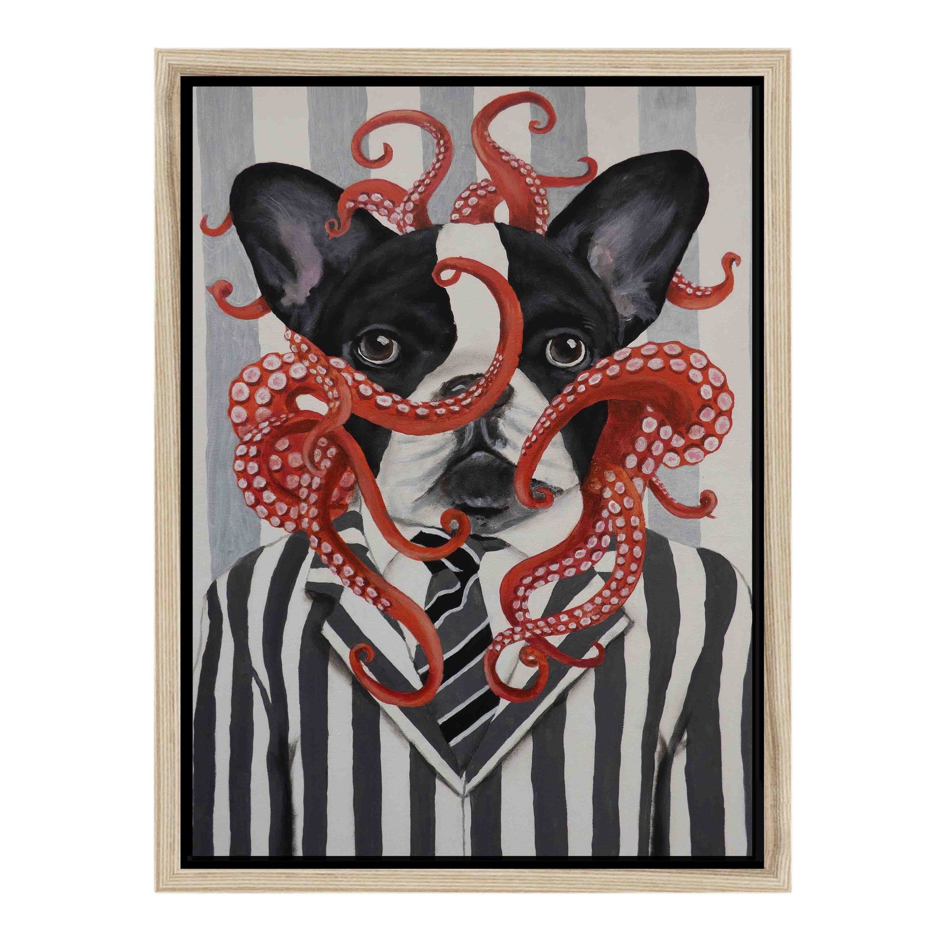 Whimsical canvas print of a French bulldog in a pinstripe suit with an octopus wrapped around its head. A surreal, humorous artwork perfect for dog lovers and quirky home decor.