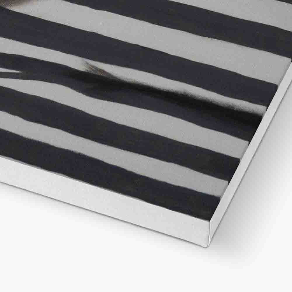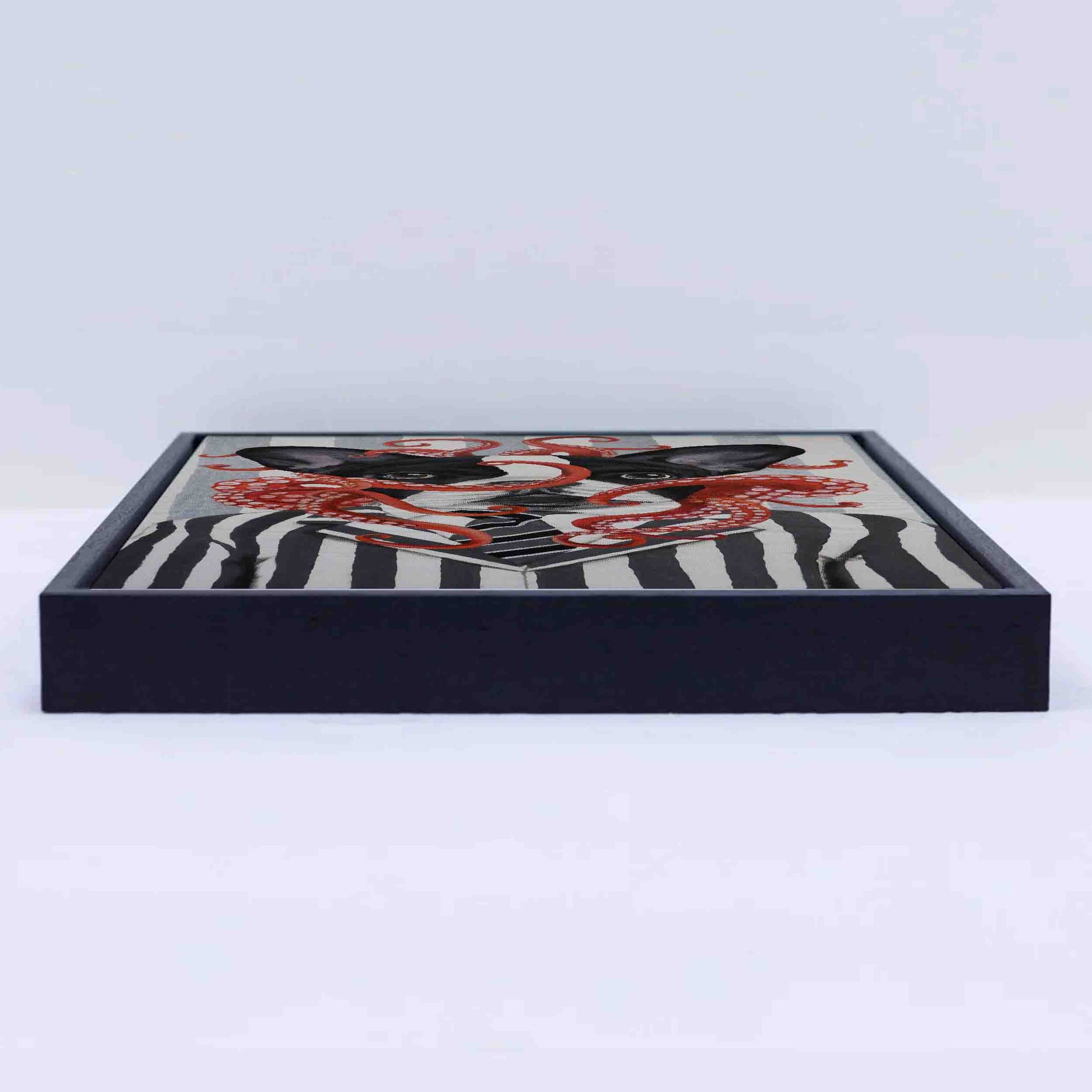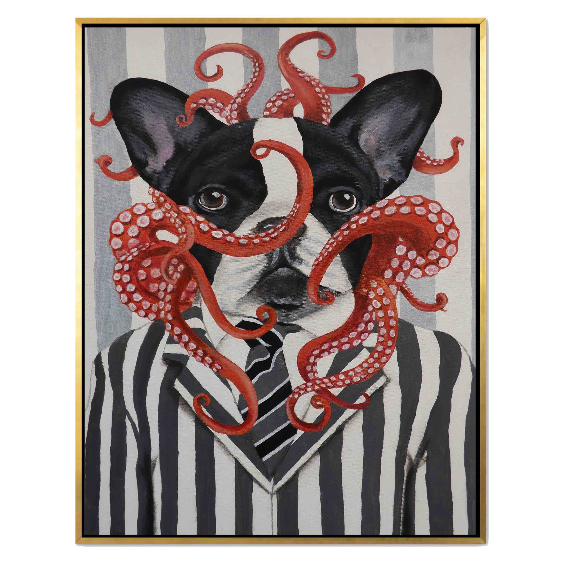 Whimsical canvas print of a French bulldog in a pinstripe suit with an octopus wrapped around its head. A surreal, humorous artwork perfect for dog lovers and quirky home decor.