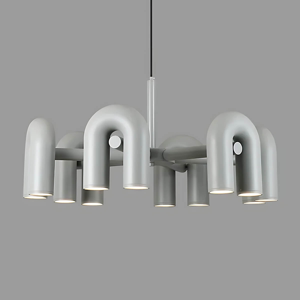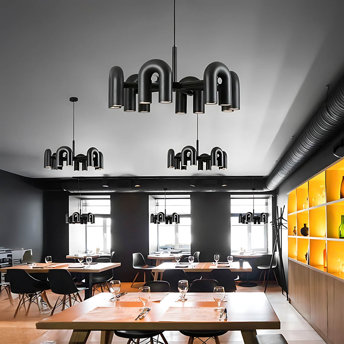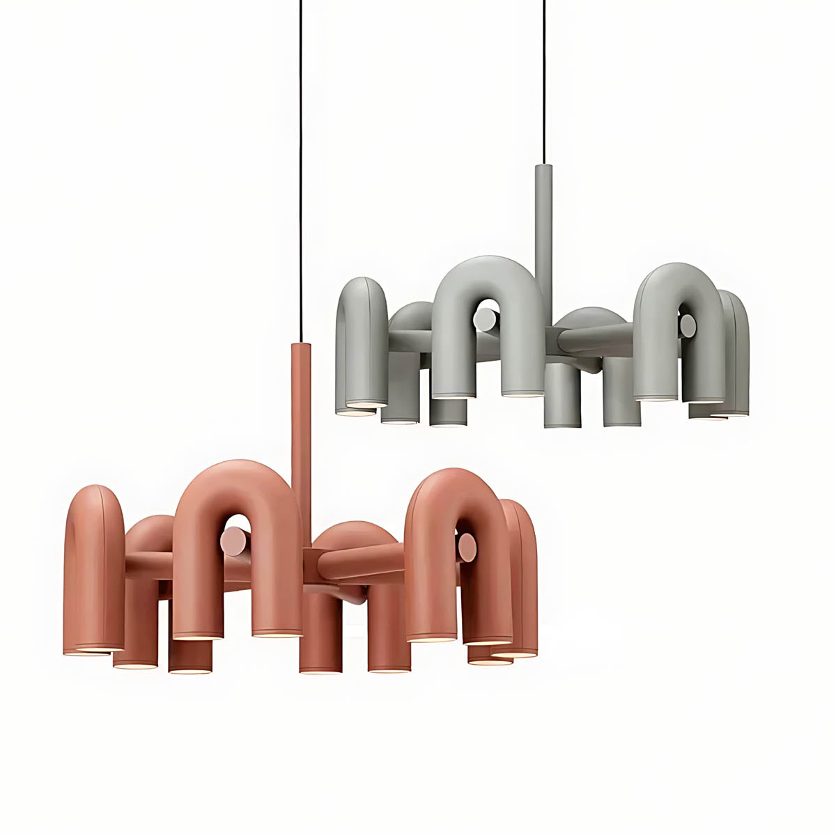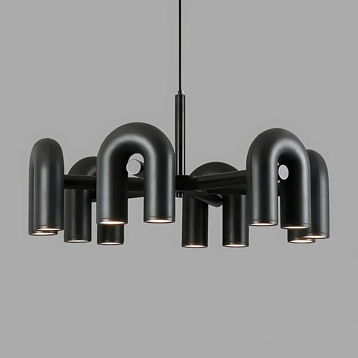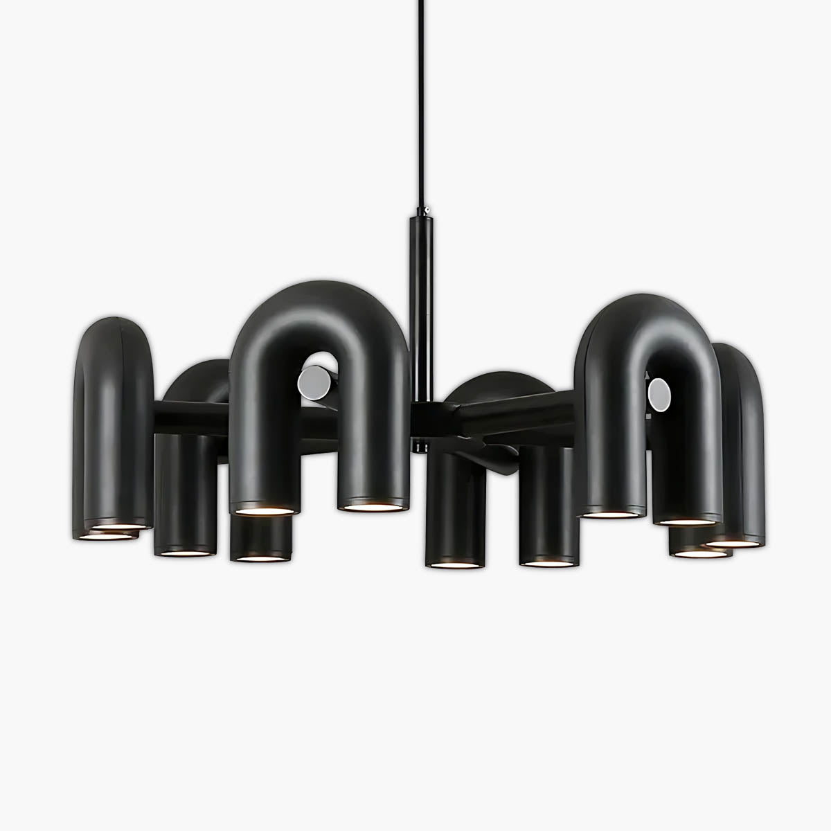 Crafted from durable Iron and Resin, the collection features distinctive U-shaped shades that evoke a playful, post-modern aesthetic, available as a statement chandelier, a sleek linear chandelier, or a complementary wall lamp.