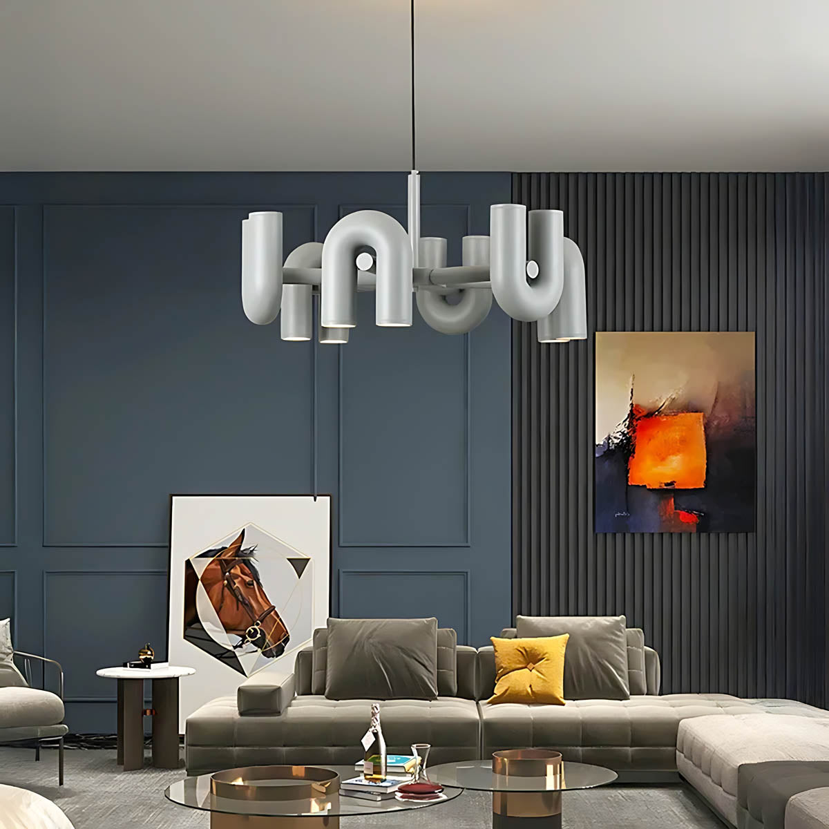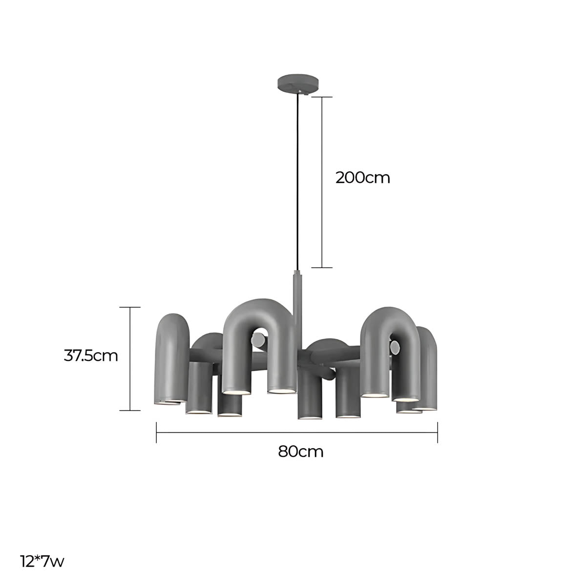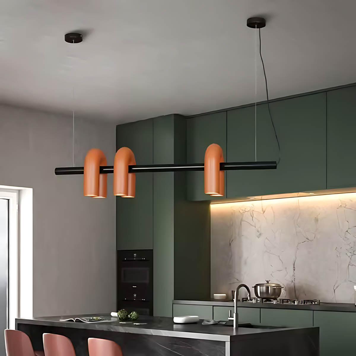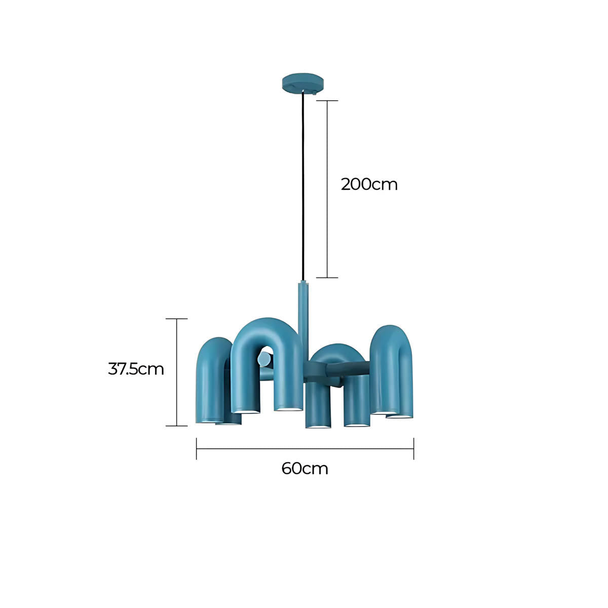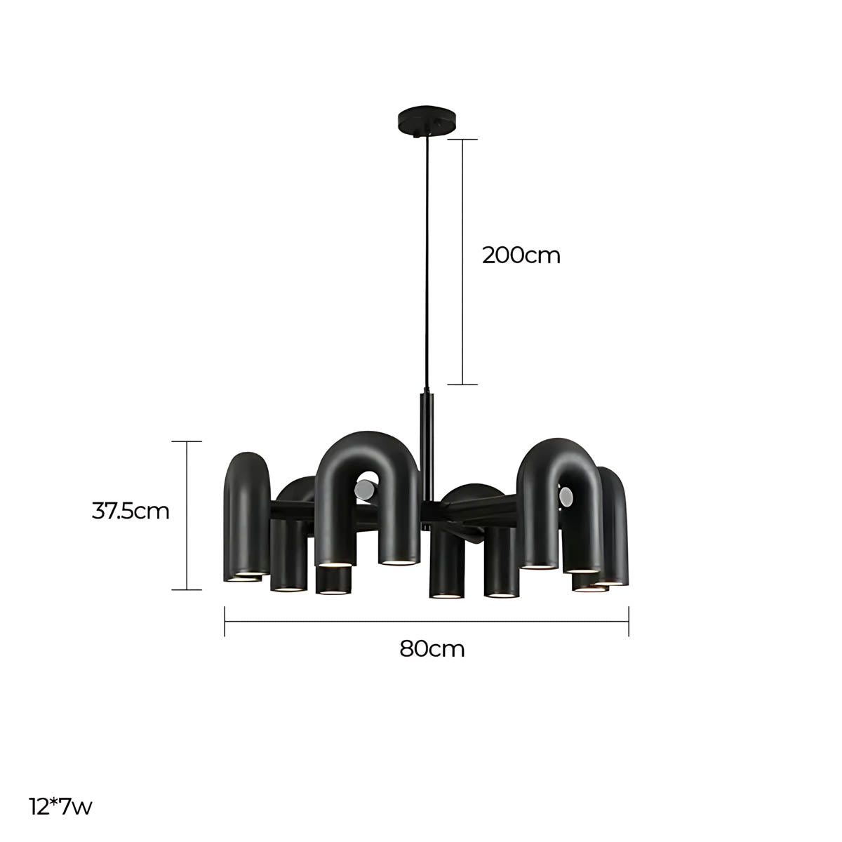 Crafted from durable Iron and Resin, the collection features distinctive U-shaped shades that evoke a playful, post-modern aesthetic, available as a statement chandelier, a sleek linear chandelier, or a complementary wall lamp.