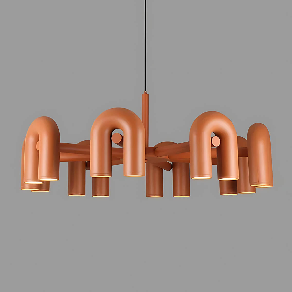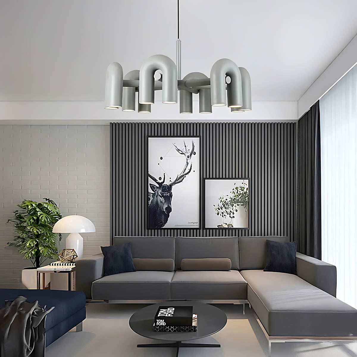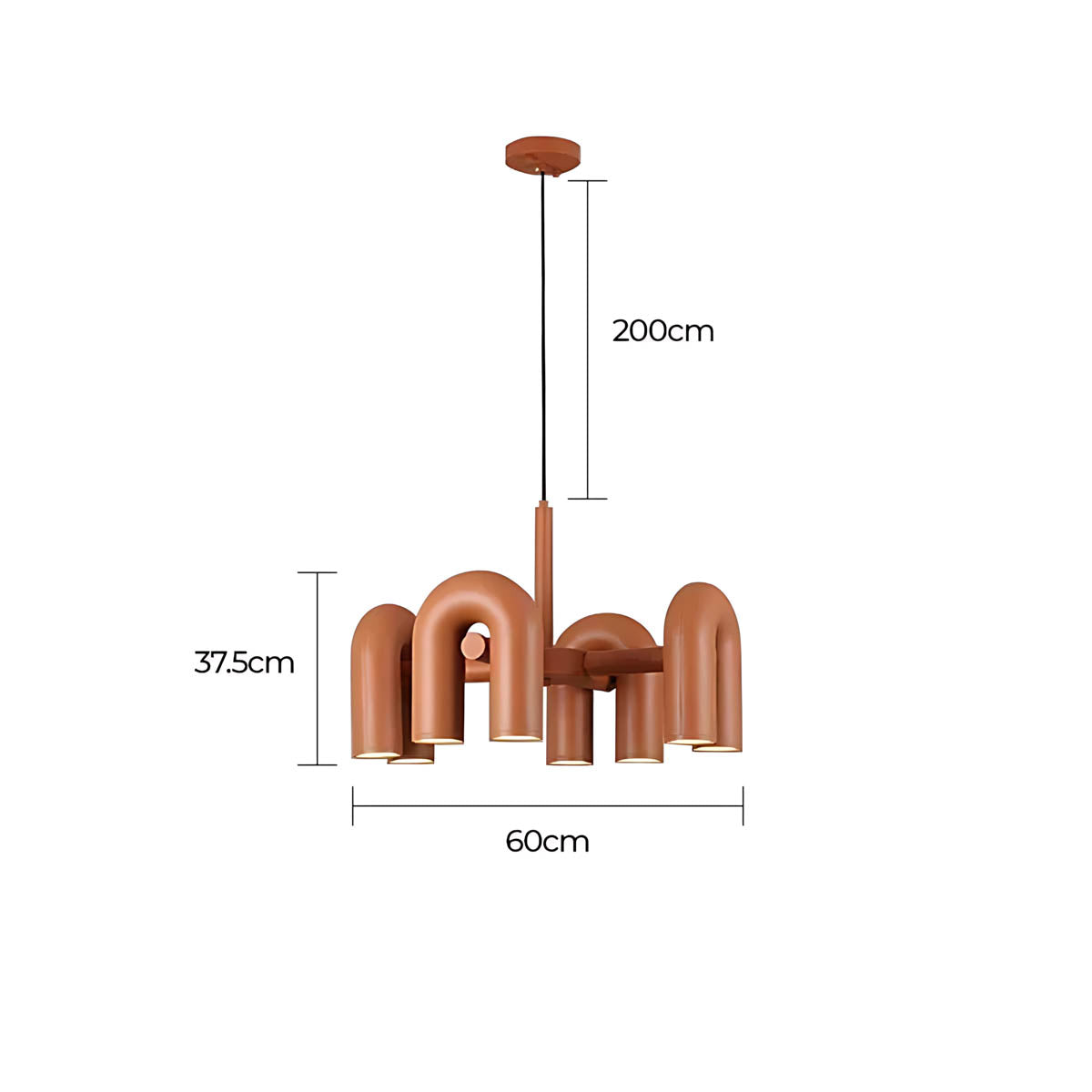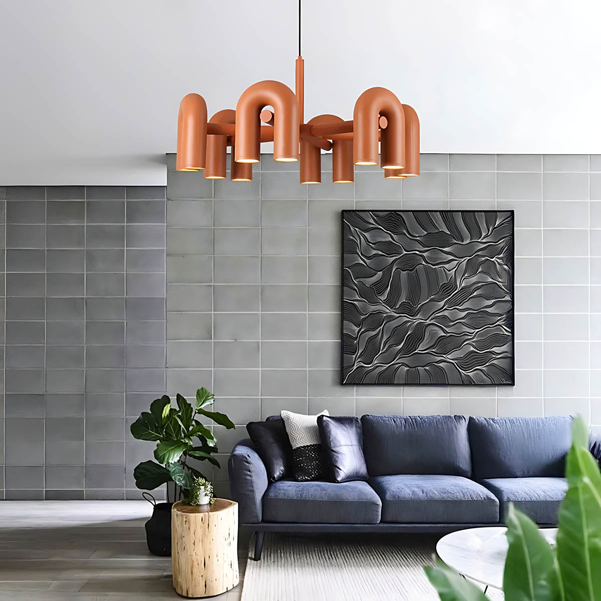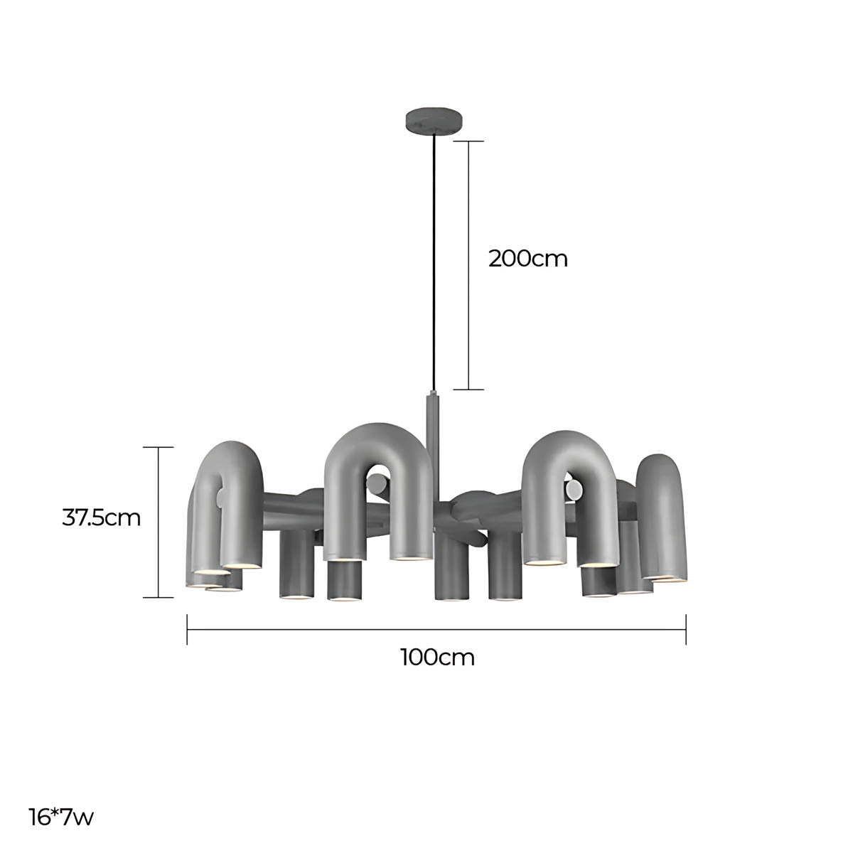 Crafted from durable Iron and Resin, the collection features distinctive U-shaped shades that evoke a playful, post-modern aesthetic, available as a statement chandelier, a sleek linear chandelier, or a complementary wall lamp.