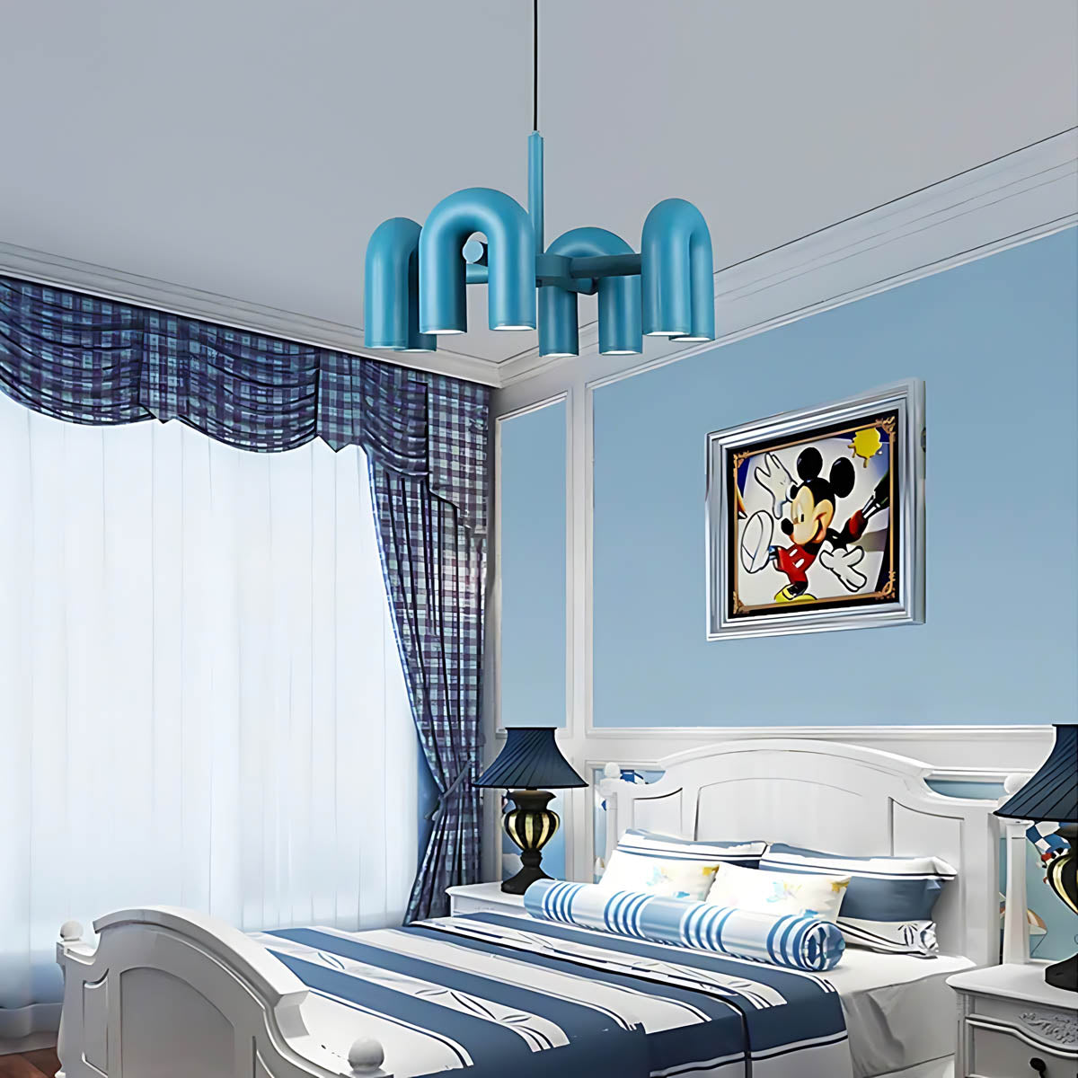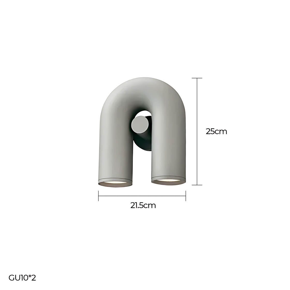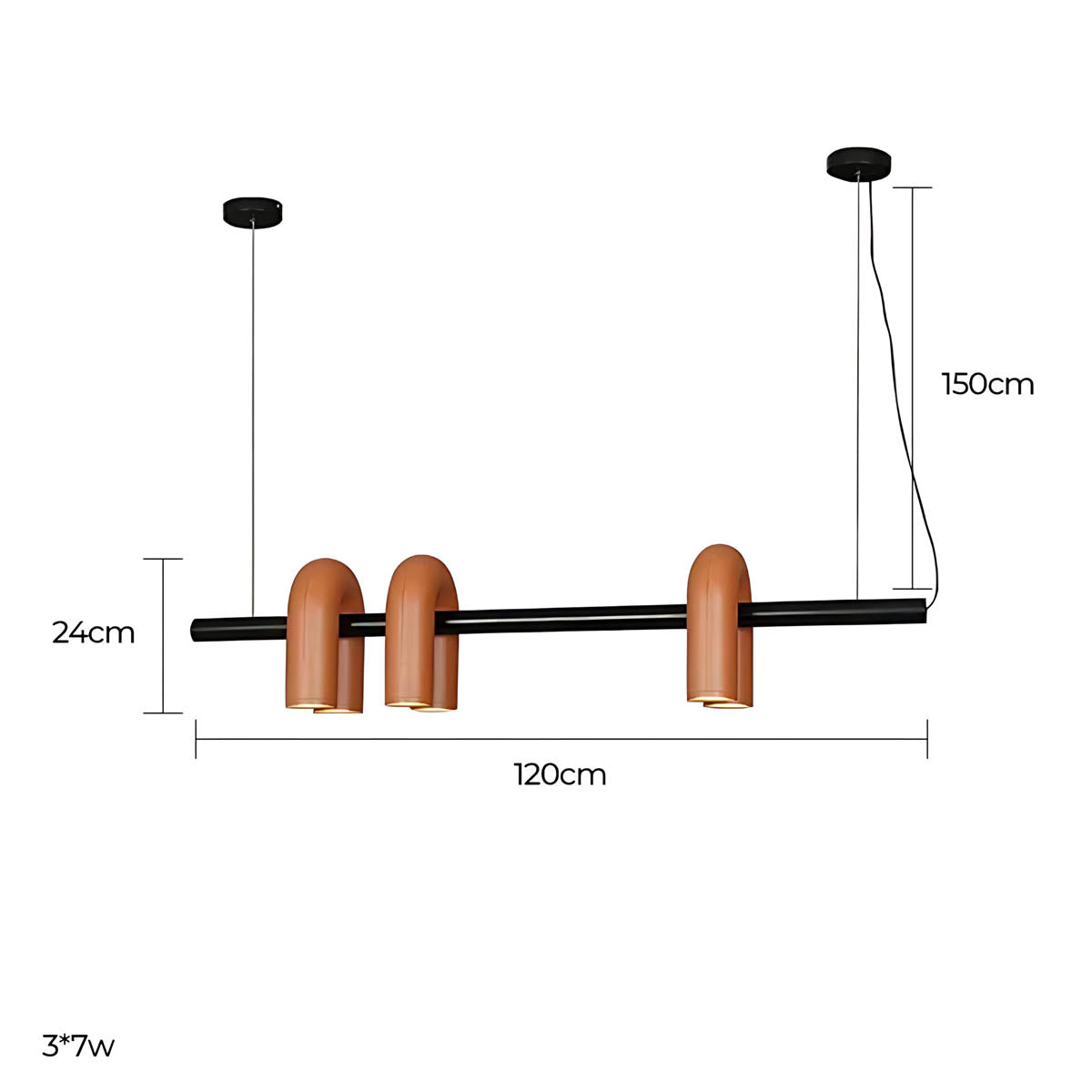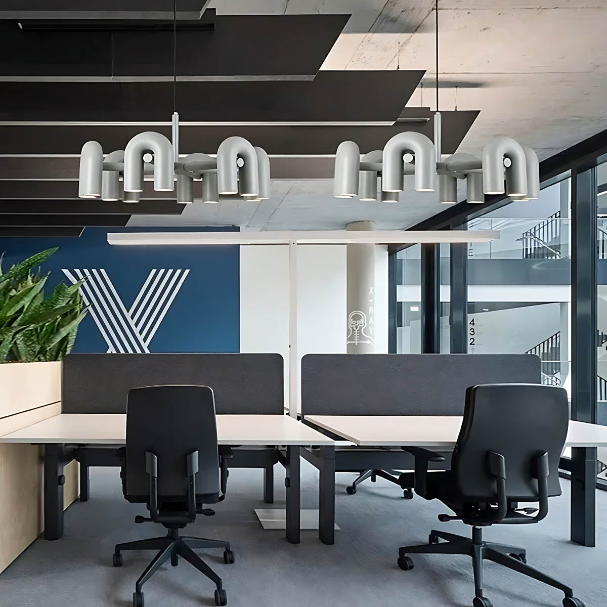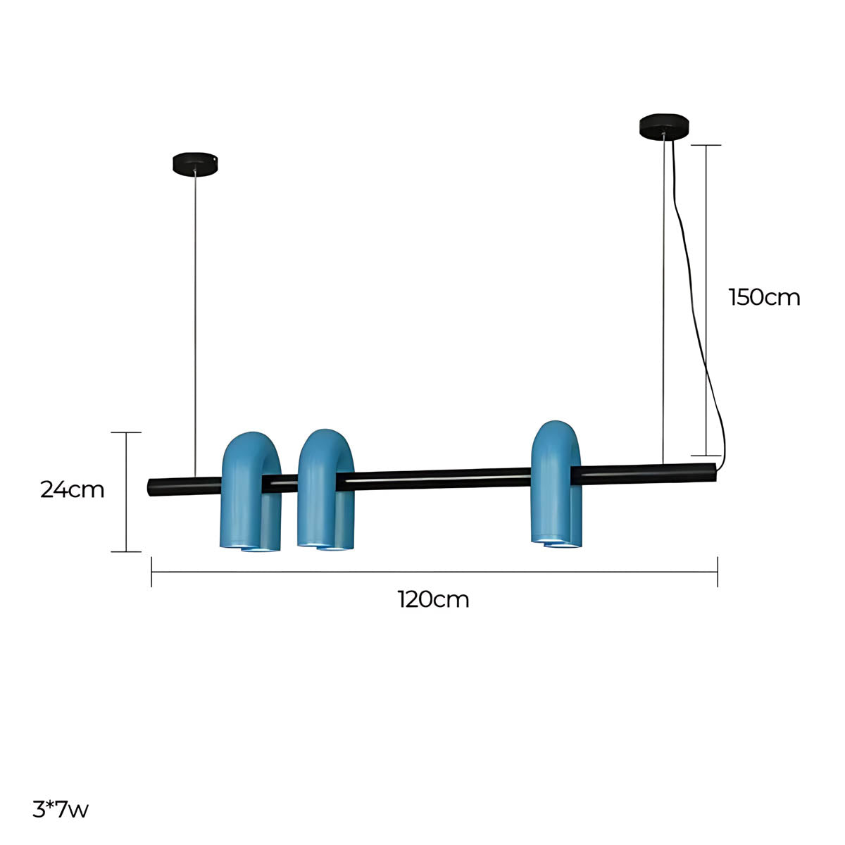 Crafted from durable Iron and Resin, the collection features distinctive U-shaped shades that evoke a playful, post-modern aesthetic, available as a statement chandelier, a sleek linear chandelier, or a complementary wall lamp.